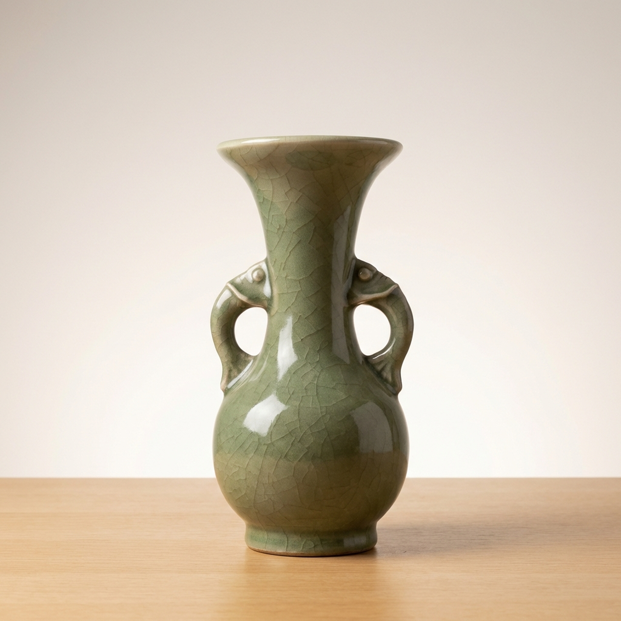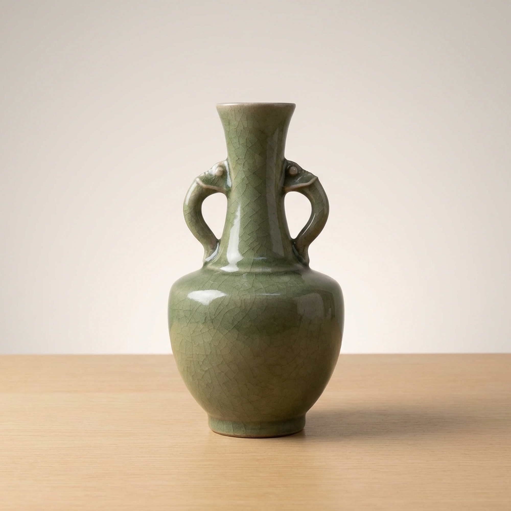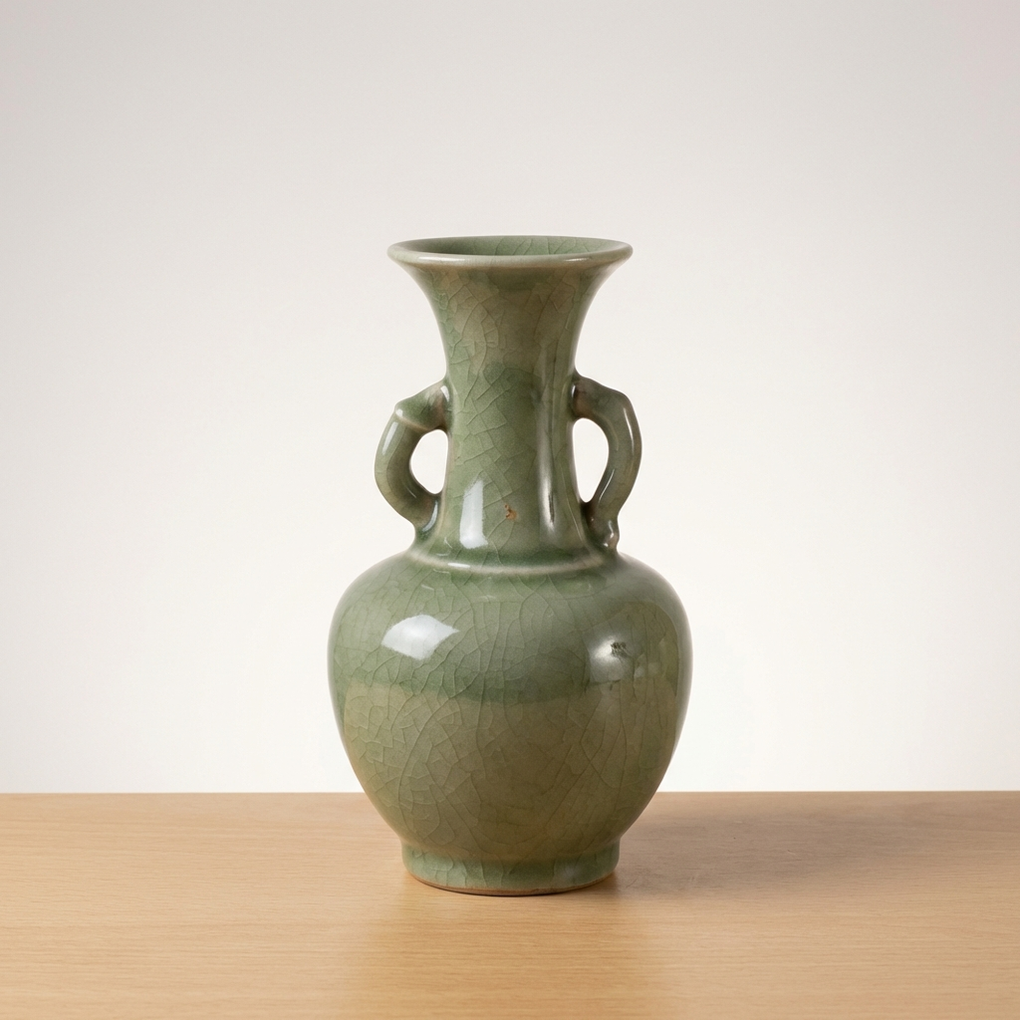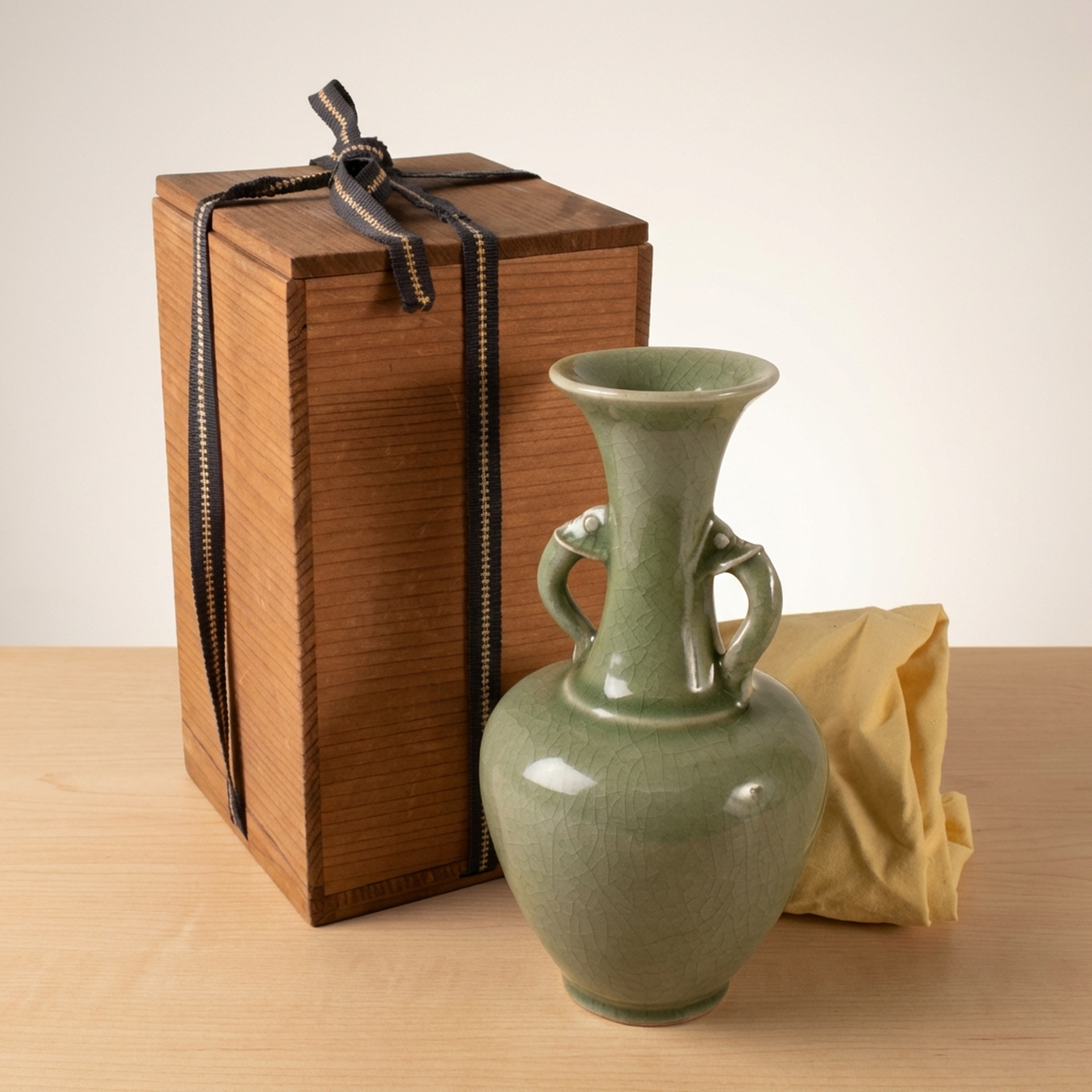 <p>Maker / Brand: Longquan Kiln (Ryusen-yo), China Title of Work: Chinese Longquan Celadon Twin Beast-Handle Vase with Period Box</p> <p>This exquisite Chinese Longquan celadon vase, featuring distinctive twin beast-head handles, embodies the refined aesthetics of classical East Asian ceramics. Presented in a traditional wooden period box (jidai bako), it offers a glimpse into a cherished artistic tradition. Its serene green glaze and elegant form make it a striking piece for any knowledgeable collector or decorator.</p> <p>Artistic & Cultural Background Longquan celadon, known as Ryusen-yo seiji in Japan, originated in Zhejiang province, China, and flourished from the Southern Song to the Ming dynasties. Renowned for its jade-like glaze and sophisticated forms, Longquan ware was highly prized across Asia, particularly in Japan, where it was deeply admired and collected for centuries. These pieces were often considered treasures, influencing local ceramic traditions and serving as symbols of refined taste.</p> <p>Design & Technique This vase showcases the iconic celadon glaze, characterized by its luminous, pale green hue reminiscent of jade. The glaze is applied thickly, creating a rich, unctuous surface that often develops a subtle, detailed crackle pattern, adding depth and character. The elegant form is complemented by two finely sculpted beast-head handles, which serve as both decorative elements and a nod to ancient ritual bronzes, imbuing the piece with a sense of historical grandeur.</p> <p>Form & Aesthetic Qualities * <strong>Graceful Silhouette:</strong> The vase features a flared mouth, a slender neck, a full, globular body, and a stable foot, creating a harmonious and balanced profile. * <strong>Luminous Glaze:</strong> The smooth, unctuous celadon glaze exhibits a striking pale green color, with a delicate crackle visible across its surface, enhancing its organic beauty. * <strong>Mythical Embellishments:</strong> The twin beast-head handles are subtly integrated into the neck, adding a touch of ancient mystique and sculptural interest to the classic form.</p> <p>Collector & Decorative Appeal * <strong>Historical Authenticity:</strong> This piece represents a significant tradition in Chinese ceramic art, offering a tangible connection to a rich cultural past. * <strong>Timeless Elegance:</strong> The vase's understated beauty and classic design allow it to seamlessly complement both traditional and contemporary interiors. * <strong>Preserved Presentation:</strong> Accompanied by its traditional wooden period box (jidai bako), which, though its string is cut, adds to the provenance and historical integrity of the piece.</p> <p>An ideal acquisition for those who appreciate the enduring beauty and historical depth of East Asian ceramics.</p> <h3>Details</h3> <table style="border-collapse:collapse;width:100%"><tr><td style="padding:4px 12px 4px 0;font-weight:bold;white-space:nowrap">Condition</td><td style="padding:4px 0">Good</td></tr><tr><td style="padding:4px 12px 4px 0;font-weight:bold;white-space:nowrap">Material</td><td style="padding:4px 0">Ceramic</td></tr><tr><td style="padding:4px 12px 4px 0;font-weight:bold;white-space:nowrap">Era</td><td style="padding:4px 0">Unknown</td></tr><tr><td style="padding:4px 12px 4px 0;font-weight:bold;white-space:nowrap">Dimensions</td><td style="padding:4px 0">大きさ 高さ約20.5cm 幅約11cm 口内経 約2cm</td></tr></table>