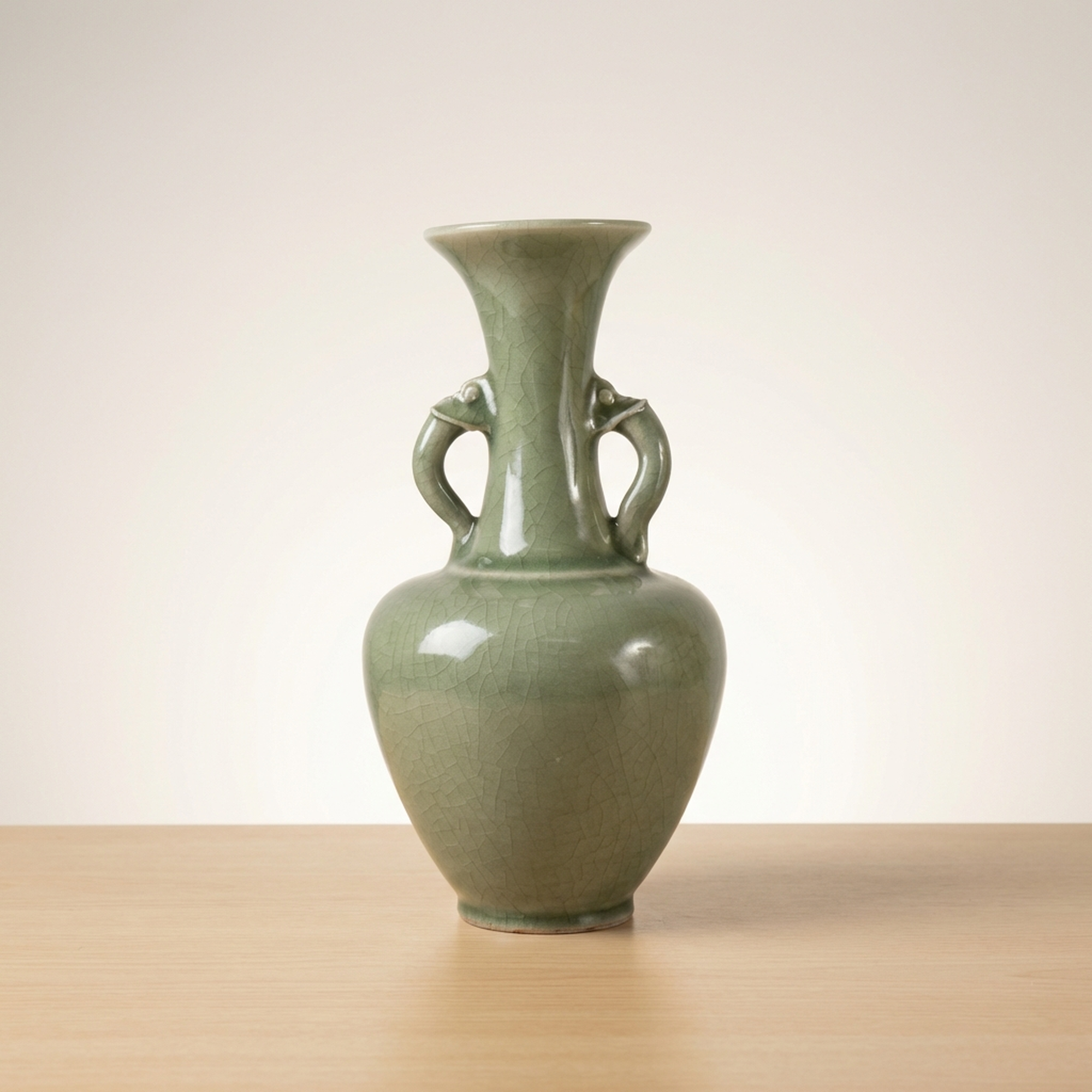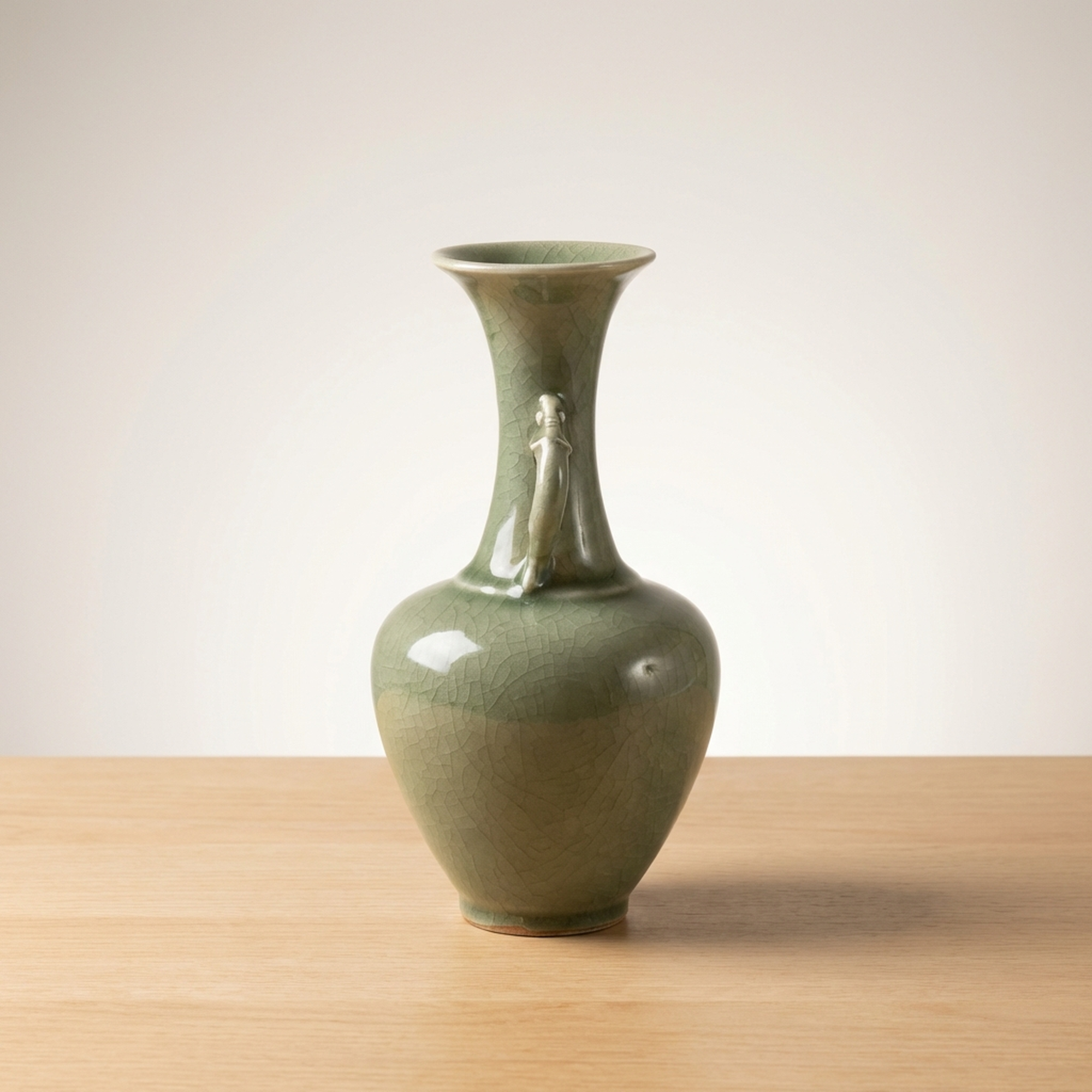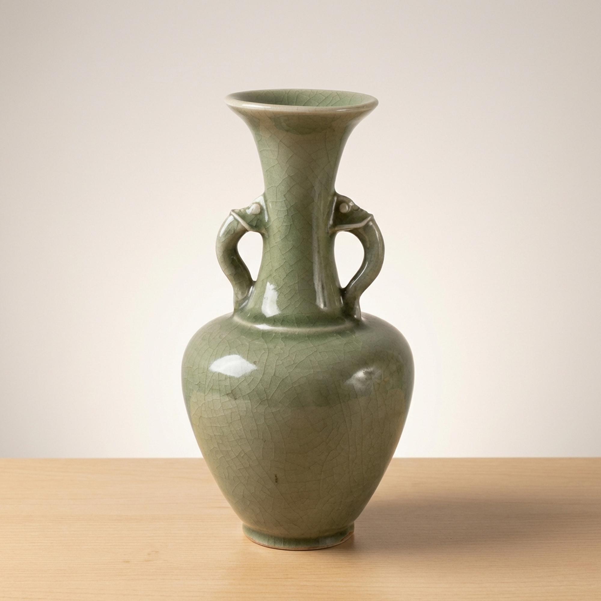 <p>Maker / Brand: Longquan Kiln (Ryusen-yo), China Title of Work: Chinese Longquan Celadon Twin Beast-Handle Vase with Period Box</p> <p>This exquisite Chinese Longquan celadon vase, featuring distinctive twin beast-head handles, embodies the refined aesthetics of classical East Asian ceramics. Presented in a traditional wooden period box (jidai bako), it offers a glimpse into a cherished artistic tradition. Its serene green glaze and elegant form make it a striking piece for any knowledgeable collector or decorator.</p> <p>Artistic & Cultural Background Longquan celadon, known as Ryusen-yo seiji in Japan, originated in Zhejiang province, China, and flourished from the Southern Song to the Ming dynasties. Renowned for its jade-like glaze and sophisticated forms, Longquan ware was highly prized across Asia, particularly in Japan, where it was deeply admired and collected for centuries. These pieces were often considered treasures, influencing local ceramic traditions and serving as symbols of refined taste.</p> <p>Design & Technique This vase showcases the iconic celadon glaze, characterized by its luminous, pale green hue reminiscent of jade. The glaze is applied thickly, creating a rich, unctuous surface that often develops a subtle, detailed crackle pattern, adding depth and character. The elegant form is complemented by two finely sculpted beast-head handles, which serve as both decorative elements and a nod to ancient ritual bronzes, imbuing the piece with a sense of historical grandeur.</p> <p>Form & Aesthetic Qualities * <strong>Graceful Silhouette:</strong> The vase features a flared mouth, a slender neck, a full, globular body, and a stable foot, creating a harmonious and balanced profile. * <strong>Luminous Glaze:</strong> The smooth, unctuous celadon glaze exhibits a striking pale green color, with a delicate crackle visible across its surface, enhancing its organic beauty. * <strong>Mythical Embellishments:</strong> The twin beast-head handles are subtly integrated into the neck, adding a touch of ancient mystique and sculptural interest to the classic form.</p> <p>Collector & Decorative Appeal * <strong>Historical Authenticity:</strong> This piece represents a significant tradition in Chinese ceramic art, offering a tangible connection to a rich cultural past. * <strong>Timeless Elegance:</strong> The vase's understated beauty and classic design allow it to seamlessly complement both traditional and contemporary interiors. * <strong>Preserved Presentation:</strong> Accompanied by its traditional wooden period box (jidai bako), which, though its string is cut, adds to the provenance and historical integrity of the piece.</p> <p>An ideal acquisition for those who appreciate the enduring beauty and historical depth of East Asian ceramics.</p> <h3>Details</h3> <table style="border-collapse:collapse;width:100%"><tr><td style="padding:4px 12px 4px 0;font-weight:bold;white-space:nowrap">Condition</td><td style="padding:4px 0">Good</td></tr><tr><td style="padding:4px 12px 4px 0;font-weight:bold;white-space:nowrap">Material</td><td style="padding:4px 0">Ceramic</td></tr><tr><td style="padding:4px 12px 4px 0;font-weight:bold;white-space:nowrap">Era</td><td style="padding:4px 0">Unknown</td></tr><tr><td style="padding:4px 12px 4px 0;font-weight:bold;white-space:nowrap">Dimensions</td><td style="padding:4px 0">大きさ 高さ約20.5cm 幅約11cm 口内経 約2cm</td></tr></table>