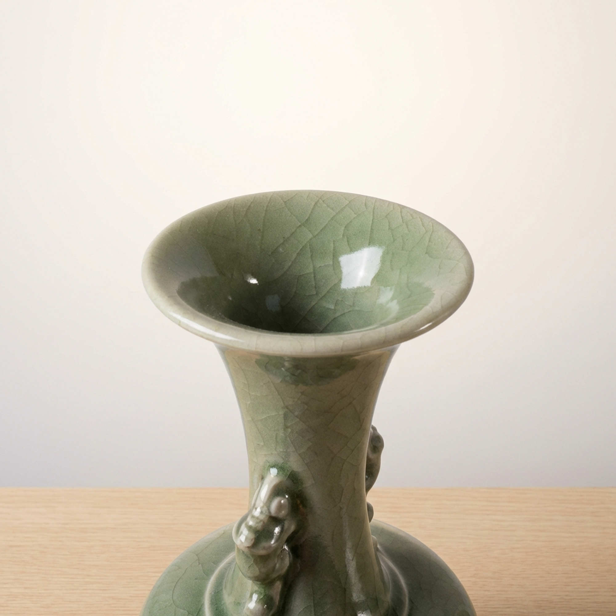 中国 龍泉窯青磁 双獣耳花瓶 時代箱 V R8314