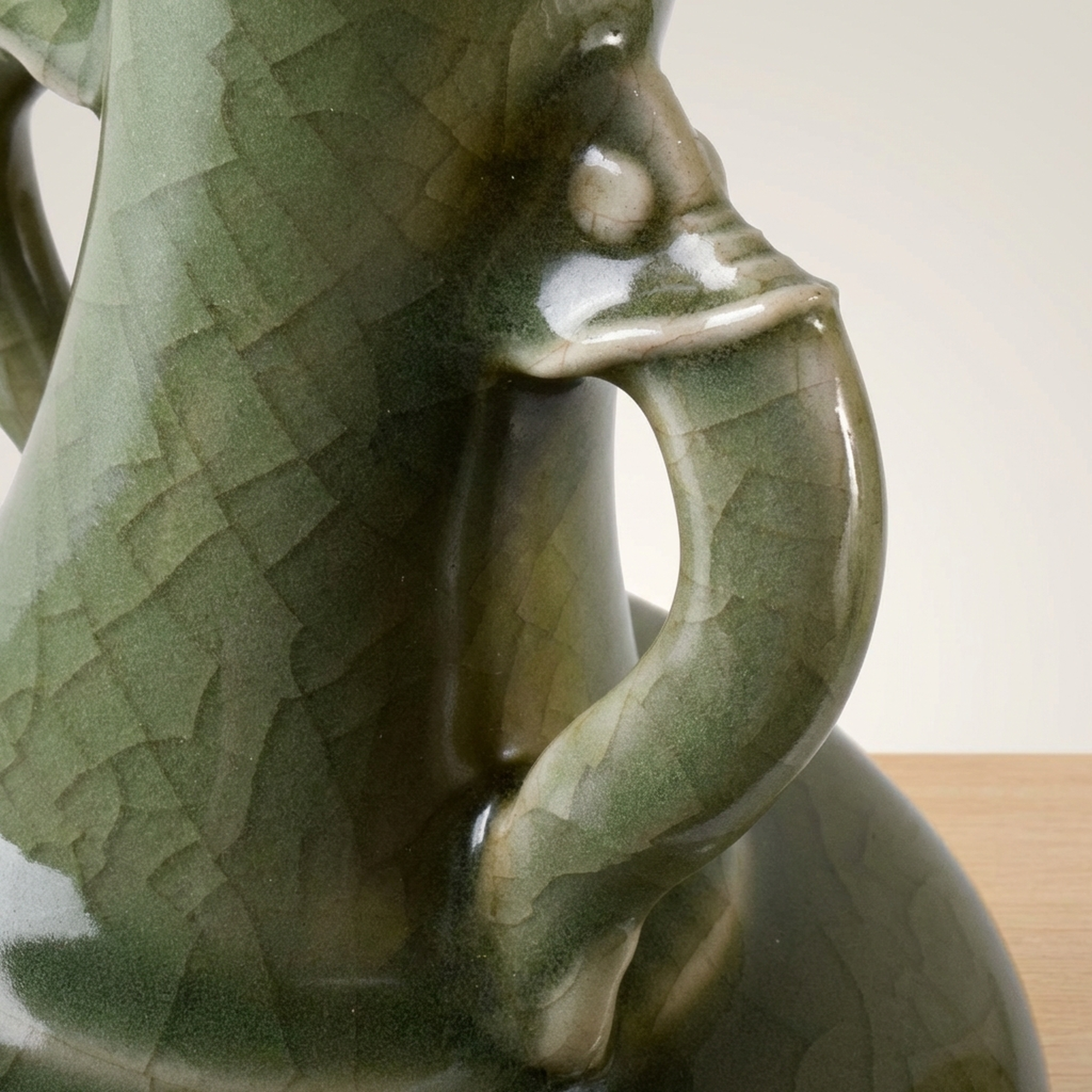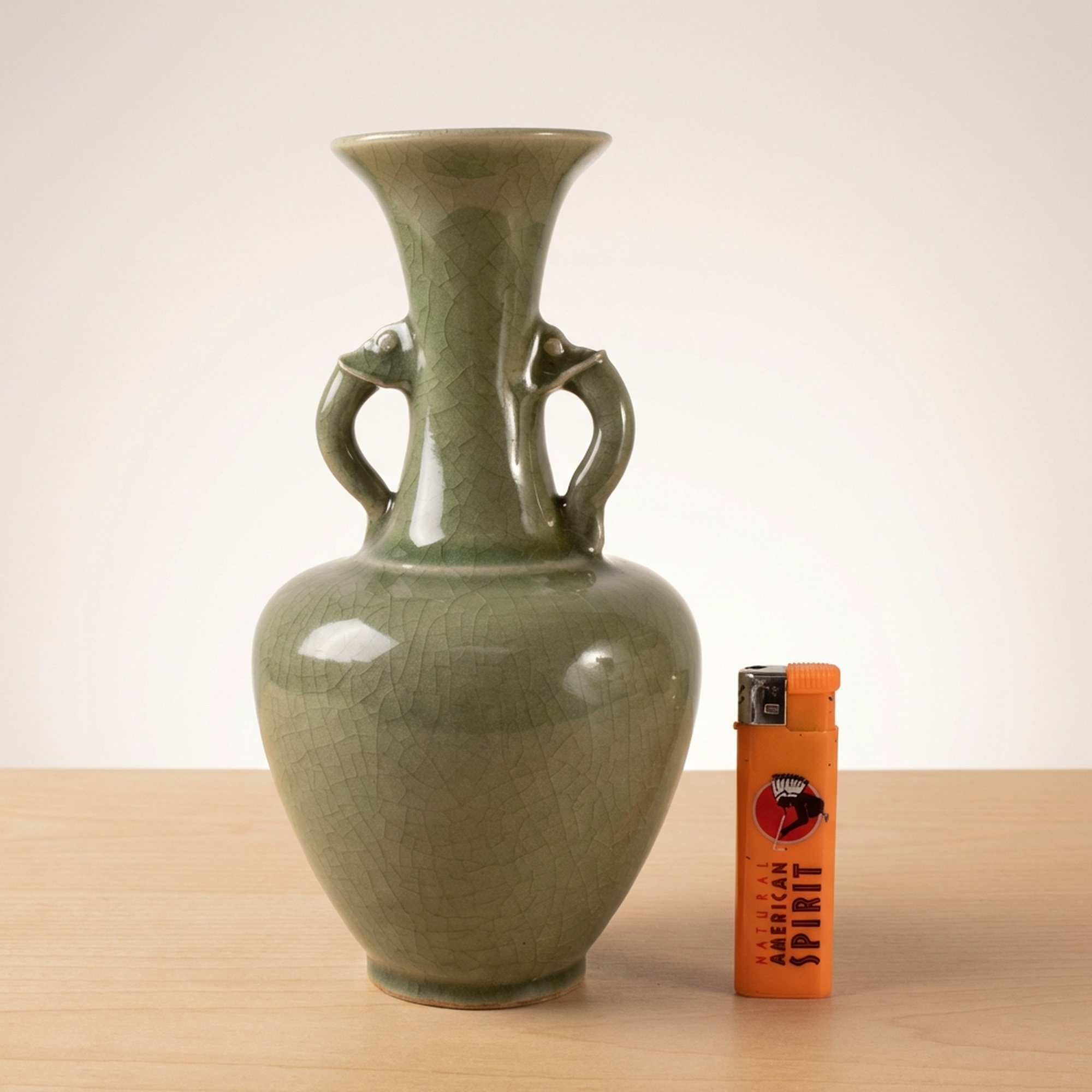 Antique Chinese Longquan Kiln Celadon Vase, Twin Beast Handles, Period Box