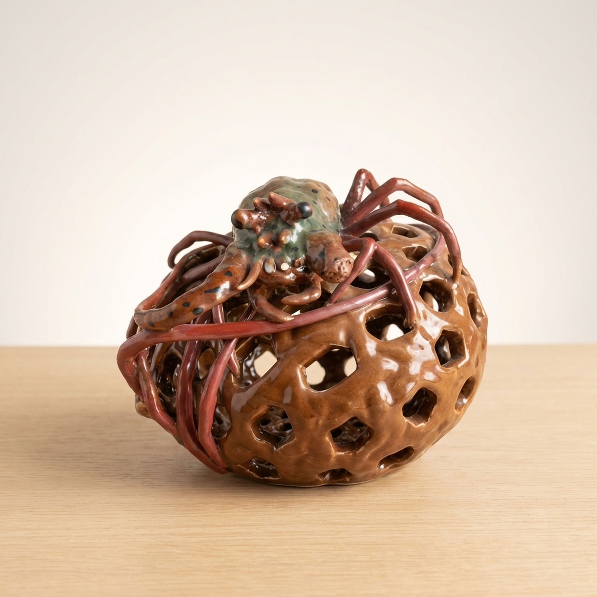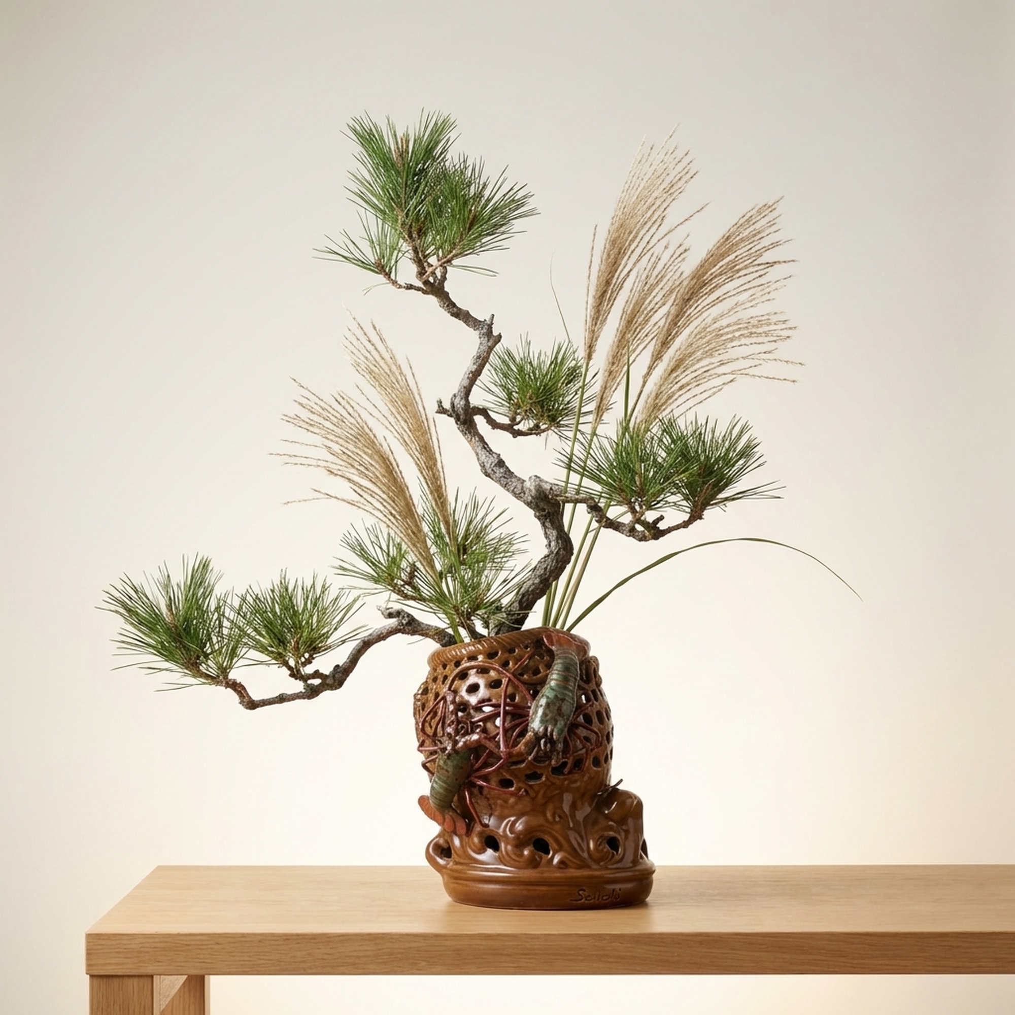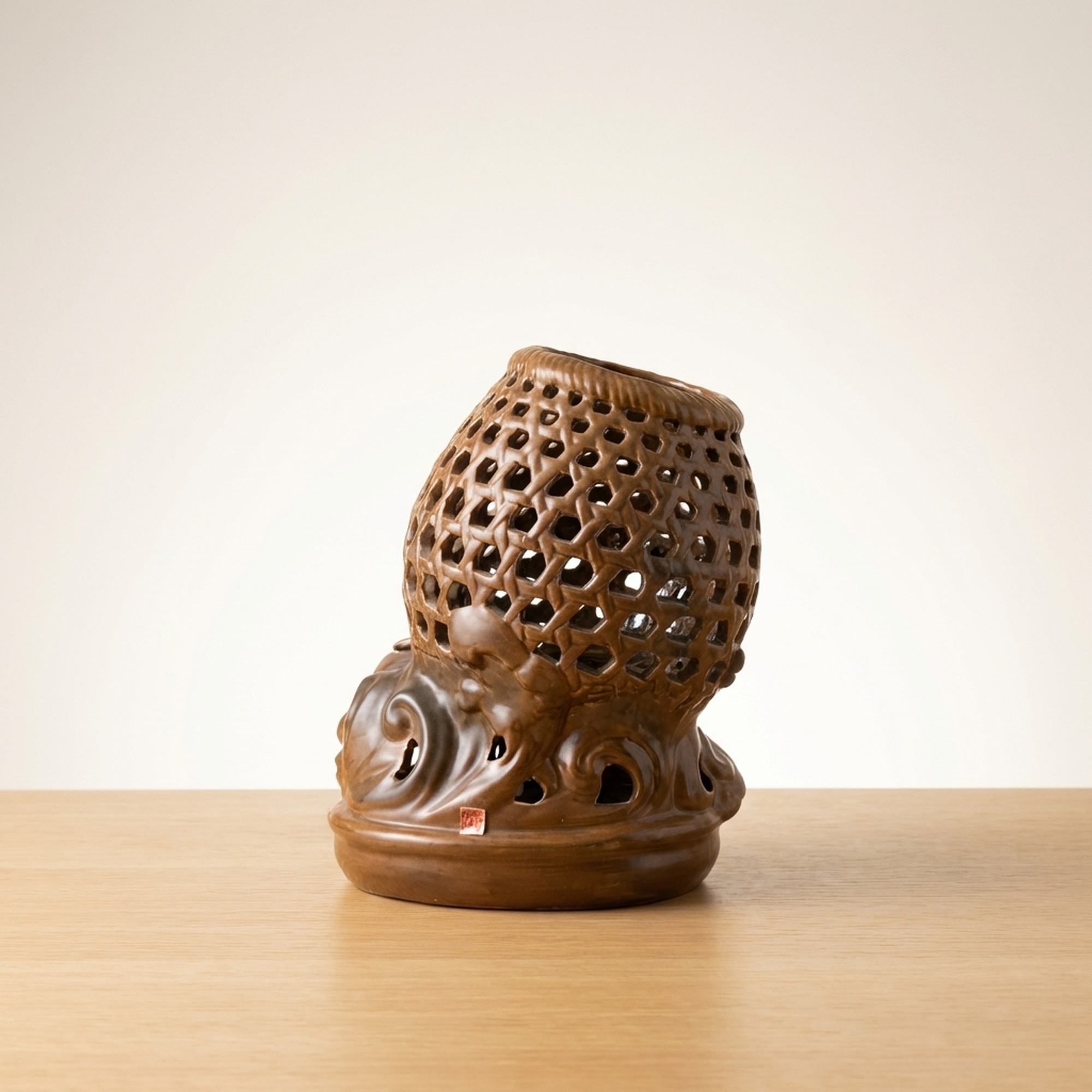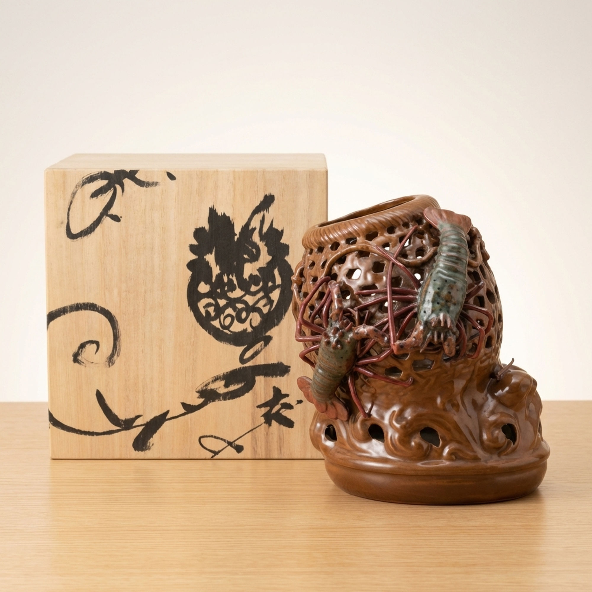 <p>Maker / Brand: Seiichi Title of Work: Shrimp Decoration Openwork Vase</p> <p>This striking vase, bearing the mark of Seiichi, is a truly remarkable piece of Japanese ceramic artistry. It features an detailedly rendered openwork fish basket (gyoro) motif, upon which a dynamic cluster of Ise-ebi (Japanese spiny lobsters) are dramatically applied. The powerful presence and detailed craftsmanship of this vessel leave a lasting impression, hinting at a mysterious masterpiece.</p> <p>Artistic & Cultural Background The Ise-ebi holds significant cultural importance in Japan, symbolizing longevity, good fortune, and vitality, often featured in celebratory contexts. Such lively depictions reflect a deep appreciation for nature and its symbolic power. While Seiichi's specific kiln context remains elusive, the detailed ceramic work aligns with traditions of decorative Japanese pottery.</p> <p>Design & Technique The vase showcases exceptional *sukashibori* (openwork) technique, carefully carved to evoke the woven texture of a traditional fish basket. This detailed lattice forms the backdrop for the applied Ise-ebi, rendered with striking realism. Their vibrant glazes in shades of green and reddish-brown contrast beautifully with the basket's earthy tones, creating a sense of movement and life. One shrimp has two small antennae missing and larger antennae are absent (possibly a naturalistic depiction or minor loss). Minor condition notes include a kiln flaw on the fish basket and a glaze peel on the foot.</p> <p>Form & Aesthetic Qualities * <strong>Dynamic Form:</strong> The robust, rounded form of the vase is animated by the energetic composition of the climbing shrimp and the airy quality of the openwork. * <strong>Textural Contrast:</strong> A rich interplay of textures is evident, from the smooth, glazed surfaces of the shrimp to the tactile quality of their legs and the detailed perforations of the basket. * <strong>Vivid Realism:</strong> The Ise-ebi are sculpted with remarkable lifelike detail, capturing their powerful forms and suggesting movement.</p> <p>Collector & Decorative Appeal * <strong>Unique Craftsmanship:</strong> This piece stands out for its masterful *sukashibori* and the bold, three-dimensional application of the Ise-ebi, representing a high level of ceramic skill. * <strong>Intriguing Provenance:</strong> The enigmatic nature of its maker, Seiichi, adds an element of mystery and allure, making it a fascinating subject for collectors. * <strong>Cultural Symbolism:</strong> Beyond its aesthetic beauty, the vase carries the auspicious symbolism of the Ise-ebi, making it a meaningful decorative statement.</p> <p>This vase is an exceptional acquisition for those who appreciate the blend of detailed craftsmanship, naturalistic artistry, and cultural depth in Japanese ceramics.</p> <h3>Details</h3> <table style="border-collapse:collapse;width:100%"><tr><td style="padding:4px 12px 4px 0;font-weight:bold;white-space:nowrap">Condition</td><td style="padding:4px 0">As-Is</td></tr><tr><td style="padding:4px 12px 4px 0;font-weight:bold;white-space:nowrap">Origin</td><td style="padding:4px 0">Seto, Aichi</td></tr><tr><td style="padding:4px 12px 4px 0;font-weight:bold;white-space:nowrap">Material</td><td style="padding:4px 0">Ceramic</td></tr><tr><td style="padding:4px 12px 4px 0;font-weight:bold;white-space:nowrap">Era</td><td style="padding:4px 0">Unknown</td></tr><tr><td style="padding:4px 12px 4px 0;font-weight:bold;white-space:nowrap">Dimensions</td><td style="padding:4px 0">高さ26cm / 幅23cm / 奥行22cm</td></tr></table>