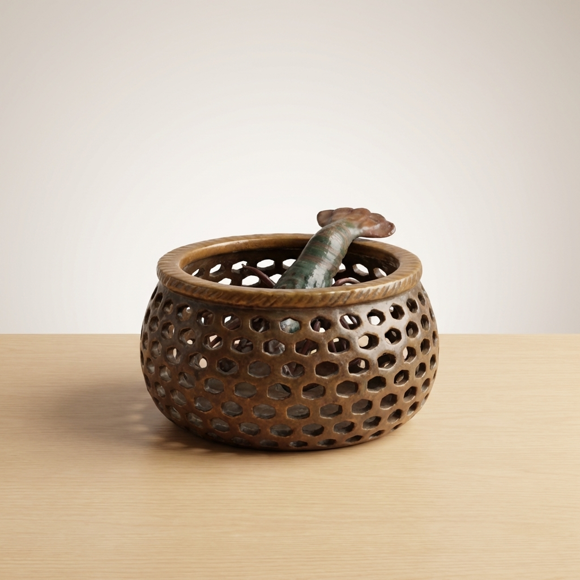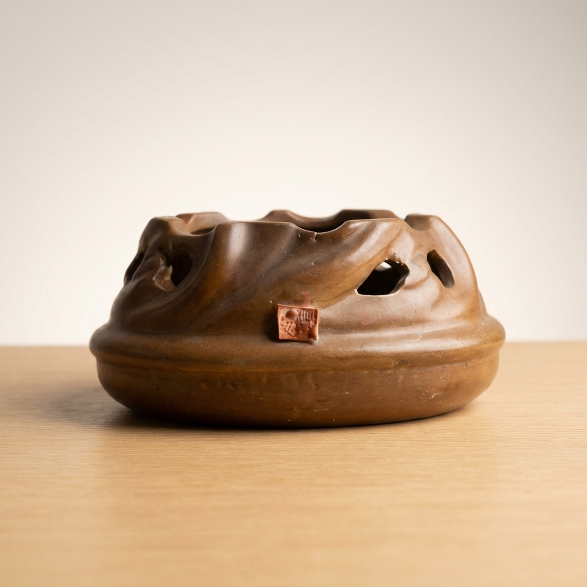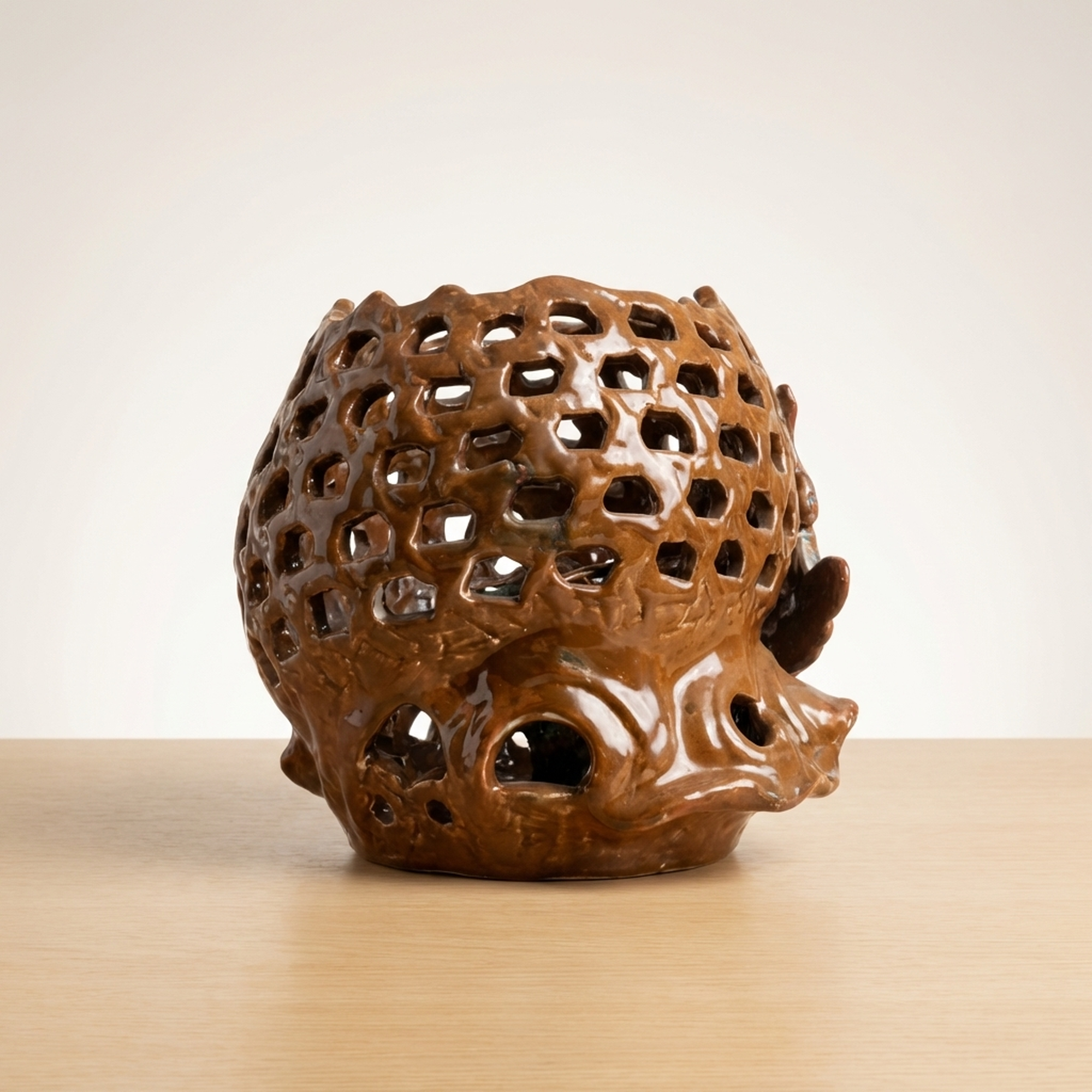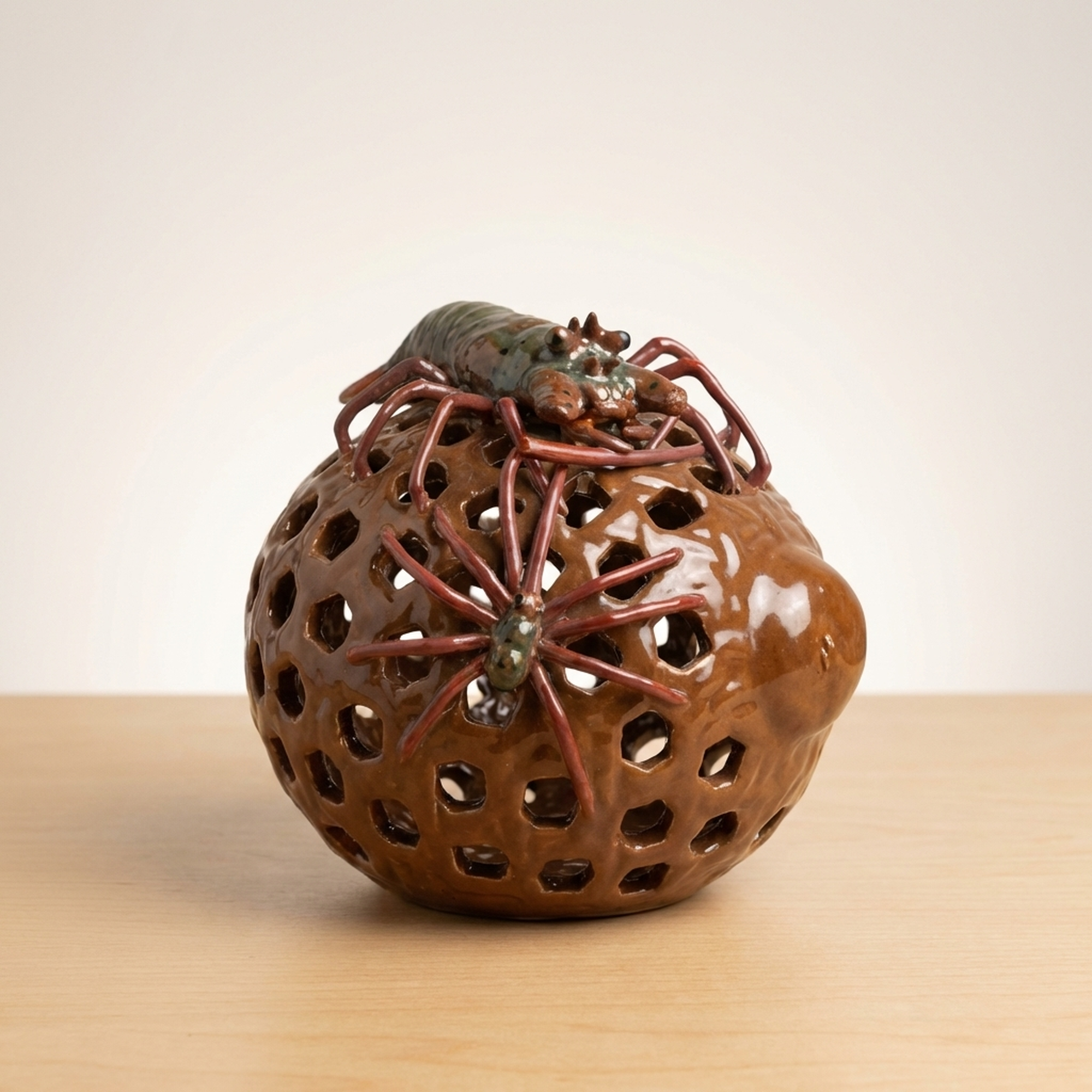 <p>Maker / Brand: Seiichi Title of Work: Shrimp Decoration Openwork Vase</p> <p>This striking vase, bearing the mark of Seiichi, is a truly remarkable piece of Japanese ceramic artistry. It features an detailedly rendered openwork fish basket (gyoro) motif, upon which a dynamic cluster of Ise-ebi (Japanese spiny lobsters) are dramatically applied. The powerful presence and detailed craftsmanship of this vessel leave a lasting impression, hinting at a mysterious masterpiece.</p> <p>Artistic & Cultural Background The Ise-ebi holds significant cultural importance in Japan, symbolizing longevity, good fortune, and vitality, often featured in celebratory contexts. Such lively depictions reflect a deep appreciation for nature and its symbolic power. While Seiichi's specific kiln context remains elusive, the detailed ceramic work aligns with traditions of decorative Japanese pottery.</p> <p>Design & Technique The vase showcases exceptional *sukashibori* (openwork) technique, carefully carved to evoke the woven texture of a traditional fish basket. This detailed lattice forms the backdrop for the applied Ise-ebi, rendered with striking realism. Their vibrant glazes in shades of green and reddish-brown contrast beautifully with the basket's earthy tones, creating a sense of movement and life. One shrimp has two small antennae missing and larger antennae are absent (possibly a naturalistic depiction or minor loss). Minor condition notes include a kiln flaw on the fish basket and a glaze peel on the foot.</p> <p>Form & Aesthetic Qualities * <strong>Dynamic Form:</strong> The robust, rounded form of the vase is animated by the energetic composition of the climbing shrimp and the airy quality of the openwork. * <strong>Textural Contrast:</strong> A rich interplay of textures is evident, from the smooth, glazed surfaces of the shrimp to the tactile quality of their legs and the detailed perforations of the basket. * <strong>Vivid Realism:</strong> The Ise-ebi are sculpted with remarkable lifelike detail, capturing their powerful forms and suggesting movement.</p> <p>Collector & Decorative Appeal * <strong>Unique Craftsmanship:</strong> This piece stands out for its masterful *sukashibori* and the bold, three-dimensional application of the Ise-ebi, representing a high level of ceramic skill. * <strong>Intriguing Provenance:</strong> The enigmatic nature of its maker, Seiichi, adds an element of mystery and allure, making it a fascinating subject for collectors. * <strong>Cultural Symbolism:</strong> Beyond its aesthetic beauty, the vase carries the auspicious symbolism of the Ise-ebi, making it a meaningful decorative statement.</p> <p>This vase is an exceptional acquisition for those who appreciate the blend of detailed craftsmanship, naturalistic artistry, and cultural depth in Japanese ceramics.</p> <h3>Details</h3> <table style="border-collapse:collapse;width:100%"><tr><td style="padding:4px 12px 4px 0;font-weight:bold;white-space:nowrap">Condition</td><td style="padding:4px 0">As-Is</td></tr><tr><td style="padding:4px 12px 4px 0;font-weight:bold;white-space:nowrap">Origin</td><td style="padding:4px 0">Seto, Aichi</td></tr><tr><td style="padding:4px 12px 4px 0;font-weight:bold;white-space:nowrap">Material</td><td style="padding:4px 0">Ceramic</td></tr><tr><td style="padding:4px 12px 4px 0;font-weight:bold;white-space:nowrap">Era</td><td style="padding:4px 0">Unknown</td></tr><tr><td style="padding:4px 12px 4px 0;font-weight:bold;white-space:nowrap">Dimensions</td><td style="padding:4px 0">高さ26cm / 幅23cm / 奥行22cm</td></tr></table>