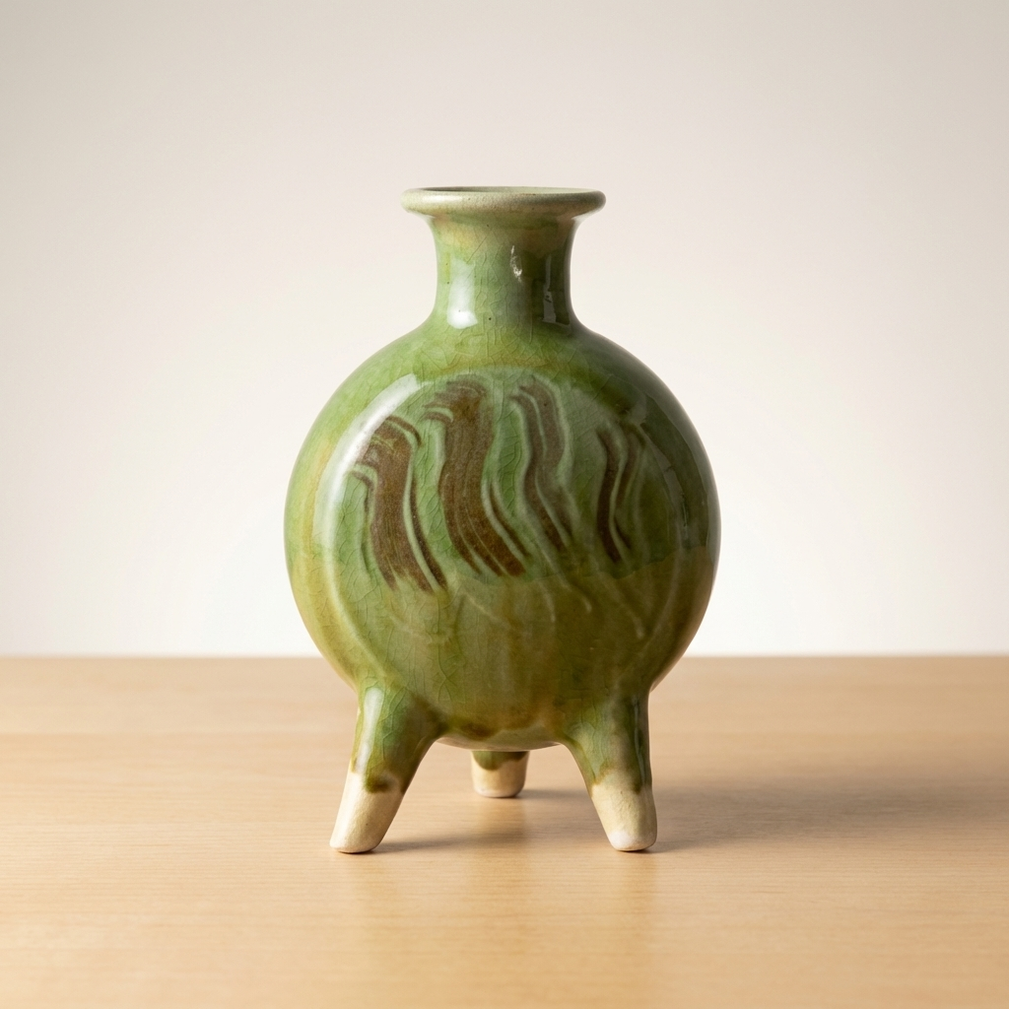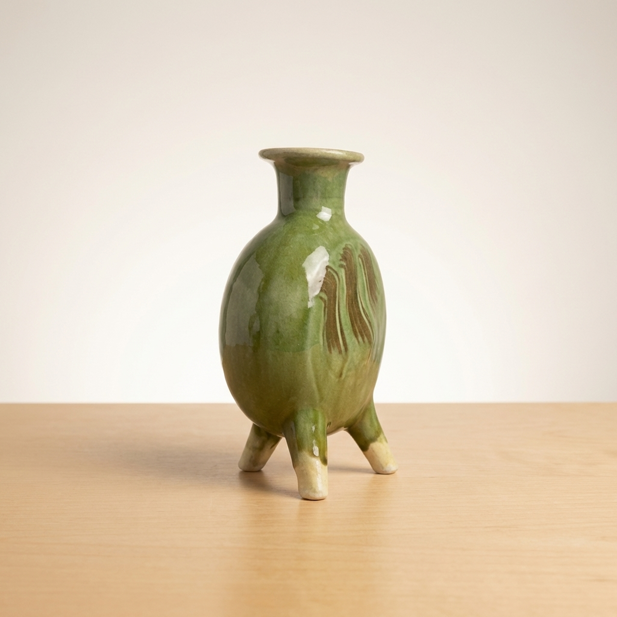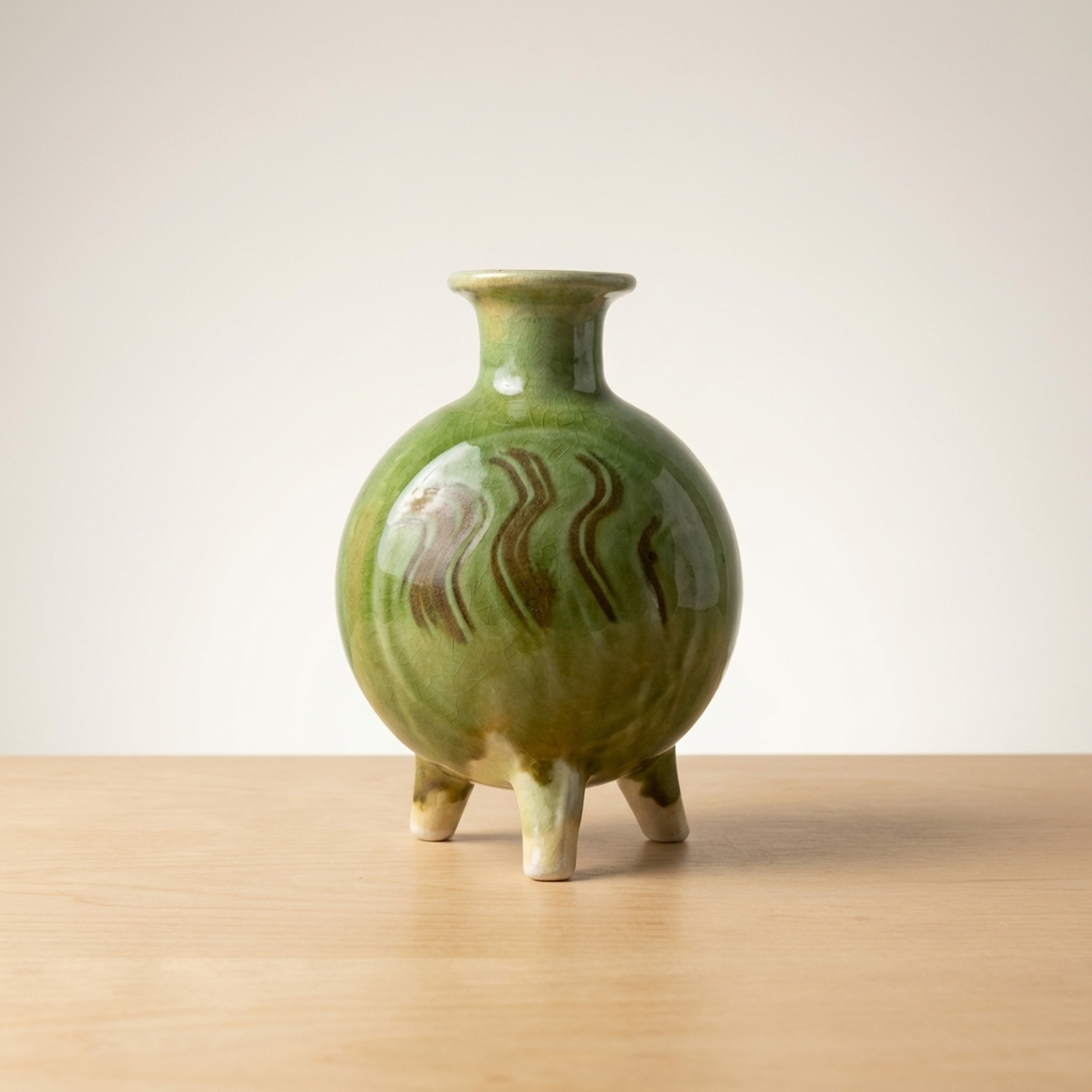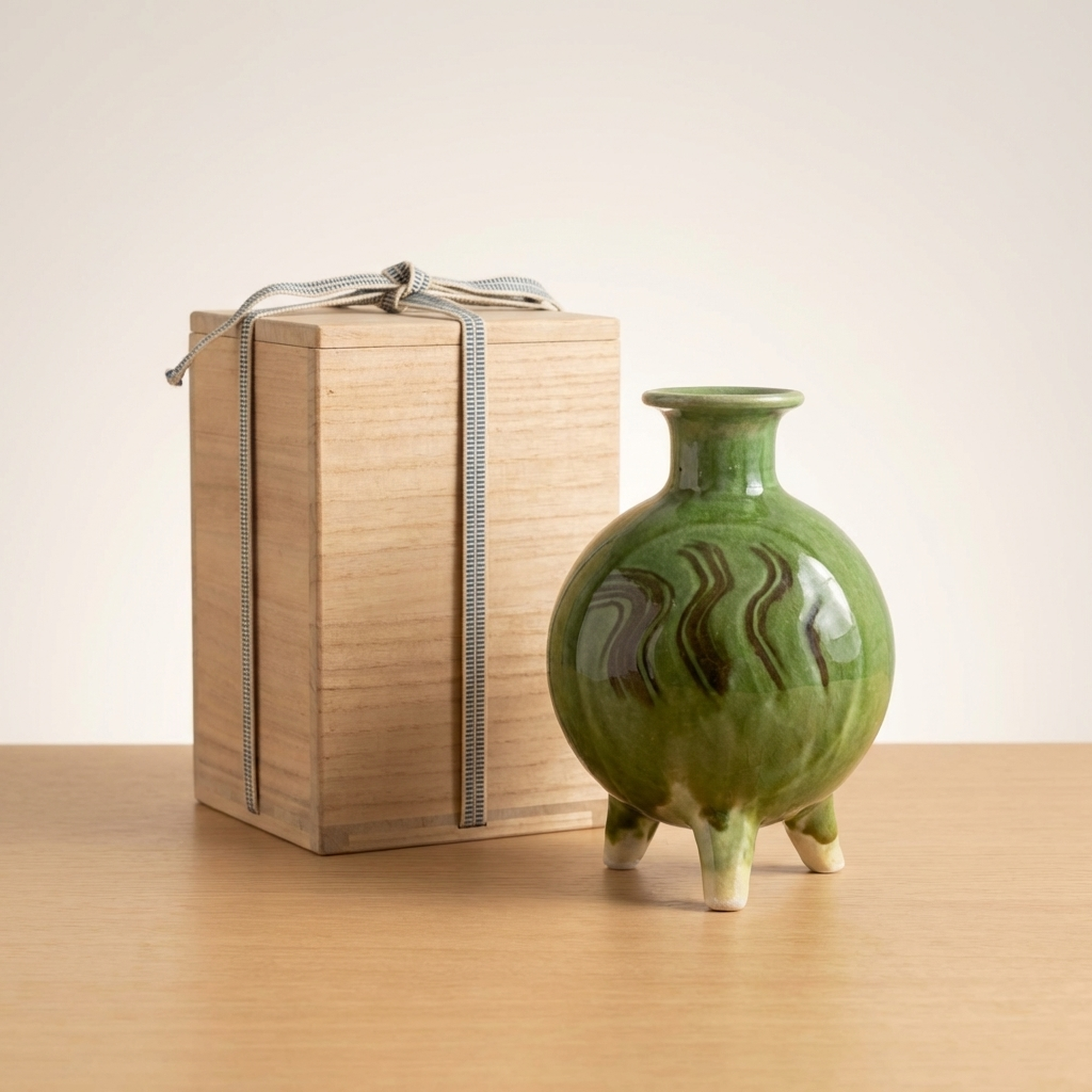 <p>Maker / Brand: Funaki Kenji Title of Work: Green Glazed Three-Legged Flower Vase with Original Box, Undamaged, Rare, Mingei, Bernard Leach</p> <p>This exquisite three-legged flower vase by Funaki Kenji embodies the rustic beauty and functional elegance central to the Mingei folk craft movement. Adorned with a striking green glaze, its unique form and rich color make it a truly distinctive piece of Japanese ceramic art. This rare and undamaged vessel comes complete with its original wooden box, adding to its provenance and collectible value.</p> <p>Artistic & Cultural Background The Mingei movement, championed by figures like Yanagi Soetsu and the British potter Bernard Leach, celebrated the beauty of everyday utilitarian objects made by anonymous craftspeople. Funaki Kenji, a significant figure in this movement, embraced its philosophy of honest craftsmanship and natural aesthetics. This vase reflects the Mingei ideal of finding profound beauty in simple, functional forms, connecting it to a rich lineage of Japanese folk art. A similar piece is believed to be housed in the Shimane Prefectural Museum, further underscoring its cultural significance.</p> <p>Design & Technique The vase features a vibrant green glaze (ryokuyu) that flows beautifully over its rounded body, creating subtle variations in tone and texture. Darker, almost earthy brown streaks are artfully swirled into the green, adding depth and an organic, painterly quality to the surface. The three sturdy legs, left unglazed at their tips, provide a stable yet elegant base, a design choice that is both practical and visually striking.</p> <p>Form & Aesthetic Qualities * <strong>Unique Silhouette:</strong> A charming globular body tapers gracefully to a narrow neck and gently flared rim, supported by three robust, splayed legs. * <strong>Luminous Glaze:</strong> The glossy green glaze shimmers with an inviting depth, enhanced by the spontaneous, naturalistic patterns of darker pigment. * <strong>Harmonious Balance:</strong> Despite its unusual three-legged form, the vase achieves a perfect balance of stability and delicate elegance, inviting contemplation.</p> <p>Collector & Decorative Appeal * <strong>Mingei Provenance:</strong> A genuine piece by Funaki Kenji, a respected Mingei artist, offering a tangible connection to this important Japanese art movement and its association with Bernard Leach. * <strong>Exceptional Condition & Rarity:</strong> Described as undamaged and rare, this vase represents a unique opportunity to acquire a well-preserved example of the artist's distinctive work. * <strong>Versatile Display:</strong> Its striking color and form make it a striking centerpiece for a variety of interior styles, from traditional Japanese to modern minimalist, or as a standalone sculptural object.</p> <p>This piece is an ideal acquisition for collectors passionate about Japanese folk art and those seeking a unique, historically significant decorative accent for their home.</p> <h3>Details</h3> <table style="border-collapse:collapse;width:100%"><tr><td style="padding:4px 12px 4px 0;font-weight:bold;white-space:nowrap">Condition</td><td style="padding:4px 0">Good</td></tr><tr><td style="padding:4px 12px 4px 0;font-weight:bold;white-space:nowrap">Material</td><td style="padding:4px 0">Wood</td></tr><tr><td style="padding:4px 12px 4px 0;font-weight:bold;white-space:nowrap">Era</td><td style="padding:4px 0">Unknown</td></tr></table>