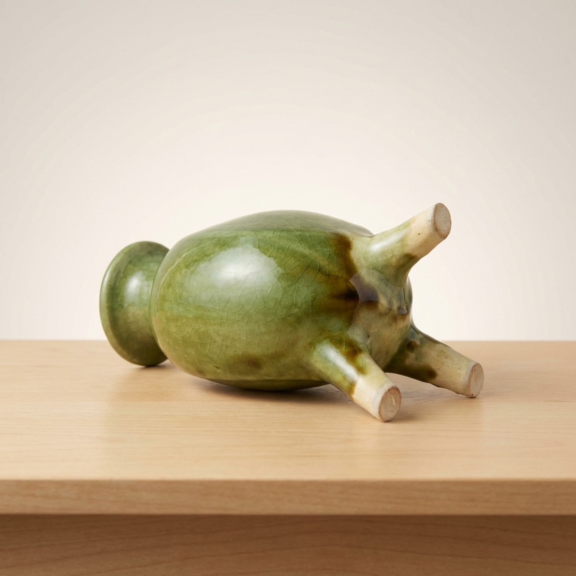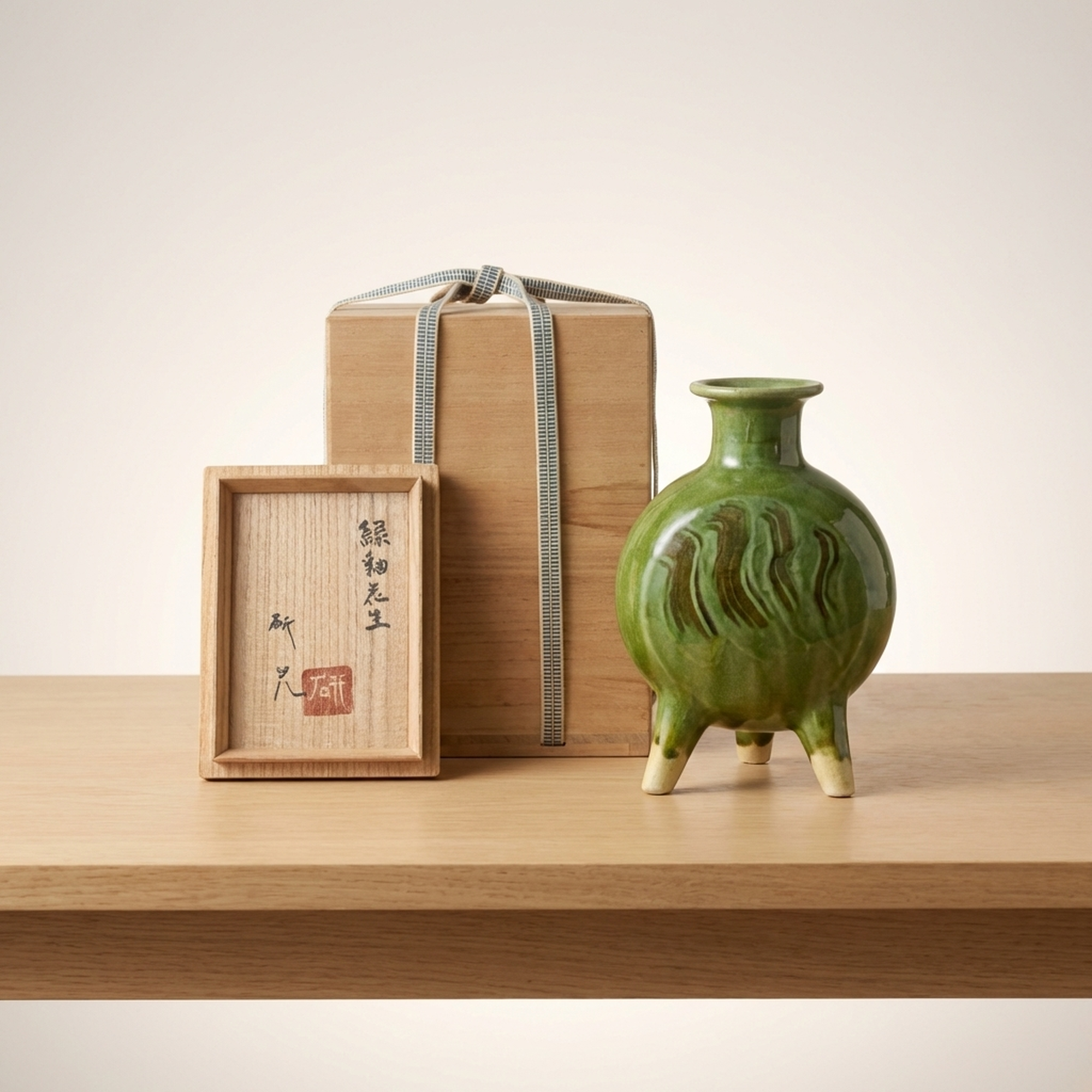 Kenji Funaki Mingei Green Glaze Tripod Vase, Flawless, Rare, Original Signed Box, Bernard Leach