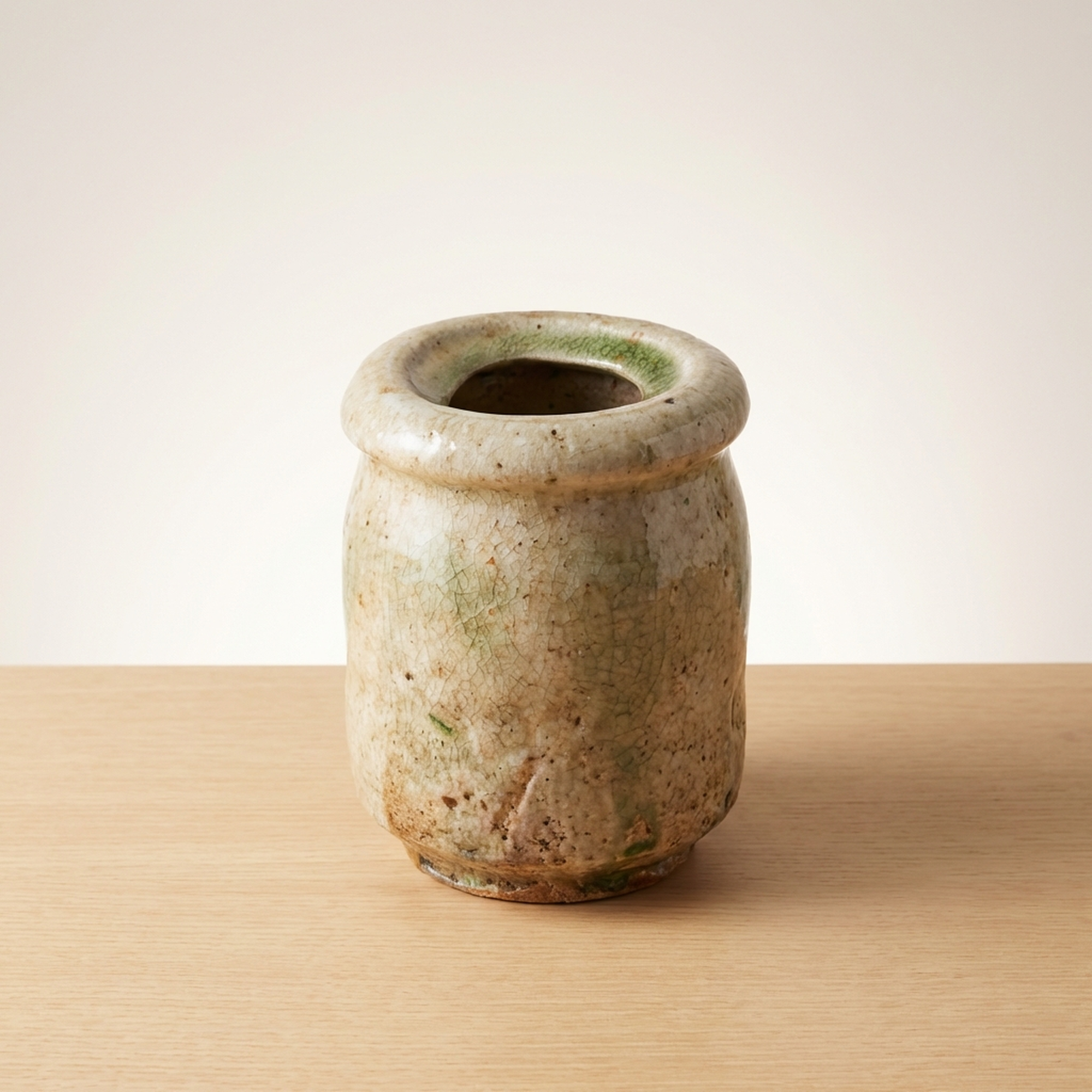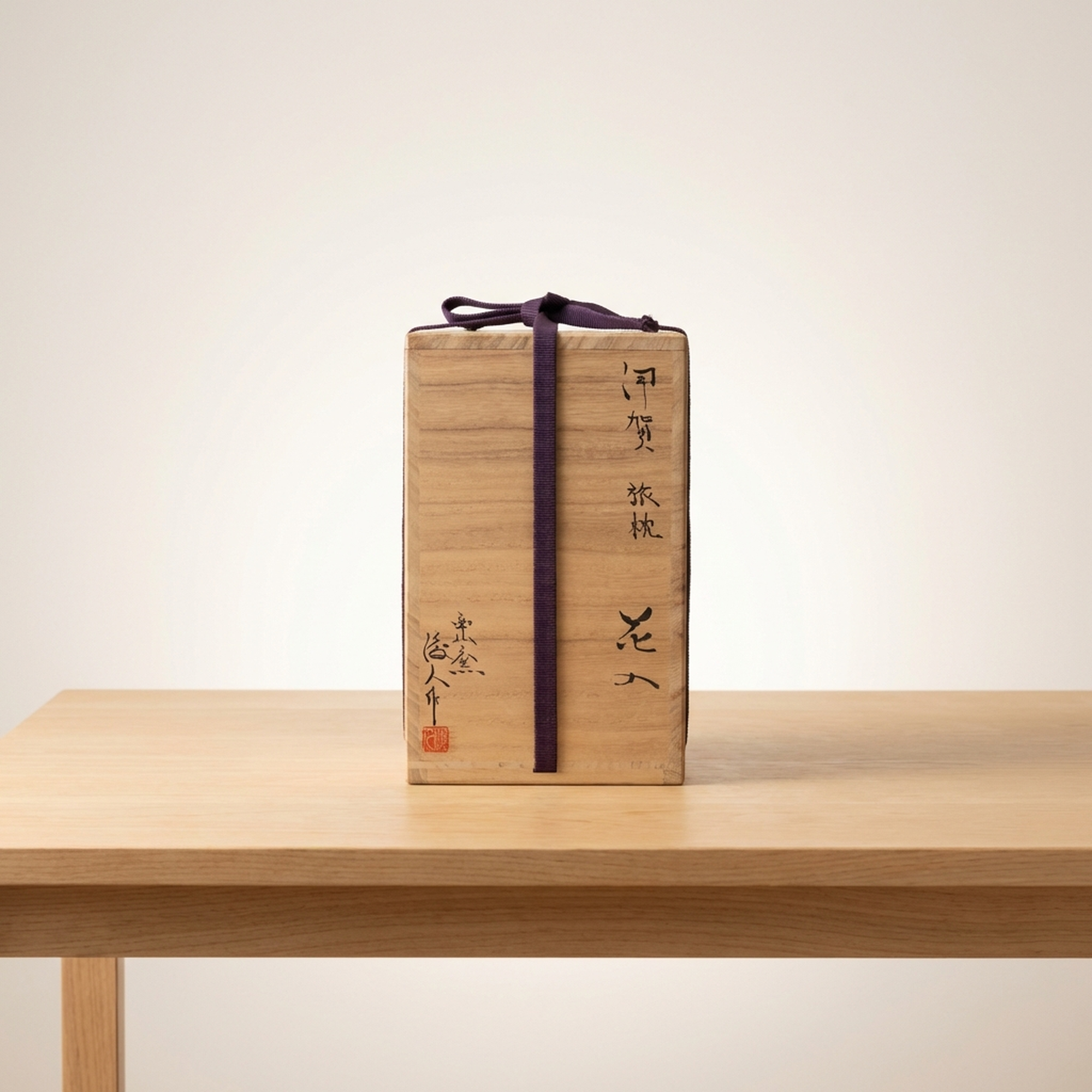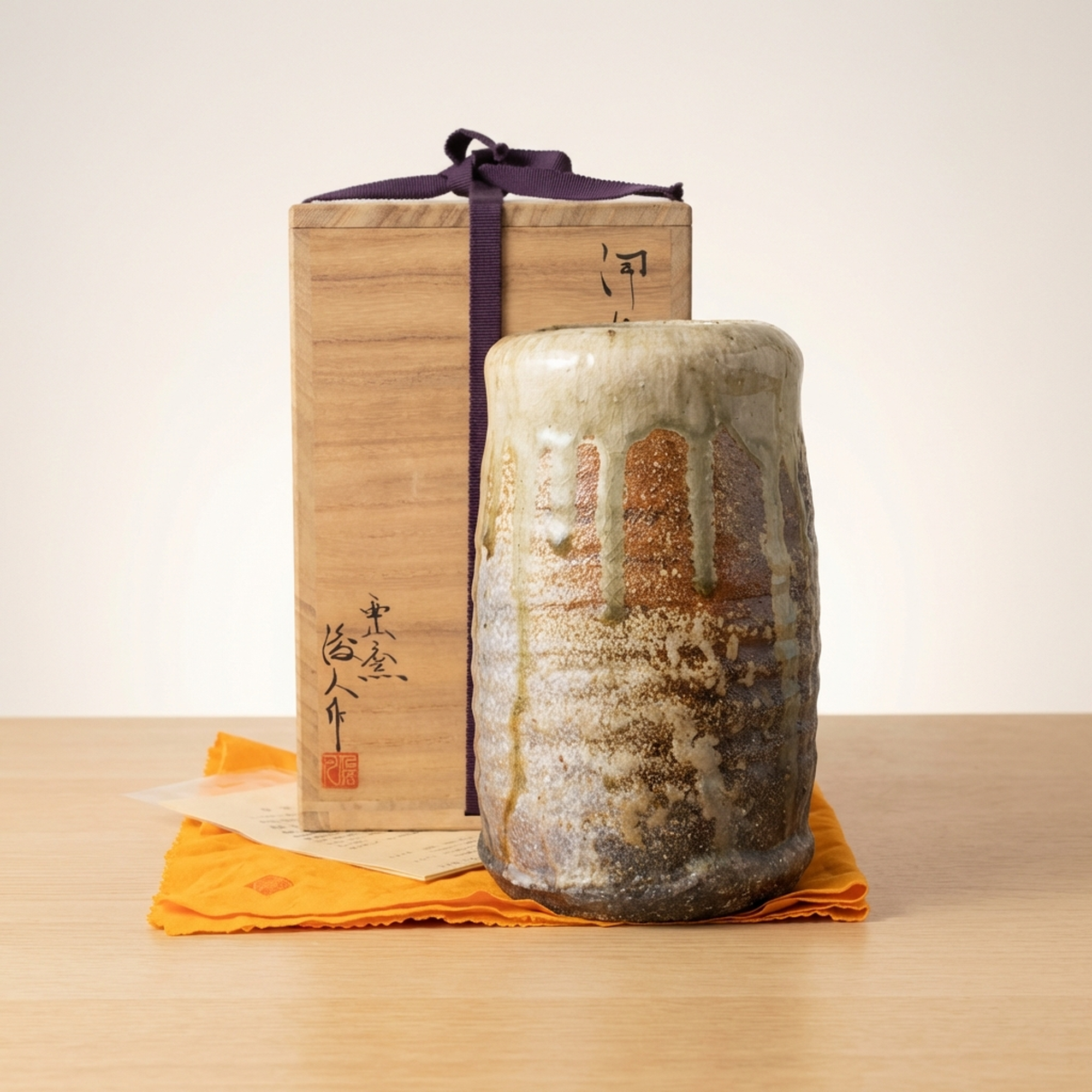 <p>Maker / Brand: Sakamoto Toshito (Iga-yaki) Title of Work: Iga Tabimakura Hanaire</p> <p>This exceptional Iga Tabimakura Hanaire, or "traveler's pillow" vase, is a masterful creation by Sakamoto Toshito, a leading contemporary artist in the Iga-yaki tradition. Measuring approximately 11.8 cm in diameter and 20.9 cm in height, it boasts a powerful presence, showcasing dynamic kiln effects, rich glaze drips, and robust hand-formed qualities that make it a truly outstanding piece. It comes complete with its original tomobako (wooden box), tomobukuro (protective cloth), and shiori (information slip), affirming its authenticity and provenance.</p> <p>Artistic & Cultural Background Iga-yaki is one of Japan's most ancient and revered ceramic traditions, originating in the mountainous region of Iga, Mie Prefecture. Known for its rugged beauty and dramatic kiln transformations (yohen), Iga ware is fired at exceptionally high temperatures, often resulting in natural ash glazes, scorched surfaces, and a distinctive reddish-brown clay body. Sharing a historical lineage with Shigaraki-yaki, Iga-yaki pieces, particularly hanaire, are deeply cherished in the world of chanoyu (tea ceremony) for their wabi-sabi aesthetic, embodying a profound appreciation for natural imperfection and rustic elegance.</p> <p>Design & Technique Sakamoto Toshito's artistry is vividly displayed through the vase's dynamic surface and form. The piece features relaxed rokuro-me (potter's wheel marks) and intentional yugami (distortion), giving it an organic, hand-hewn character. Vigorous hera-zukai (spatula work) adds expressive texture, while dramatic yu-dare (glaze drips) cascade down the body, creating a striking interplay of color and sheen. The unpredictable yohen (kiln effects) further enhance its unique landscape, ensuring no two pieces are ever identical.</p> <p>Form & Aesthetic Qualities * <strong>Robust Form:</strong> The classic Tabimakura shape is rendered with a powerful, slightly distorted cylindrical body, exuding a strong, grounded presence. * <strong>Dynamic Surface:</strong> A rich collection of textures results from visible wheel marks, bold spatula work, and the natural, often crackled (kanyu) surface of the high-fired clay. * <strong>Dramatic Glaze:</strong> Cascading glaze drips create striking visual movement, contrasting with the raw clay and showcasing the unpredictable beauty of kiln transformations.</p> <p>Collector & Decorative Appeal * <strong>Masterful Artistry:</strong> A superb example of Iga-yaki by Sakamoto Toshito, a respected artist who continues the legacy of the Iga Nishiyama Kiln, making it a valuable acquisition for collectors. * <strong>Authentic Provenance:</strong> Accompanied by its tomobako, tomobukuro, and shiori, this piece offers assured authenticity and is presented with the traditional care befitting a fine work of art. * <strong>Versatile Elegance:</strong> Perfect for displaying a single branch or flower in the ikebana tradition, or as a standalone sculptural object, this vase brings a touch of profound Japanese aesthetic to any interior.</p> <p>This Iga Tabimakura Hanaire is an ideal acquisition for knowledgeable collectors of Japanese ceramics and those who appreciate the raw, natural beauty of traditional Iga-yaki.</p> <h3>Details</h3> <table style="border-collapse:collapse;width:100%"><tr><td style="padding:4px 12px 4px 0;font-weight:bold;white-space:nowrap">Condition</td><td style="padding:4px 0">Good</td></tr><tr><td style="padding:4px 12px 4px 0;font-weight:bold;white-space:nowrap">Origin</td><td style="padding:4px 0">Shigaraki, Shiga</td></tr><tr><td style="padding:4px 12px 4px 0;font-weight:bold;white-space:nowrap">Material</td><td style="padding:4px 0">Ceramic</td></tr><tr><td style="padding:4px 12px 4px 0;font-weight:bold;white-space:nowrap">Era</td><td style="padding:4px 0">Unknown</td></tr><tr><td style="padding:4px 12px 4px 0;font-weight:bold;white-space:nowrap">Dimensions</td><td style="padding:4px 0">高20.9 cm / サイズ 約 径11.8×高20.9 cm</td></tr></table>