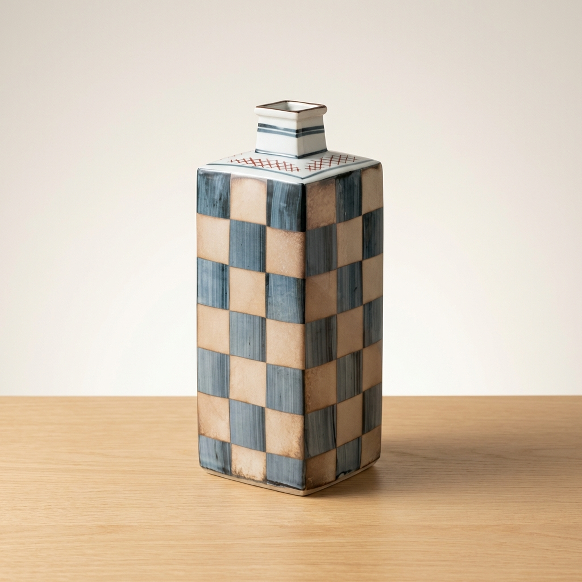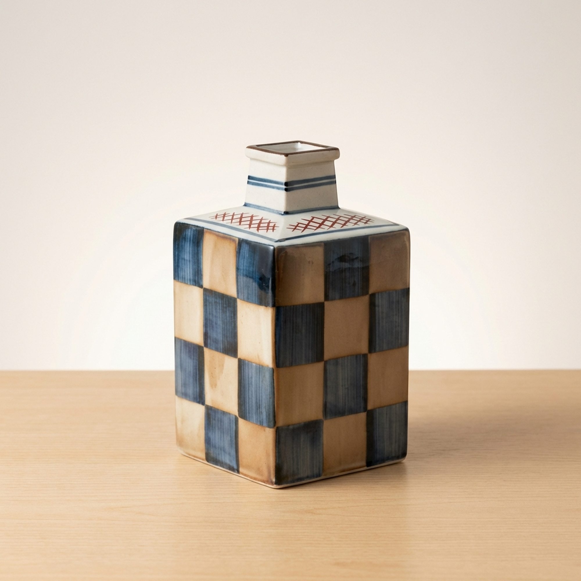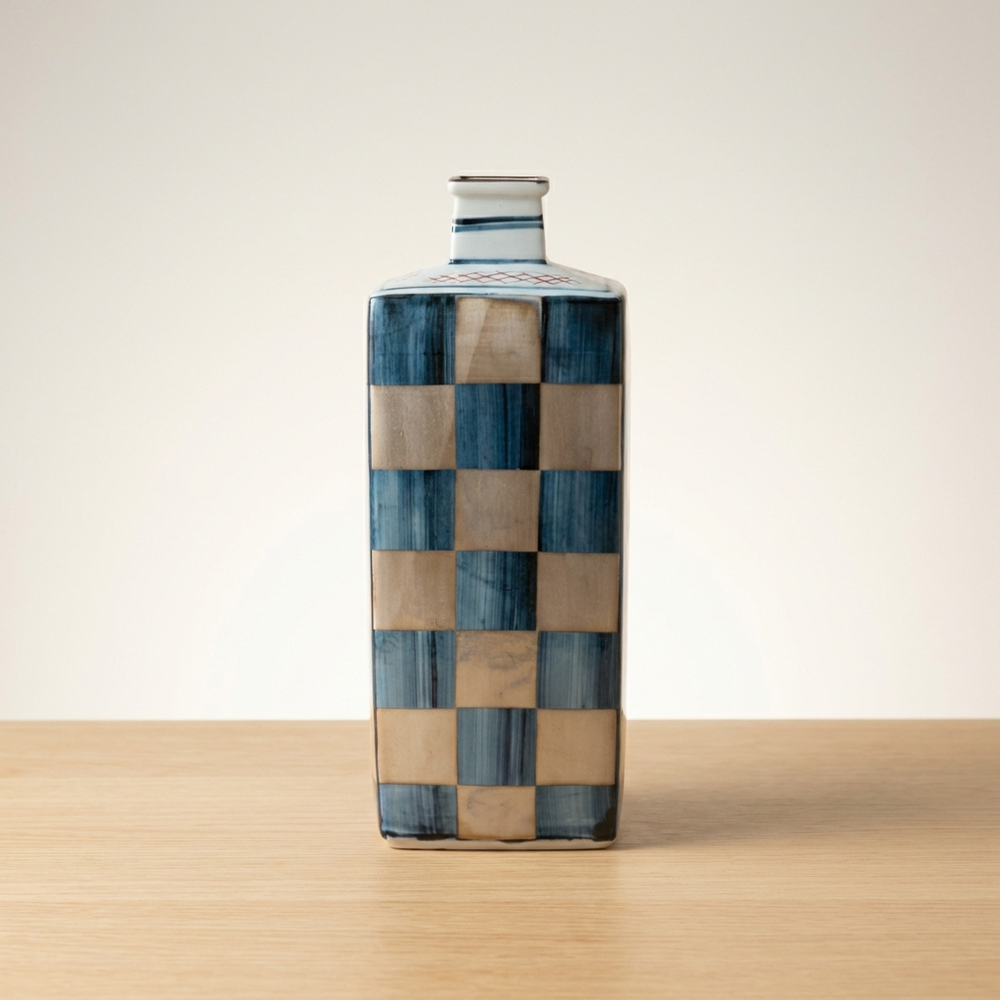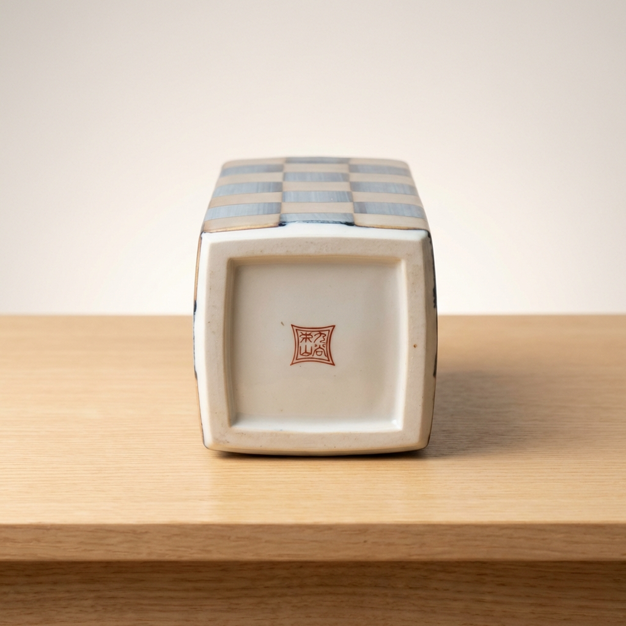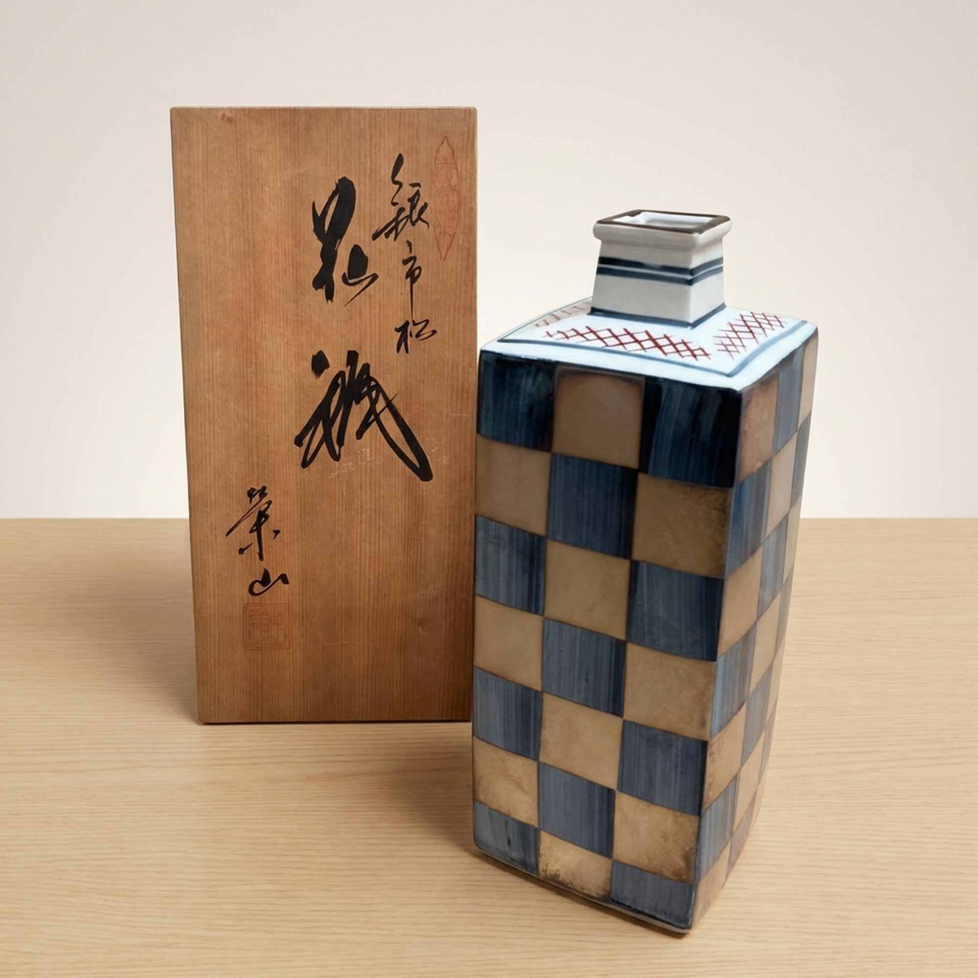 <p>Maker / Brand: Kutani-yaki Eizan Title of Work: D-5 Showa Retro Kutani-yaki Eizan-made Silver Ichimatsu Vase with Kiri Tomobako, Modern Checkered Pattern, Square</p> <p>Discover a striking blend of tradition and modernity with this exquisite Kutani-yaki vase, masterfully crafted by the artist Eizan. Adorned with a striking Gin Ichimatsu (silver checkered) pattern across its entire surface, this piece presents a simple yet powerful design presence. Its sharp, square form makes it a versatile accent, perfect for displaying a single bloom or standing alone as a sophisticated objet d'art, elevating any contemporary or Japanese-modern interior.</p> <p>Artistic & Cultural Background Kutani-yaki, originating from Ishikawa Prefecture, is renowned for its distinctive overglaze enamels and bold decorative styles. While often celebrated for its vibrant, polychromatic designs, this particular vase from the Showa era (1926-1989) showcases a more subdued and contemporary interpretation of Kutani craftsmanship. It reflects a period where traditional techniques began to embrace modern aesthetics, offering a fresh perspective on classic Japanese artistry.</p> <p>Design & Technique The vase features a striking Gin Ichimatsu pattern, a traditional Japanese checkered motif, rendered here in calm, muted tones of blue-grey and earthy beige. This sophisticated palette lends the piece an understated elegance. Complementing the main design, a delicate mesh pattern in subtle red adorns the top surface, adding a refined detail. The overall effect is one of quiet strength and timeless appeal, a example to Eizan's artistic vision.</p> <p>Form & Aesthetic Qualities * <strong>Geometric Precision:</strong> A sharp, square column (kakuhanaire) shape offers a clean, architectural silhouette that feels distinctly modern. * <strong>Subtle Sophistication:</strong> The muted color palette of the Gin Ichimatsu pattern creates a sense of calm and refined beauty, allowing the form and pattern to speak for themselves. * <strong>Harmonious Contrast:</strong> The bold checkered pattern is balanced by the delicate mesh motif on the top, adding visual interest without overwhelming the minimalist aesthetic.</p> <p>Collector & Decorative Appeal * <strong>Versatile Decor Piece:</strong> Ideal for showcasing a single flower, a small arrangement, or as a standalone sculptural element in a minimalist or Japanese-inspired setting. * <strong>Wa-Modern Elegance:</strong> Its fusion of traditional pattern and contemporary form makes it a perfect fit for interiors seeking a sophisticated "wa-modern" aesthetic. * <strong>Authentic Craftsmanship:</strong> Accompanied by its original kiri tomobako (wooden storage box), which shows some signs of age consistent with storage but remains fully protective, this piece by Eizan represents a fine example of Kutani-yaki artistry from the Showa period.</p> <p>This exceptional vase is a example to the enduring beauty of Japanese craft, perfect for the knowledgeable collector or decorator seeking a unique blend of heritage and contemporary style.</p> <h3>Details</h3> <table style="border-collapse:collapse;width:100%"><tr><td style="padding:4px 12px 4px 0;font-weight:bold;white-space:nowrap">Condition</td><td style="padding:4px 0">Good</td></tr><tr><td style="padding:4px 12px 4px 0;font-weight:bold;white-space:nowrap">Origin</td><td style="padding:4px 0">Kutani, Ishikawa</td></tr><tr><td style="padding:4px 12px 4px 0;font-weight:bold;white-space:nowrap">Material</td><td style="padding:4px 0">Porcelain</td></tr><tr><td style="padding:4px 12px 4px 0;font-weight:bold;white-space:nowrap">Era</td><td style="padding:4px 0">Showa</td></tr><tr><td style="padding:4px 12px 4px 0;font-weight:bold;white-space:nowrap">Dimensions</td><td style="padding:4px 0">サイズ】</td></tr></table>