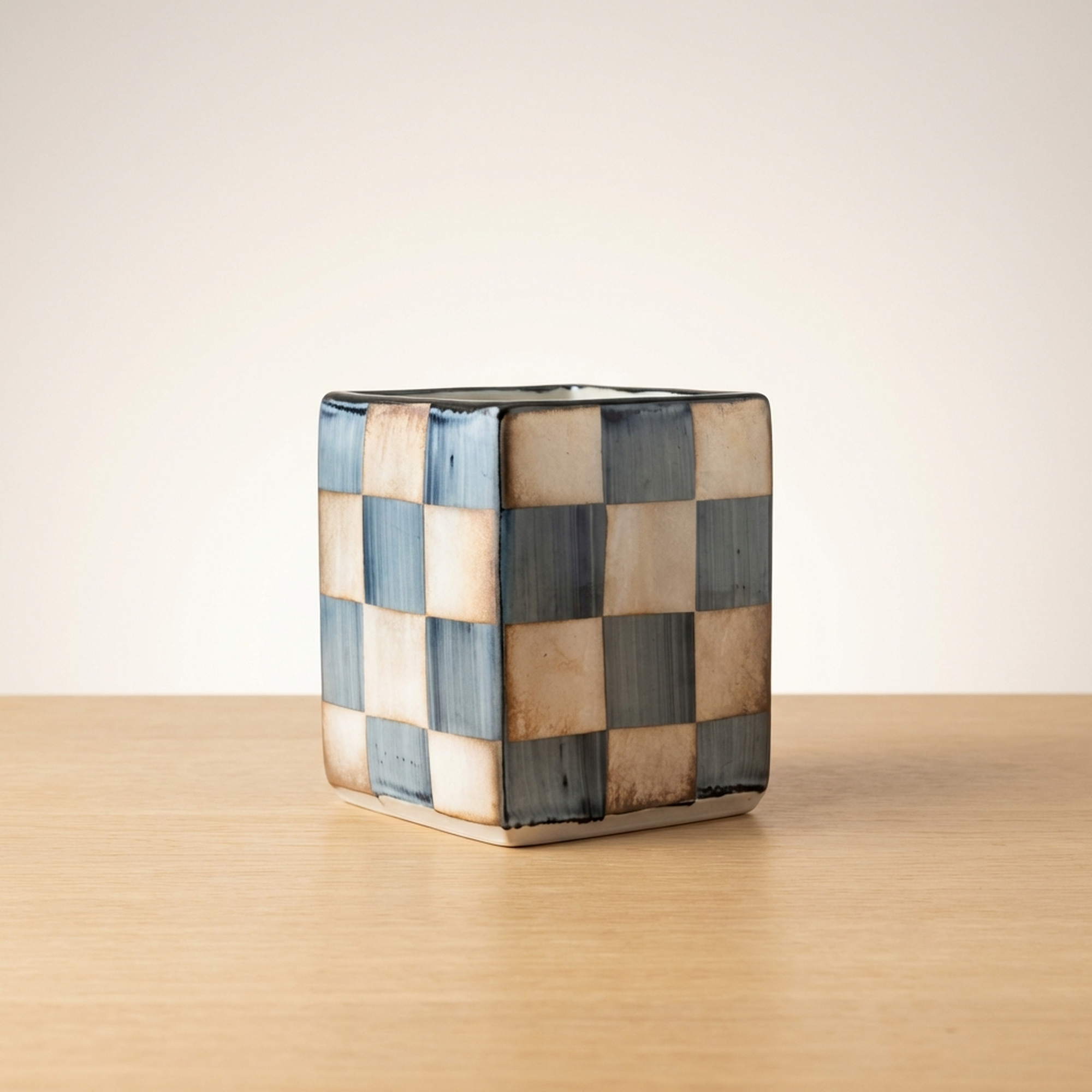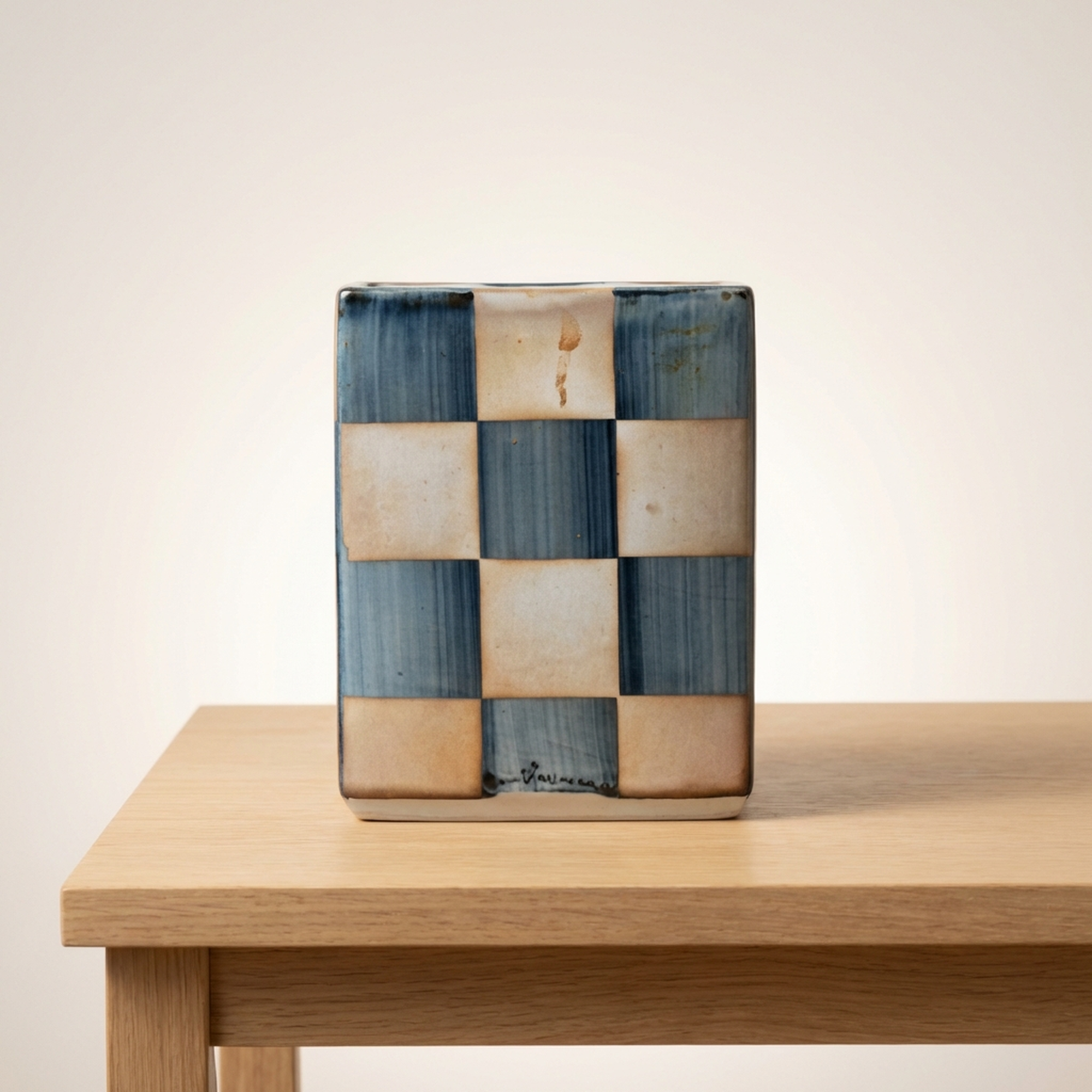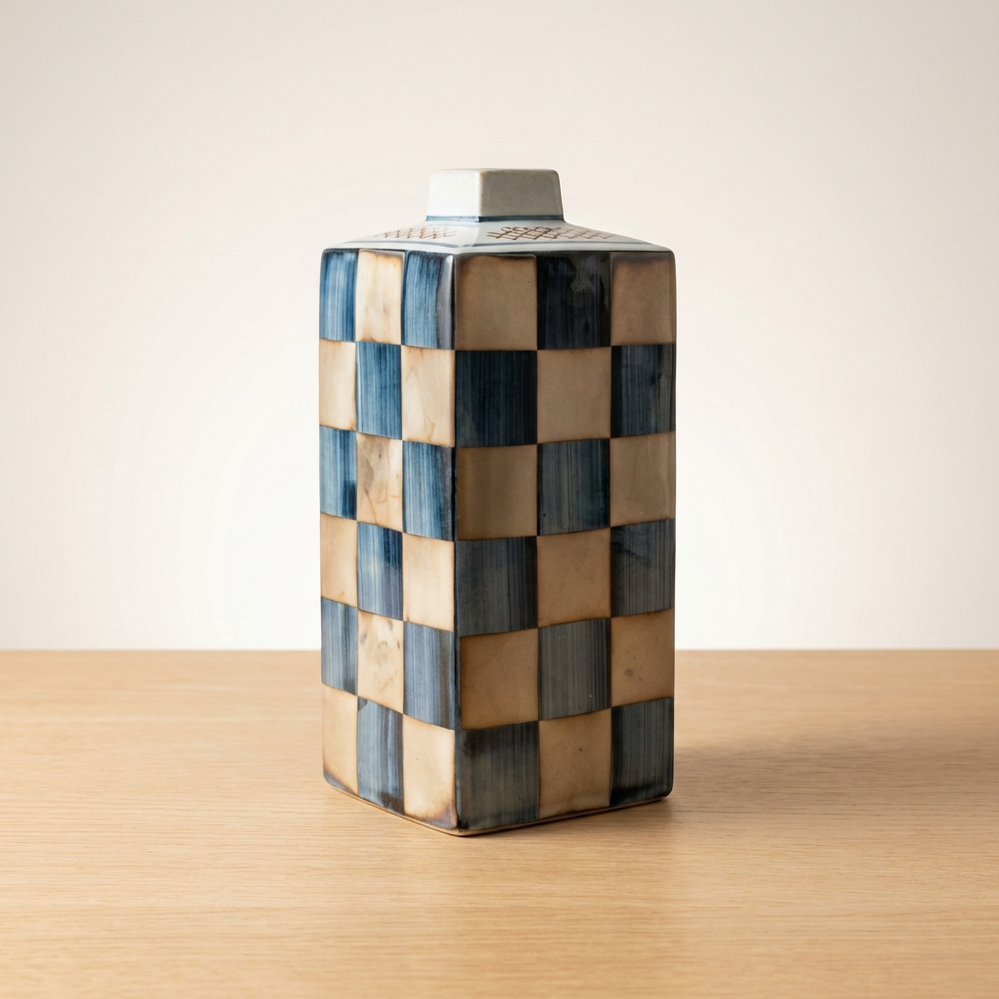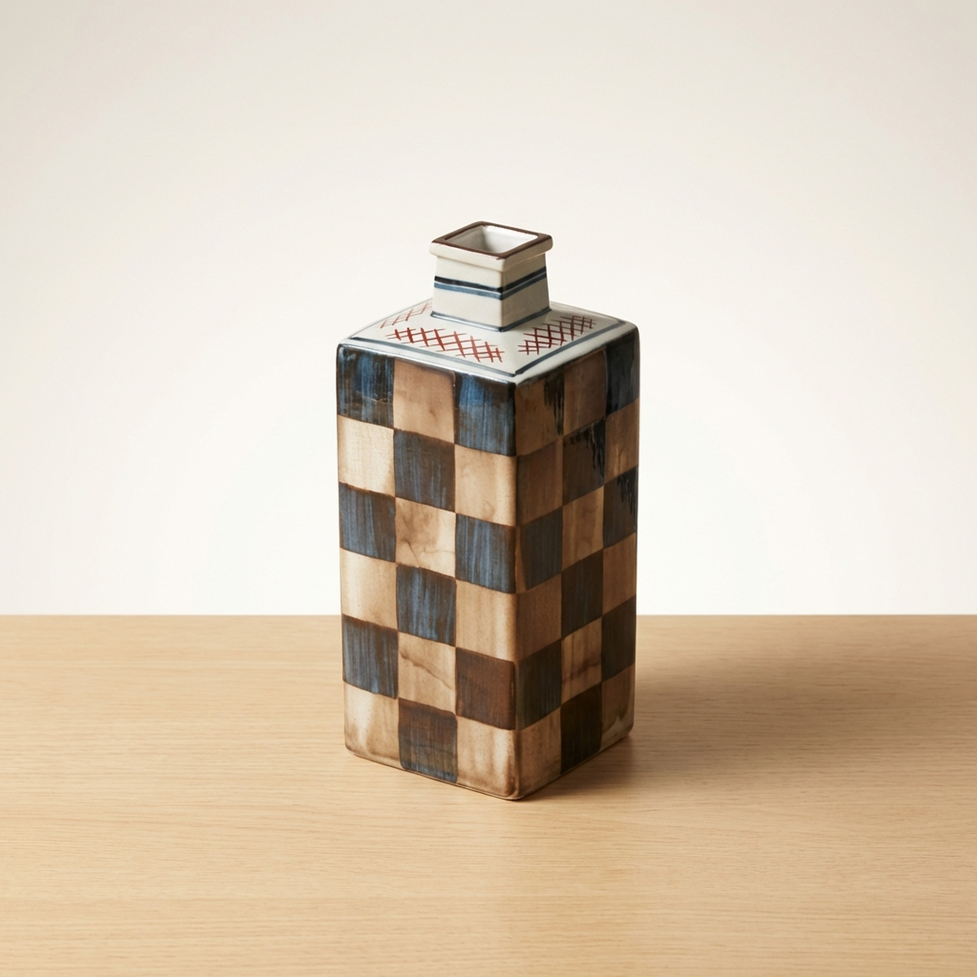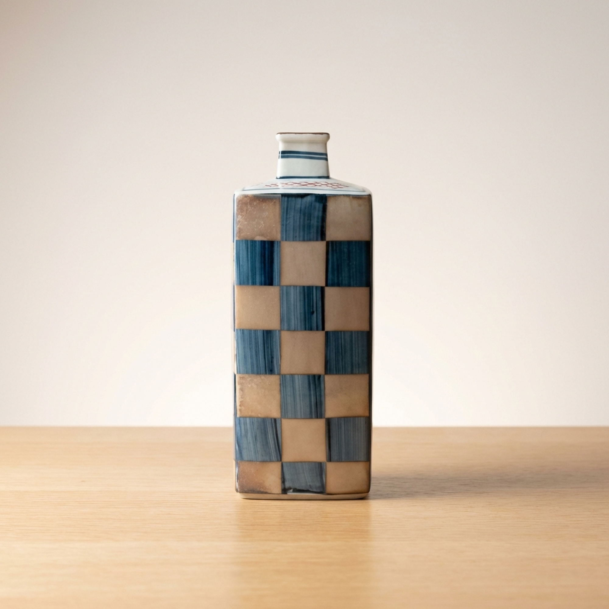 <p>Maker / Brand: Kutani-yaki Eizan Title of Work: D-5 Showa Retro Kutani-yaki Eizan-made Silver Ichimatsu Vase with Kiri Tomobako, Modern Checkered Pattern, Square</p> <p>Discover a striking blend of tradition and modernity with this exquisite Kutani-yaki vase, masterfully crafted by the artist Eizan. Adorned with a striking Gin Ichimatsu (silver checkered) pattern across its entire surface, this piece presents a simple yet powerful design presence. Its sharp, square form makes it a versatile accent, perfect for displaying a single bloom or standing alone as a sophisticated objet d'art, elevating any contemporary or Japanese-modern interior.</p> <p>Artistic & Cultural Background Kutani-yaki, originating from Ishikawa Prefecture, is renowned for its distinctive overglaze enamels and bold decorative styles. While often celebrated for its vibrant, polychromatic designs, this particular vase from the Showa era (1926-1989) showcases a more subdued and contemporary interpretation of Kutani craftsmanship. It reflects a period where traditional techniques began to embrace modern aesthetics, offering a fresh perspective on classic Japanese artistry.</p> <p>Design & Technique The vase features a striking Gin Ichimatsu pattern, a traditional Japanese checkered motif, rendered here in calm, muted tones of blue-grey and earthy beige. This sophisticated palette lends the piece an understated elegance. Complementing the main design, a delicate mesh pattern in subtle red adorns the top surface, adding a refined detail. The overall effect is one of quiet strength and timeless appeal, a example to Eizan's artistic vision.</p> <p>Form & Aesthetic Qualities * <strong>Geometric Precision:</strong> A sharp, square column (kakuhanaire) shape offers a clean, architectural silhouette that feels distinctly modern. * <strong>Subtle Sophistication:</strong> The muted color palette of the Gin Ichimatsu pattern creates a sense of calm and refined beauty, allowing the form and pattern to speak for themselves. * <strong>Harmonious Contrast:</strong> The bold checkered pattern is balanced by the delicate mesh motif on the top, adding visual interest without overwhelming the minimalist aesthetic.</p> <p>Collector & Decorative Appeal * <strong>Versatile Decor Piece:</strong> Ideal for showcasing a single flower, a small arrangement, or as a standalone sculptural element in a minimalist or Japanese-inspired setting. * <strong>Wa-Modern Elegance:</strong> Its fusion of traditional pattern and contemporary form makes it a perfect fit for interiors seeking a sophisticated "wa-modern" aesthetic. * <strong>Authentic Craftsmanship:</strong> Accompanied by its original kiri tomobako (wooden storage box), which shows some signs of age consistent with storage but remains fully protective, this piece by Eizan represents a fine example of Kutani-yaki artistry from the Showa period.</p> <p>This exceptional vase is a example to the enduring beauty of Japanese craft, perfect for the knowledgeable collector or decorator seeking a unique blend of heritage and contemporary style.</p> <h3>Details</h3> <table style="border-collapse:collapse;width:100%"><tr><td style="padding:4px 12px 4px 0;font-weight:bold;white-space:nowrap">Condition</td><td style="padding:4px 0">Good</td></tr><tr><td style="padding:4px 12px 4px 0;font-weight:bold;white-space:nowrap">Origin</td><td style="padding:4px 0">Kutani, Ishikawa</td></tr><tr><td style="padding:4px 12px 4px 0;font-weight:bold;white-space:nowrap">Material</td><td style="padding:4px 0">Porcelain</td></tr><tr><td style="padding:4px 12px 4px 0;font-weight:bold;white-space:nowrap">Era</td><td style="padding:4px 0">Showa</td></tr><tr><td style="padding:4px 12px 4px 0;font-weight:bold;white-space:nowrap">Dimensions</td><td style="padding:4px 0">サイズ】</td></tr></table>