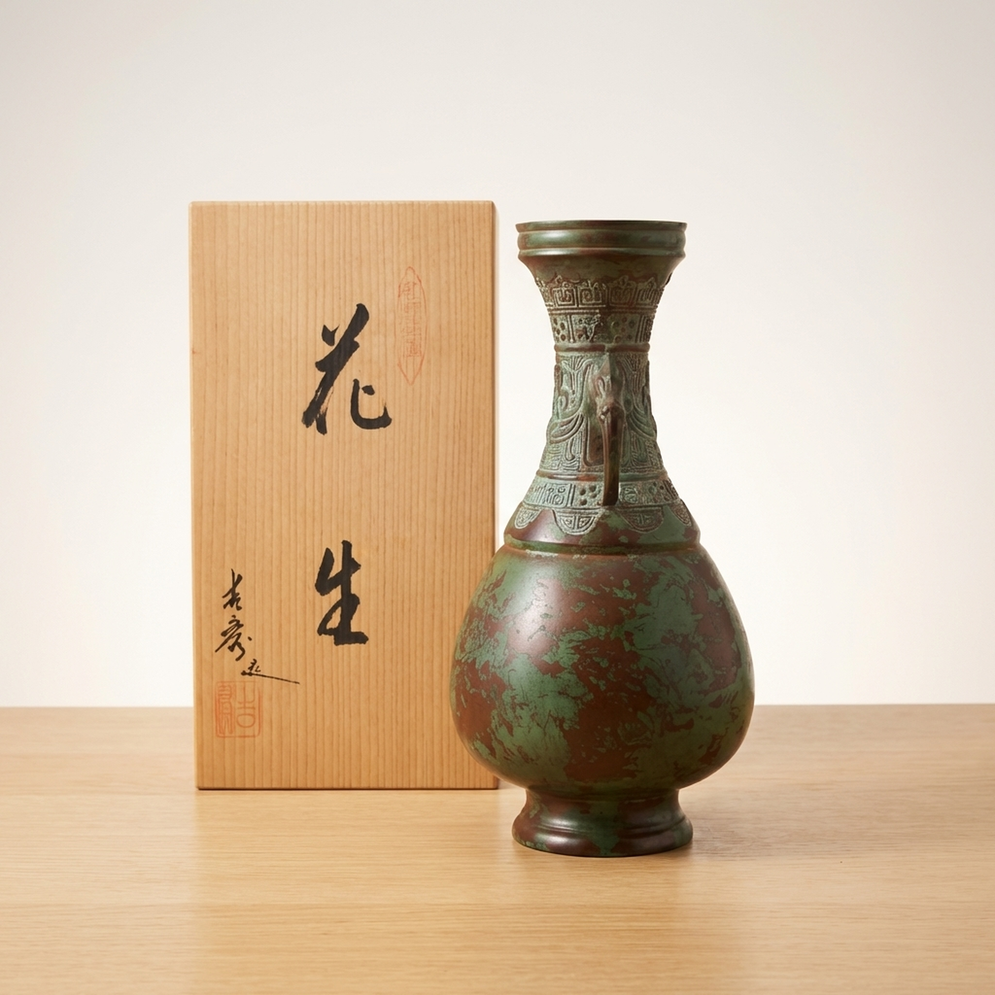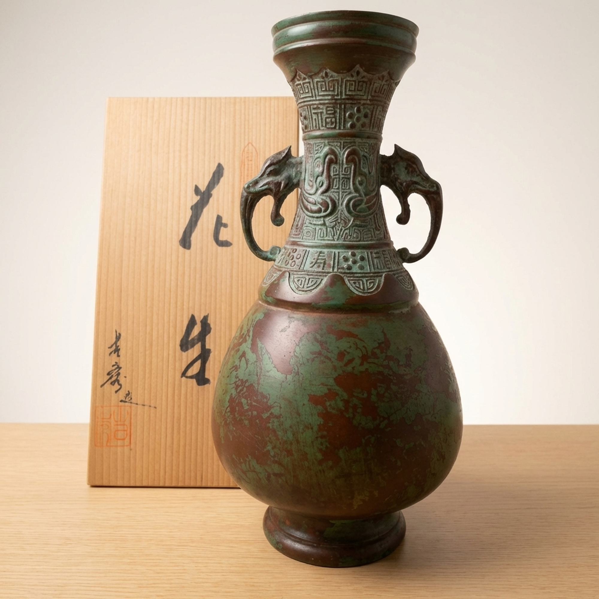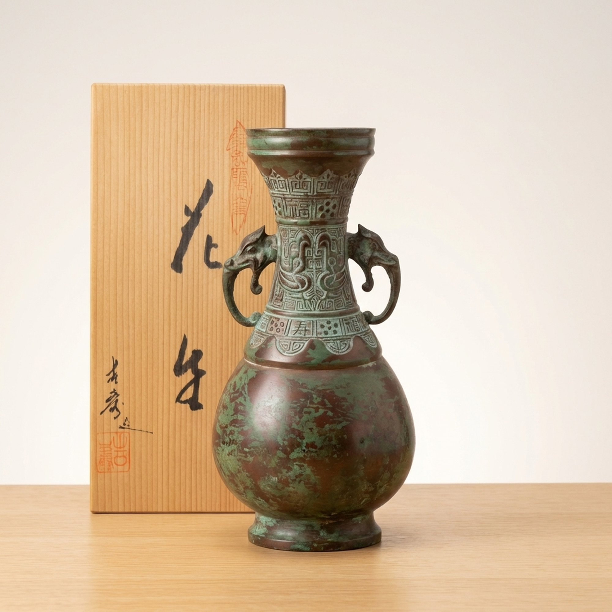 <p>Maker / Brand: Takaoka Douki, possibly by Yoshihide Title of Work: Takaoka Bronze Ware Flower Vase by Yoshihide</p> <p>This exquisite Takaoka Douki bronze vase, standing approximately 24cm tall, is thought to be the work of Yoshihide. It features a striking verdigris patina and detailed decorative elements, including elegant elephant-head handles, embodying the rich tradition of Japanese metal craftsmanship.</p> <p>Artistic & Cultural Background Takaoka Douki refers to bronze ware from Takaoka City, Toyama Prefecture, a region renowned for its metal casting for over 400 years. Established in the early 17th century, Takaoka's artisans have perfected techniques in casting, engraving, and finishing, producing a wide range of items from temple bells to detailed decorative objects like this vase. These pieces are cherished for their durability and artistic merit, often becoming heirlooms.</p> <p>Design & Technique This vase showcases the distinctive artistry of Takaoka Douki. Crafted from a copper alloy, its surface is adorned with detailed patterns, including what appear to be auspicious motifs and geometric borders around the neck and shoulder. The most prominent features are the two finely sculpted elephant-head handles, adding a sense of grandeur and exoticism. The entire piece is covered in a natural verdigris (rokushou), giving it a rich, aged character. While the origin of this patina is unknown, it enhances the antique appeal of the vessel. Please note that there are small scratches and dirt consistent with age and long-term storage, and some areas that might appear as patterns could be surface wear. We encourage reviewing the provided images for a comprehensive understanding of its condition.</p> <p>Form & Aesthetic Qualities * <strong>Elegant Silhouette:</strong> A classic vase form with a flared rim, a tapering neck, a rounded body, and a stable foot, creating a balanced and graceful profile. * <strong>Textured Patina:</strong> The extensive verdigris offers a striking interplay of deep green and reddish-brown tones, highlighting the detailed surface details and imparting a sense of history. * <strong>Regal Embellishments:</strong> The robust elephant-head handles and detailed relief patterns lend a dignified and ancient aesthetic, reminiscent of classical bronze artifacts.</p> <p>Collector & Decorative Appeal * <strong>Authentic Japanese Craftsmanship:</strong> A genuine piece of Takaoka Douki, representing centuries of metalworking tradition and the skill of its artisans. * <strong>Timeless Decorative Statement:</strong> Its unique patina and classical design make it a striking focal point for any interior, from traditional to contemporary. * <strong>Historical Character:</strong> The natural aging and verdigris tell a story of time, offering a tangible connection to Japanese artistic heritage.</p> <p>This Takaoka Douki vase is an exceptional acquisition for collectors seeking pieces with profound cultural resonance and enduring beauty.</p> <h3>Details</h3> <table style="border-collapse:collapse;width:100%"><tr><td style="padding:4px 12px 4px 0;font-weight:bold;white-space:nowrap">Condition</td><td style="padding:4px 0">Fair</td></tr><tr><td style="padding:4px 12px 4px 0;font-weight:bold;white-space:nowrap">Material</td><td style="padding:4px 0">Bronze</td></tr><tr><td style="padding:4px 12px 4px 0;font-weight:bold;white-space:nowrap">Era</td><td style="padding:4px 0">Unknown</td></tr><tr><td style="padding:4px 12px 4px 0;font-weight:bold;white-space:nowrap">Dimensions</td><td style="padding:4px 0">サイズは高さ約24cmです。全体感として内寸約25cm x 約12.7cm x 約12.7cmの供箱に収まるサイズです。</td></tr></table>