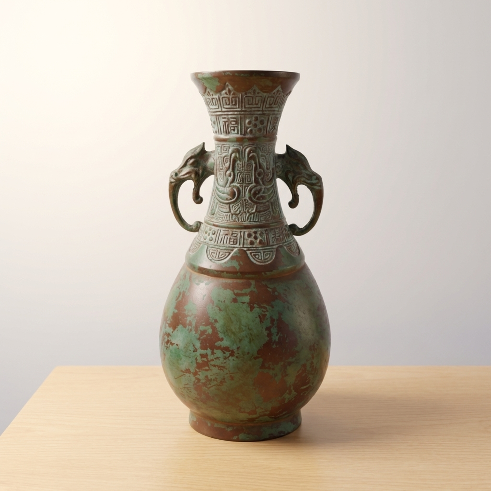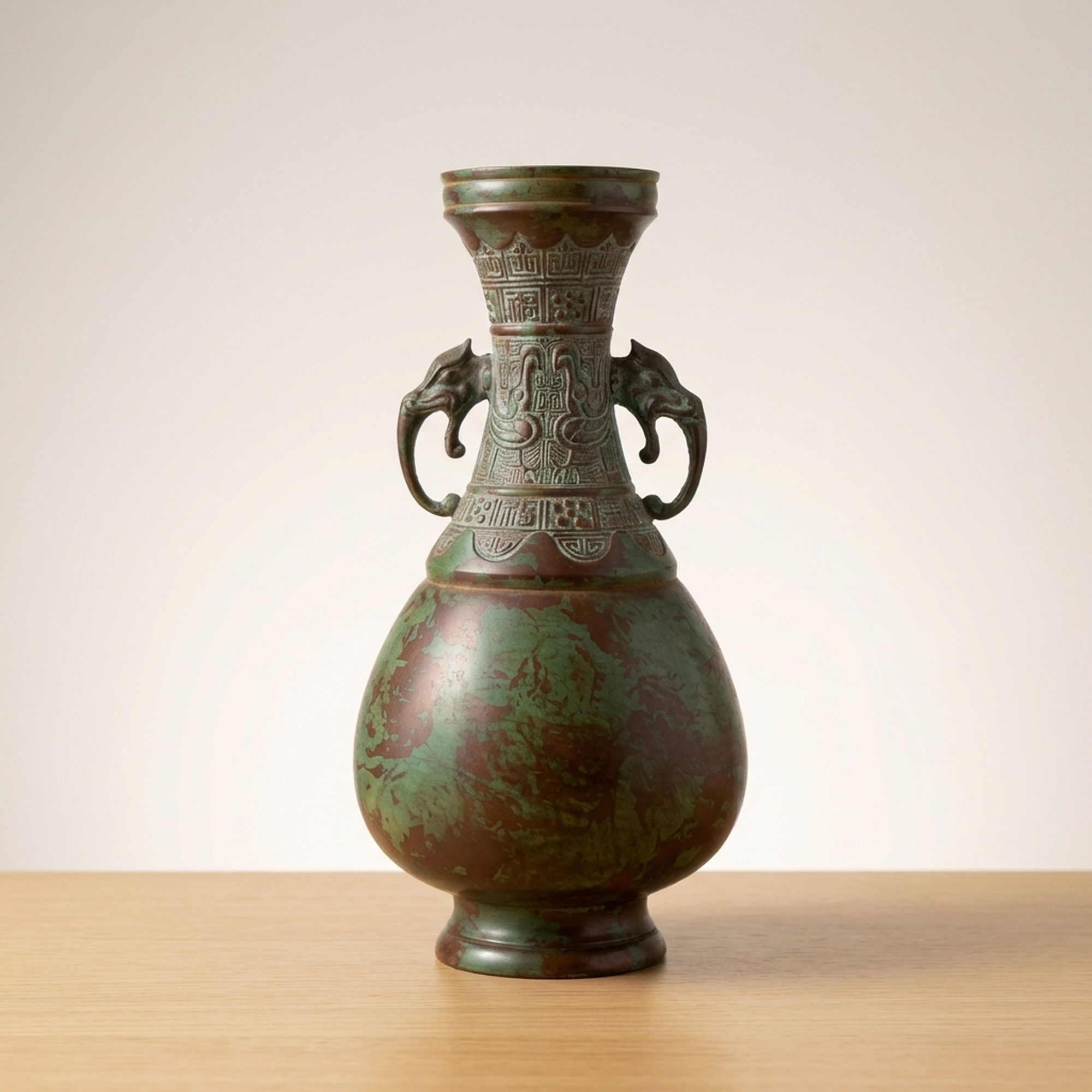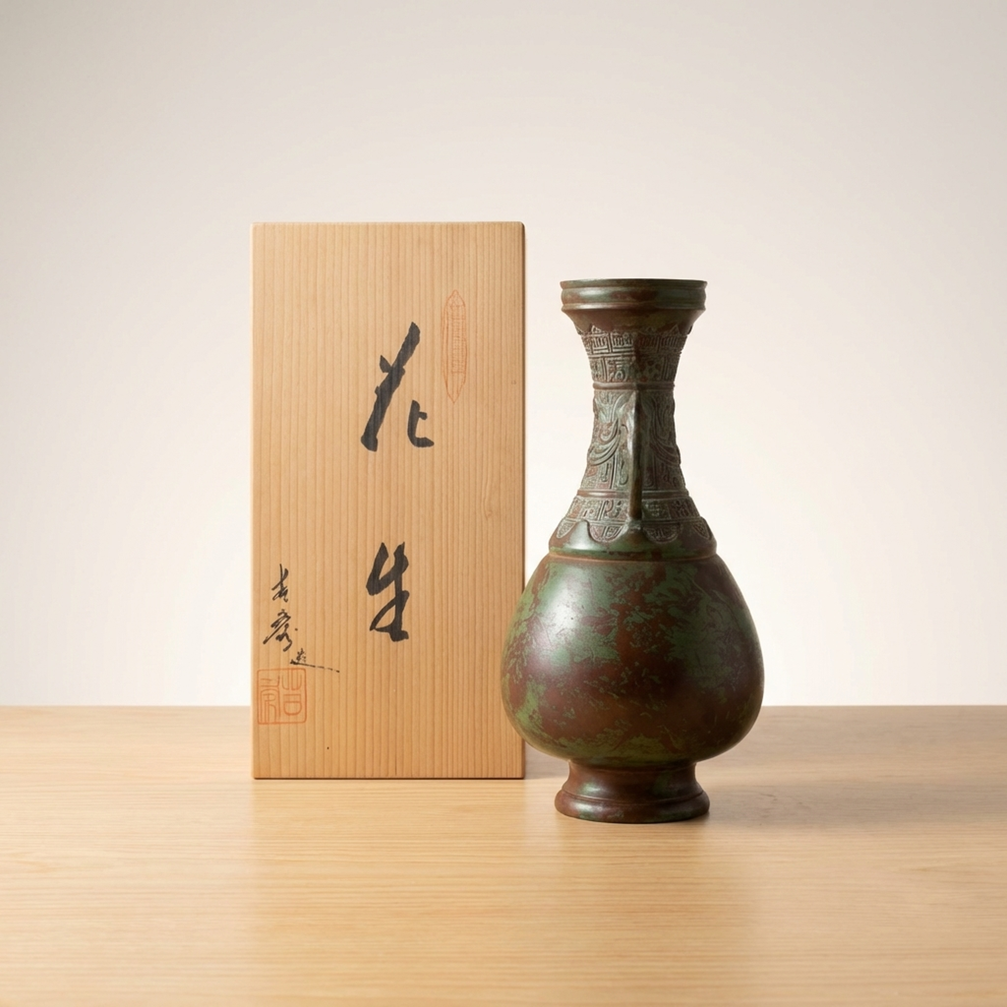 <p>Maker / Brand: Takaoka Douki, possibly by Yoshihide Title of Work: Takaoka Bronze Ware Flower Vase by Yoshihide</p> <p>This exquisite Takaoka Douki bronze vase, standing approximately 24cm tall, is thought to be the work of Yoshihide. It features a striking verdigris patina and detailed decorative elements, including elegant elephant-head handles, embodying the rich tradition of Japanese metal craftsmanship.</p> <p>Artistic & Cultural Background Takaoka Douki refers to bronze ware from Takaoka City, Toyama Prefecture, a region renowned for its metal casting for over 400 years. Established in the early 17th century, Takaoka's artisans have perfected techniques in casting, engraving, and finishing, producing a wide range of items from temple bells to detailed decorative objects like this vase. These pieces are cherished for their durability and artistic merit, often becoming heirlooms.</p> <p>Design & Technique This vase showcases the distinctive artistry of Takaoka Douki. Crafted from a copper alloy, its surface is adorned with detailed patterns, including what appear to be auspicious motifs and geometric borders around the neck and shoulder. The most prominent features are the two finely sculpted elephant-head handles, adding a sense of grandeur and exoticism. The entire piece is covered in a natural verdigris (rokushou), giving it a rich, aged character. While the origin of this patina is unknown, it enhances the antique appeal of the vessel. Please note that there are small scratches and dirt consistent with age and long-term storage, and some areas that might appear as patterns could be surface wear. We encourage reviewing the provided images for a comprehensive understanding of its condition.</p> <p>Form & Aesthetic Qualities * <strong>Elegant Silhouette:</strong> A classic vase form with a flared rim, a tapering neck, a rounded body, and a stable foot, creating a balanced and graceful profile. * <strong>Textured Patina:</strong> The extensive verdigris offers a striking interplay of deep green and reddish-brown tones, highlighting the detailed surface details and imparting a sense of history. * <strong>Regal Embellishments:</strong> The robust elephant-head handles and detailed relief patterns lend a dignified and ancient aesthetic, reminiscent of classical bronze artifacts.</p> <p>Collector & Decorative Appeal * <strong>Authentic Japanese Craftsmanship:</strong> A genuine piece of Takaoka Douki, representing centuries of metalworking tradition and the skill of its artisans. * <strong>Timeless Decorative Statement:</strong> Its unique patina and classical design make it a striking focal point for any interior, from traditional to contemporary. * <strong>Historical Character:</strong> The natural aging and verdigris tell a story of time, offering a tangible connection to Japanese artistic heritage.</p> <p>This Takaoka Douki vase is an exceptional acquisition for collectors seeking pieces with profound cultural resonance and enduring beauty.</p> <h3>Details</h3> <table style="border-collapse:collapse;width:100%"><tr><td style="padding:4px 12px 4px 0;font-weight:bold;white-space:nowrap">Condition</td><td style="padding:4px 0">Fair</td></tr><tr><td style="padding:4px 12px 4px 0;font-weight:bold;white-space:nowrap">Material</td><td style="padding:4px 0">Bronze</td></tr><tr><td style="padding:4px 12px 4px 0;font-weight:bold;white-space:nowrap">Era</td><td style="padding:4px 0">Unknown</td></tr><tr><td style="padding:4px 12px 4px 0;font-weight:bold;white-space:nowrap">Dimensions</td><td style="padding:4px 0">サイズは高さ約24cmです。全体感として内寸約25cm x 約12.7cm x 約12.7cmの供箱に収まるサイズです。</td></tr></table>