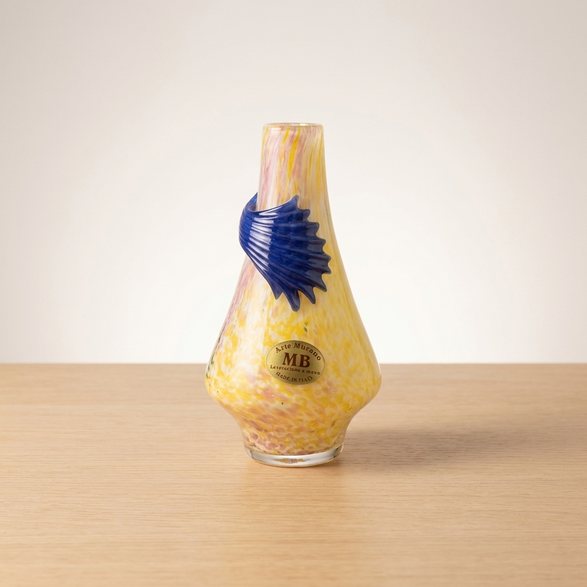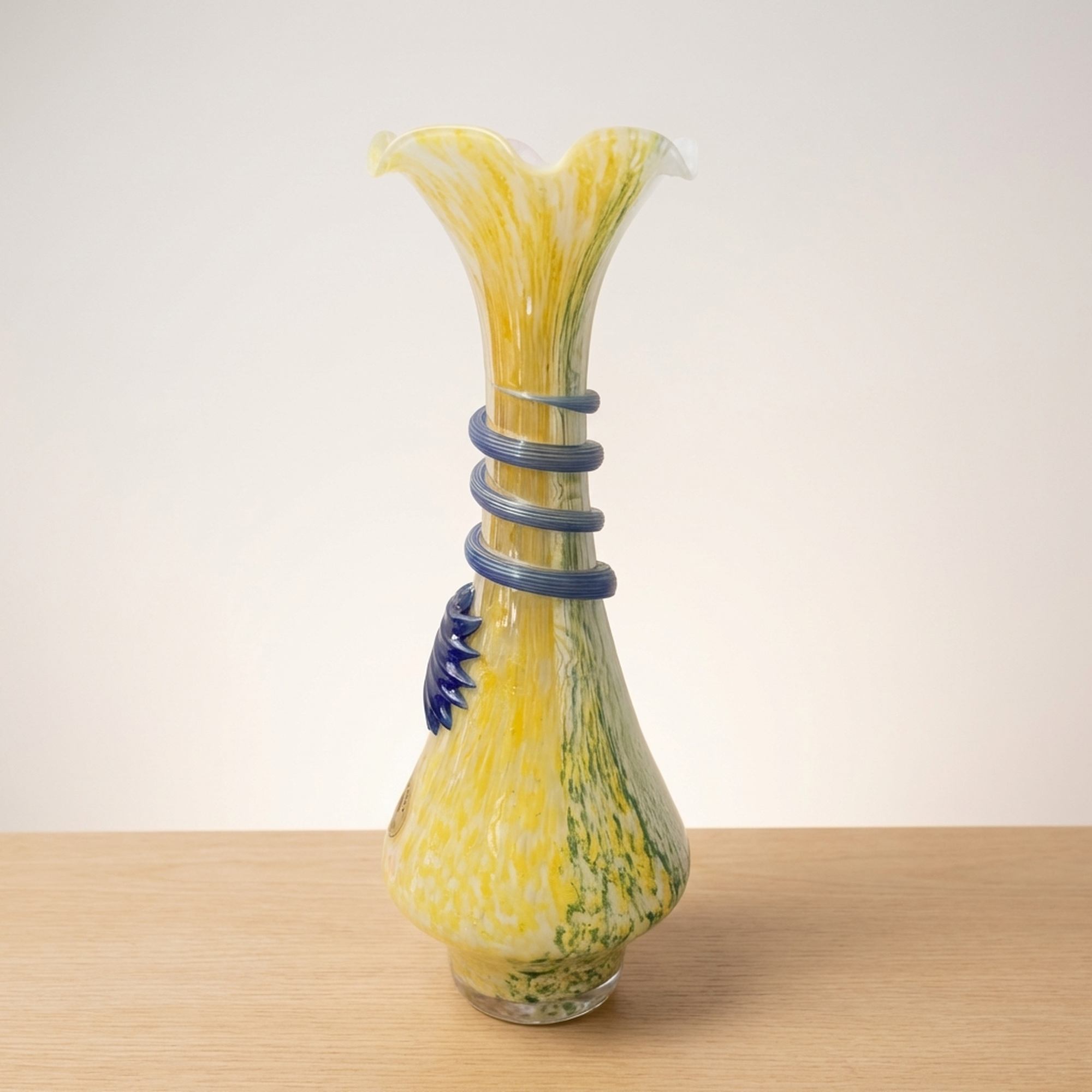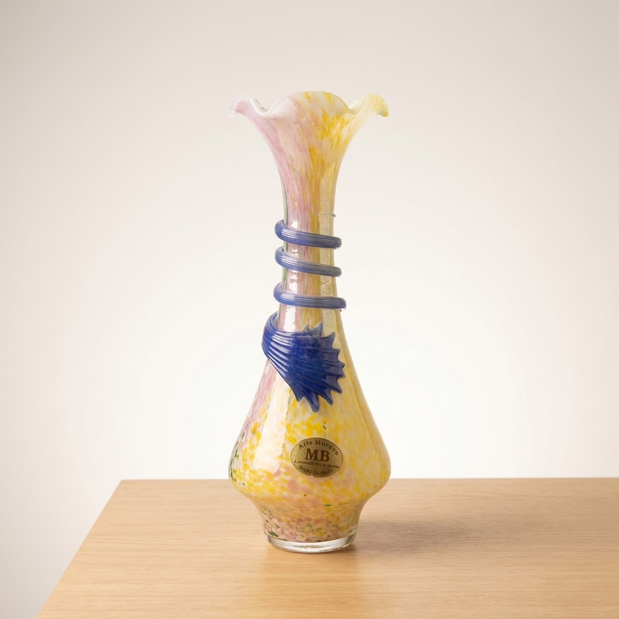 <p>Maker / Brand: Arte Murano Title of Work: Arte Murano Murano Glass Venetian Vase</p> <p>Presenting a striking vintage Murano Glass vase by the esteemed Italian maker, Arte Murano. Crafted in Italy, this exquisite piece showcases the renowned artistry of Murano crystal glass, offering a vibrant and elegant addition to any collection. While in beautiful, near-new condition, please note that this is a vintage item, and those sensitive to older pieces should consider this before purchase.</p> <p>Artistic & Cultural Background Murano glass, originating from the island of Murano in Venice, Italy, boasts a rich history spanning centuries. Since the 13th century, Murano has been the global epicenter for glassmaking, with its master artisans developing exceptional techniques passed down through generations. This tradition of innovation and careful craftsmanship has cemented Murano's reputation for producing some of the world's most exquisite and sought-after glass art.</p> <p>Design & Technique This Arte Murano vase is a example to the island's vibrant glassmaking heritage. Its body features a stunning interplay of colors, primarily warm yellows and delicate pinks, swirled within the crystal glass, creating a luminous, almost iridescent effect. A striking blue element, resembling both a coiled serpent and a stylized fin, is artfully applied to the vase's mid-section, adding a dynamic, sculptural contrast to the fluid form.</p> <p>Form & Aesthetic Qualities * <strong>Elegant Silhouette:</strong> The vase features a gracefully elongated neck that flares into a charming ruffled rim, resting upon a gently bulbous base, creating a harmonious and balanced profile. * <strong>Luminous Coloration:</strong> The internal swirls of yellow and pink crystal glass create a soft, radiant glow, giving the piece a sense of warmth and depth. * <strong>Dynamic Embellishment:</strong> The bold, cobalt blue applied glass element provides a dramatic focal point, enhancing the vase's unique character and visual intrigue.</p> <p>Collector & Decorative Appeal * <strong>Authentic Murano Artistry:</strong> A genuine piece from Arte Murano, this vase embodies the celebrated tradition of Italian glassmaking, making it a valuable acquisition for collectors. * <strong>Vintage Charm & Rarity:</strong> As a vintage item, it carries a unique history and character, offering a distinctive aesthetic that stands apart from contemporary mass-produced items. * <strong>Statement Decor Piece:</strong> Its vibrant colors, elegant form, and distinctive applied decoration ensure it will be a striking centerpiece or accent in any sophisticated interior.</p> <p>This Arte Murano vase is ideal for the knowledgeable collector or decorator who appreciates the timeless beauty and masterful craftsmanship of authentic Murano glass.</p> <h3>Details</h3> <table style="border-collapse:collapse;width:100%"><tr><td style="padding:4px 12px 4px 0;font-weight:bold;white-space:nowrap">Condition</td><td style="padding:4px 0">Excellent</td></tr><tr><td style="padding:4px 12px 4px 0;font-weight:bold;white-space:nowrap">Material</td><td style="padding:4px 0">Glass</td></tr><tr><td style="padding:4px 12px 4px 0;font-weight:bold;white-space:nowrap">Era</td><td style="padding:4px 0">Unknown</td></tr></table>