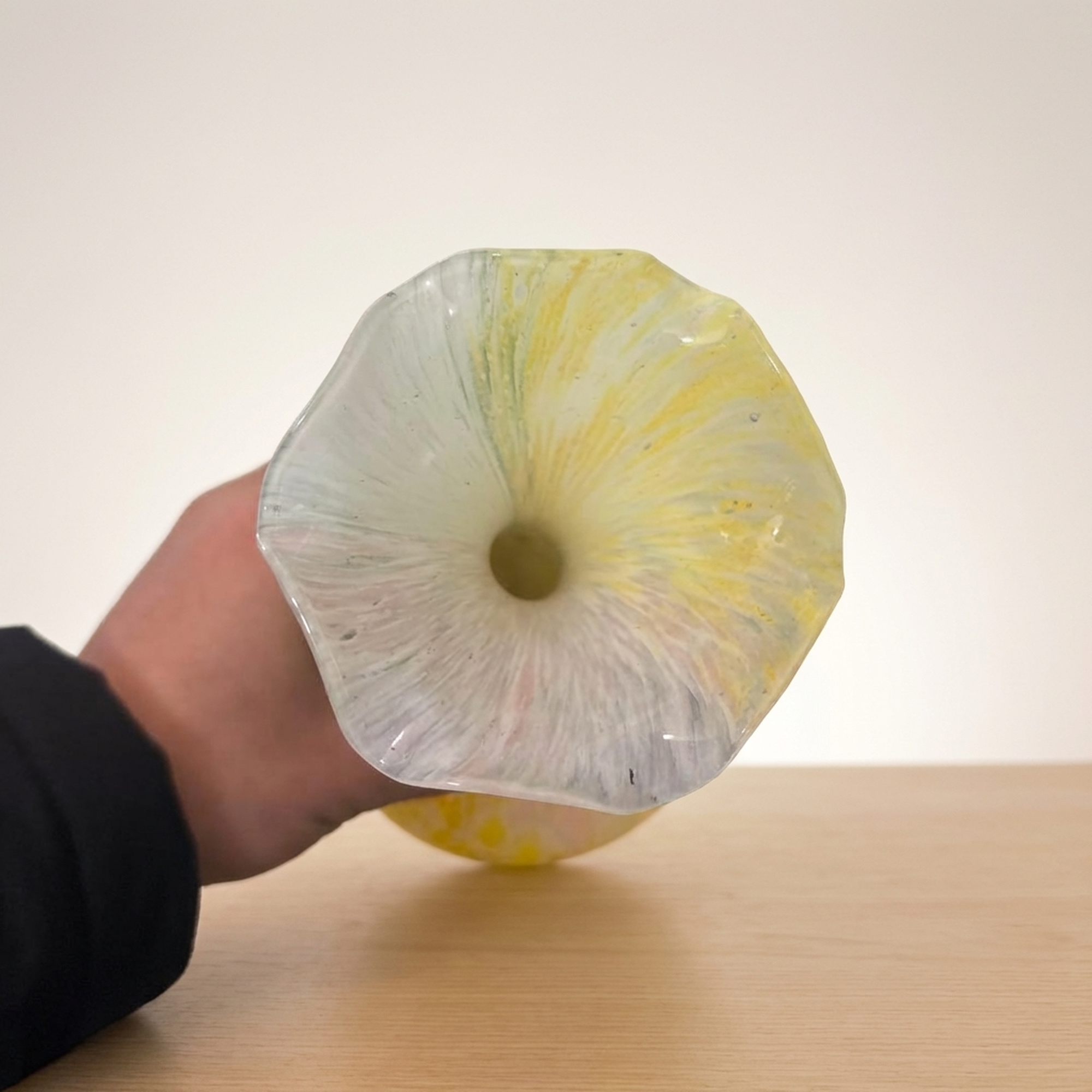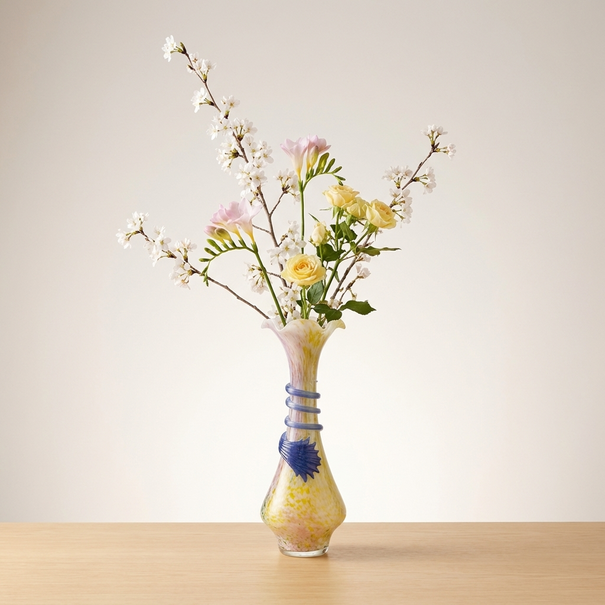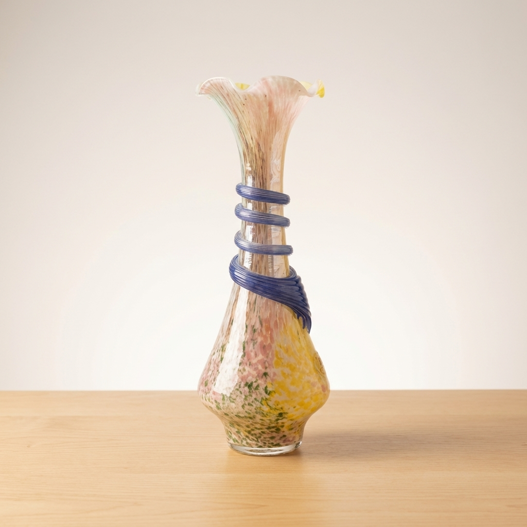 <p>Maker / Brand: Arte Murano Title of Work: Arte Murano Murano Glass Venetian Vase</p> <p>Presenting a striking vintage Murano Glass vase by the esteemed Italian maker, Arte Murano. Crafted in Italy, this exquisite piece showcases the renowned artistry of Murano crystal glass, offering a vibrant and elegant addition to any collection. While in beautiful, near-new condition, please note that this is a vintage item, and those sensitive to older pieces should consider this before purchase.</p> <p>Artistic & Cultural Background Murano glass, originating from the island of Murano in Venice, Italy, boasts a rich history spanning centuries. Since the 13th century, Murano has been the global epicenter for glassmaking, with its master artisans developing exceptional techniques passed down through generations. This tradition of innovation and careful craftsmanship has cemented Murano's reputation for producing some of the world's most exquisite and sought-after glass art.</p> <p>Design & Technique This Arte Murano vase is a example to the island's vibrant glassmaking heritage. Its body features a stunning interplay of colors, primarily warm yellows and delicate pinks, swirled within the crystal glass, creating a luminous, almost iridescent effect. A striking blue element, resembling both a coiled serpent and a stylized fin, is artfully applied to the vase's mid-section, adding a dynamic, sculptural contrast to the fluid form.</p> <p>Form & Aesthetic Qualities * <strong>Elegant Silhouette:</strong> The vase features a gracefully elongated neck that flares into a charming ruffled rim, resting upon a gently bulbous base, creating a harmonious and balanced profile. * <strong>Luminous Coloration:</strong> The internal swirls of yellow and pink crystal glass create a soft, radiant glow, giving the piece a sense of warmth and depth. * <strong>Dynamic Embellishment:</strong> The bold, cobalt blue applied glass element provides a dramatic focal point, enhancing the vase's unique character and visual intrigue.</p> <p>Collector & Decorative Appeal * <strong>Authentic Murano Artistry:</strong> A genuine piece from Arte Murano, this vase embodies the celebrated tradition of Italian glassmaking, making it a valuable acquisition for collectors. * <strong>Vintage Charm & Rarity:</strong> As a vintage item, it carries a unique history and character, offering a distinctive aesthetic that stands apart from contemporary mass-produced items. * <strong>Statement Decor Piece:</strong> Its vibrant colors, elegant form, and distinctive applied decoration ensure it will be a striking centerpiece or accent in any sophisticated interior.</p> <p>This Arte Murano vase is ideal for the knowledgeable collector or decorator who appreciates the timeless beauty and masterful craftsmanship of authentic Murano glass.</p> <h3>Details</h3> <table style="border-collapse:collapse;width:100%"><tr><td style="padding:4px 12px 4px 0;font-weight:bold;white-space:nowrap">Condition</td><td style="padding:4px 0">Excellent</td></tr><tr><td style="padding:4px 12px 4px 0;font-weight:bold;white-space:nowrap">Material</td><td style="padding:4px 0">Glass</td></tr><tr><td style="padding:4px 12px 4px 0;font-weight:bold;white-space:nowrap">Era</td><td style="padding:4px 0">Unknown</td></tr></table>