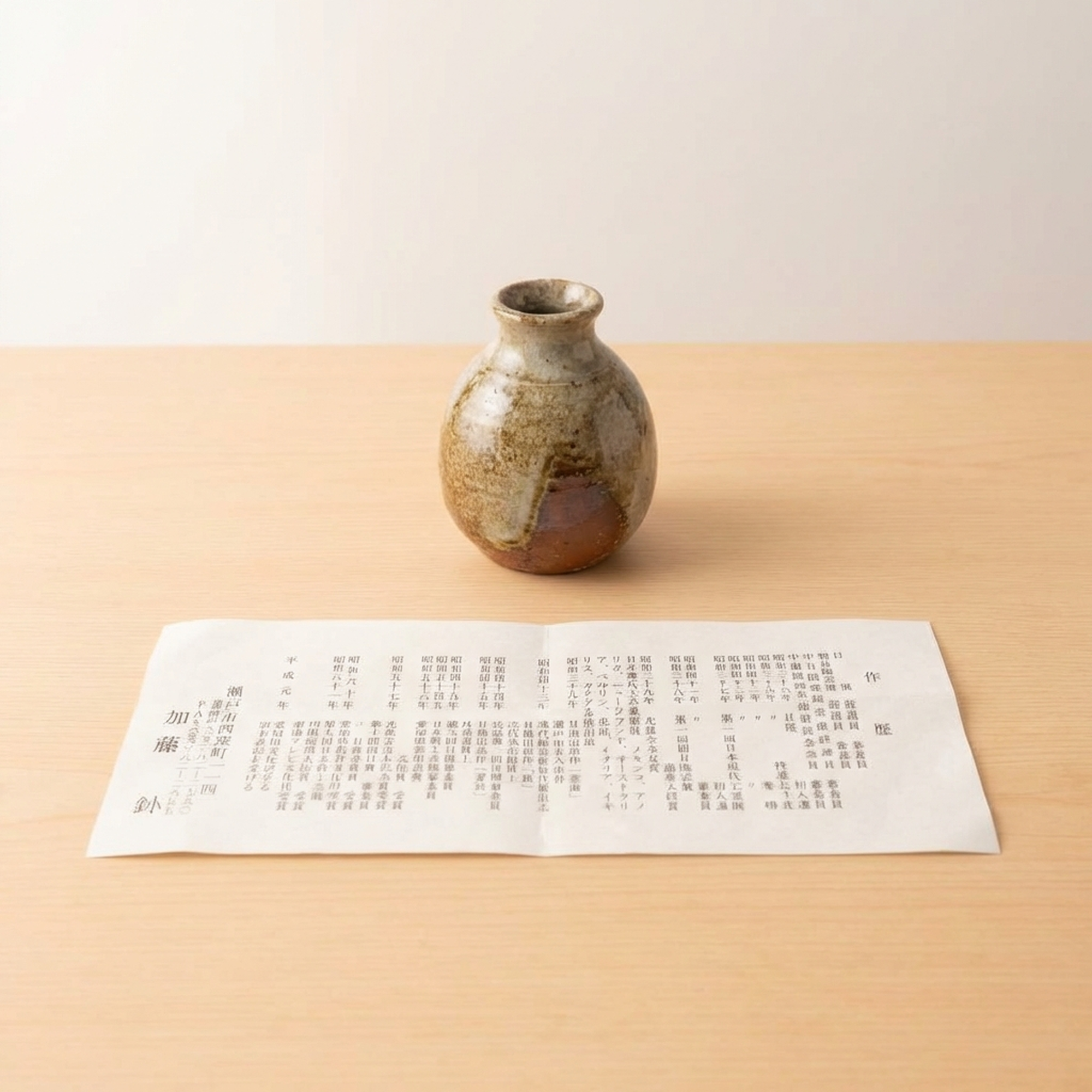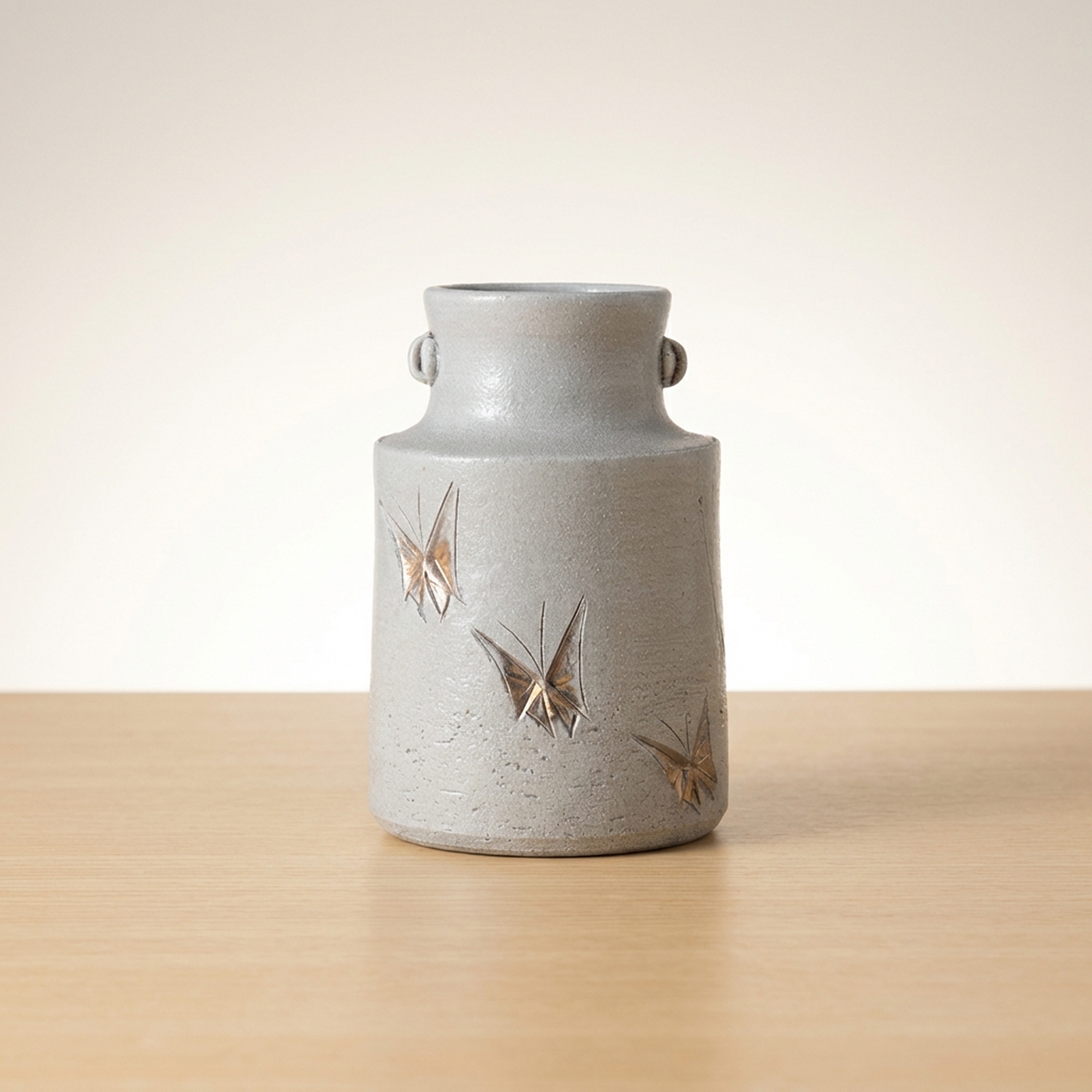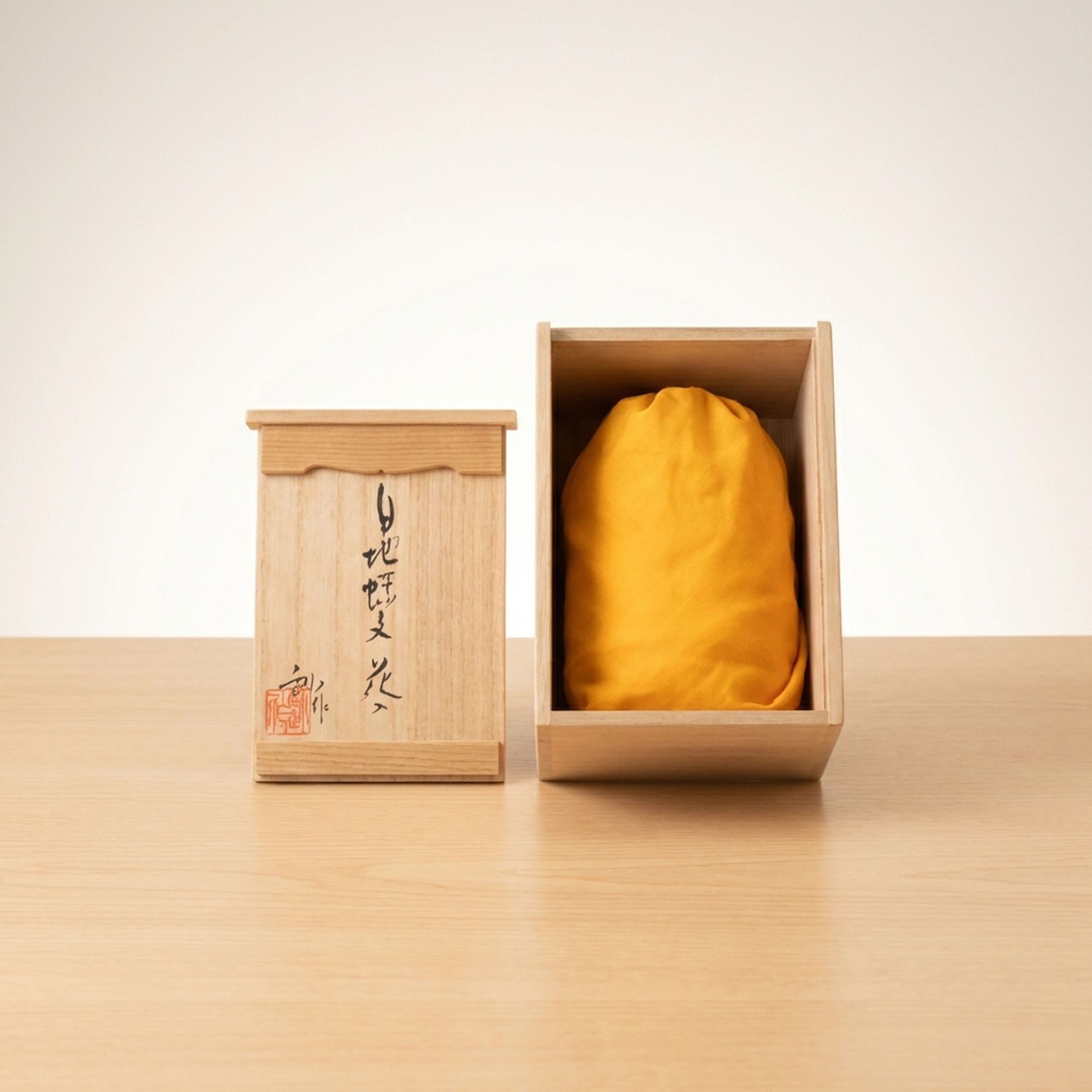 <p>Maker / Brand: Seto-gama Kato Sho Title of Work: Flower Vase with Butterflies on White Ground, with Tomobako, Yellow Cloth, and Tag</p> <p>Discover this exquisite flower vase crafted by the renowned artist Kato Sho from the historic Seto kilns. This unused piece features a delicate butterfly motif against a subtle white ground, presented in its original artist-signed wooden box (tomobako), complete with a protective yellow cloth and an informational tag. It is a example to the refined artistry and careful craftsmanship characteristic of Japanese ceramics.</p> <p>Artistic & Cultural Background Seto-yaki, originating from the Seto region of Aichi Prefecture, boasts one of Japan's longest and most celebrated ceramic traditions, dating back over a thousand years. Known for its diverse range of glazes and forms, Seto ware has profoundly influenced Japanese pottery. Flower vases, or kaki, hold a special place in Japanese culture, integral to the art of ikebana and as elegant decorative elements that bring nature's beauty indoors.</p> <p>Design & Technique The vase showcases a sophisticated design where graceful butterflies are subtly rendered against a pale, textured ground. The butterflies appear to be either delicately carved or applied with a contrasting, perhaps metallic, finish, creating a gentle shimmer that catches the light. This technique highlights the artist's skill in achieving both depth and understated elegance, allowing the natural form of the butterflies to emerge with quiet beauty.</p> <p>Form & Aesthetic Qualities * <strong>Shape:</strong> A charming, cylindrical form with a slightly flared rim and two small, decorative loop handles, evoking a sense of rustic elegance. * <strong>Texture:</strong> The surface exhibits a pleasing, slightly granular or matte texture, providing a tactile experience that complements its visual softness. * <strong>Visual Appeal:</strong> The harmonious interplay of the pale ground and the shimmering butterfly motifs creates a serene and timeless aesthetic, embodying Japanese principles of natural beauty and simplicity.</p> <p>Collector & Decorative Appeal * <strong>Authenticity & Provenance:</strong> Accompanied by its tomobako, signed by the artist Kato Sho, this piece offers verified authenticity and adds significant value for collectors. * <strong>Pristine Condition:</strong> As an unused item, this vase is in immaculate condition, preserving its original beauty and the artist's intent. * <strong>Versatile Elegance:</strong> Its classic yet understated design makes it a versatile piece, perfect for displaying a single bloom in a traditional setting or as a sophisticated accent in a contemporary interior.</p> <p>This exceptional vase is an ideal acquisition for knowledgeable collectors of Japanese ceramics and those seeking a unique, handcrafted piece to elevate their living space.</p> <h3>Details</h3> <table style="border-collapse:collapse;width:100%"><tr><td style="padding:4px 12px 4px 0;font-weight:bold;white-space:nowrap">Condition</td><td style="padding:4px 0">Excellent</td></tr><tr><td style="padding:4px 12px 4px 0;font-weight:bold;white-space:nowrap">Origin</td><td style="padding:4px 0">Seto, Aichi</td></tr><tr><td style="padding:4px 12px 4px 0;font-weight:bold;white-space:nowrap">Material</td><td style="padding:4px 0">Ceramic</td></tr><tr><td style="padding:4px 12px 4px 0;font-weight:bold;white-space:nowrap">Era</td><td style="padding:4px 0">Unknown</td></tr></table>