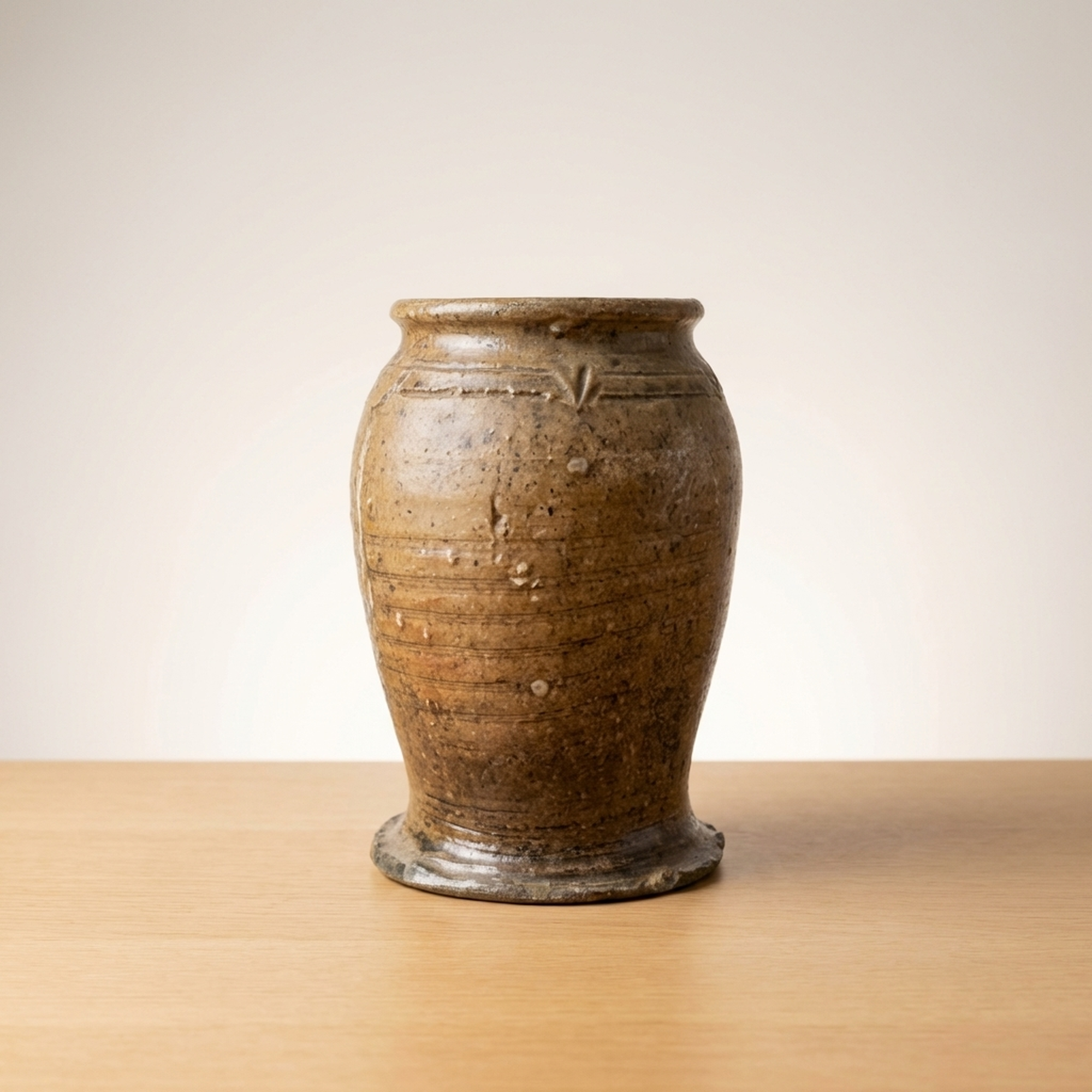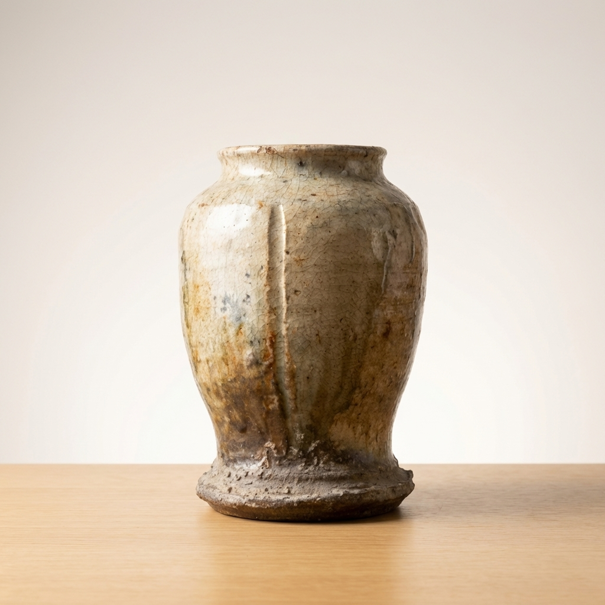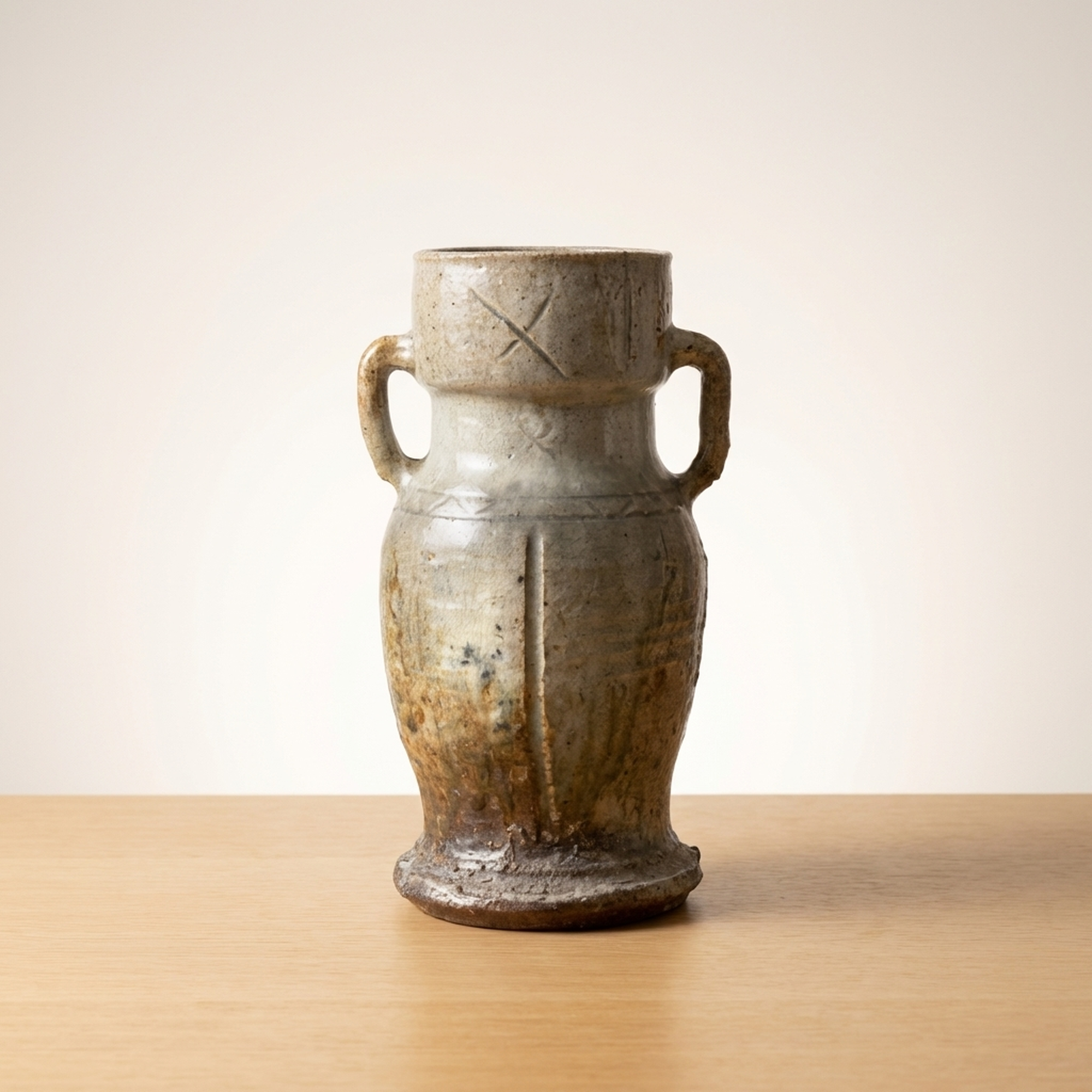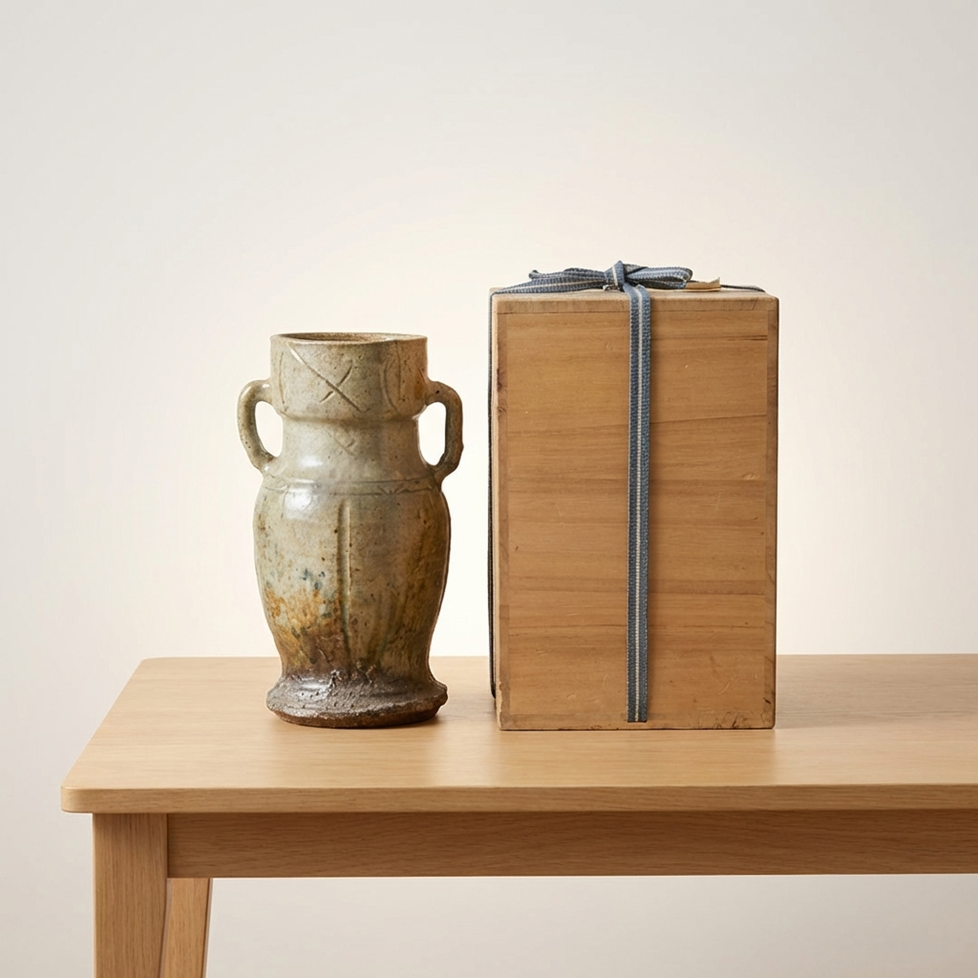 <p>Maker / Brand: Unknown (Iga ware) Title of Work: Old Iga Flower Vase with Box (Iga, for Tea Ceremony, Flower Arrangement, Tea Utensil)</p> <p>This exquisite Ko-Iga hanaike, or flower vase, embodies the rustic elegance and profound aesthetic of traditional Japanese ceramics. It is a example to the enduring craftsmanship of Iga ware, presented with its original protective wooden box. The historical significance of this piece is underscored by the fact that similar examples are featured in respected art publications.</p> <p>Artistic & Cultural Background Iga ware (Iga-yaki), hailing from Mie Prefecture, is one of Japan's most ancient and celebrated ceramic traditions. "Ko-Iga" specifically refers to early Iga pieces, highly esteemed for their unrefined beauty and connection to the wabi-sabi aesthetic. These vessels were, and continue to be, cherished in the worlds of sadou (tea ceremony) and kadou (flower arrangement), where their natural imperfections and earthy character are deeply appreciated.</p> <p>Design & Technique This Ko-Iga vase showcases the distinctive qualities of Iga ceramics. Crafted from local clay rich in feldspar, its surface reveals the dramatic effects of high-temperature firing in anagama kilns. Natural ash glazes (shizen-yu) have settled and melted, creating unique patterns and textures. The robust form is subtly enhanced by incised lines and prominent handles, adding to its sculptural presence. The piece maintains a generally good condition, reflecting its age and journey.</p> <p>Form & Aesthetic Qualities * <strong>Shape:</strong> Standing approximately 30cm tall with a width of 17cm, this vase features a strong, organic silhouette, characterized by its substantial base and gracefully curved body with integrated handles. * <strong>Texture:</strong> The tactile surface is a symphony of natural textures, from the rough, unglazed clay to areas where molten ash has created a subtle, glass-like sheen. * <strong>Visual Appeal:</strong> Its earthy tones, spontaneous glaze effects, and inherent imperfections create a striking visual narrative, inviting quiet contemplation and embodying the spirit of wabi-sabi.</p> <p>Collector & Decorative Appeal * <strong>Historical Significance:</strong> As a Ko-Iga piece, it offers a tangible link to Japan's revered ceramic past, with its lineage acknowledged by its inclusion in art publications. * <strong>Authentic Presentation:</strong> The accompanying wooden box (kiri-bako) not only protects the vase but also signifies its value and traditional appreciation as a treasured art object. * <strong>Versatile Display:</strong> Perfect as a centerpiece for ikebana arrangements, a focal point in a minimalist interior, or a significant addition to a collection of Japanese art and antiques.</p> <p>This Ko-Iga hanaike is an exceptional acquisition for knowledgeable collectors and decorators seeking a piece of Japan's profound artistic heritage and the timeless beauty of natural ceramics.</p> <h3>Details</h3> <table style="border-collapse:collapse;width:100%"><tr><td style="padding:4px 12px 4px 0;font-weight:bold;white-space:nowrap">Condition</td><td style="padding:4px 0">Good</td></tr><tr><td style="padding:4px 12px 4px 0;font-weight:bold;white-space:nowrap">Material</td><td style="padding:4px 0">Ceramic</td></tr><tr><td style="padding:4px 12px 4px 0;font-weight:bold;white-space:nowrap">Era</td><td style="padding:4px 0">Unknown</td></tr></table>