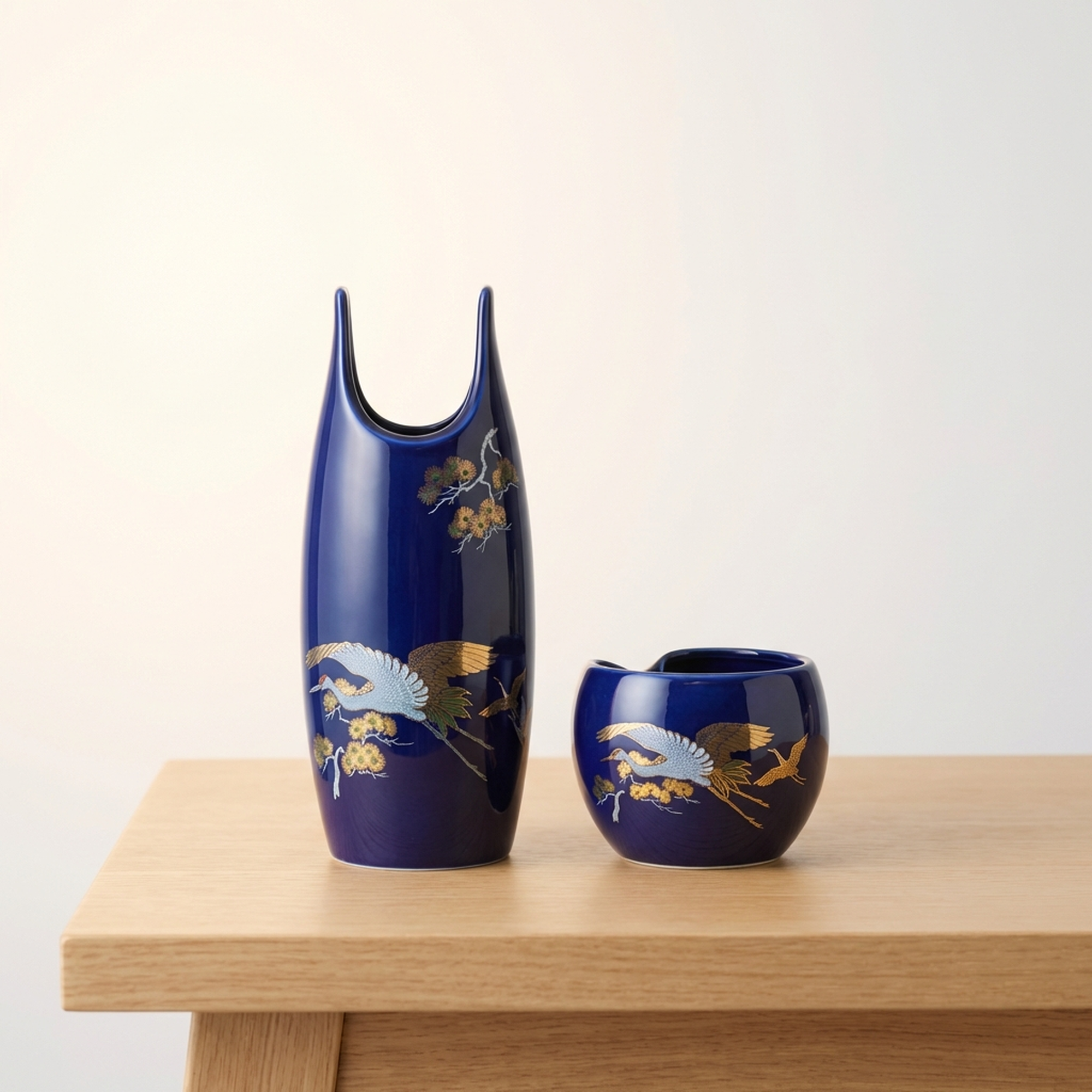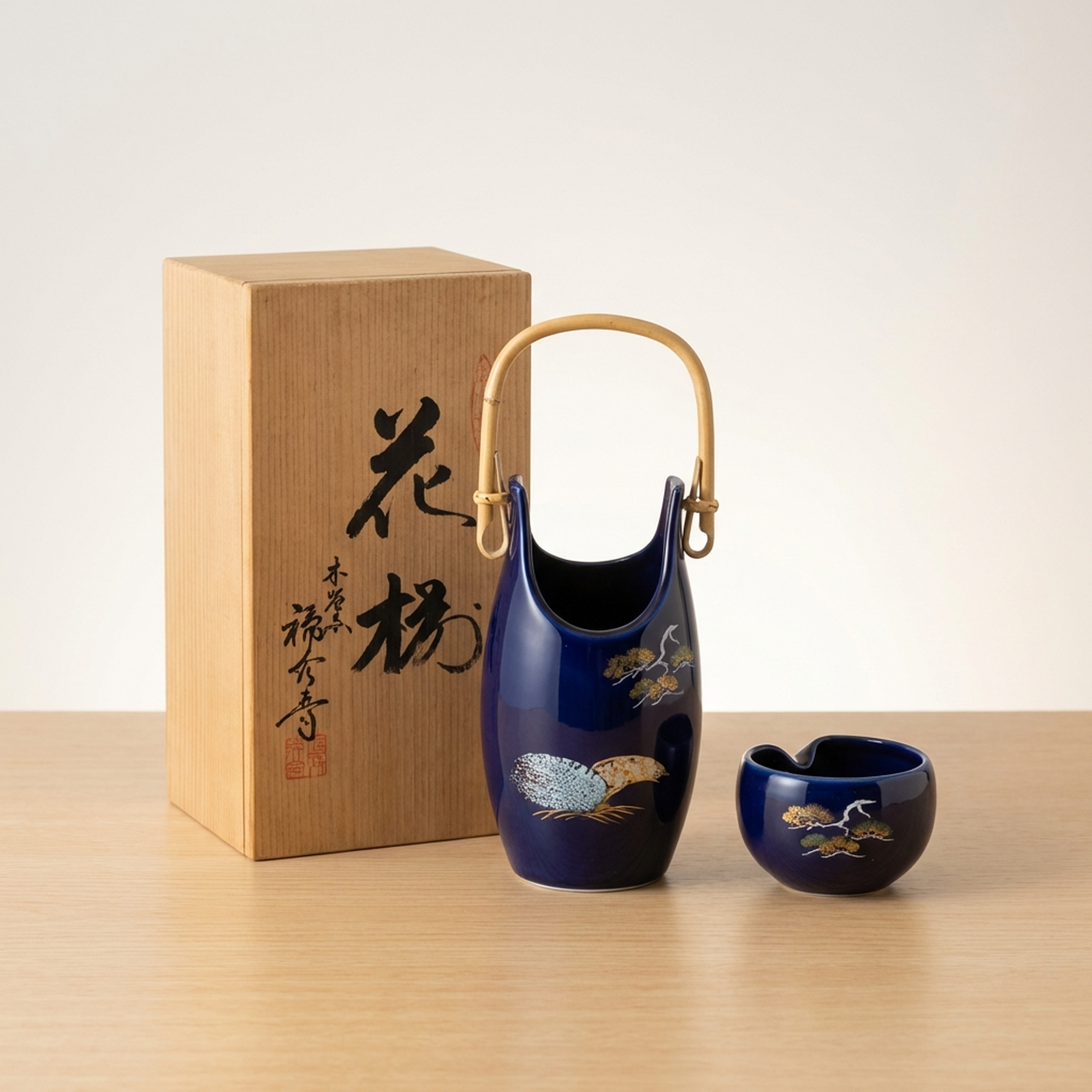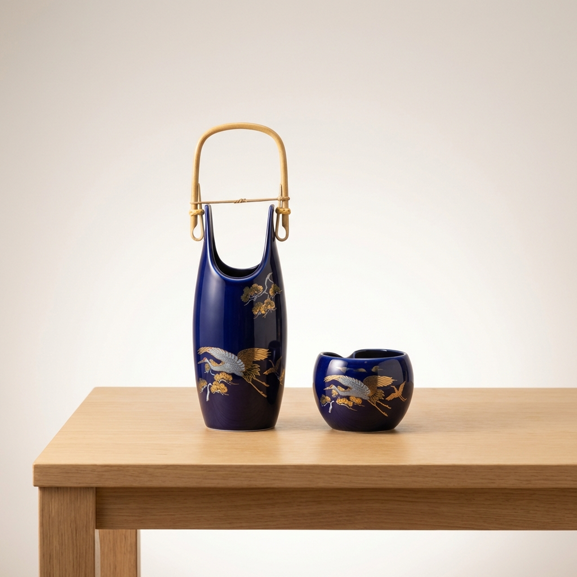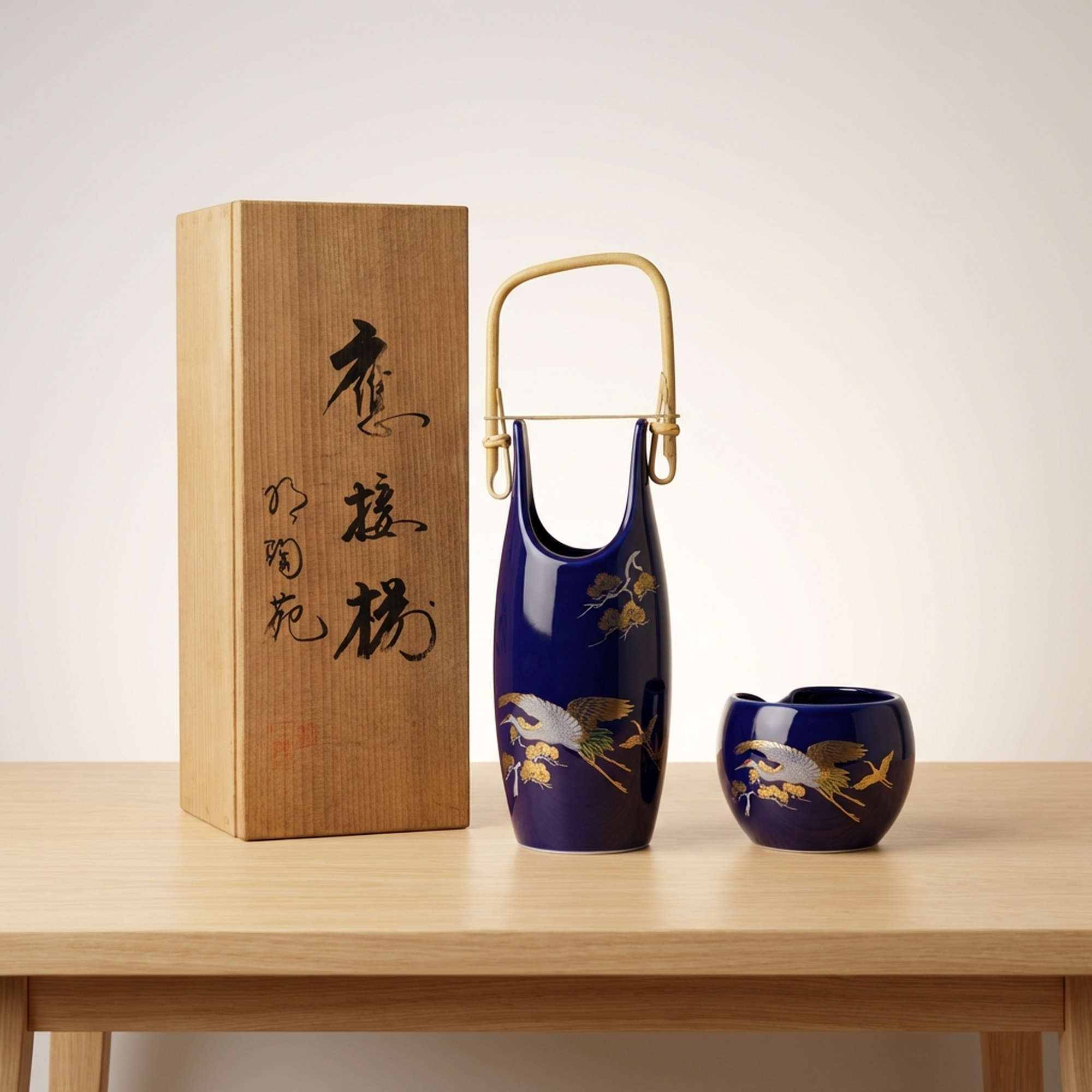 <p>Maker / Brand: Kutani-yaki Meitoen Title of Work: Kutani-yaki Meitoen Vase and Ashtray Set with Gold Polychrome Enamel, Flowers and Birds, Ruri Flowers and Birds Design, with Tomobako</p> <p>This exquisite Kutani-yaki set from Meitoen presents a harmonious pairing of a vase and an ashtray, both adorned with a striking "ruri" blue glaze and detailed gold polychrome enamel. Featuring a classic "flowers and birds" motif, this "ōsetsu-zoroi" (reception set) embodies traditional Japanese artistry and functional elegance, presented in its original "tomobako" (storage box). The pieces are in excellent condition with no noticeable scratches.</p> <p>Artistic & Cultural Background Kutani-yaki, originating from Ishikawa Prefecture, is renowned for its vibrant overglaze enamels and bold decorative styles, with a history spanning centuries. The "kachō-ga" (flowers and birds) motif is a beloved theme in Japanese art, often symbolizing beauty, nature's cycles, and auspicious blessings. The deep "ruri" (lapis lazuli blue) glaze is a signature color in Kutani ware, evoking depth and sophistication.</p> <p>Design & Technique The set showcases the distinctive "kin-saishiki-e" (gold polychrome enamel) technique, where lustrous gold accents highlight the carefully hand-painted details. A rich, deep "ruri" blue glaze forms the striking background, against which elegant cranes soar amidst delicate pine branches. The vase features a unique, elongated form with a charming bamboo handle, while the ashtray offers a complementary rounded shape, both unified by the exquisite artistry and vibrant color palette.</p> <p>Form & Aesthetic Qualities * <strong>Elegant Silhouette:</strong> The vase's graceful, elongated form with its distinctive opening and natural bamboo handle offers a unique visual appeal, complemented by the ashtray's organic, rounded contours. * <strong>Vibrant Ruri Blue:</strong> A striking, deep lapis lazuli blue glaze provides a luxurious backdrop, creating a striking contrast with the shimmering gold and vibrant polychrome enamels. * <strong>Dynamic Kachō-ga:</strong> The lively depiction of cranes, symbols of longevity and good fortune, gracefully flying among pine branches, infuses the pieces with a sense of movement and auspicious symbolism.</p> <p>Collector & Decorative Appeal * <strong>Authentic Kutani Craftsmanship:</strong> This set represents the esteemed tradition of Kutani-yaki from the Meitoen kiln, offering a piece of genuine Japanese ceramic heritage. * <strong>Versatile Display Piece:</strong> Ideal for enhancing a reception area, study, or living space, these pieces serve as both functional items and striking decorative accents. * <strong>Symbolic Beauty:</strong> The "kachō-ga" motif, particularly the cranes and pine, brings a rich layer of cultural meaning and positive symbolism to any environment.</p> <p>This beautiful Kutani-yaki set is perfect for knowledgeable collectors and decorators who appreciate the enduring beauty and cultural depth of Japanese traditional crafts.</p> <h3>Details</h3> <table style="border-collapse:collapse;width:100%"><tr><td style="padding:4px 12px 4px 0;font-weight:bold;white-space:nowrap">Condition</td><td style="padding:4px 0">Good</td></tr><tr><td style="padding:4px 12px 4px 0;font-weight:bold;white-space:nowrap">Origin</td><td style="padding:4px 0">Kutani, Ishikawa</td></tr><tr><td style="padding:4px 12px 4px 0;font-weight:bold;white-space:nowrap">Material</td><td style="padding:4px 0">Porcelain</td></tr><tr><td style="padding:4px 12px 4px 0;font-weight:bold;white-space:nowrap">Era</td><td style="padding:4px 0">Unknown</td></tr></table>