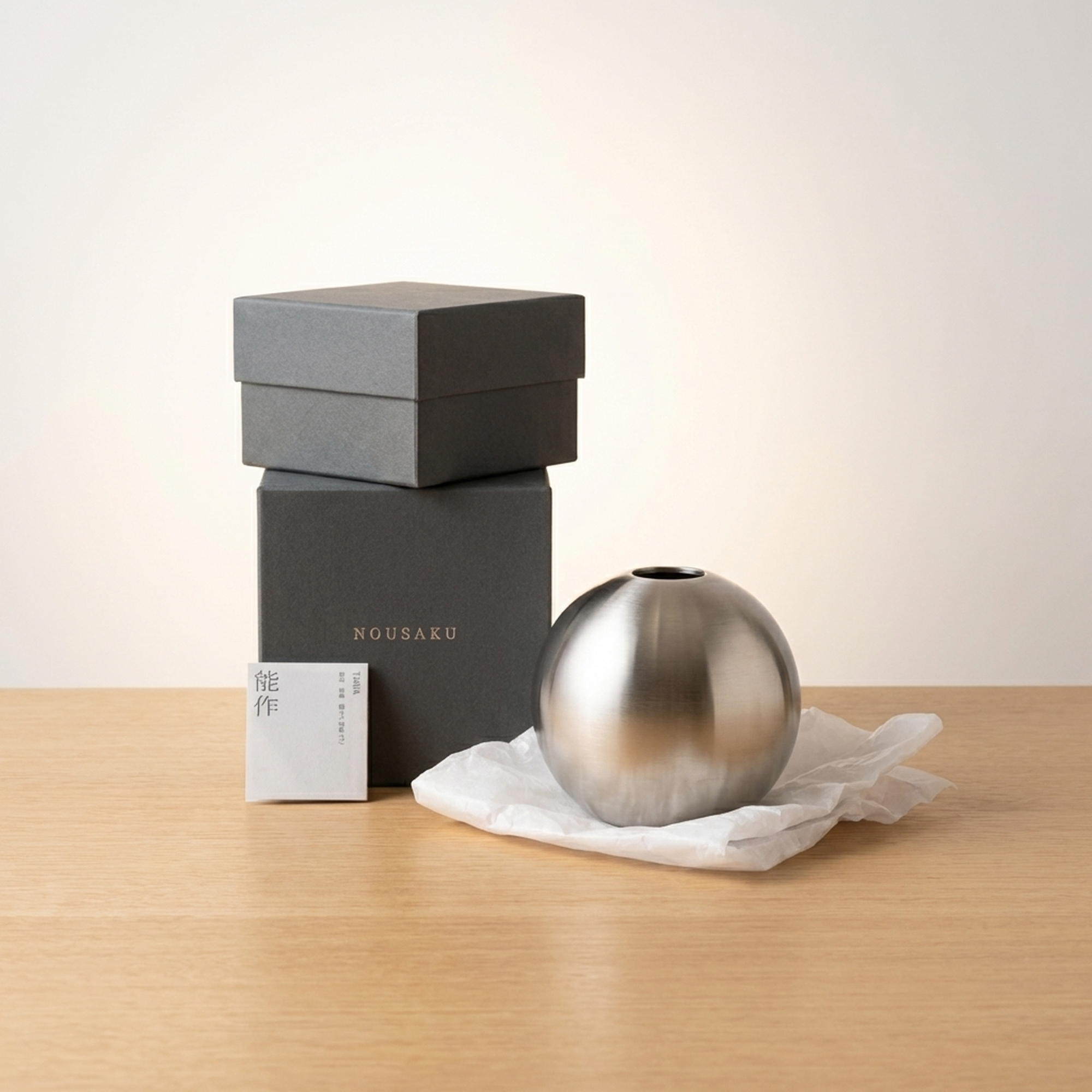 <p>Maker / Brand: Nousaku Title of Work: Nousaku Flower Vase</p> <p>Discover this elegant flower vase by Nousaku, a example to contemporary Japanese metal craftsmanship. Its sleek, spherical form and refined metallic finish offer a minimalist aesthetic, perfect for showcasing a single bloom or a small arrangement. This piece embodies Nousaku's dedication to quality and innovative design, bringing a touch of modern sophistication to any space.</p> <p>Artistic & Cultural Background Nousaku, established in 1916 in Takaoka, Toyama Prefecture, is a distinguished Japanese manufacturer renowned for its exquisite metalware. Takaoka has a rich history of metal casting, dating back over 400 years. Nousaku continues this tradition, blending centuries-old techniques with modern design sensibilities to create functional art pieces that are both beautiful and enduring. Their work often highlights the unique properties of various metals, transforming them into objects of everyday luxury.</p> <p>Design & Technique This vase features a clean, unadorned design that emphasizes its pure form and the inherent beauty of the metal. The surface boasts a subtle brushed finish, lending a soft, matte sheen that interacts beautifully with light. The opening is precisely crafted to cradle a delicate flower, drawing attention to its natural elegance. Please note there is a slight imperfection on the rim, appearing as if the metal finish is subtly absent in a small area, a characteristic from its production.</p> <p>Form & Aesthetic Qualities * <strong>Minimalist Sphere:</strong> A perfectly rounded, globular shape that exudes modern simplicity and understated elegance. * <strong>Brushed Metallic Luster:</strong> The finely brushed surface offers a sophisticated, muted sheen that complements various interior styles. * <strong>Harmonious Proportions:</strong> Measuring approximately 12cm in diameter and 12.5cm in height, its compact size makes it versatile for display.</p> <p>Collector & Decorative Appeal * <strong>Iconic Nousaku Craftsmanship:</strong> A piece from a celebrated Japanese maker, known for its high-quality metalwork and contemporary design. * <strong>Versatile Decor Accent:</strong> Its timeless design allows it to seamlessly integrate into modern, traditional, or eclectic home and office environments. * <strong>Subtle Statement Piece:</strong> Ideal for those who appreciate refined design and the quiet beauty of expertly crafted objects.</p> <p>This Nousaku flower vase is an exceptional acquisition for collectors and decorators seeking a blend of traditional Japanese artistry and contemporary design.</p> <h3>Details</h3> <table style="border-collapse:collapse;width:100%"><tr><td style="padding:4px 12px 4px 0;font-weight:bold;white-space:nowrap">Condition</td><td style="padding:4px 0">Excellent</td></tr><tr><td style="padding:4px 12px 4px 0;font-weight:bold;white-space:nowrap">Material</td><td style="padding:4px 0">Ceramic</td></tr><tr><td style="padding:4px 12px 4px 0;font-weight:bold;white-space:nowrap">Era</td><td style="padding:4px 0">Unknown</td></tr></table>