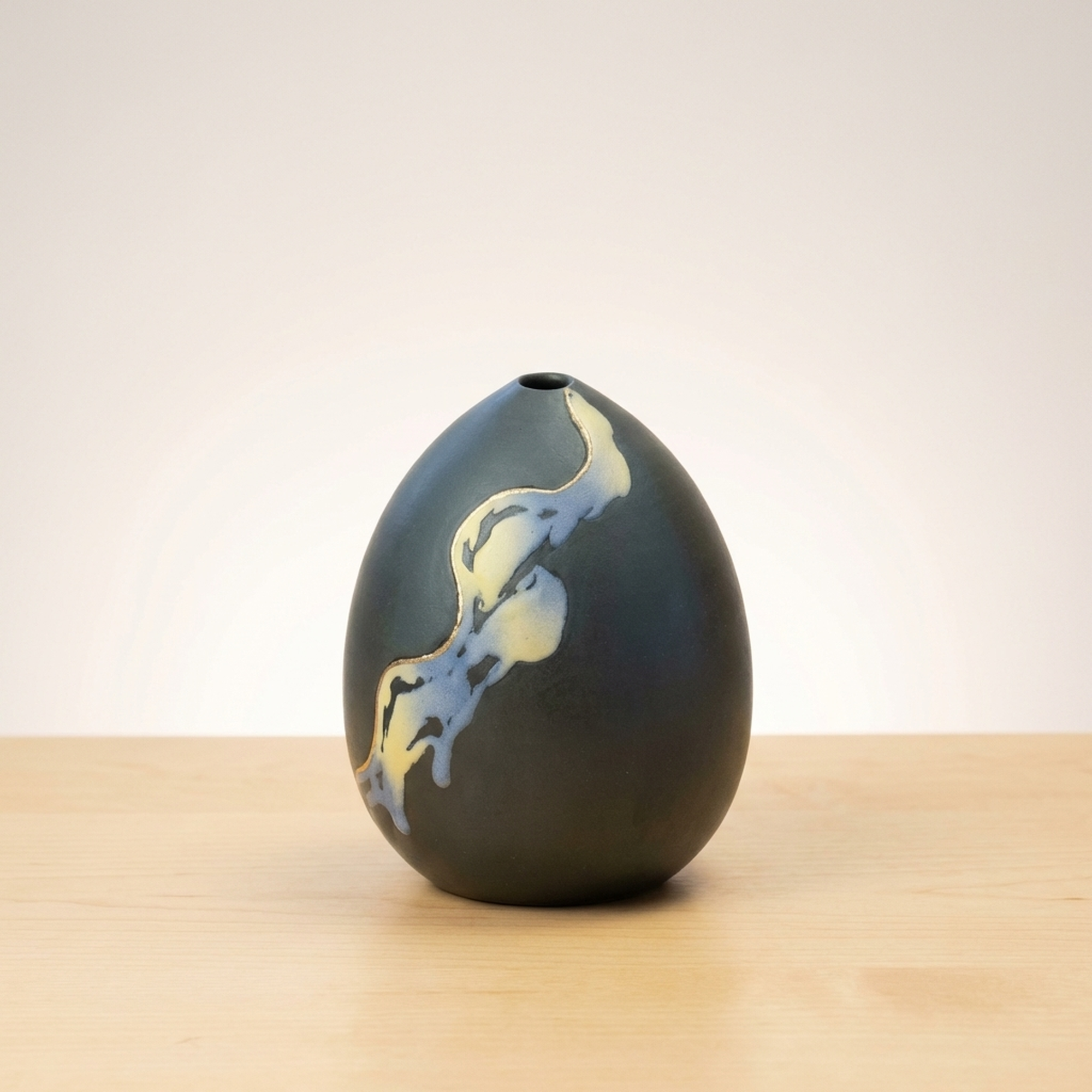 Unused Ōmori Masayuki Ceramic Polychrome Inlay Flower Vase, Original Box & Cloth