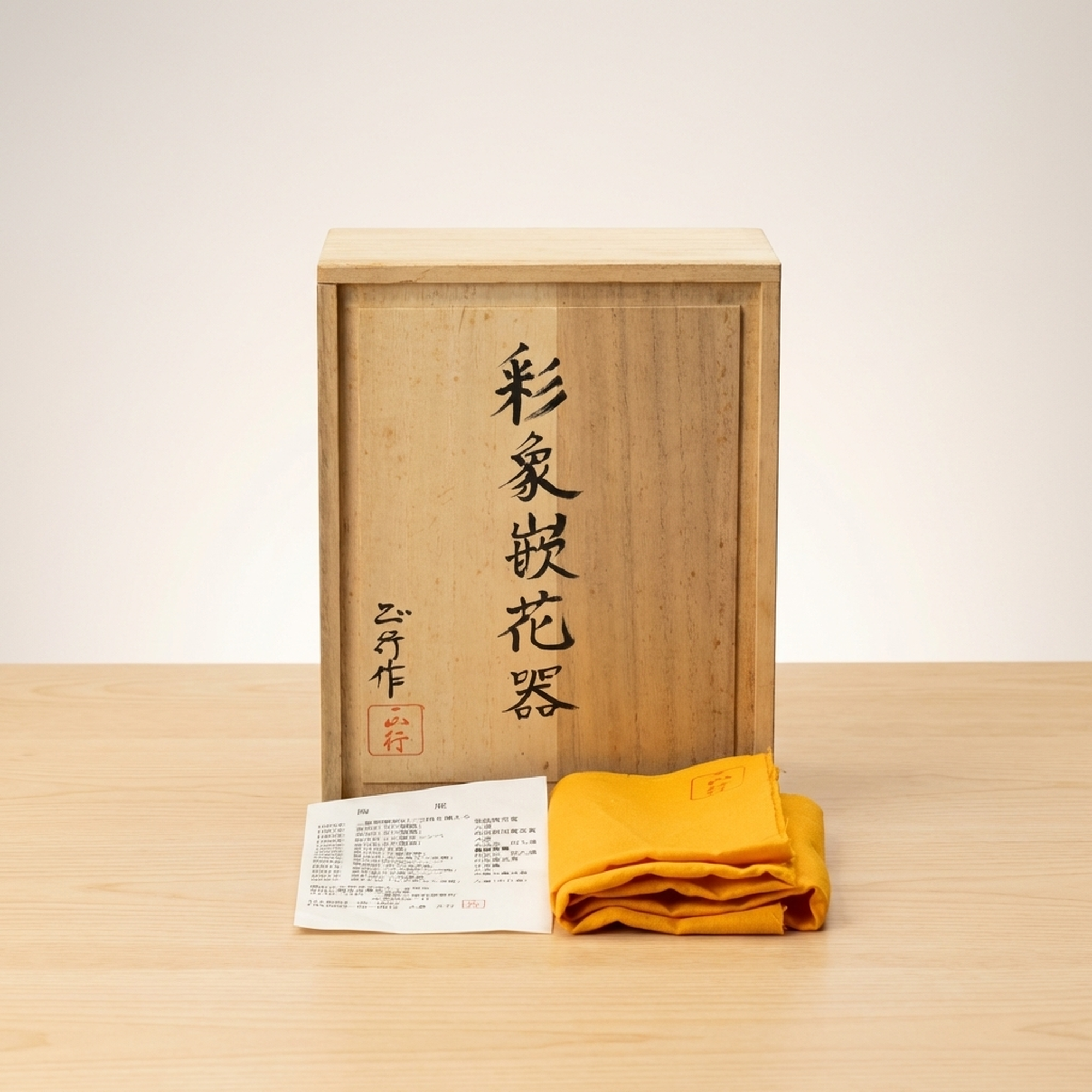 未使用【大森正行】作 彩象嵌花器 共箱共布栞付 R811127