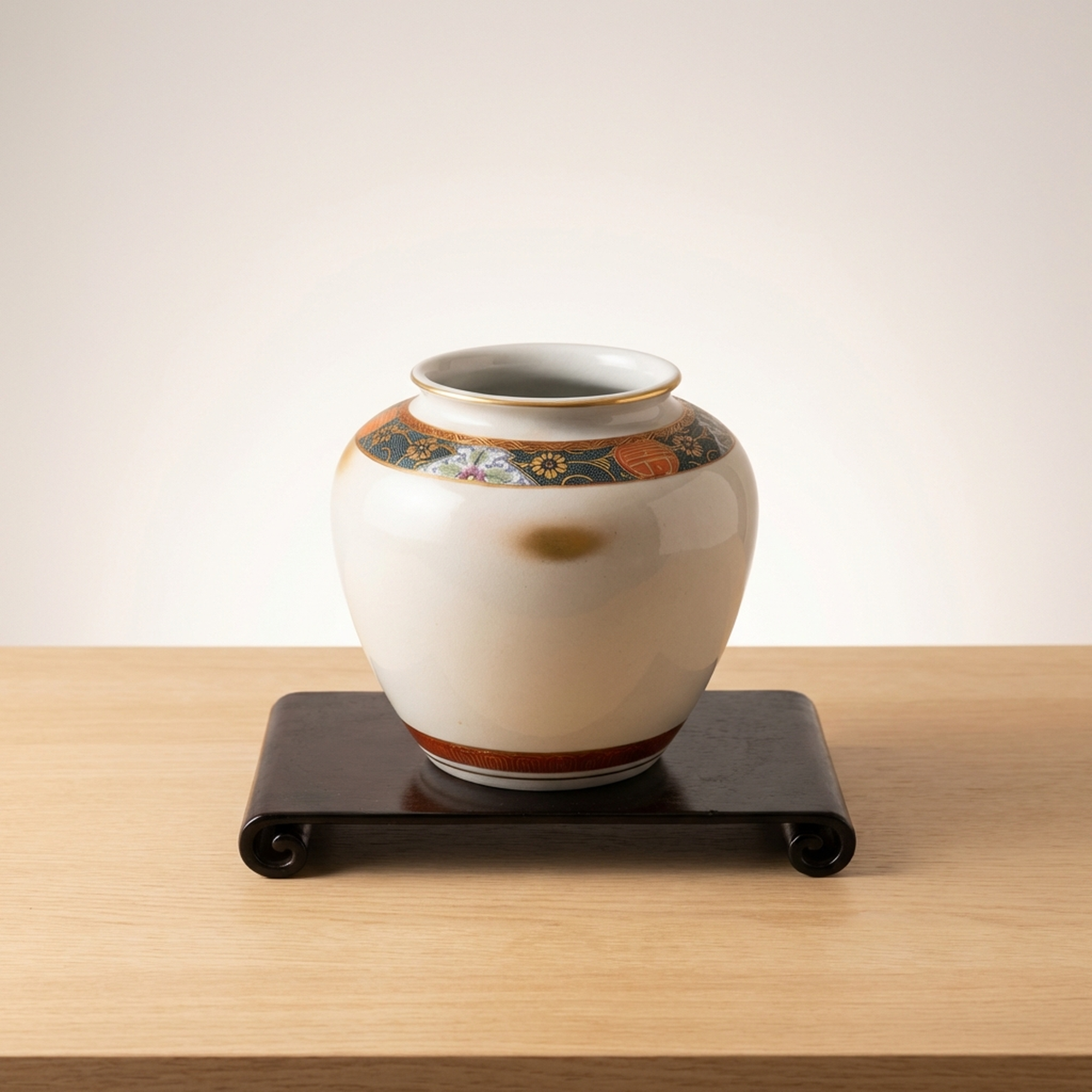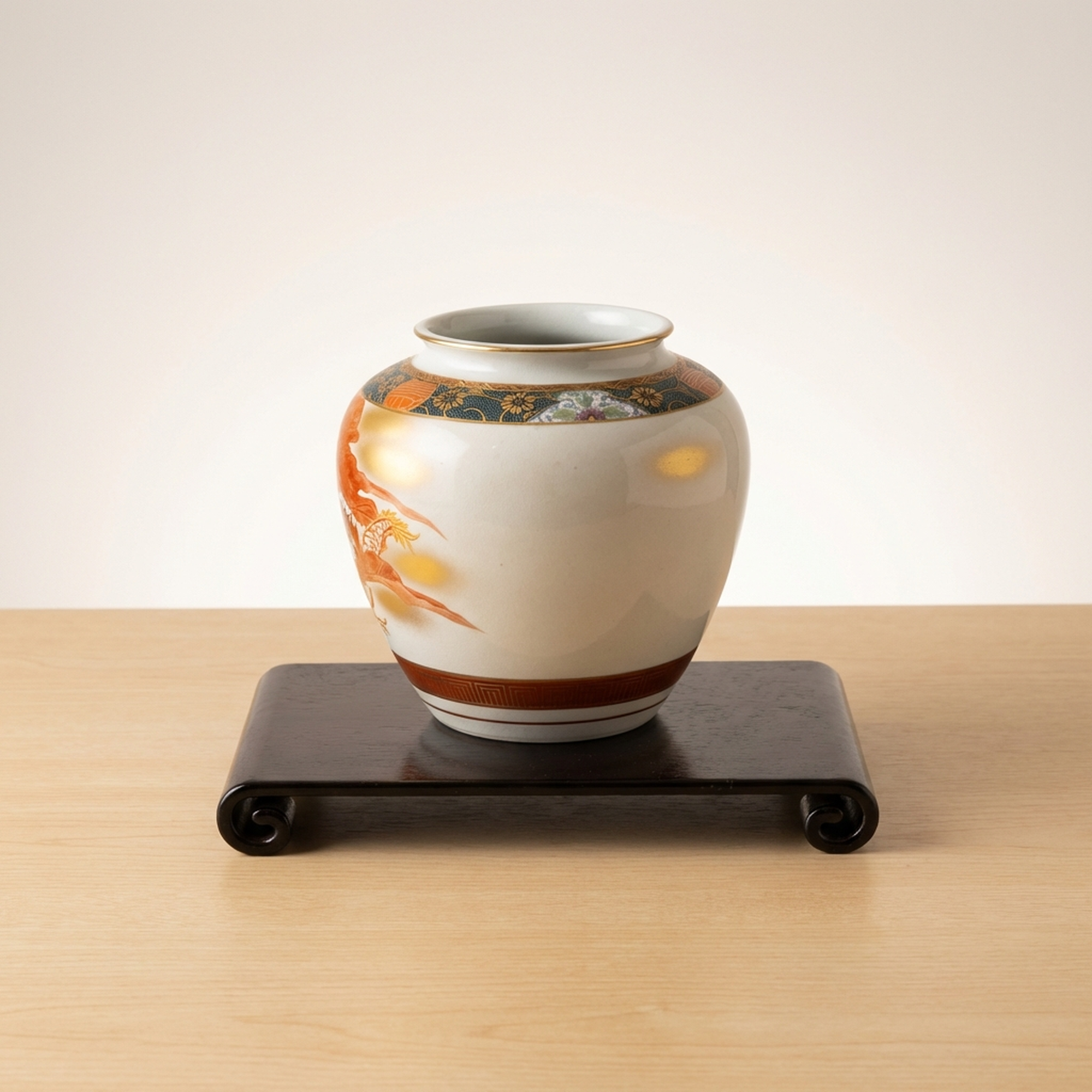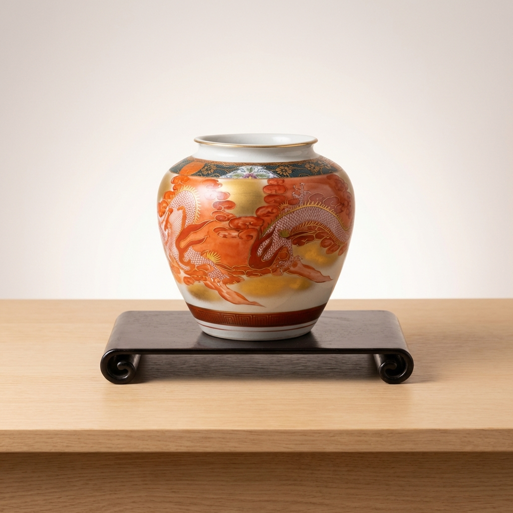 <p>Maker / Brand: Kutani Shuzan Title of Work: Showa Retro Kutani Ware Vase with Dragon Motif by Shuzan</p> <p>This exquisite Kutani ware vase, crafted by master Shuzan, features a magnificent dragon motif. Acquired during Japan's Showa era, this piece embodies rich artistic heritage. Its vibrant colors and detailed details make it a striking example of traditional Japanese craftsmanship, offered with its wooden stand.</p> <p>Artistic & Cultural Background Kutani ware, from Ishikawa Prefecture, is celebrated for its distinctive overglaze enamels and bold designs. Showa era (1926-1989) pieces are cherished for their blend of traditional aesthetics. The dragon, a powerful and auspicious symbol in Japanese culture, represents strength, good fortune, and protection.</p> <p>Design & Technique The vase showcases a lavish design on a vivid vermillion base, richly accented with shimmering gold. The dragon is rendered with remarkable precision, its scales and form brought to life through Shuzan's masterful brushwork. The upper rim is adorned with traditional Japanese patterns and delicate floral motifs, offering striking visual depth. The base bears the clear inscription "Kutani Shuzan," authenticating its esteemed origin.</p> <p>Form & Aesthetic Qualities * <strong>Dynamic Silhouette:</strong> A classic, robust form provides an elegant canvas for vibrant artistry. * <strong>Rich Palate:</strong> Luxurious vermillion and opulent gold create a striking, celebratory visual impact. * <strong>detailed Detail:</strong> careful rendering of the dragon and delicate traditional patterns demonstrates exceptional artistic skill.</p> <p>Collector & Decorative Appeal * <strong>Showa Era Rarity:</strong> As a vintage piece from the Showa period, this Kutani vase by Shuzan is a rare find for collectors of historical Japanese ceramics. * <strong>Auspicious Symbolism:</strong> The beautifully depicted dragon gives the piece with cultural significance, making it an emblem of good fortune and prosperity. * <strong>Versatile Accent:</strong> Its bold design and rich colors make it an ideal statement piece for both traditional Japanese interiors and contemporary settings.</p> <p>This remarkable Kutani Shuzan vase is perfect for knowledgeable collectors and those who appreciate Japanese art. As a vintage item, it exhibits an age-related patina with minor scratches and scuffs, though no noticeable cracks. The accompanying wooden stand also shows some wear.</p> <h3>Details</h3> <table style="border-collapse:collapse;width:100%"><tr><td style="padding:4px 12px 4px 0;font-weight:bold;white-space:nowrap">Condition</td><td style="padding:4px 0">Fair</td></tr><tr><td style="padding:4px 12px 4px 0;font-weight:bold;white-space:nowrap">Origin</td><td style="padding:4px 0">Kutani, Ishikawa</td></tr><tr><td style="padding:4px 12px 4px 0;font-weight:bold;white-space:nowrap">Material</td><td style="padding:4px 0">Porcelain</td></tr><tr><td style="padding:4px 12px 4px 0;font-weight:bold;white-space:nowrap">Era</td><td style="padding:4px 0">Showa</td></tr><tr><td style="padding:4px 12px 4px 0;font-weight:bold;white-space:nowrap">Dimensions</td><td style="padding:4px 0">サイズ (最大値測定)】</td></tr></table>