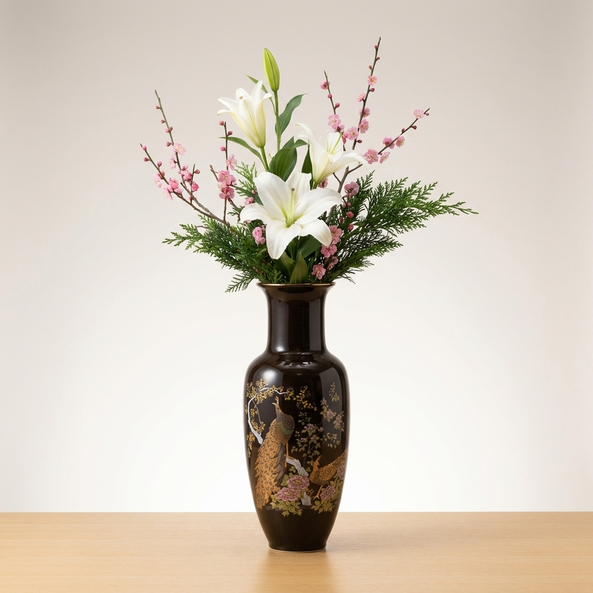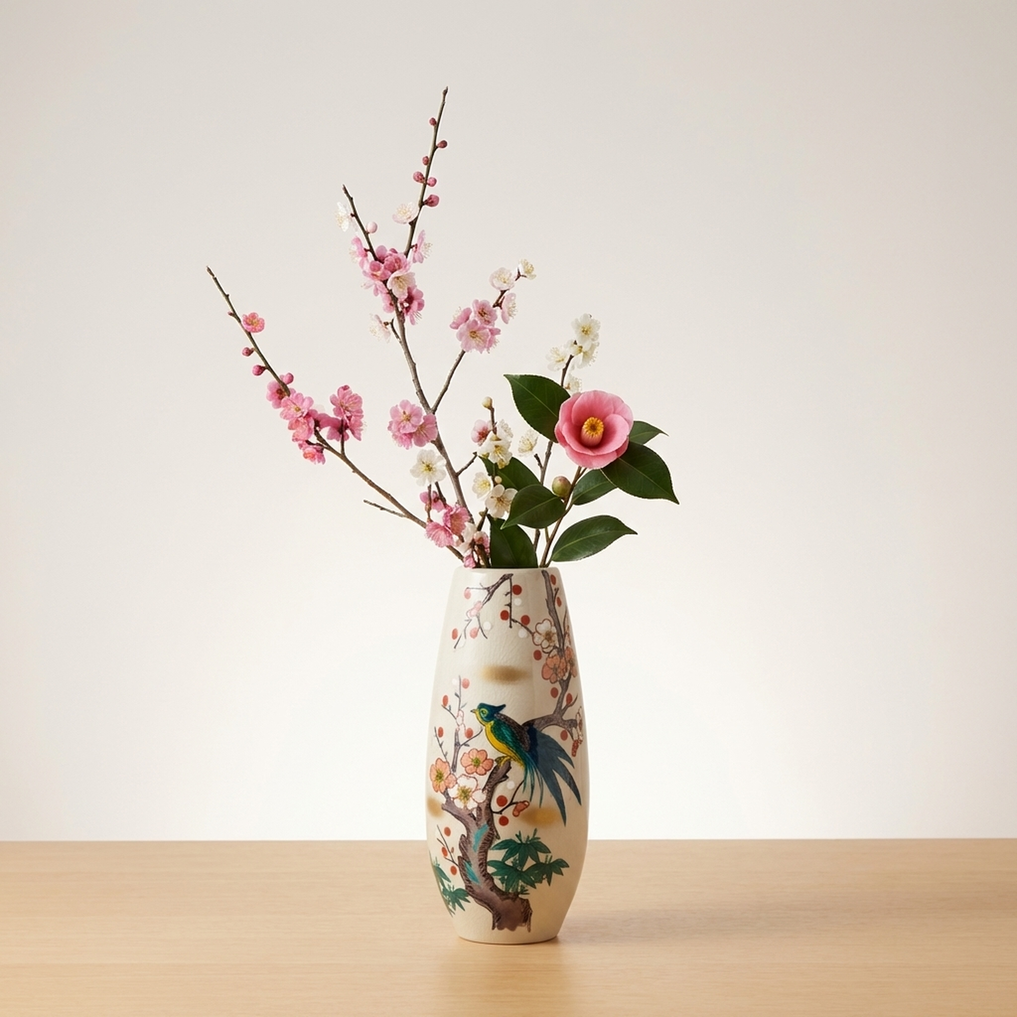 Traditional Kutani-yaki Gyokuryu Ceramic Vase, Plum Blossom & Bird Design, Original Box
