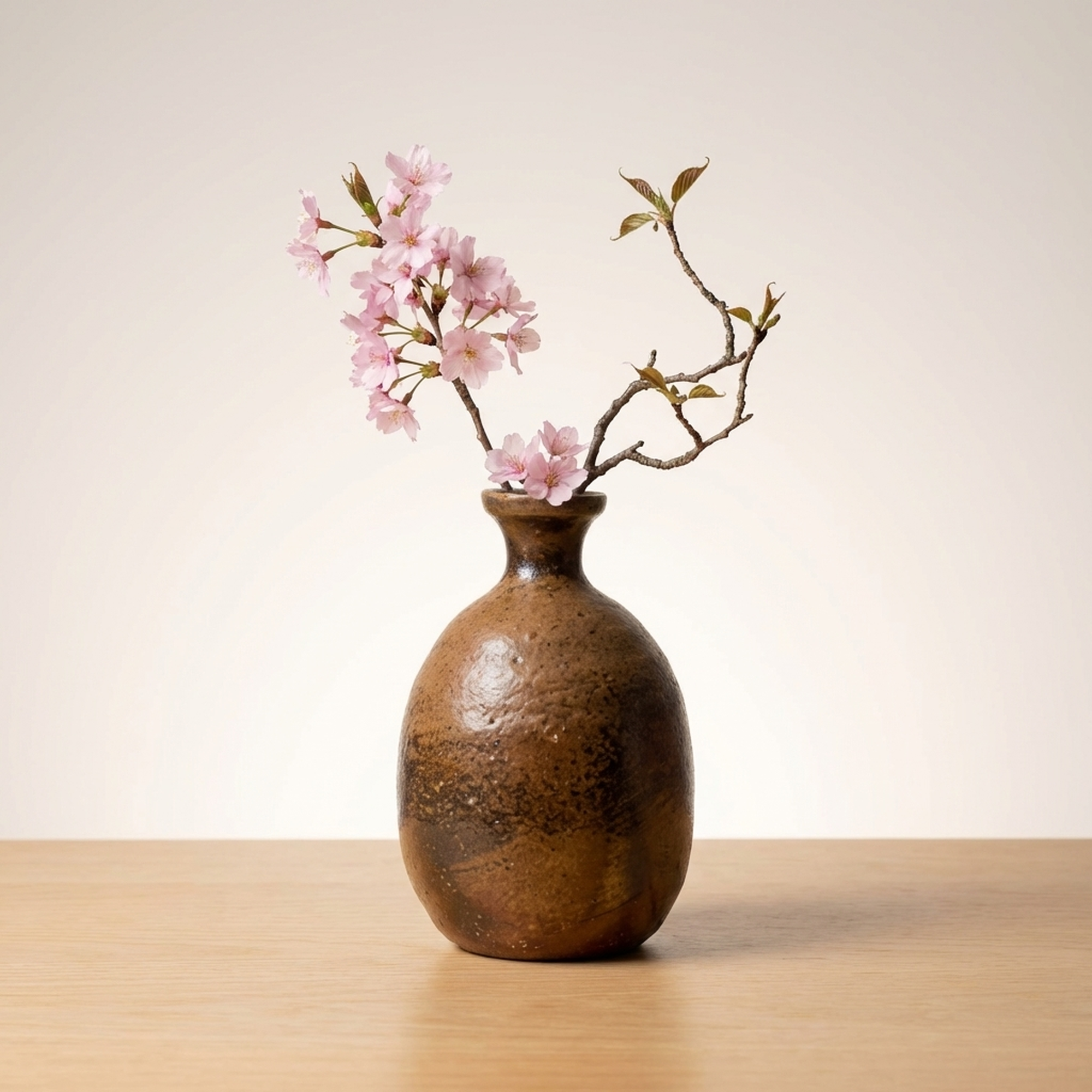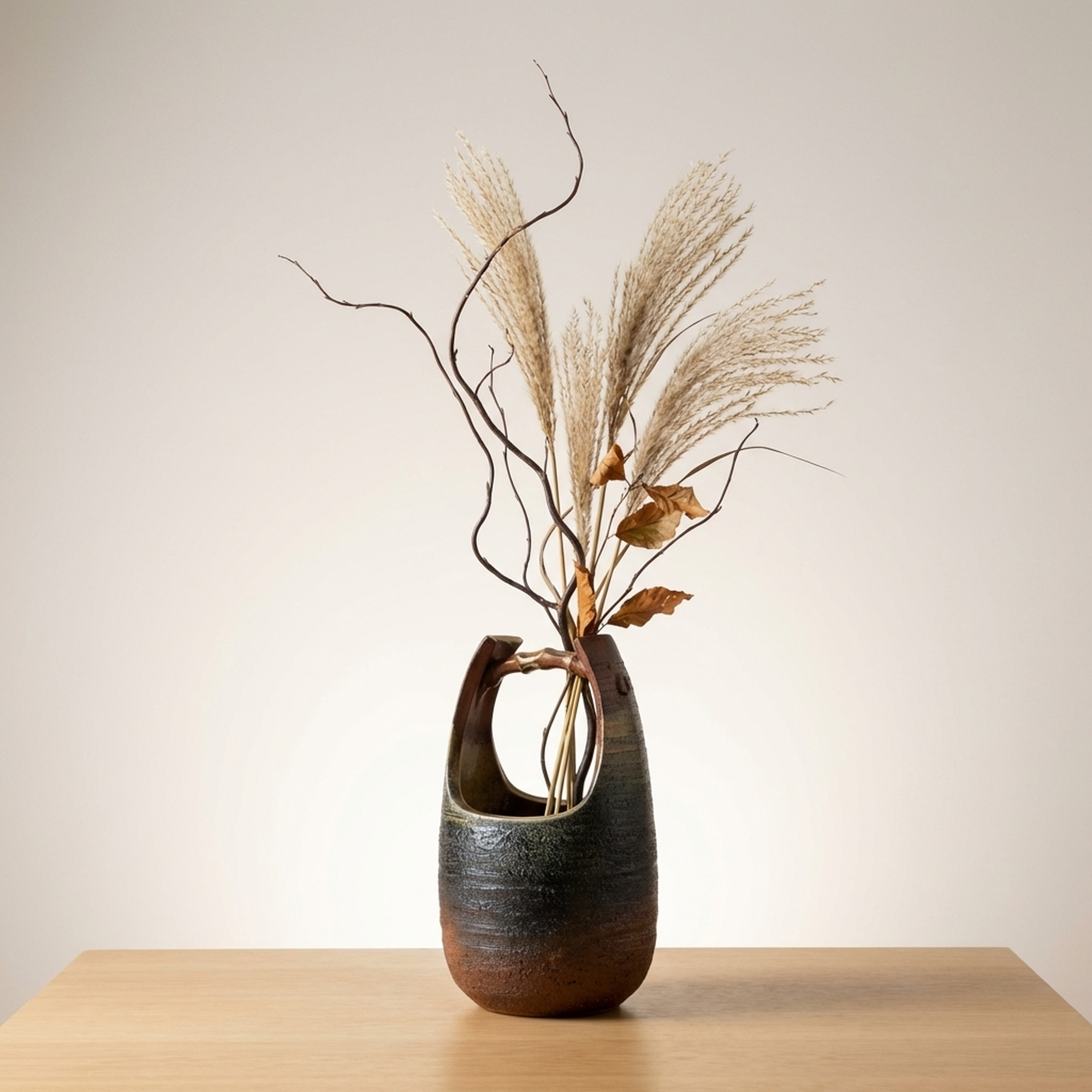 Shigaraki-yaki Japanese Pottery Flower Vase with a Sculpted Handle