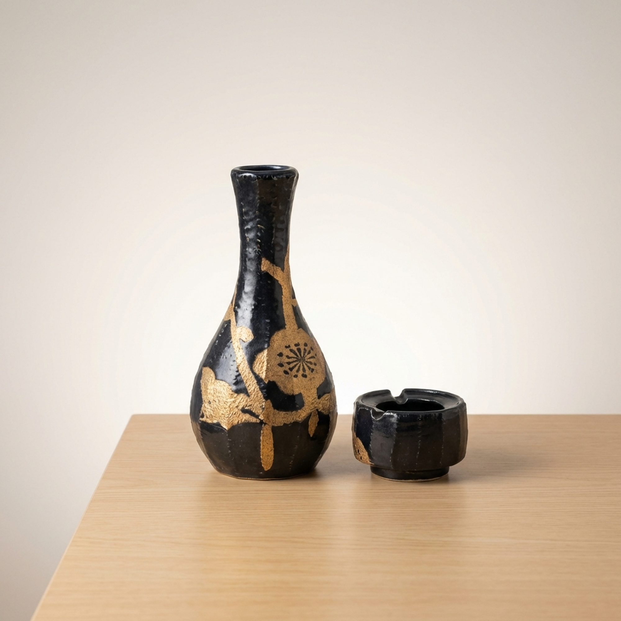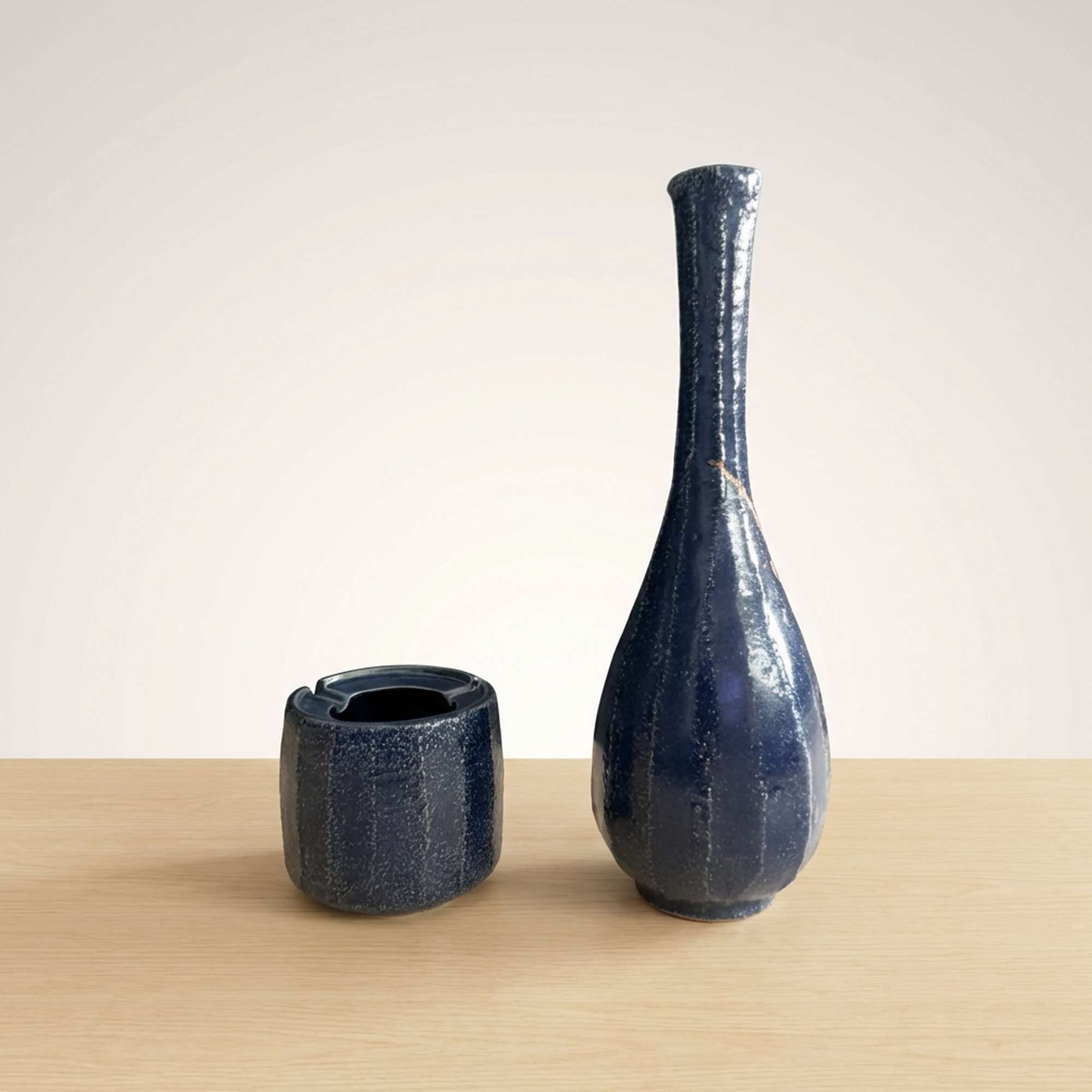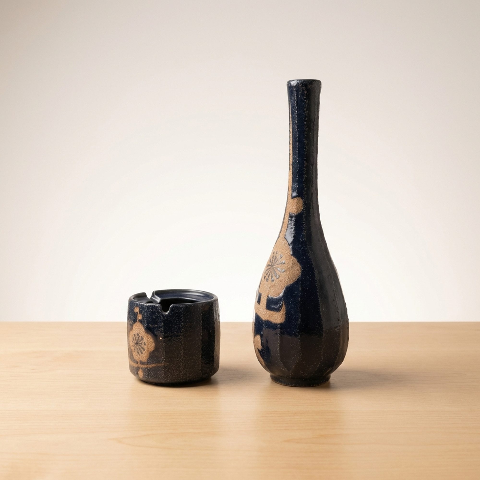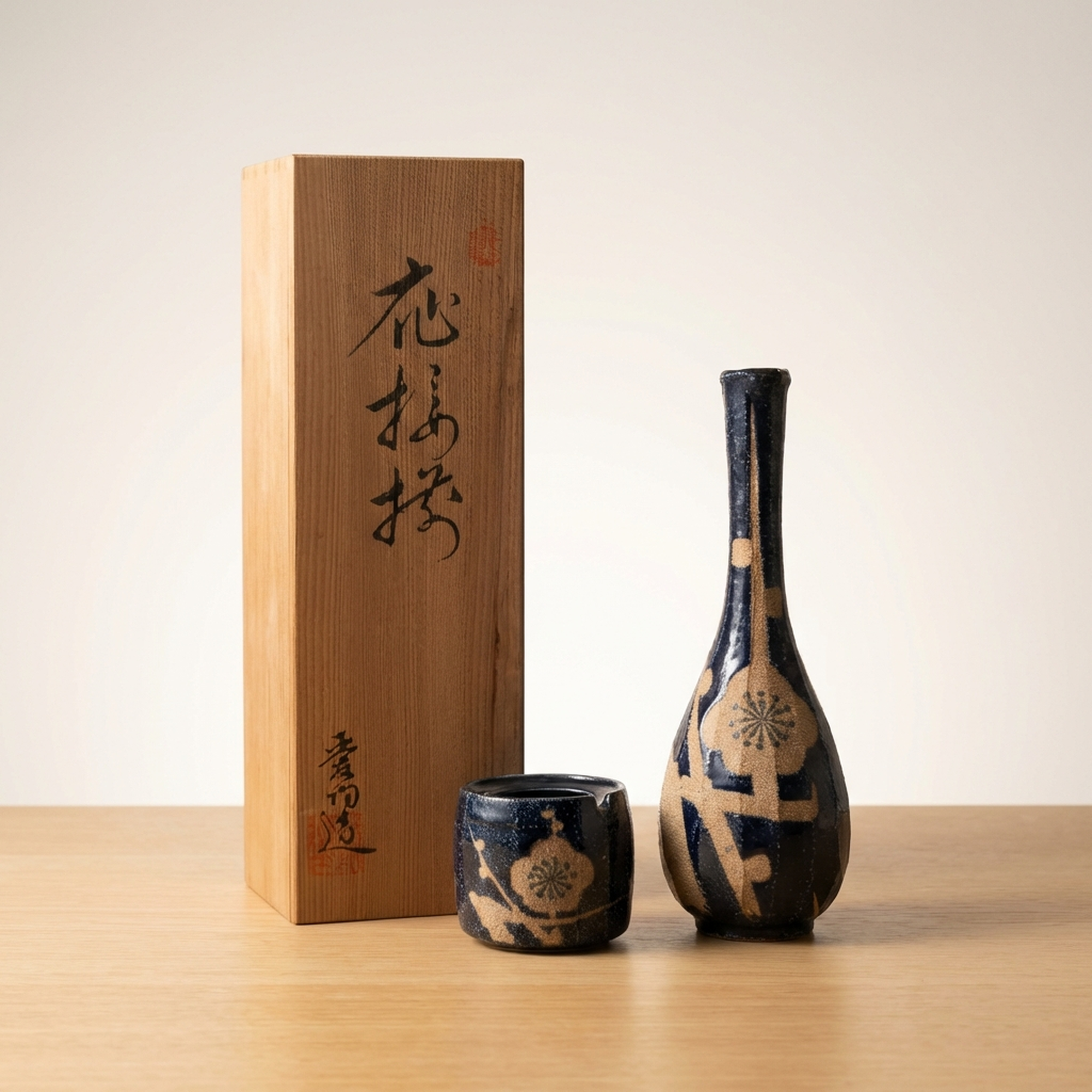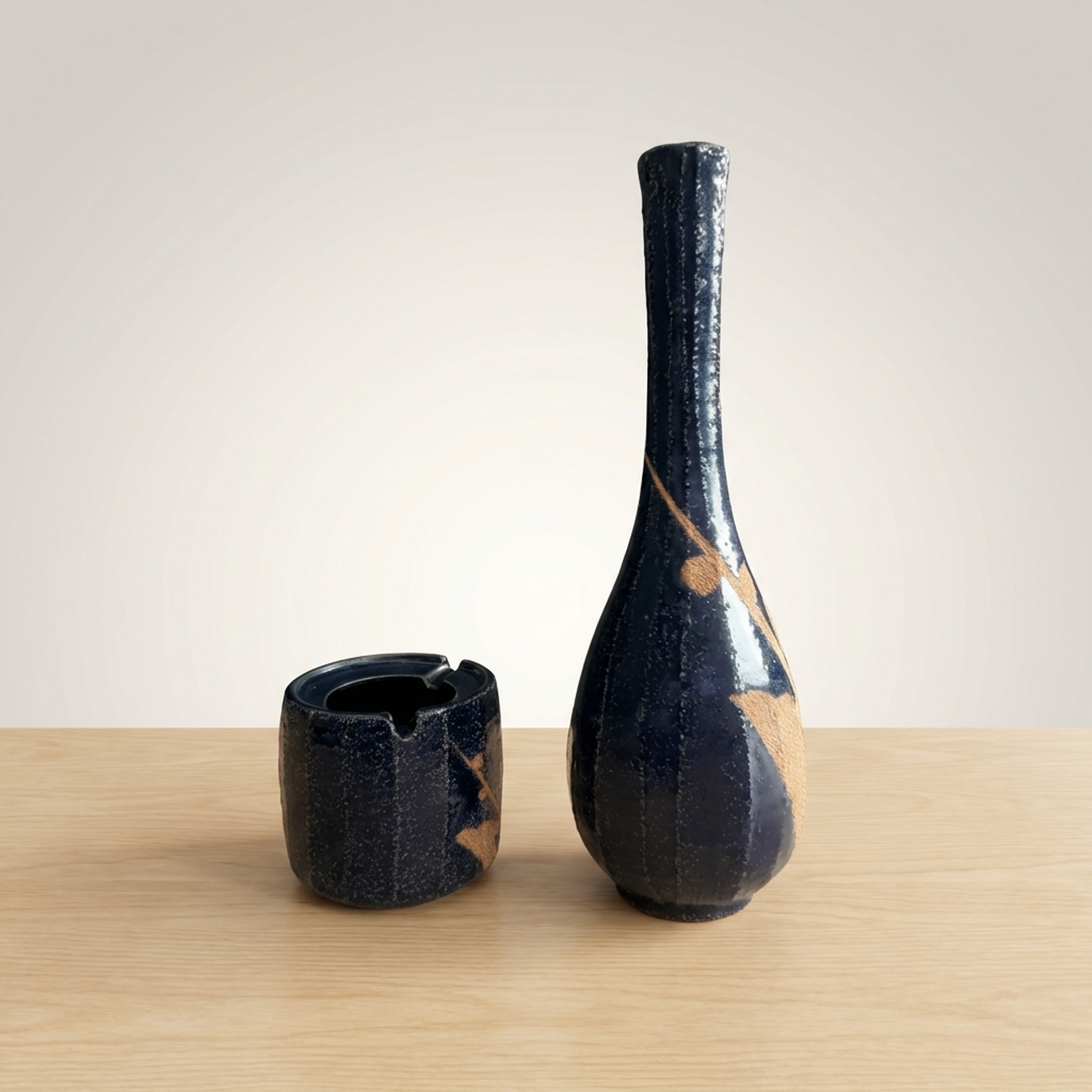<p>Maker / Brand: Hanatsumi-gama Title of Work: Ceramic Ashtray & Tokkuri Set with Wooden Box</p> <p>This exquisite ceramic set, featuring a tokkuri (sake flask) and a matching ashtray, embodies a distinctive Japanese aesthetic. Crafted with traditional techniques, each piece showcases unique surface textures and color variations inherent to handmade pottery. Presented in its original wooden box, this set is a example to authentic Japanese craftsmanship.</p> <p>Artistic & Cultural Background In Japanese culture, the act of sharing sake with guests is a cherished tradition, symbolizing hospitality and connection. This set is designed precisely for such occasions, blending practical utility with decorative elegance. The inclusion of a matching ashtray speaks to a time-honored custom of enjoying sake and conversation, often accompanied by tobacco, in a refined setting.</p> <p>Design & Technique The set is fashioned from robust pottery, characterized by its tactile surface and rich, deep blue-black glaze. This dark base is beautifully contrasted by lighter, unglazed or sand-colored areas that form stylized, organic patterns, possibly created using a resist technique. These natural color variations and the subtle irregularities in texture are hallmarks of hand-fired ceramics, giving each piece a unique, artisanal character.</p> <p>Form & Aesthetic Qualities * <strong>Elegant Form:</strong> The tokkuri features a gracefully tapered neck and a gently swelling body, designed for comfortable handling and pouring. The ashtray is compact and functional, with an integrated cigarette rest. * <strong>Rustic Texture:</strong> The pottery boasts a pleasingly tactile surface, where the smooth glaze meets the slightly rougher, unglazed areas, inviting touch and appreciation of its handmade origin. * <strong>Harmonious Palette:</strong> The striking contrast between the deep, dark glaze and the earthy, natural tones of the exposed clay creates a sophisticated yet grounded visual appeal, evoking a sense of wabi-sabi.</p> <p>Collector & Decorative Appeal * <strong>Authentic Craftsmanship:</strong> This set offers a genuine piece of Japanese ceramic art, reflecting traditional methods and an appreciation for natural materials and forms. * <strong>Versatile Elegance:</strong> Perfect for serving sake during special gatherings, enhancing an interior space with its decorative presence, or adding a unique item to a collection of Japanese pottery. * <strong>Pristine Condition:</strong> Having been stored in its original wooden box since purchase and remaining unused, this set is in exceptionally fine condition, free from chips, cracks, or repairs.</p> <p>This set is an ideal acquisition for those who appreciate the understated beauty and functional artistry of traditional Japanese ceramics.</p> <h3>Details</h3> <table style="border-collapse:collapse;width:100%"><tr><td style="padding:4px 12px 4px 0;font-weight:bold;white-space:nowrap">Condition</td><td style="padding:4px 0">Excellent</td></tr><tr><td style="padding:4px 12px 4px 0;font-weight:bold;white-space:nowrap">Material</td><td style="padding:4px 0">Ceramic</td></tr><tr><td style="padding:4px 12px 4px 0;font-weight:bold;white-space:nowrap">Era</td><td style="padding:4px 0">Unknown</td></tr></table>