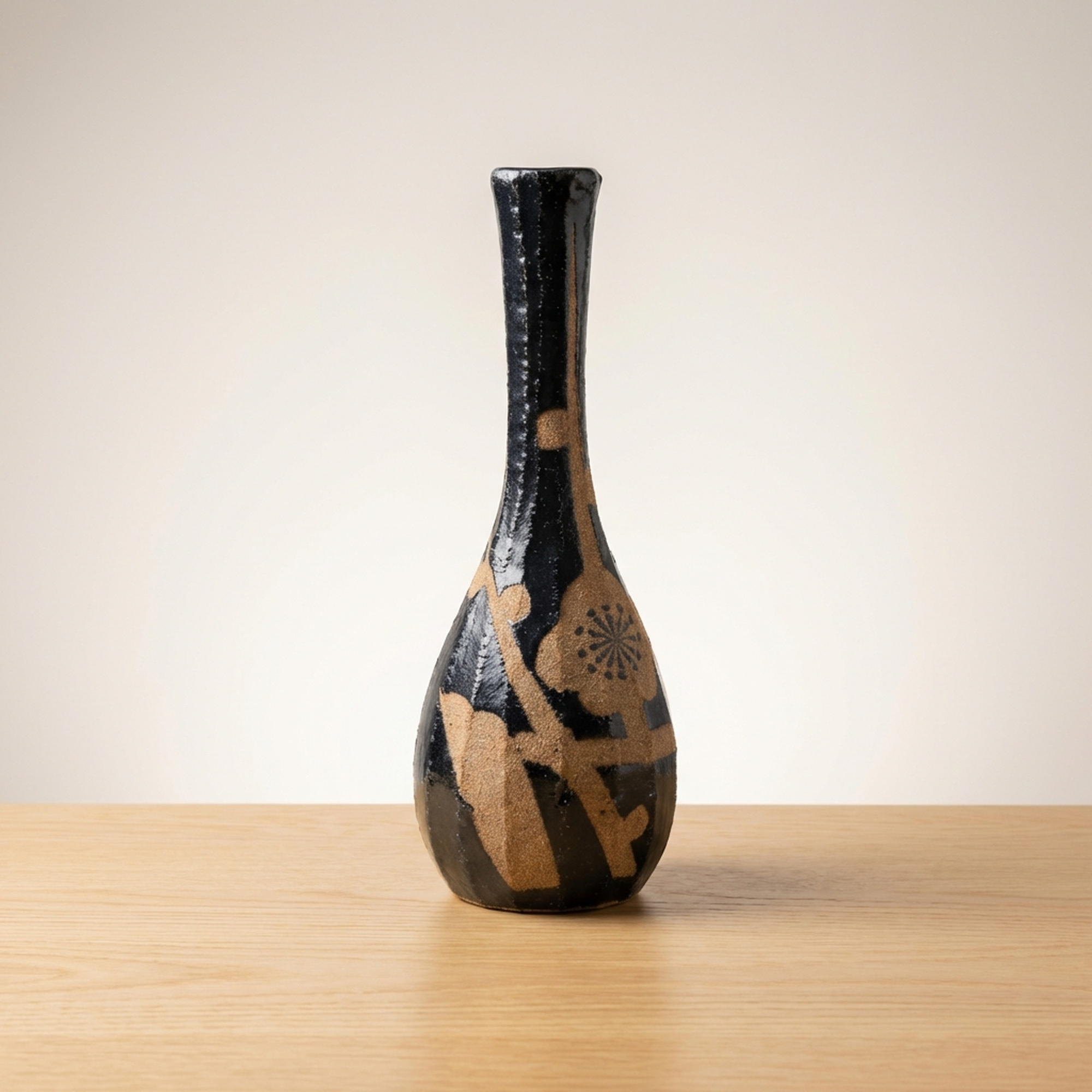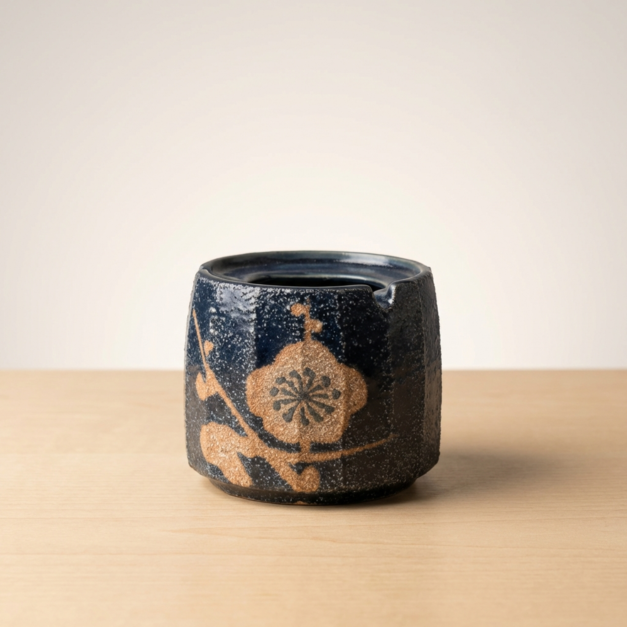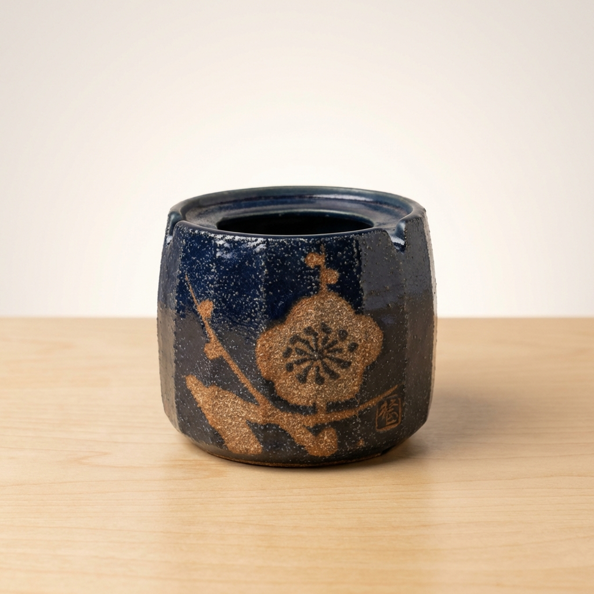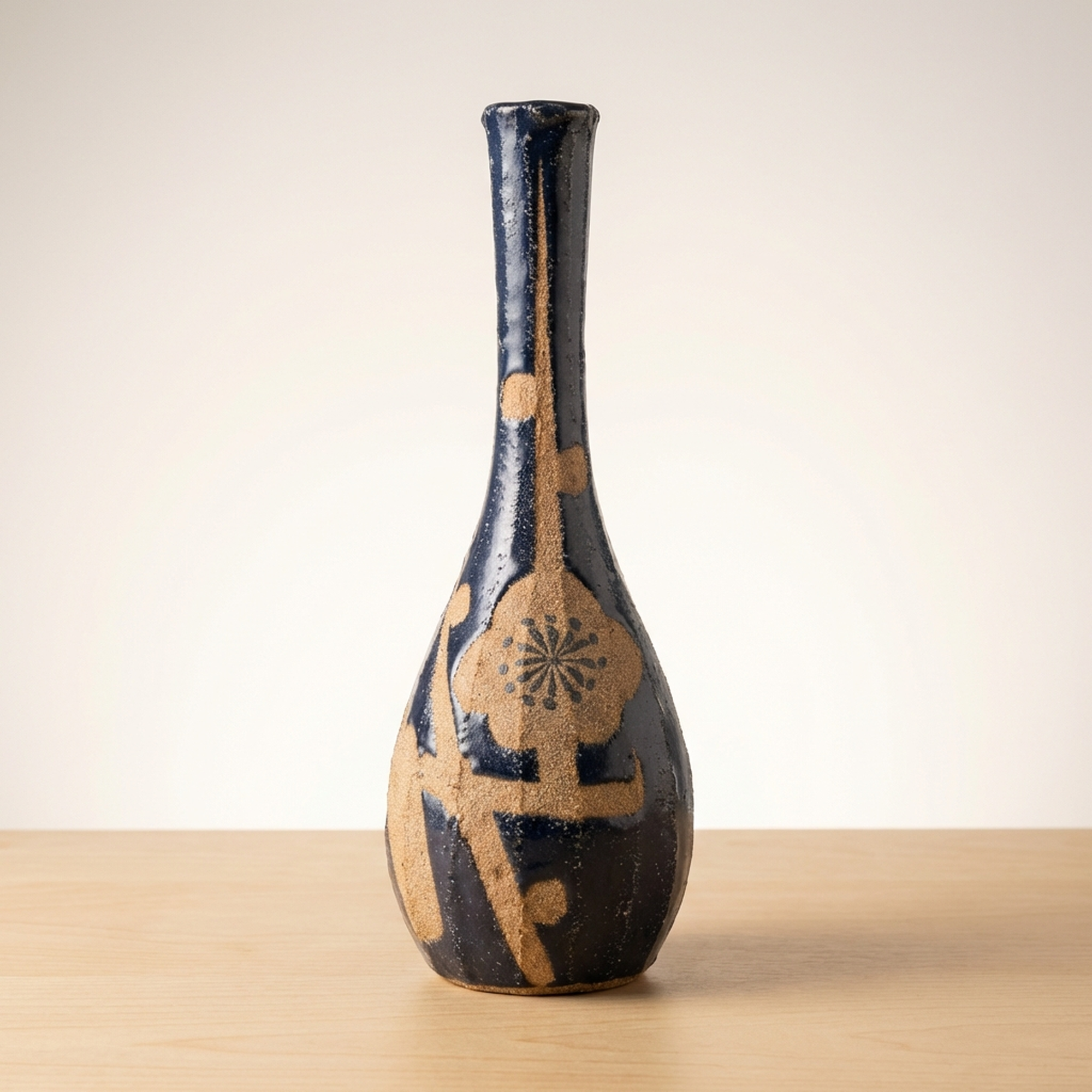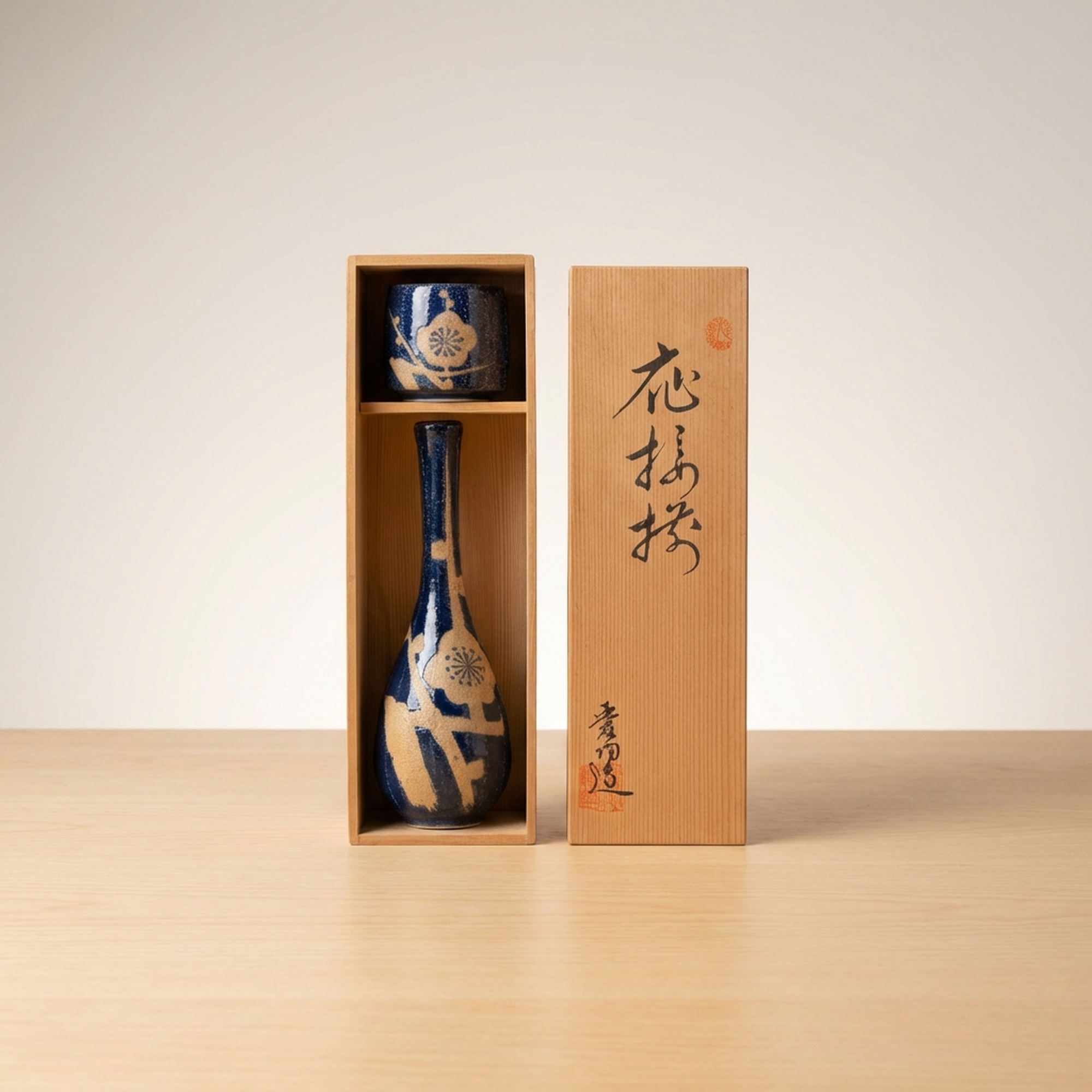 <p>Maker / Brand: Hanatsumi-gama Title of Work: Ceramic Ashtray & Tokkuri Set with Wooden Box</p> <p>This exquisite ceramic set, featuring a tokkuri (sake flask) and a matching ashtray, embodies a distinctive Japanese aesthetic. Crafted with traditional techniques, each piece showcases unique surface textures and color variations inherent to handmade pottery. Presented in its original wooden box, this set is a example to authentic Japanese craftsmanship.</p> <p>Artistic & Cultural Background In Japanese culture, the act of sharing sake with guests is a cherished tradition, symbolizing hospitality and connection. This set is designed precisely for such occasions, blending practical utility with decorative elegance. The inclusion of a matching ashtray speaks to a time-honored custom of enjoying sake and conversation, often accompanied by tobacco, in a refined setting.</p> <p>Design & Technique The set is fashioned from robust pottery, characterized by its tactile surface and rich, deep blue-black glaze. This dark base is beautifully contrasted by lighter, unglazed or sand-colored areas that form stylized, organic patterns, possibly created using a resist technique. These natural color variations and the subtle irregularities in texture are hallmarks of hand-fired ceramics, giving each piece a unique, artisanal character.</p> <p>Form & Aesthetic Qualities * <strong>Elegant Form:</strong> The tokkuri features a gracefully tapered neck and a gently swelling body, designed for comfortable handling and pouring. The ashtray is compact and functional, with an integrated cigarette rest. * <strong>Rustic Texture:</strong> The pottery boasts a pleasingly tactile surface, where the smooth glaze meets the slightly rougher, unglazed areas, inviting touch and appreciation of its handmade origin. * <strong>Harmonious Palette:</strong> The striking contrast between the deep, dark glaze and the earthy, natural tones of the exposed clay creates a sophisticated yet grounded visual appeal, evoking a sense of wabi-sabi.</p> <p>Collector & Decorative Appeal * <strong>Authentic Craftsmanship:</strong> This set offers a genuine piece of Japanese ceramic art, reflecting traditional methods and an appreciation for natural materials and forms. * <strong>Versatile Elegance:</strong> Perfect for serving sake during special gatherings, enhancing an interior space with its decorative presence, or adding a unique item to a collection of Japanese pottery. * <strong>Pristine Condition:</strong> Having been stored in its original wooden box since purchase and remaining unused, this set is in exceptionally fine condition, free from chips, cracks, or repairs.</p> <p>This set is an ideal acquisition for those who appreciate the understated beauty and functional artistry of traditional Japanese ceramics.</p> <h3>Details</h3> <table style="border-collapse:collapse;width:100%"><tr><td style="padding:4px 12px 4px 0;font-weight:bold;white-space:nowrap">Condition</td><td style="padding:4px 0">Excellent</td></tr><tr><td style="padding:4px 12px 4px 0;font-weight:bold;white-space:nowrap">Material</td><td style="padding:4px 0">Ceramic</td></tr><tr><td style="padding:4px 12px 4px 0;font-weight:bold;white-space:nowrap">Era</td><td style="padding:4px 0">Unknown</td></tr></table>