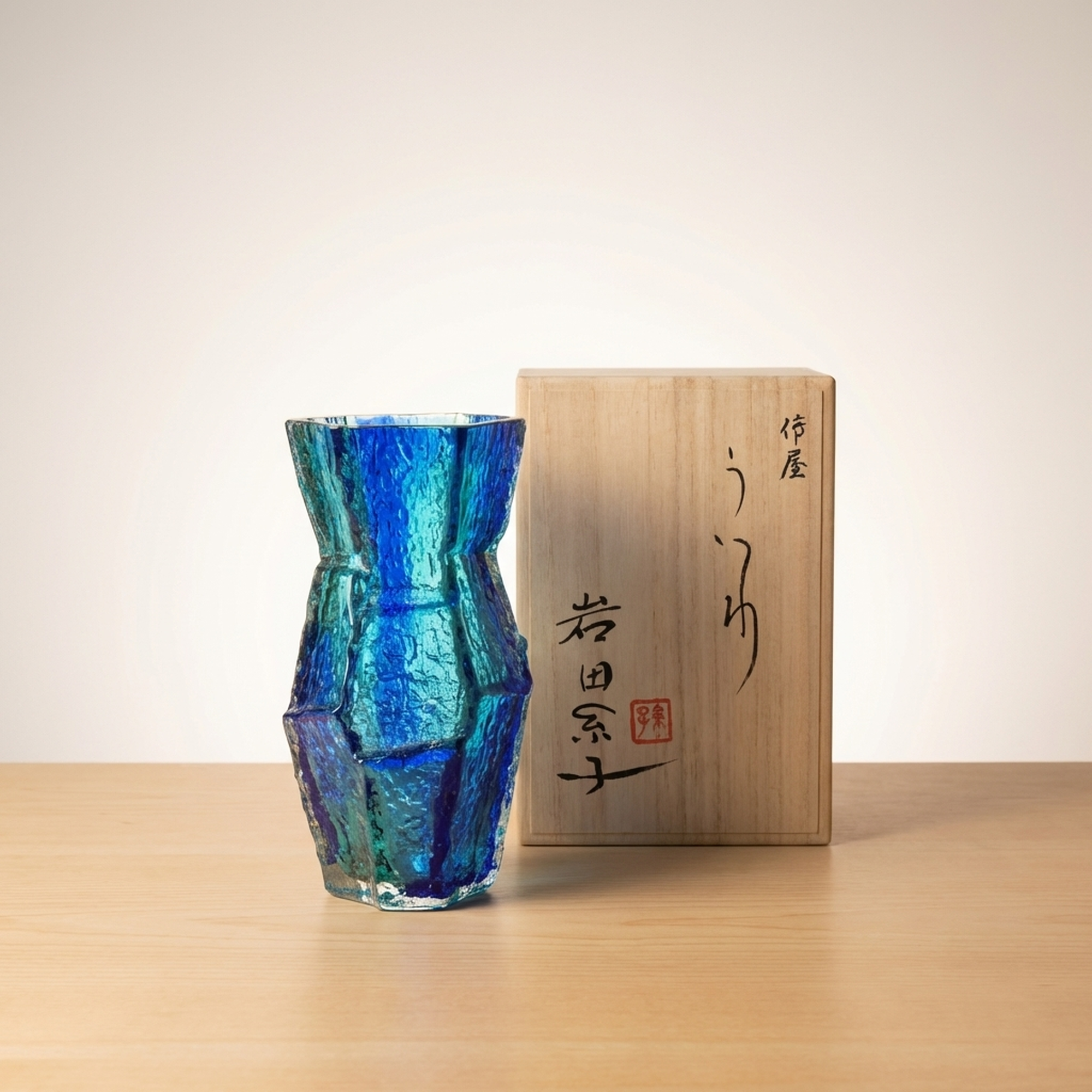 <p>Maker / Brand: Iwata Itoko Title of Work: Uzushio Glass Vase</p> <p>This striking glass vase, titled "Uzushio" (Whirlpool), is a masterful creation by the esteemed glass artist Iwata Itoko, presented with its original wooden storage box (kyobako). It embodies a mesmerizing blend of deep blue and emerald green, evoking the powerful, swirling depths of the ocean. Crafted with thick glass and a dynamically distorted form, this piece is a example to the artist's unique vision and skilled execution.</p> <p>Artistic & Cultural Background Japanese glass art, while having ancient roots, has seen a vibrant resurgence in contemporary times, with artists like Iwata Itoko pushing the boundaries of traditional craftsmanship. Modern Japanese artists often draw inspiration from nature, translating its ephemeral beauty and raw power into tangible forms. This piece reflects a deep appreciation for the dynamic forces of the sea, a recurring motif in Japanese aesthetics.</p> <p>Design & Technique The "Uzushio" vase showcases Iwata Itoko's distinctive technique of fusing rich, contrasting colors within thick glass. The deep blue and emerald green pigments are expertly melded, creating an illusion of a captured oceanic vortex. The substantial thickness of the glass not only provides a powerful presence but also allows for a striking interplay of light, revealing new facets and depths with every shift in illumination.</p> <p>Form & Aesthetic Qualities * <strong>Dynamic Form:</strong> Characterized by a powerfully distorted and undulating silhouette, reminiscent of water in motion. * <strong>Luminous Depth:</strong> The thick glass body allows light to penetrate and refract, creating a vibrant, ever-changing glow. * <strong>Oceanic Palette:</strong> A stunning blend of deep blue and emerald green, carefully crafted to evoke the mystical essence of a sea whirlpool.</p> <p>Collector & Decorative Appeal * <strong>Transformative Presence:</strong> This piece possesses a remarkable presence that can instantly elevate and transform the atmosphere of any room. * <strong>Versatile Functionality:</strong> While designed as a striking flower vase, its artistic merit allows it to stand alone as a compelling sculptural art object. * <strong>Artistic Investment:</strong> A unique work by a recognized glass artist, offering both aesthetic pleasure and the potential for appreciation.</p> <p>This exquisite piece by Iwata Itoko is perfect for the knowledgeable collector who appreciates contemporary Japanese craftsmanship and art inspired by nature's profound beauty.</p> <h3>Details</h3> <table style="border-collapse:collapse;width:100%"><tr><td style="padding:4px 12px 4px 0;font-weight:bold;white-space:nowrap">Condition</td><td style="padding:4px 0">Good</td></tr><tr><td style="padding:4px 12px 4px 0;font-weight:bold;white-space:nowrap">Material</td><td style="padding:4px 0">Glass</td></tr><tr><td style="padding:4px 12px 4px 0;font-weight:bold;white-space:nowrap">Era</td><td style="padding:4px 0">Unknown</td></tr><tr><td style="padding:4px 12px 4px 0;font-weight:bold;white-space:nowrap">Dimensions</td><td style="padding:4px 0">高さ:24.5cm / 幅:13.5cm / サイズ 幅:13.5cm</td></tr></table>