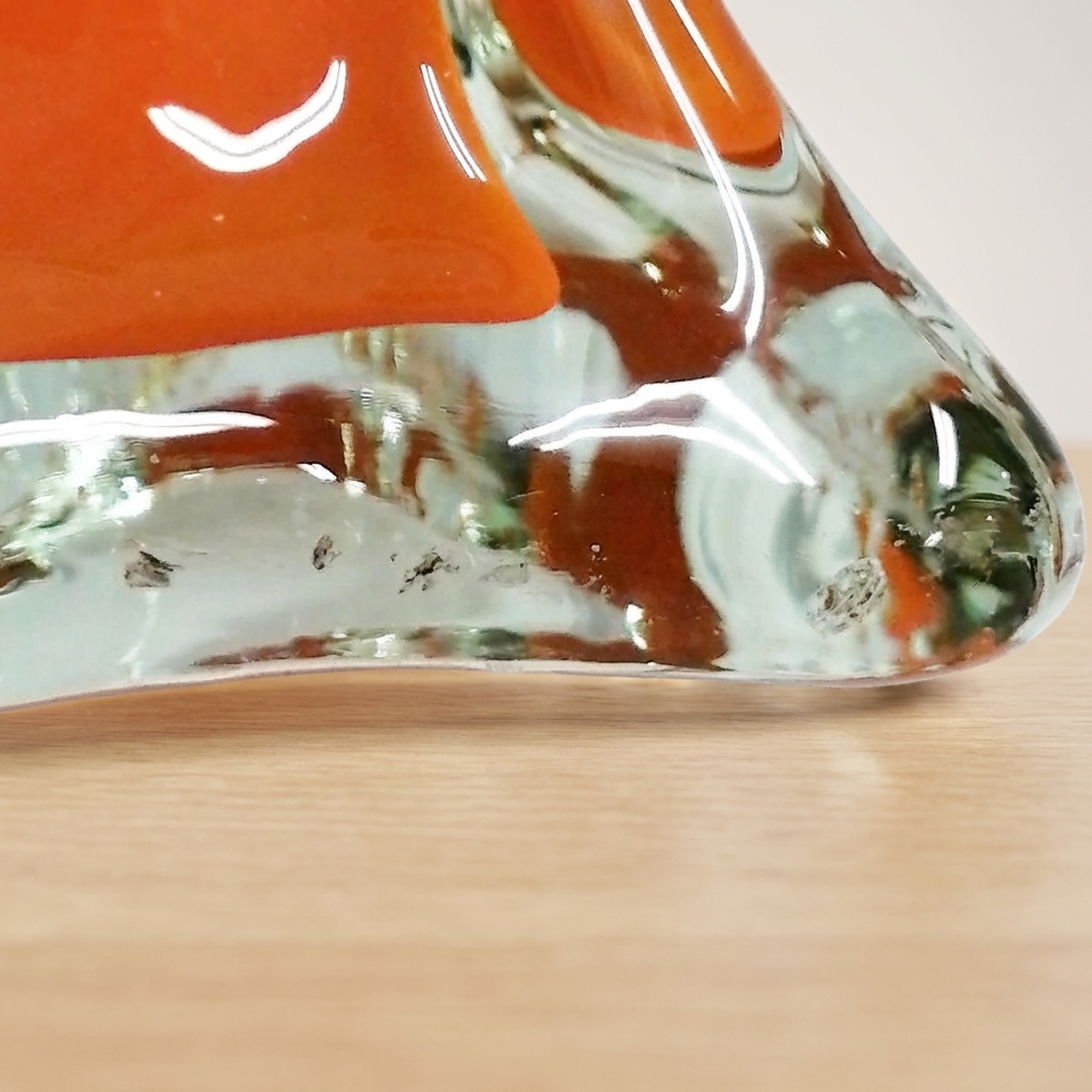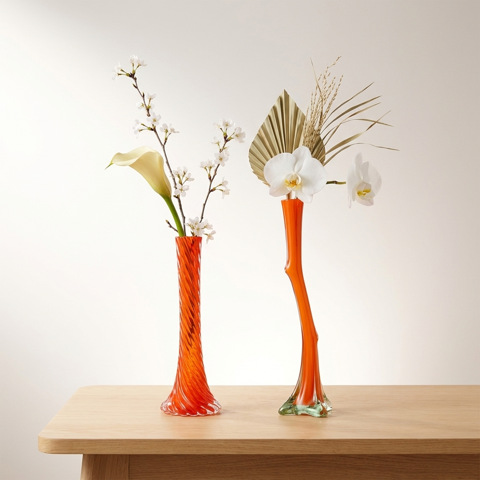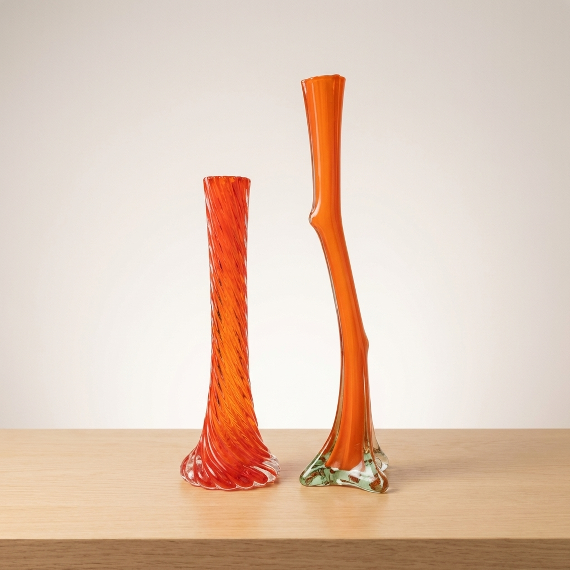 <p>Maker / Brand: Unknown Title of Work: Flower Vase Pair: Twist and Murano Glass Style Orange, with Noted Imperfections</p> <p>Presenting a striking pair of glass flower vases, each boasting a vibrant orange hue and distinct design. This set includes a gracefully twisted vase, which is in beautiful condition, and another crafted in the elegant style reminiscent of Murano glass. The Murano-style vase, while generally well-preserved, exhibits a small chip on its upper rim and some scratches and chips on its base. Designed primarily for single blooms, these vessels bring a touch of warm color and artistic flair to any interior.</p> <p>Artistic & Cultural Background While drawing inspiration from the renowned glassmaking traditions of Murano, these vases reflect a broader appreciation for diverse artistic influences within Japanese decorative arts. Japanese artisans often incorporate global aesthetics into their work, adapting techniques and styles to create unique pieces that connect with contemporary sensibilities, celebrating both form and color in glass.</p> <p>Design & Technique The pair showcases contrasting yet complementary designs. One vase features a striking twisted body, its surface spiraling upwards to catch and refract light, creating a lively texture. Its companion, styled after Murano glass, presents a more organic, free-form silhouette with subtle undulations and a unique base, highlighting the fluid nature of molten glass and the artisan's hand.</p> <p>Form & Aesthetic Qualities <strong>Dynamic Silhouettes:</strong> The tall, slender forms of both vases create an elegant vertical emphasis, with the twisted and organic shapes offering distinct visual interest. <strong>Vibrant Hue:</strong> A rich, translucent orange permeates both pieces, imbuing them with a warm, energetic glow that brightens any setting. <strong>Textural Contrast:</strong> The crisp, defined ridges of the twisted vase beautifully contrast with the smooth, undulating surface and unique base of its Murano-style counterpart.</p> <p>Collector & Decorative Appeal <strong>Striking Statement:</strong> Displayed together or individually, these vases serve as eye-catching decorative accents, adding a pop of color and artistic sophistication. <strong>Versatile Display:</strong> Perfect for showcasing a single delicate bloom, a sprig of greenery, or simply admired as sculptural art pieces on a shelf or mantel. <strong>Unique Pair:</strong> Offered as a set, these two distinct yet harmonious vases provide a curated aesthetic, ideal for collectors seeking complementary forms.</p> <p>This pair is an ideal acquisition for those who appreciate the interplay of form, color, and inspired design in contemporary decorative glass art.</p> <h3>Details</h3> <table style="border-collapse:collapse;width:100%"><tr><td style="padding:4px 12px 4px 0;font-weight:bold;white-space:nowrap">Condition</td><td style="padding:4px 0">Good</td></tr><tr><td style="padding:4px 12px 4px 0;font-weight:bold;white-space:nowrap">Material</td><td style="padding:4px 0">Glass</td></tr><tr><td style="padding:4px 12px 4px 0;font-weight:bold;white-space:nowrap">Era</td><td style="padding:4px 0">Unknown</td></tr><tr><td style="padding:4px 12px 4px 0;font-weight:bold;white-space:nowrap">Dimensions</td><td style="padding:4px 0">大きさです(素人採寸になります 誤差はご了承願います)</td></tr></table>