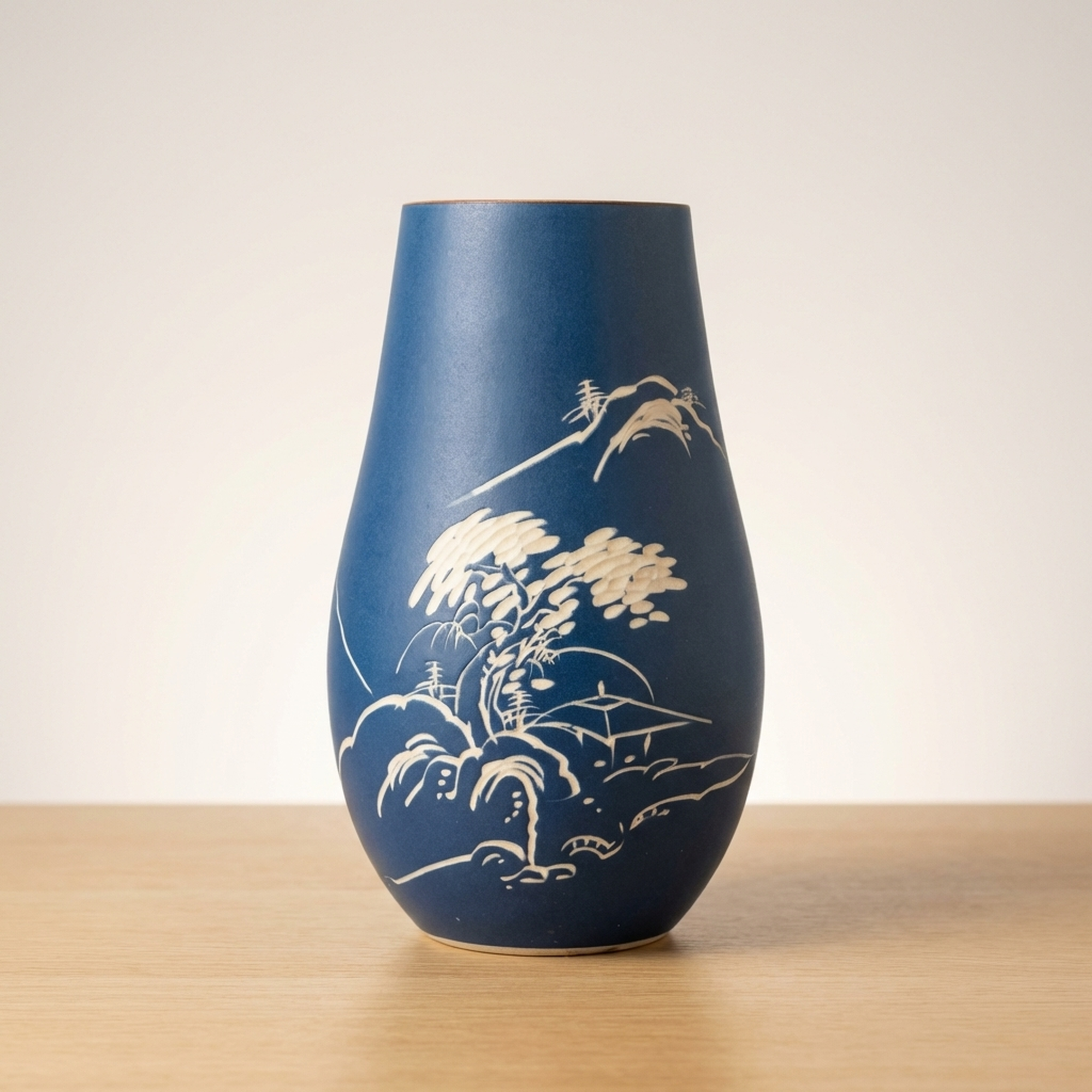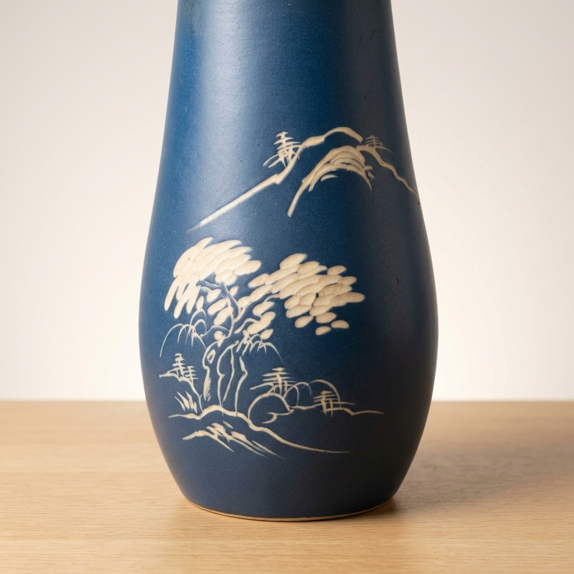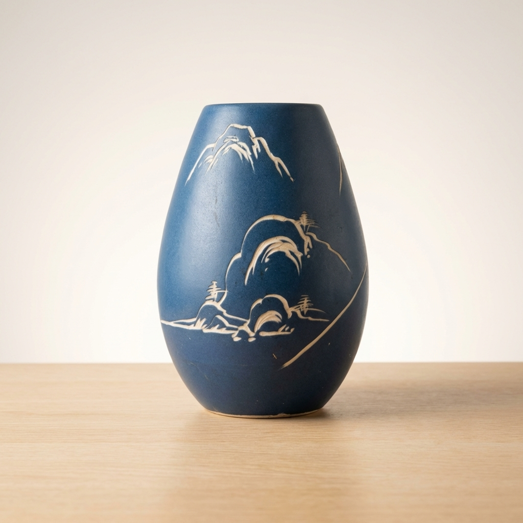 <p>Maker / Brand: Shinpo Title of Work: Showa Retro Carved Lapis Lazuli Blue Matte Finish Vase</p> <p>This exquisite Showa-era vase captivates with its deep ruri-iro (lapis lazuli blue) matte finish, providing a striking canvas for its beautifully carved white design. Delicate depictions of pine trees, mountains, and traditional houses emerge, evoking a serene Japanese landscape. An accent color adorns the rim. While showing no major chips or cracks, this vintage item exhibits minor scuffs and wear consistent with its age, particularly on the interior and base.</p> <p>Artistic & Cultural Background Originating from Japan's Showa period (1926-1989), this vase embodies the nostalgic charm and craftsmanship of mid-20th century Japanese aesthetics. The ruri-iro, a rich, deep blue reminiscent of lapis lazuli, has been cherished in Japanese art for centuries, symbolizing depth and tranquility. The landscape motif, often called sansuiga, is a classical East Asian art theme, celebrating harmony between nature and human dwellings.</p> <p>Design & Technique The vase features a distinctive carving technique, 'hori,' where the design is carefully incised into the surface. This allows the natural white of the ceramic body to contrast sharply with the vibrant matte blue glaze, creating a tactile and visually engaging texture. detailed details of pine trees, distant mountains, and traditional architecture are rendered with a delicate hand, showcasing refined artistic sensibility. A subtle, contrasting color on the mouth rim provides a thoughtful finishing touch.</p> <p>Form & Aesthetic Qualities * <strong>Elegant Silhouette:</strong> Its graceful, tapering form offers a timeless aesthetic, suitable for various interior styles. * <strong>Tactile Matte Finish:</strong> The velvety, non-reflective ruri-iro surface invites touch and absorbs light beautifully, enhancing the depth of the blue. * <strong>Serene Landscape Motif:</strong> The carved scene of mountains, pines, and houses creates a peaceful, contemplative visual narrative.</p> <p>Collector & Decorative Appeal * <strong>Timeless Showa Charm:</strong> A wonderful acquisition for collectors appreciating vintage Japanese craftsmanship and the distinctive aesthetic of the Showa era. * <strong>Versatile Display Piece:</strong> Equally stunning as a functional vase for ikebana or cut flowers, or as an elegant sculptural object on its own. * <strong>Evokes Tranquility:</strong> Its calming color palette and traditional landscape design bring a sense of peace and Japanese elegance to any space.</p> <p>This vase is an ideal choice for those seeking to infuse their home with Japanese heritage, offering both artistic beauty and a tranquil presence.</p> <h3>Details</h3> <table style="border-collapse:collapse;width:100%"><tr><td style="padding:4px 12px 4px 0;font-weight:bold;white-space:nowrap">Condition</td><td style="padding:4px 0">Fair</td></tr><tr><td style="padding:4px 12px 4px 0;font-weight:bold;white-space:nowrap">Material</td><td style="padding:4px 0">Ceramic</td></tr><tr><td style="padding:4px 12px 4px 0;font-weight:bold;white-space:nowrap">Era</td><td style="padding:4px 0">Showa</td></tr><tr><td style="padding:4px 12px 4px 0;font-weight:bold;white-space:nowrap">Dimensions</td><td style="padding:4px 0">高さ:24cm / 幅:14cm / 口径:8cm / サイズ】</td></tr></table>