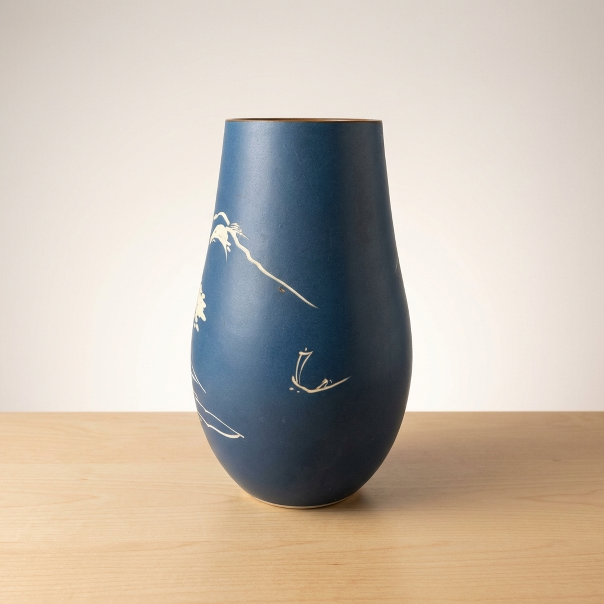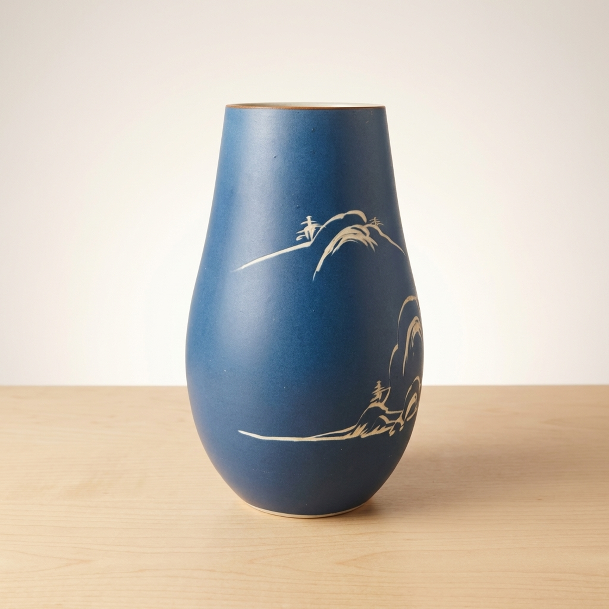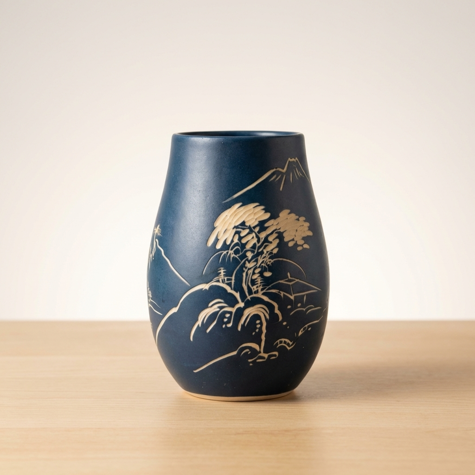 <p>Maker / Brand: Shinpo Title of Work: Showa Retro Carved Lapis Lazuli Blue Matte Finish Vase</p> <p>This exquisite Showa-era vase captivates with its deep ruri-iro (lapis lazuli blue) matte finish, providing a striking canvas for its beautifully carved white design. Delicate depictions of pine trees, mountains, and traditional houses emerge, evoking a serene Japanese landscape. An accent color adorns the rim. While showing no major chips or cracks, this vintage item exhibits minor scuffs and wear consistent with its age, particularly on the interior and base.</p> <p>Artistic & Cultural Background Originating from Japan's Showa period (1926-1989), this vase embodies the nostalgic charm and craftsmanship of mid-20th century Japanese aesthetics. The ruri-iro, a rich, deep blue reminiscent of lapis lazuli, has been cherished in Japanese art for centuries, symbolizing depth and tranquility. The landscape motif, often called sansuiga, is a classical East Asian art theme, celebrating harmony between nature and human dwellings.</p> <p>Design & Technique The vase features a distinctive carving technique, 'hori,' where the design is carefully incised into the surface. This allows the natural white of the ceramic body to contrast sharply with the vibrant matte blue glaze, creating a tactile and visually engaging texture. detailed details of pine trees, distant mountains, and traditional architecture are rendered with a delicate hand, showcasing refined artistic sensibility. A subtle, contrasting color on the mouth rim provides a thoughtful finishing touch.</p> <p>Form & Aesthetic Qualities * <strong>Elegant Silhouette:</strong> Its graceful, tapering form offers a timeless aesthetic, suitable for various interior styles. * <strong>Tactile Matte Finish:</strong> The velvety, non-reflective ruri-iro surface invites touch and absorbs light beautifully, enhancing the depth of the blue. * <strong>Serene Landscape Motif:</strong> The carved scene of mountains, pines, and houses creates a peaceful, contemplative visual narrative.</p> <p>Collector & Decorative Appeal * <strong>Timeless Showa Charm:</strong> A wonderful acquisition for collectors appreciating vintage Japanese craftsmanship and the distinctive aesthetic of the Showa era. * <strong>Versatile Display Piece:</strong> Equally stunning as a functional vase for ikebana or cut flowers, or as an elegant sculptural object on its own. * <strong>Evokes Tranquility:</strong> Its calming color palette and traditional landscape design bring a sense of peace and Japanese elegance to any space.</p> <p>This vase is an ideal choice for those seeking to infuse their home with Japanese heritage, offering both artistic beauty and a tranquil presence.</p> <h3>Details</h3> <table style="border-collapse:collapse;width:100%"><tr><td style="padding:4px 12px 4px 0;font-weight:bold;white-space:nowrap">Condition</td><td style="padding:4px 0">Fair</td></tr><tr><td style="padding:4px 12px 4px 0;font-weight:bold;white-space:nowrap">Material</td><td style="padding:4px 0">Ceramic</td></tr><tr><td style="padding:4px 12px 4px 0;font-weight:bold;white-space:nowrap">Era</td><td style="padding:4px 0">Showa</td></tr><tr><td style="padding:4px 12px 4px 0;font-weight:bold;white-space:nowrap">Dimensions</td><td style="padding:4px 0">高さ:24cm / 幅:14cm / 口径:8cm / サイズ】</td></tr></table>