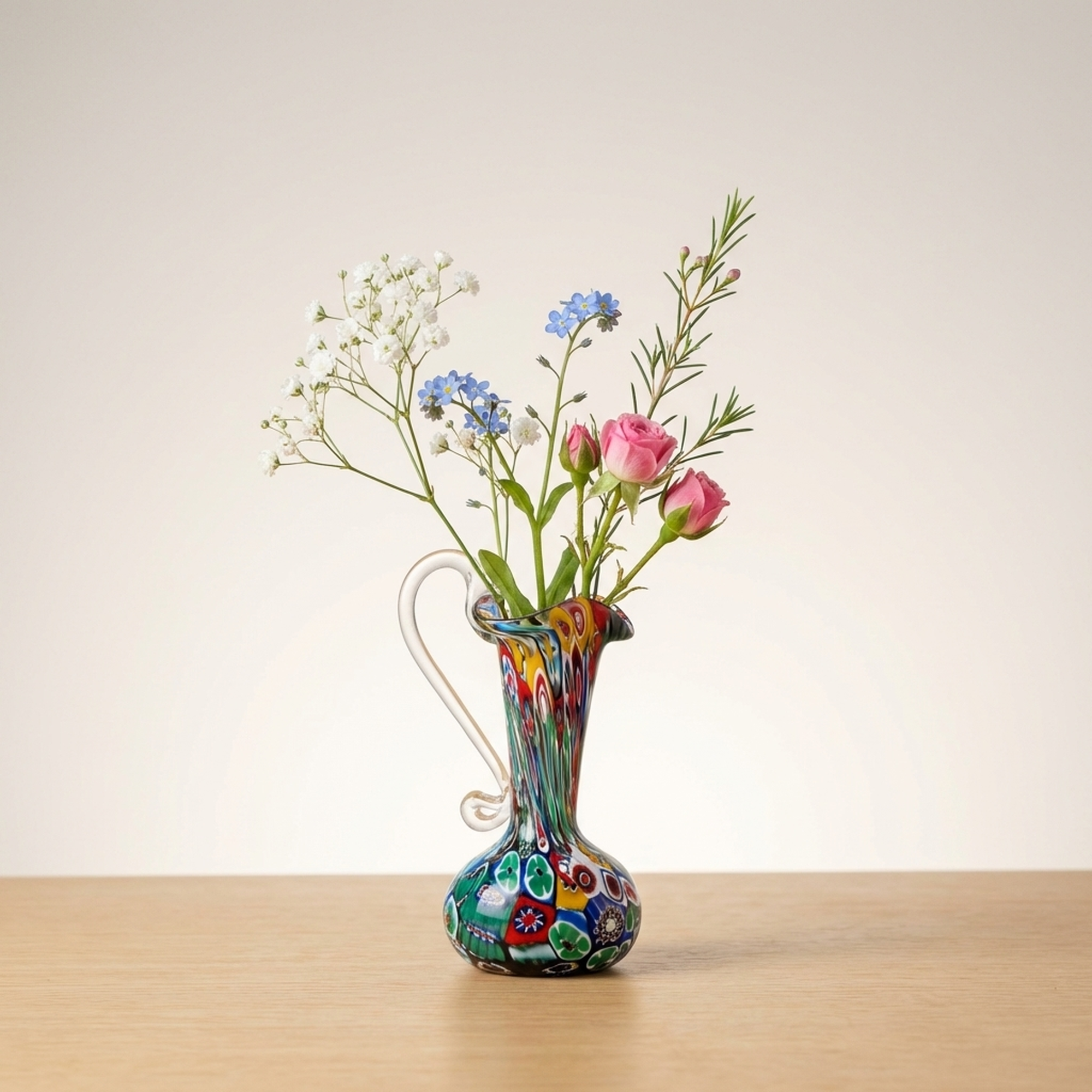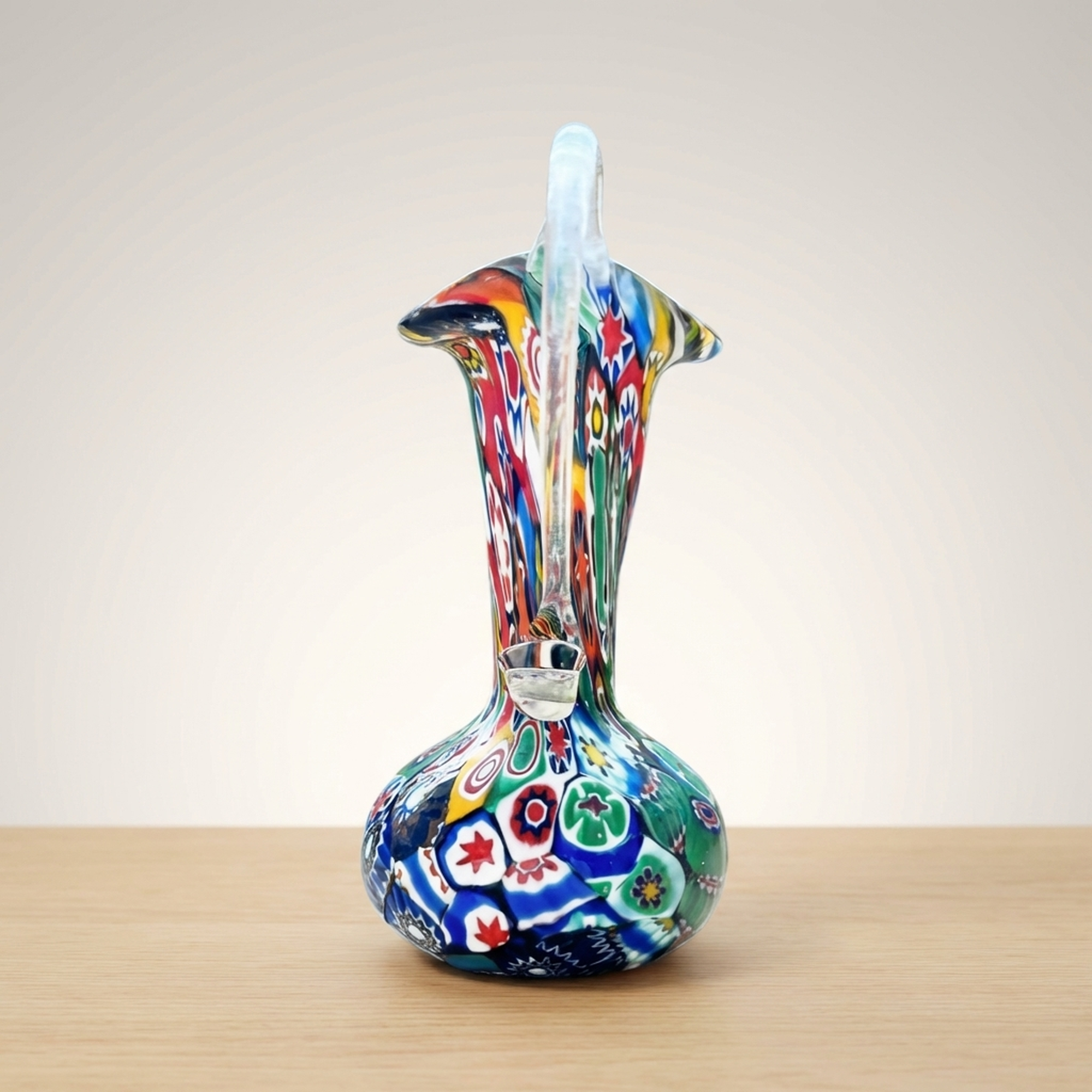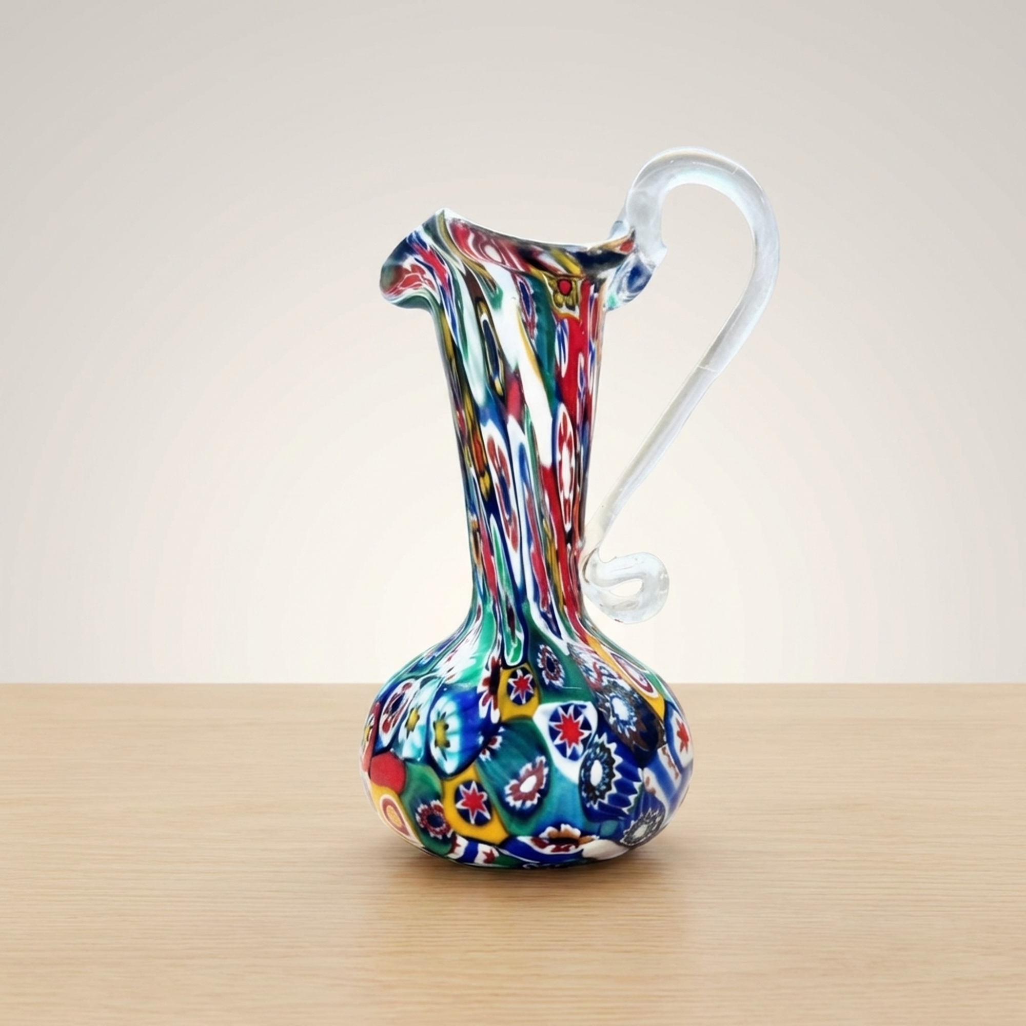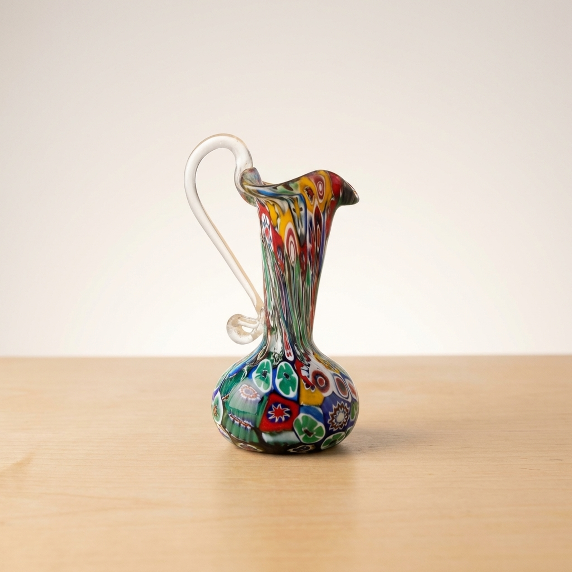 <p>STRUCTURE: Maker / Brand: Murano Glass / Venetian Glass Title of Work: Venetian Murano Millefiori Mixed Glass Vessel</p> <p>This vibrant Murano glass vessel showcases the iconic millefiori technique, a example to centuries of Venetian glassmaking artistry. Hand-blown with a charming pitcher-like form, its surface bursts with a kaleidoscope of colorful floral patterns, making it a striking decorative piece.</p> <p>Artistic & Cultural Background Murano glass, originating from the island of Murano in Venice, Italy, has been celebrated for its exquisite craftsmanship since the 13th century. Venetian glassmakers developed sophisticated techniques, including millefiori, to create objects of exceptional beauty and detailed detail, establishing a legacy of luxury and artistry that continues to this day.</p> <p>Design & Technique The vessel is adorned with a rich "millefiori" (thousand flowers) pattern, created by fusing small, colorful glass canes and cutting them to reveal detailed floral and geometric designs. These individual "murrine" are then carefully arranged and incorporated into the molten glass during the blowing process, resulting in a vibrant, multi-patterned surface unique to each piece. The hand-blown nature is evident in the pontil mark and slight roughness at the base, characteristic of artisanal production.</p> <p>Form & Aesthetic Qualities * <strong>Charming Silhouette:</strong> A delicate pitcher-like form with a gently flared rim and an elegant, clear glass handle, offering both classic utility and decorative appeal. * <strong>Vibrant Millefiori:</strong> A dazzling display of mixed, multi-colored floral and abstract patterns, creating a dynamic and joyful visual texture. * <strong>Tactile Authenticity:</strong> Hand-blown craftsmanship is palpable, with a slight unevenness at the base and a pontil mark, affirming its artisanal origins.</p> <p>Collector & Decorative Appeal * <strong>Timeless Elegance:</strong> A piece that go beyonds trends, offering classic Venetian artistry and a vibrant pop of color to any interior setting. * <strong>Versatile Display:</strong> Perfect as a charming single-flower vase, a striking standalone objet d'art, or an eye-catching addition to a curated collection. * <strong>Artisanal Heritage:</strong> Represents a cherished piece of Murano's storied glassmaking tradition, ideal for collectors who appreciate handmade quality and historical significance.</p> <p>This delightful vessel is a perfect acquisition for those seeking to infuse their space with the unique charm and vibrant history of Venetian glass art.</p> <h3>Details</h3> <table style="border-collapse:collapse;width:100%"><tr><td style="padding:4px 12px 4px 0;font-weight:bold;white-space:nowrap">Condition</td><td style="padding:4px 0">Good</td></tr><tr><td style="padding:4px 12px 4px 0;font-weight:bold;white-space:nowrap">Material</td><td style="padding:4px 0">Glass</td></tr><tr><td style="padding:4px 12px 4px 0;font-weight:bold;white-space:nowrap">Era</td><td style="padding:4px 0">Showa</td></tr><tr><td style="padding:4px 12px 4px 0;font-weight:bold;white-space:nowrap">Dimensions</td><td style="padding:4px 0">サイズ】</td></tr></table>