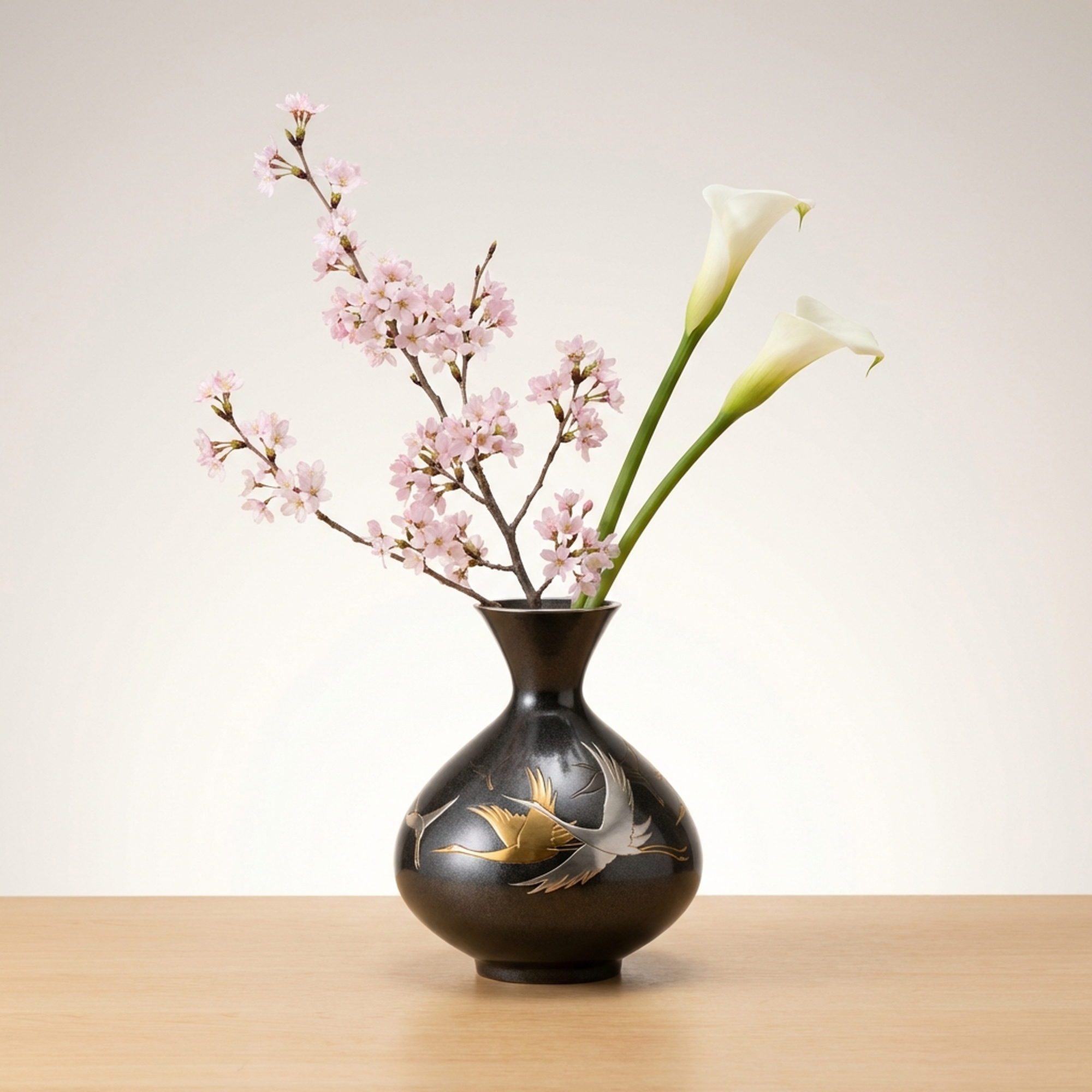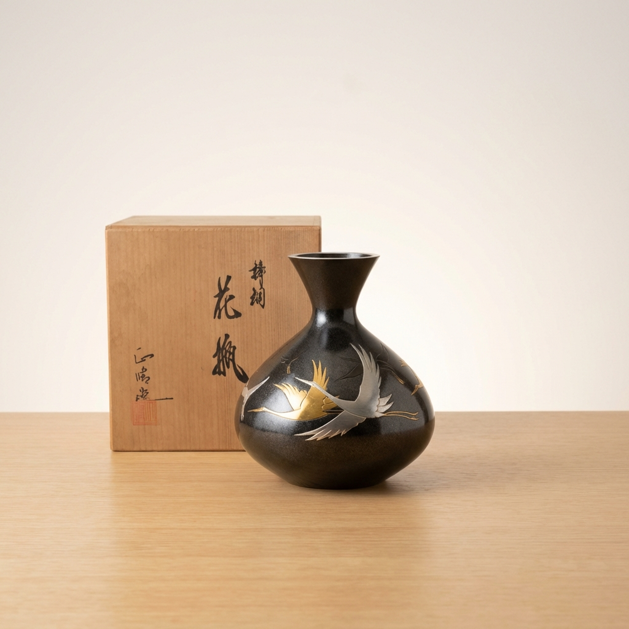 伝統工芸 高岡銅器 花瓶 金銀鶴模様