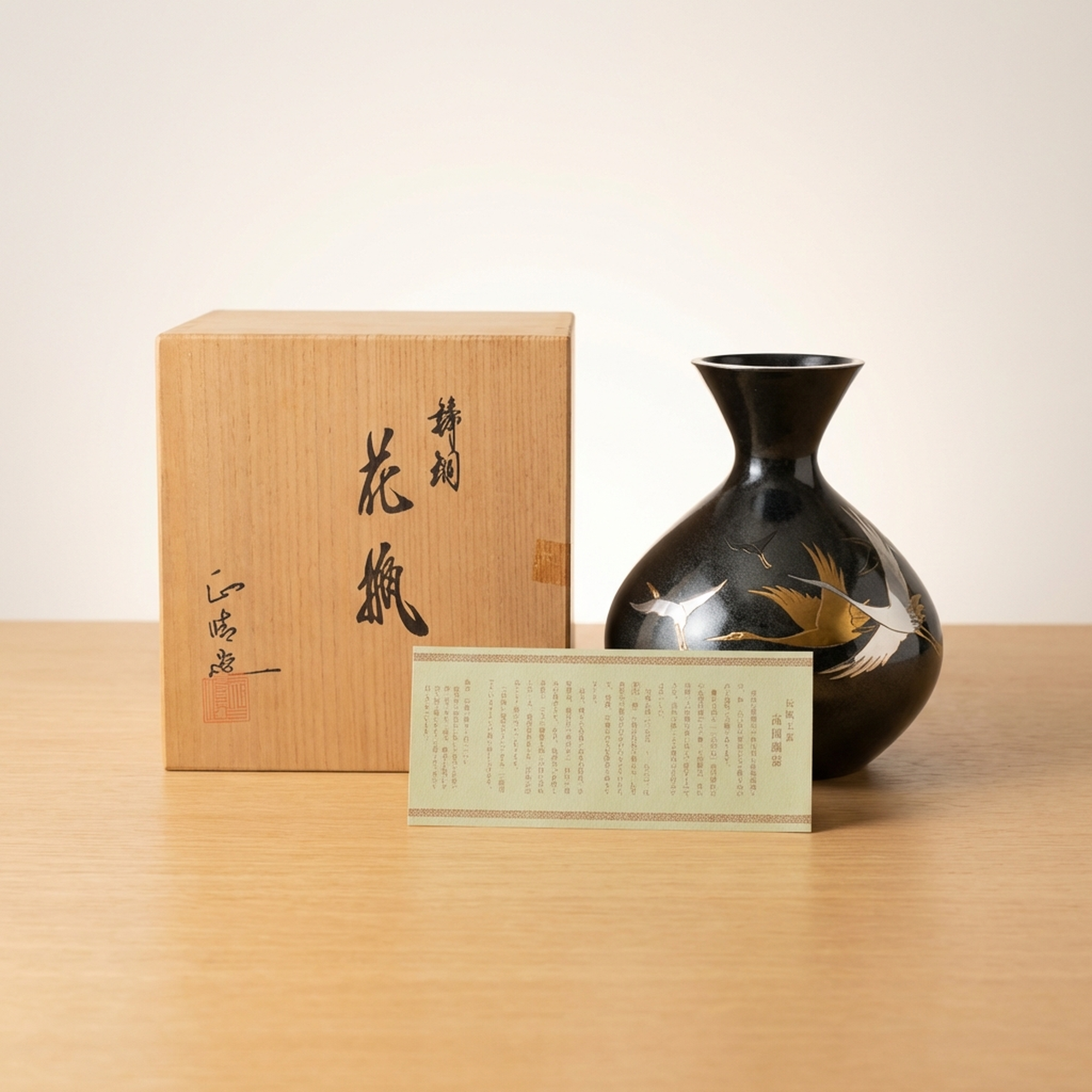 <p>Maker / Brand: Takaoka Douki Title of Work: Traditional Craft Takaoka Douki Vase with Gold and Silver Crane Pattern</p> <p>Presenting an exquisite Takaoka Douki vase, a example to Japan's revered metalworking tradition. Crafted from rich Karakane bronze, this elegant vessel is adorned with a striking design of cranes rendered in shimmering gold and silver. It arrives complete with its original tomobako, making it a distinguished piece for both ikebana arrangements and sophisticated interior display.</p> <p>Artistic & Cultural Background Takaoka Douki, originating from Takaoka City in Toyama Prefecture, boasts a history spanning over 400 years as a designated traditional craft. Renowned for its exceptional bronze casting techniques, Takaoka metalwork is celebrated for its detailed detail and enduring quality. The crane, or tsuru, is a deeply symbolic motif in Japanese culture, representing longevity, good fortune, and fidelity, often associated with auspicious occasions.</p> <p>Design & Technique The vase's robust Karakane body features a deep, patinated finish that provides a striking contrast to the dynamic tsuru moyo. These graceful cranes are carefully depicted, with some rendered in lustrous gold and others in radiant silver, creating a harmonious interplay of precious metals against the dark bronze. This detailed application highlights the skilled artistry characteristic of Takaoka Douki.</p> <p>Form & Aesthetic Qualities * <strong>Elegant Silhouette:</strong> A classic, balanced form with a gently swelling body that tapers gracefully into a slender neck, culminating in a subtly flared rim. * <strong>Rich Patina & Luster:</strong> The deep, dark patinated Karakane surface offers a sophisticated backdrop, beautifully offset by the vibrant metallic sheen of the gold and silver crane motifs. * <strong>Dynamic Imagery:</strong> The flying cranes convey a sense of movement and vitality, imbuing the vase with a serene yet energetic presence.</p> <p>Collector & Decorative Appeal * <strong>Authentic Traditional Craft:</strong> A genuine piece of Takaoka Douki, recognized for its heritage and craftsmanship, presented in its original tomobako. * <strong>Versatile Elegance:</strong> Perfect for showcasing a refined ikebana arrangement or serving as a standalone decorative art object in any knowledgeable home or office. * <strong>Unique Provenance:</strong> While in excellent condition with no noticeable scratches or dirt from long-term home storage, please note that a name is engraved on the bottom, indicating its past as a commemorative gift.</p> <p>This Takaoka Douki vase is an ideal acquisition for collectors of fine Japanese metalwork and those seeking a piece that embodies both cultural depth and timeless beauty.</p> <h3>Details</h3> <table style="border-collapse:collapse;width:100%"><tr><td style="padding:4px 12px 4px 0;font-weight:bold;white-space:nowrap">Condition</td><td style="padding:4px 0">Good</td></tr><tr><td style="padding:4px 12px 4px 0;font-weight:bold;white-space:nowrap">Material</td><td style="padding:4px 0">Bronze</td></tr><tr><td style="padding:4px 12px 4px 0;font-weight:bold;white-space:nowrap">Era</td><td style="padding:4px 0">Unknown</td></tr></table>