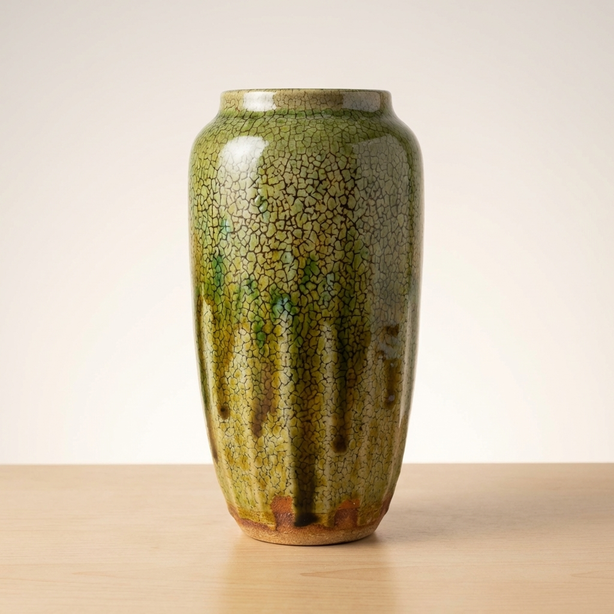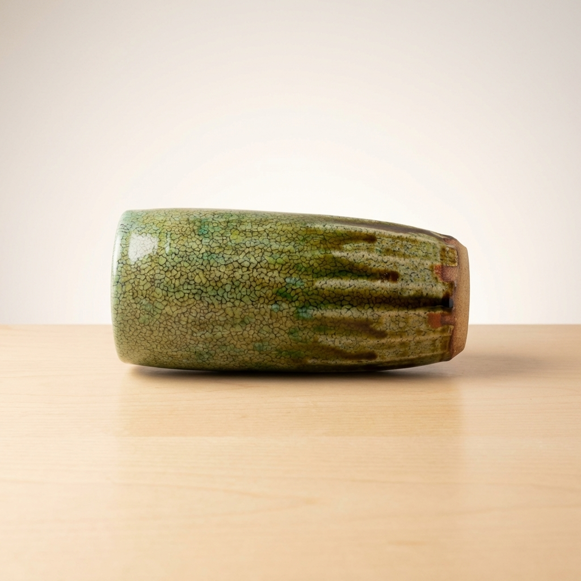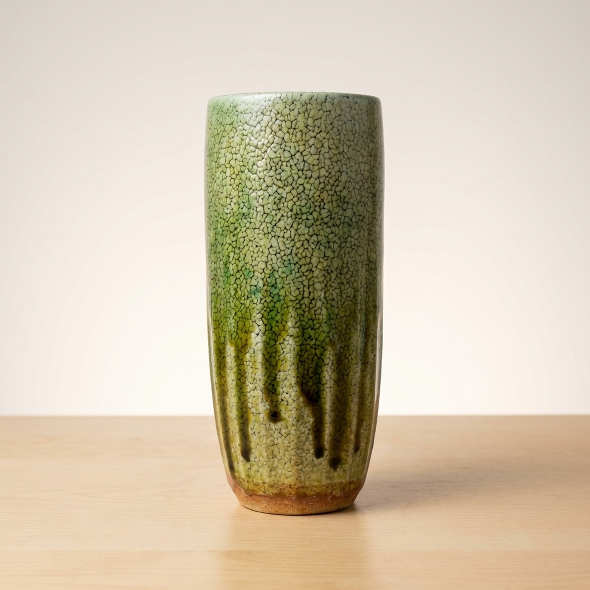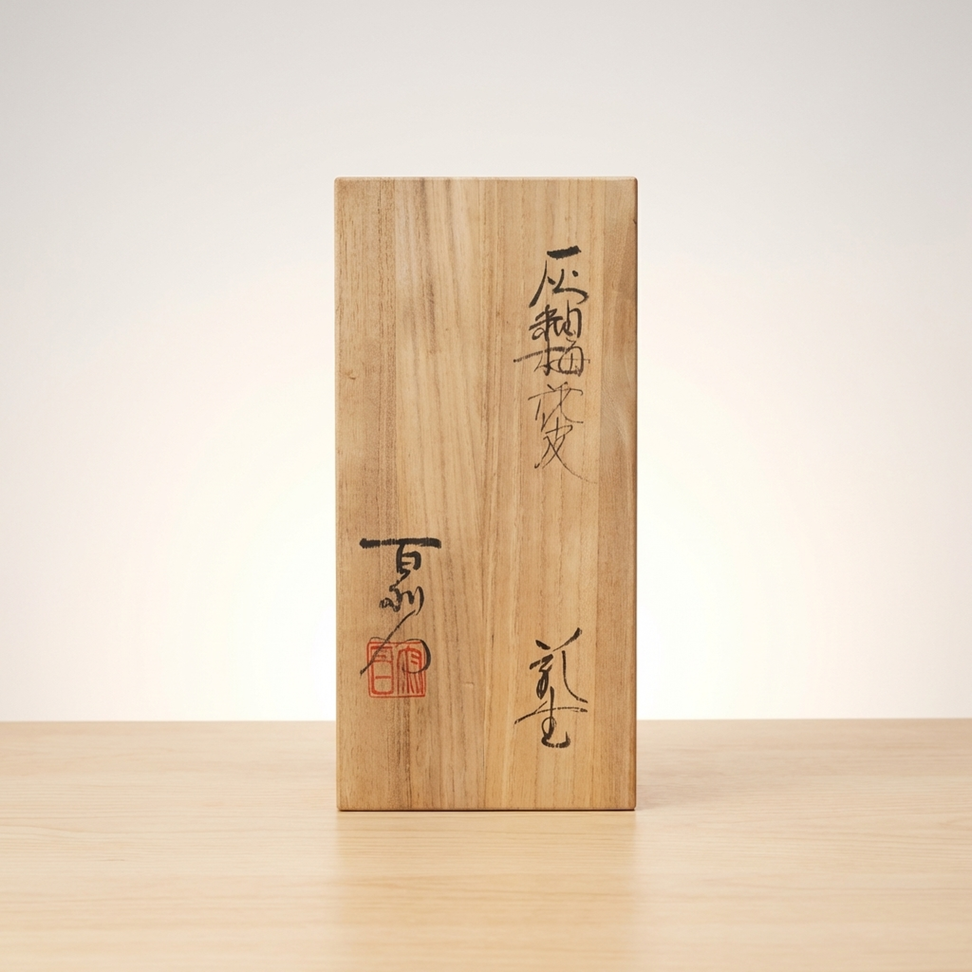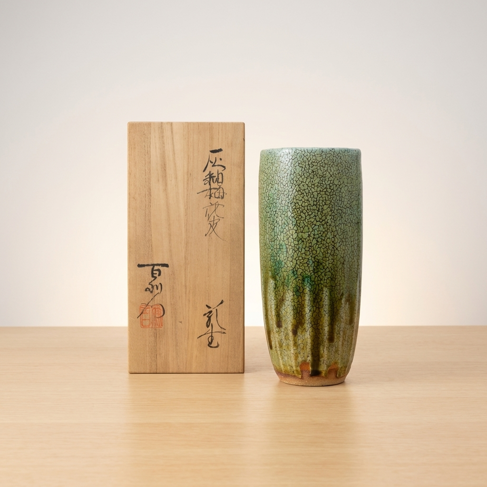<p>Maker / Brand: Ando Hyoriyuki Title of Work: Unused Vase by Ando Hyoriyuki with Kairagi Glaze, with Original Box</p> <p>Presenting an exquisite unused vase by the esteemed artist Ando Hyoriyuki, featuring the striking Kairagi glaze. This elegant vessel, accompanied by its original wooden box (kyobako) and protective cloth (kyobako-tsuki), showcases a rich, textured surface that embodies the rustic beauty cherished in Japanese ceramics. The vase itself is in pristine, unused condition with no damage, though the accompanying box exhibits some age-related deterioration and minor dents.</p> <p>Artistic & Cultural Background Kairagi glaze is a distinctive and highly prized technique in Japanese pottery, often associated with traditional tea ceremony wares like Ido chawan. Originating from Korean pottery traditions, it is characterized by its unique, rough, and crackled texture, resembling sharkskin or the surface of a dried plum. This intentional imperfection is deeply rooted in the Wabi-sabi aesthetic, celebrating natural processes and the beauty of the aged and unrefined.</p> <p>Design & Technique This vase exemplifies the Kairagi technique with its finely crackled, mottled green glaze that transitions into rich, earthy brown drips towards the base. The glaze's detailed network of fissures creates a tactile and visually dynamic surface, inviting closer inspection. The subtle variations in color and texture are a example to the artist's mastery in controlling the complex firing process required to achieve such a striking finish.</p> <p>Form & Aesthetic Qualities <strong>Elegant Form:</strong> A gracefully proportioned cylindrical body, offering a stable and versatile vessel for floral arrangements. <strong>Textural Depth:</strong> The distinctive Kairagi glaze provides a rich, tactile surface that contrasts beautifully with the smooth, refined shape. <strong>Organic Palette:</strong> The interplay of vibrant green and warm brown tones evokes natural landscapes, adding a serene and earthy presence to any setting.</p> <p>Collector & Decorative Appeal <strong>Artist's Provenance:</strong> A genuine piece by Ando Hyoriyuki, complete with its original signed wooden box, ensuring authenticity and value. <strong>Exceptional Condition:</strong> The vase itself is unused and undamaged, preserving its original artistic intent and quality. Please note that the accompanying wooden box shows some age-related deterioration and minor dents. <strong>Timeless Elegance:</strong> Its unique Kairagi texture and classic form make it a striking decorative object, perfect for showcasing ikebana or as a standalone art piece in a knowledgeable collection.</p> <p>This Ando Hyoriyuki Kairagi vase is an ideal acquisition for those who appreciate the profound beauty and skilled artistry of traditional Japanese ceramics.</p> <h3>Details</h3> <table style="border-collapse:collapse;width:100%"><tr><td style="padding:4px 12px 4px 0;font-weight:bold;white-space:nowrap">Condition</td><td style="padding:4px 0">Excellent</td></tr><tr><td style="padding:4px 12px 4px 0;font-weight:bold;white-space:nowrap">Material</td><td style="padding:4px 0">Ceramic</td></tr><tr><td style="padding:4px 12px 4px 0;font-weight:bold;white-space:nowrap">Era</td><td style="padding:4px 0">Unknown</td></tr><tr><td style="padding:4px 12px 4px 0;font-weight:bold;white-space:nowrap">Dimensions</td><td style="padding:4px 0">サイズ】</td></tr></table>
