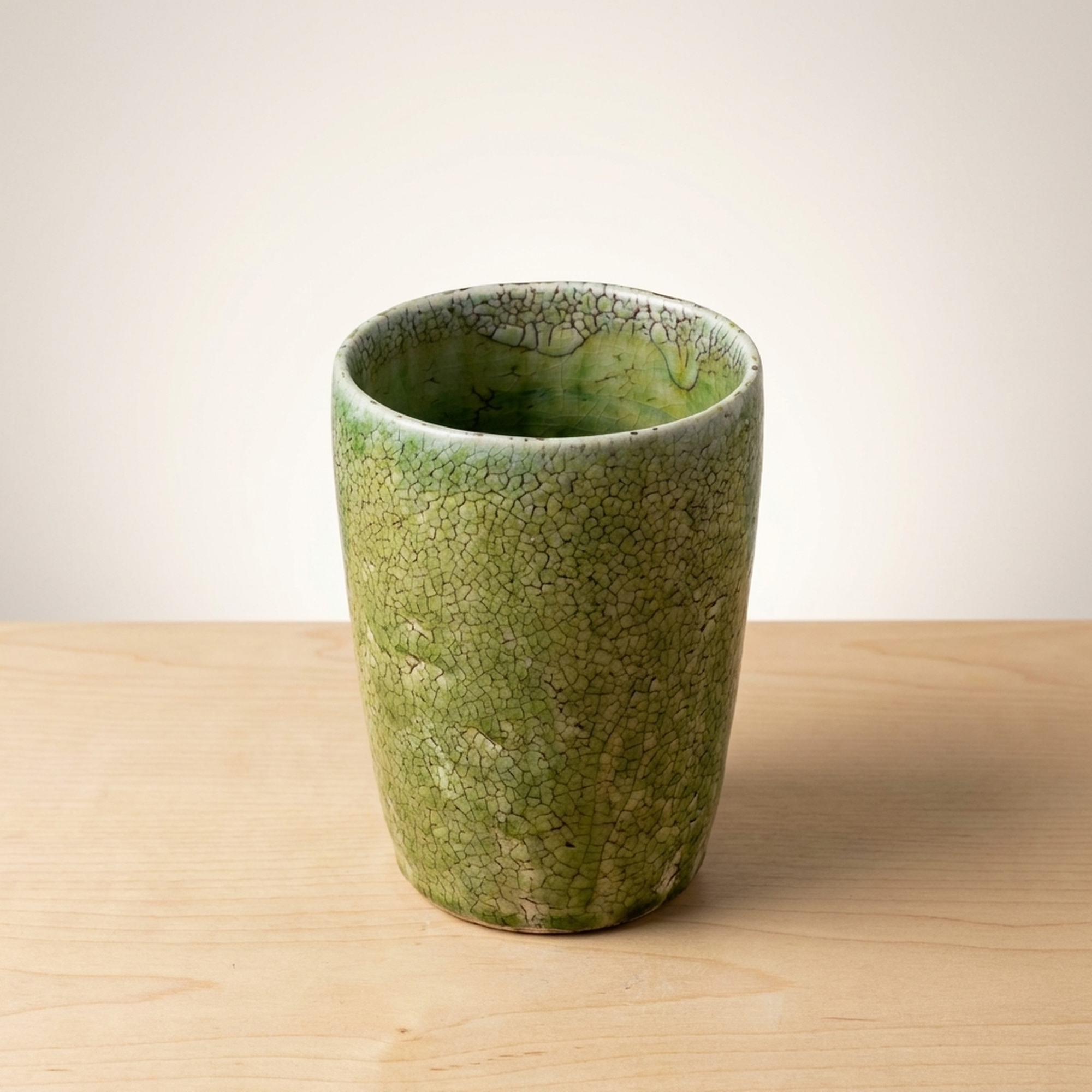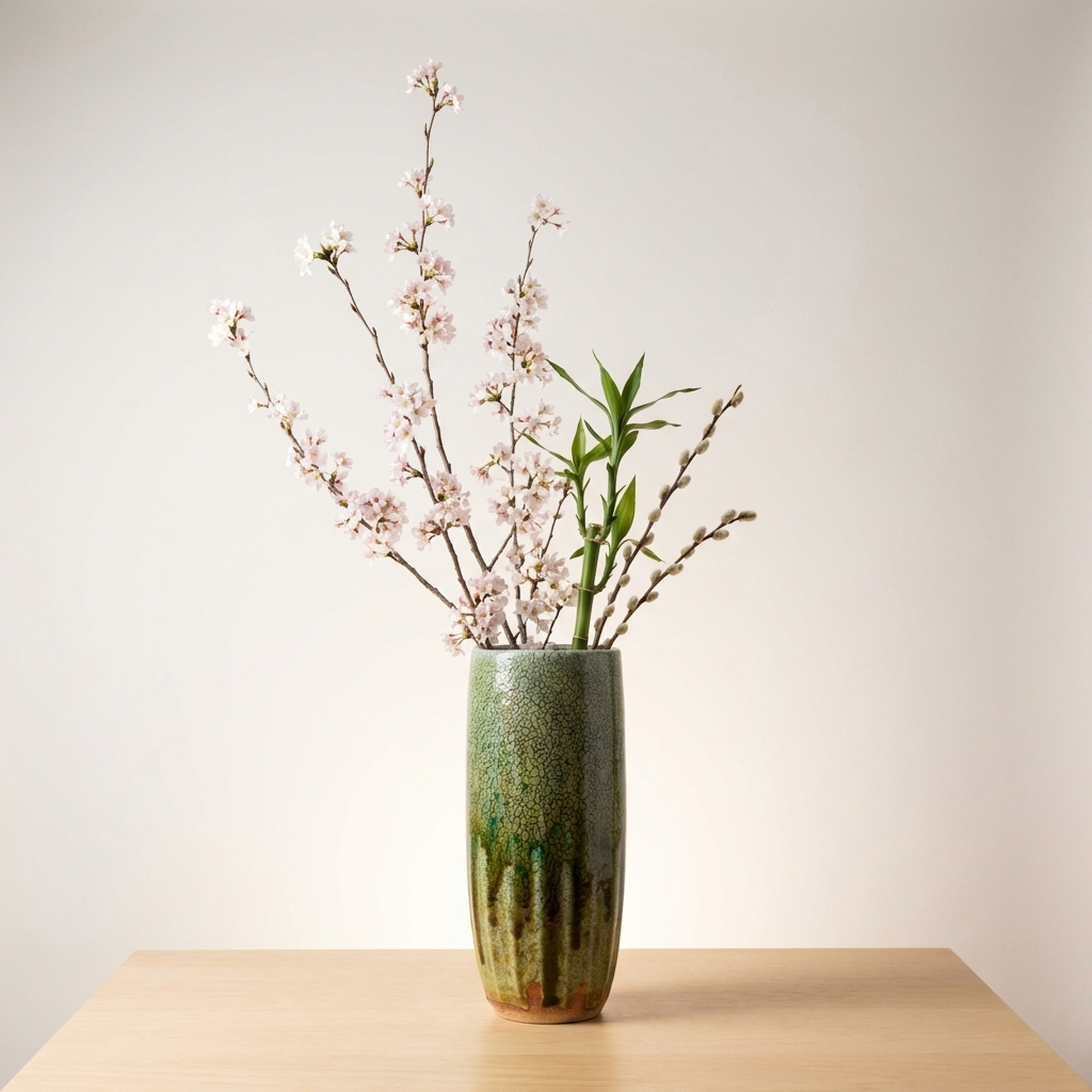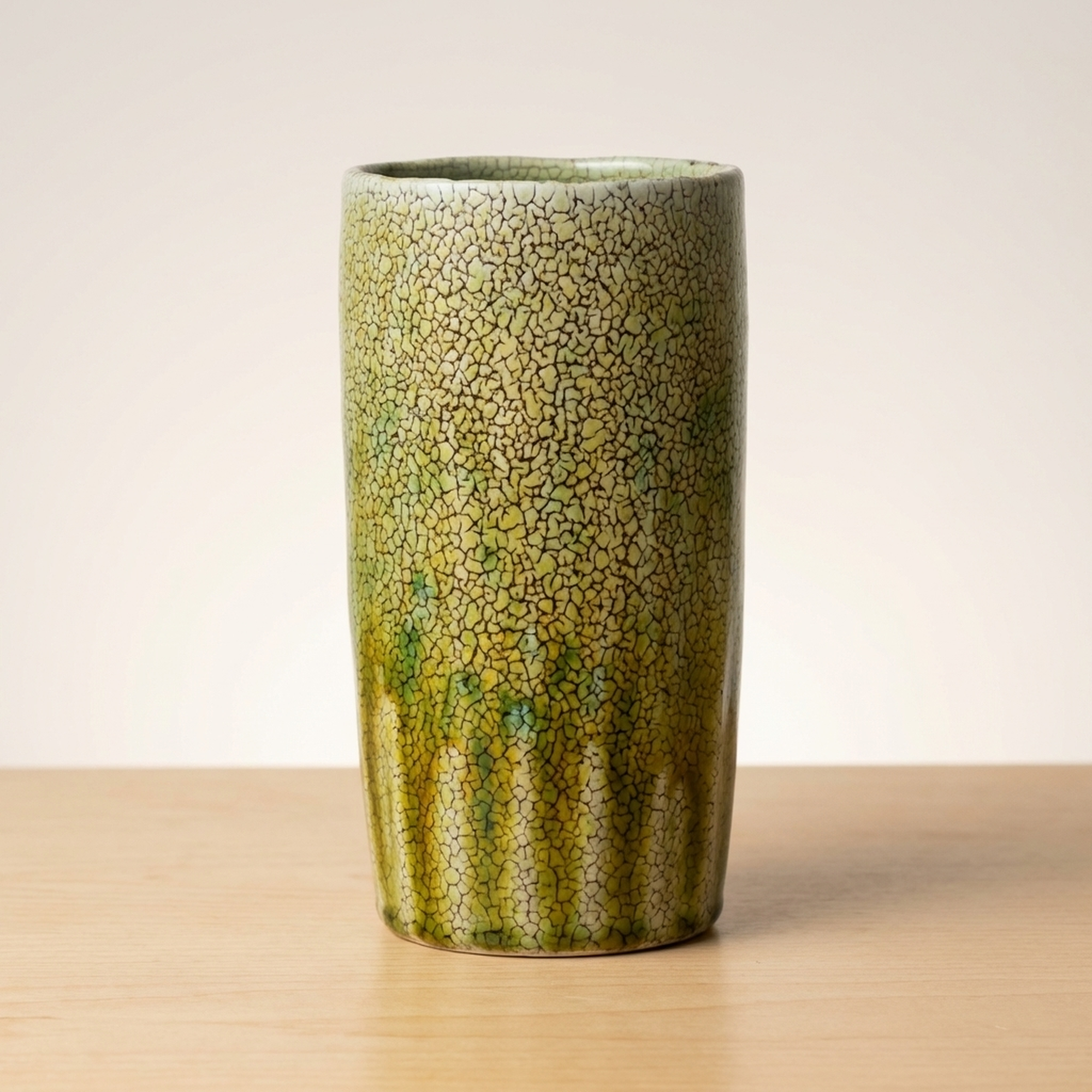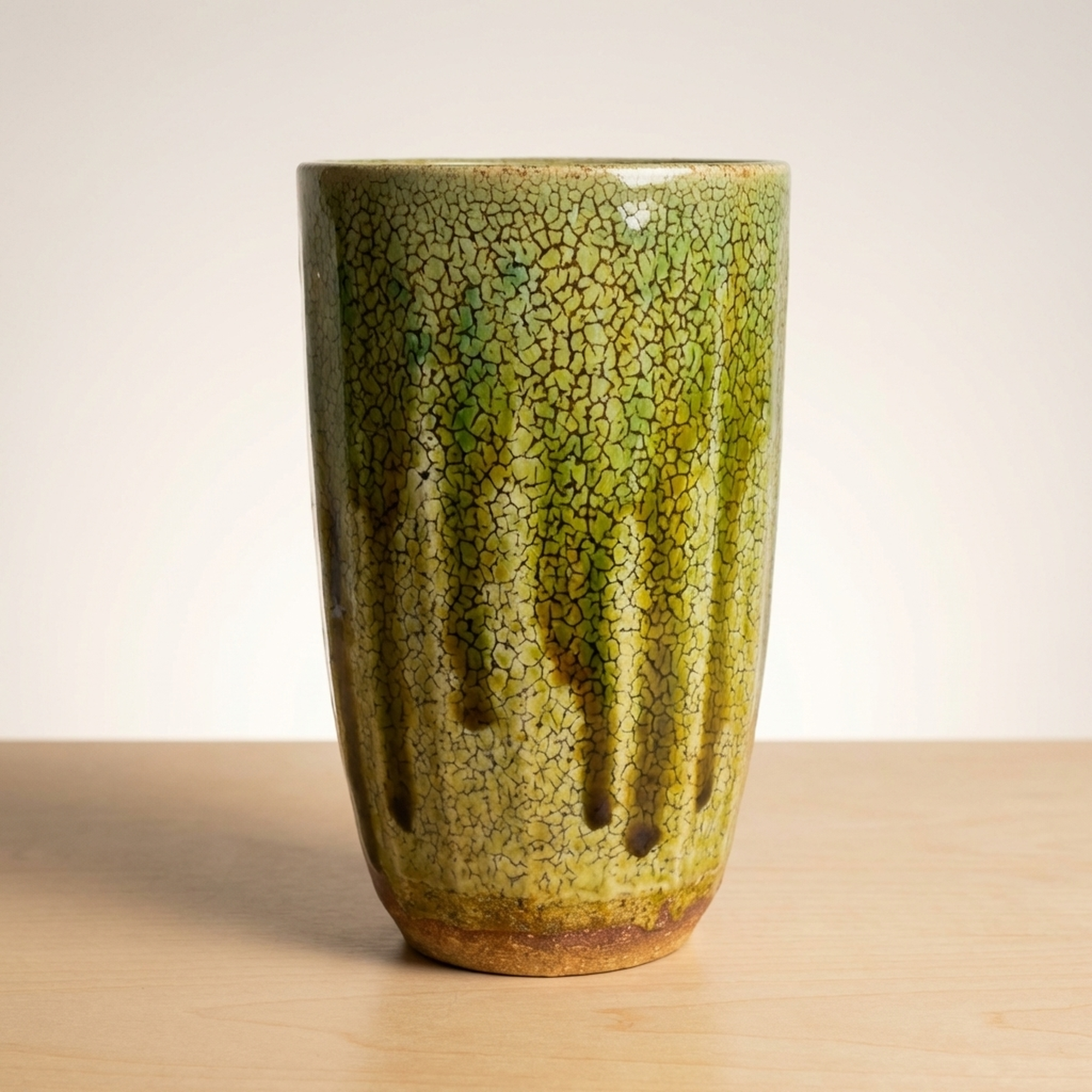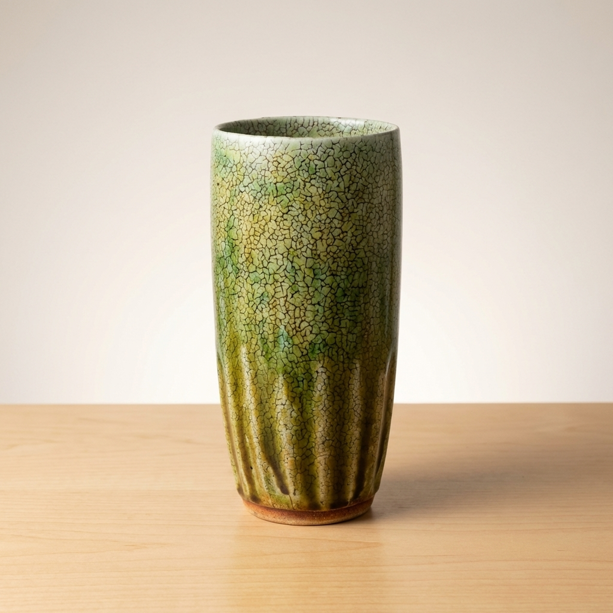 <p>Maker / Brand: Ando Hyoriyuki Title of Work: Unused Vase by Ando Hyoriyuki with Kairagi Glaze, with Original Box</p> <p>Presenting an exquisite unused vase by the esteemed artist Ando Hyoriyuki, featuring the striking Kairagi glaze. This elegant vessel, accompanied by its original wooden box (kyobako) and protective cloth (kyobako-tsuki), showcases a rich, textured surface that embodies the rustic beauty cherished in Japanese ceramics. The vase itself is in pristine, unused condition with no damage, though the accompanying box exhibits some age-related deterioration and minor dents.</p> <p>Artistic & Cultural Background Kairagi glaze is a distinctive and highly prized technique in Japanese pottery, often associated with traditional tea ceremony wares like Ido chawan. Originating from Korean pottery traditions, it is characterized by its unique, rough, and crackled texture, resembling sharkskin or the surface of a dried plum. This intentional imperfection is deeply rooted in the Wabi-sabi aesthetic, celebrating natural processes and the beauty of the aged and unrefined.</p> <p>Design & Technique This vase exemplifies the Kairagi technique with its finely crackled, mottled green glaze that transitions into rich, earthy brown drips towards the base. The glaze's detailed network of fissures creates a tactile and visually dynamic surface, inviting closer inspection. The subtle variations in color and texture are a example to the artist's mastery in controlling the complex firing process required to achieve such a striking finish.</p> <p>Form & Aesthetic Qualities <strong>Elegant Form:</strong> A gracefully proportioned cylindrical body, offering a stable and versatile vessel for floral arrangements. <strong>Textural Depth:</strong> The distinctive Kairagi glaze provides a rich, tactile surface that contrasts beautifully with the smooth, refined shape. <strong>Organic Palette:</strong> The interplay of vibrant green and warm brown tones evokes natural landscapes, adding a serene and earthy presence to any setting.</p> <p>Collector & Decorative Appeal <strong>Artist's Provenance:</strong> A genuine piece by Ando Hyoriyuki, complete with its original signed wooden box, ensuring authenticity and value. <strong>Exceptional Condition:</strong> The vase itself is unused and undamaged, preserving its original artistic intent and quality. Please note that the accompanying wooden box shows some age-related deterioration and minor dents. <strong>Timeless Elegance:</strong> Its unique Kairagi texture and classic form make it a striking decorative object, perfect for showcasing ikebana or as a standalone art piece in a knowledgeable collection.</p> <p>This Ando Hyoriyuki Kairagi vase is an ideal acquisition for those who appreciate the profound beauty and skilled artistry of traditional Japanese ceramics.</p> <h3>Details</h3> <table style="border-collapse:collapse;width:100%"><tr><td style="padding:4px 12px 4px 0;font-weight:bold;white-space:nowrap">Condition</td><td style="padding:4px 0">Excellent</td></tr><tr><td style="padding:4px 12px 4px 0;font-weight:bold;white-space:nowrap">Material</td><td style="padding:4px 0">Ceramic</td></tr><tr><td style="padding:4px 12px 4px 0;font-weight:bold;white-space:nowrap">Era</td><td style="padding:4px 0">Unknown</td></tr><tr><td style="padding:4px 12px 4px 0;font-weight:bold;white-space:nowrap">Dimensions</td><td style="padding:4px 0">サイズ】</td></tr></table>