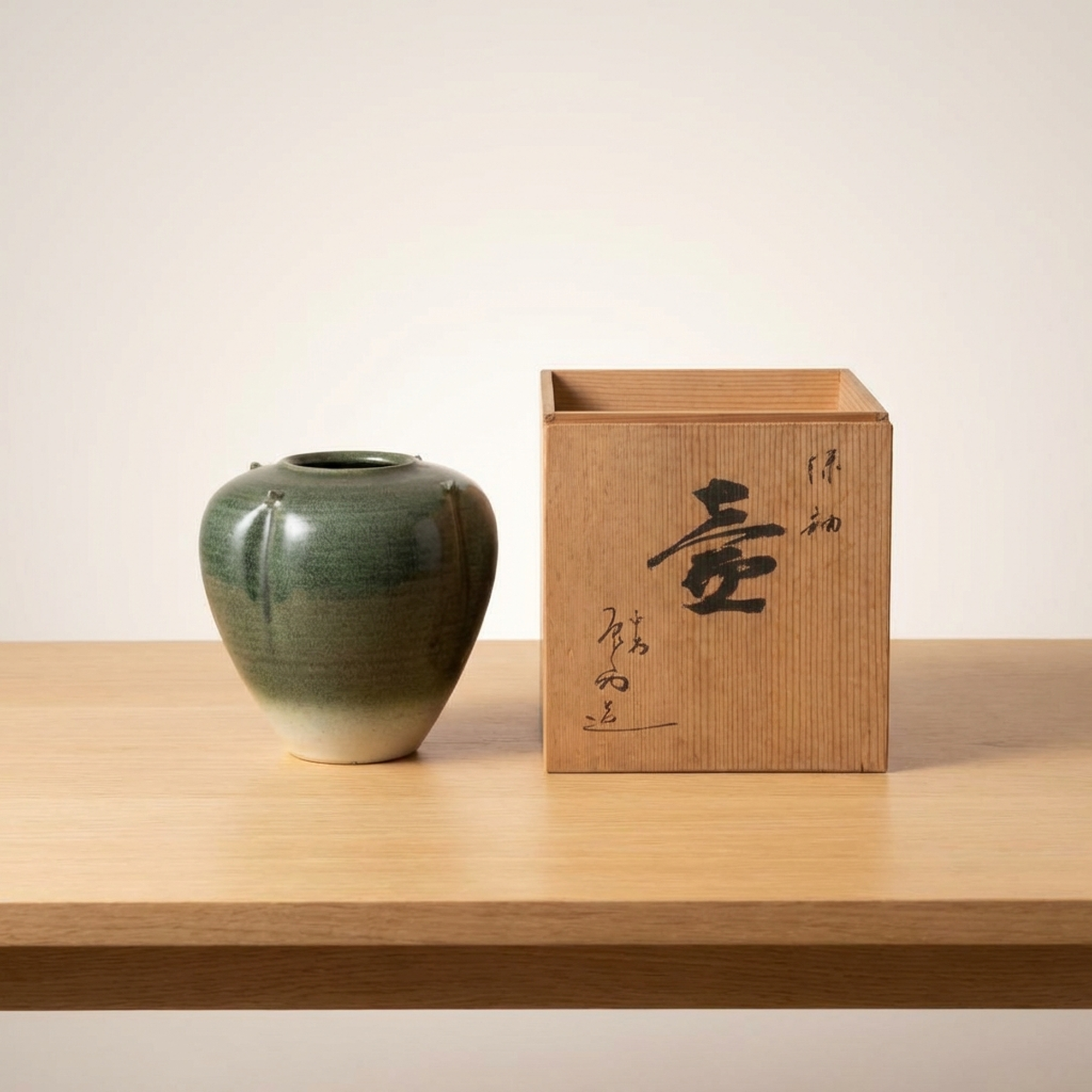 Antique Japanese Pottery Flower Vase Jar, Green White Gradient Ombre, With Kyobako