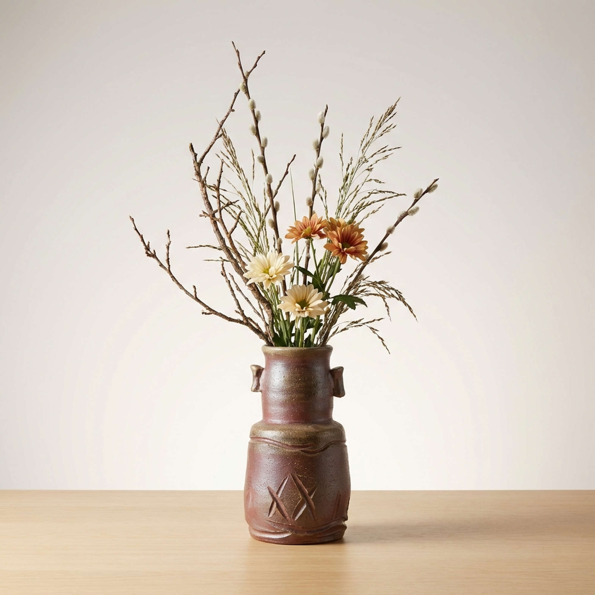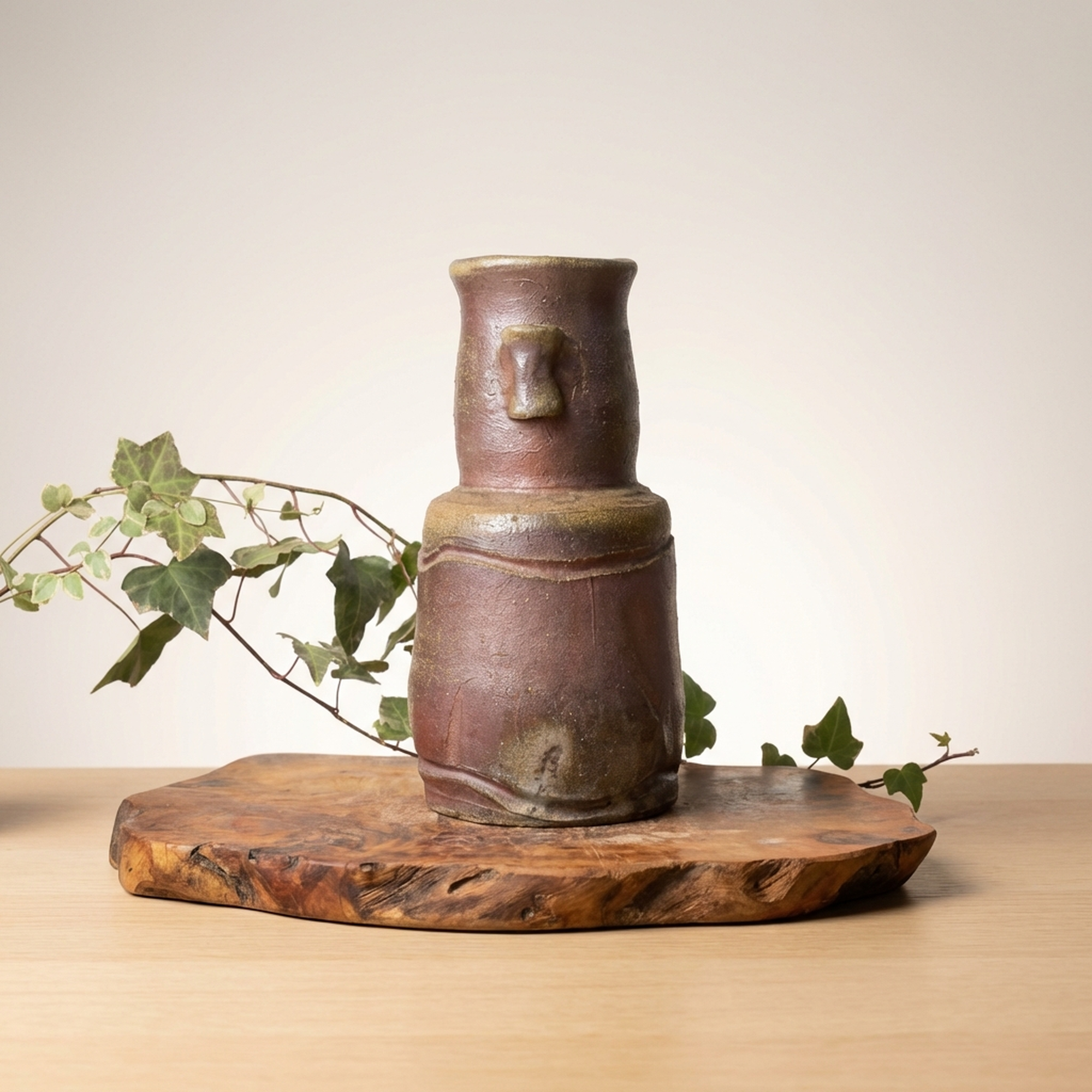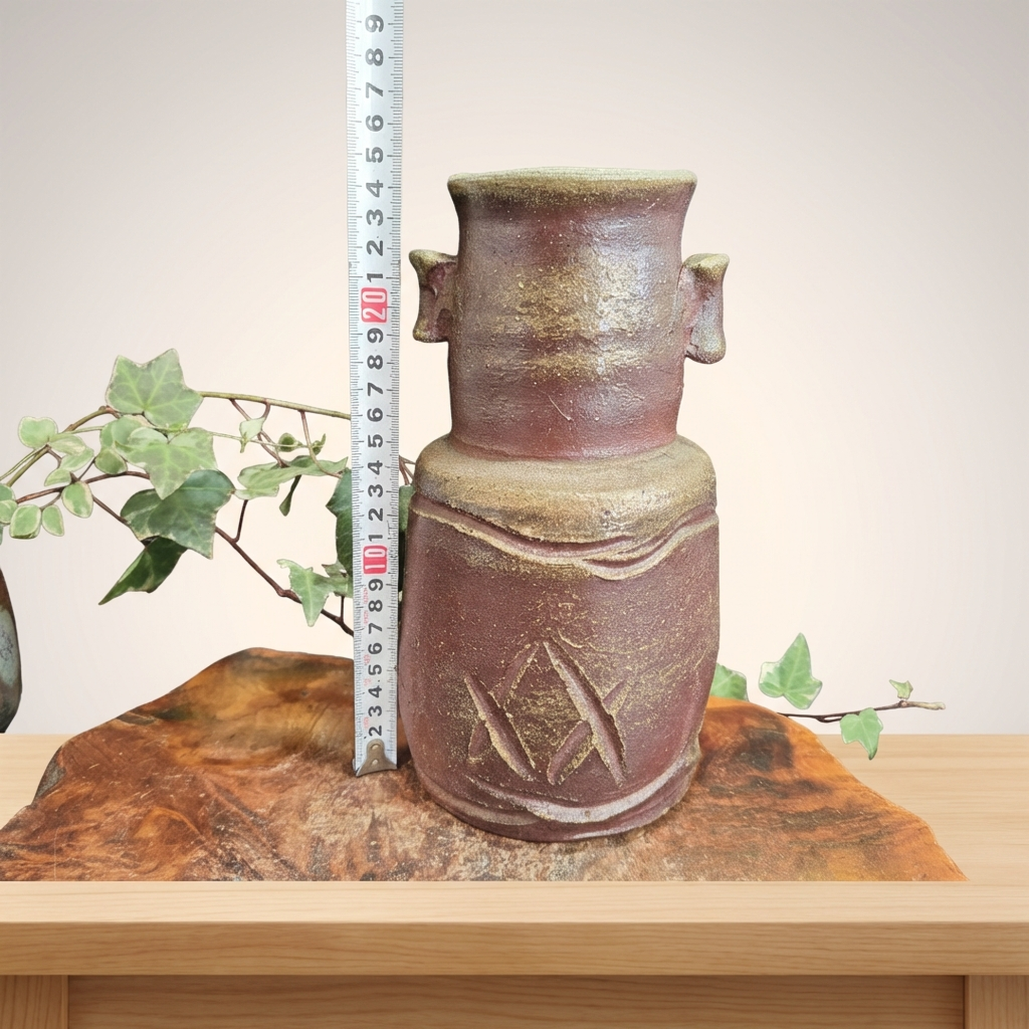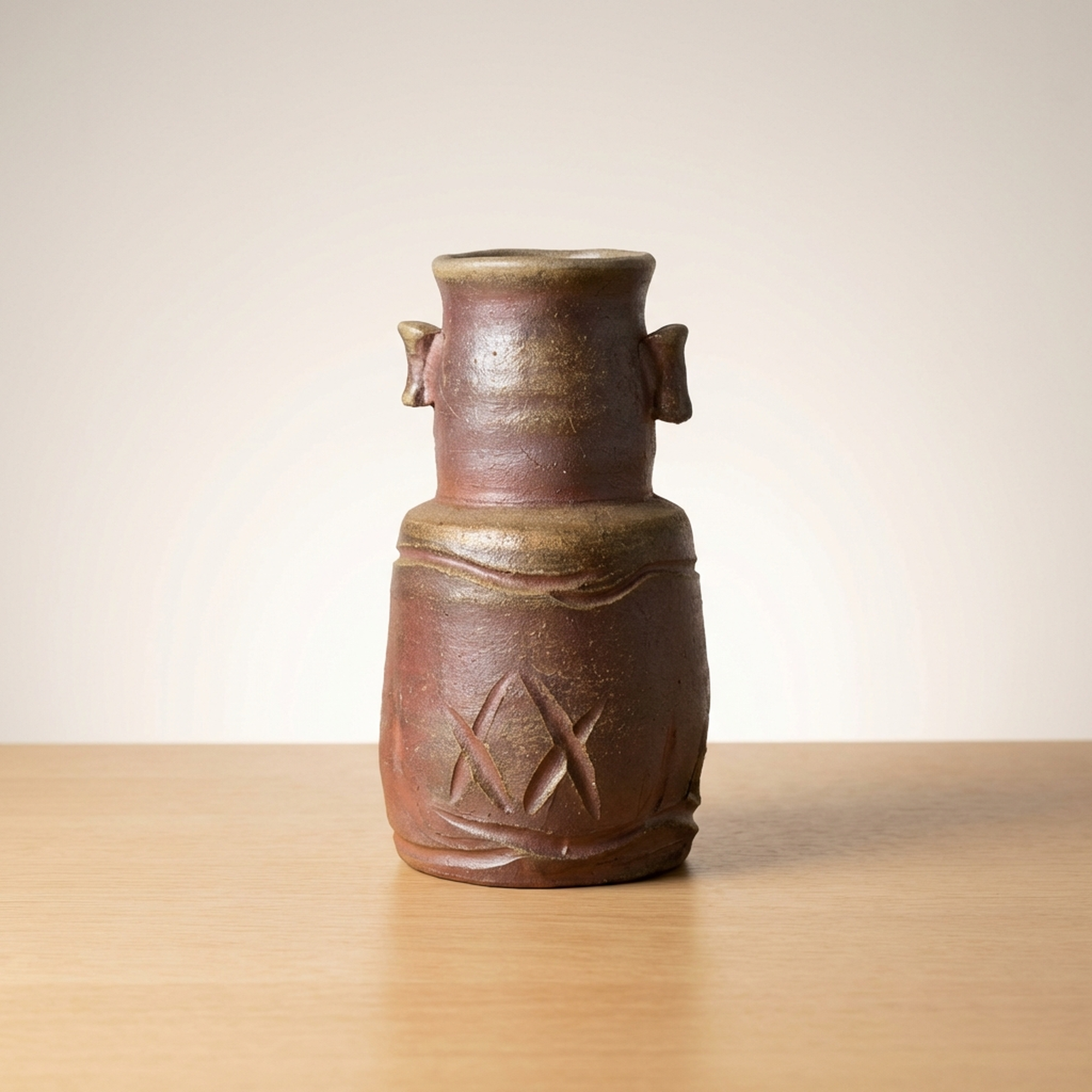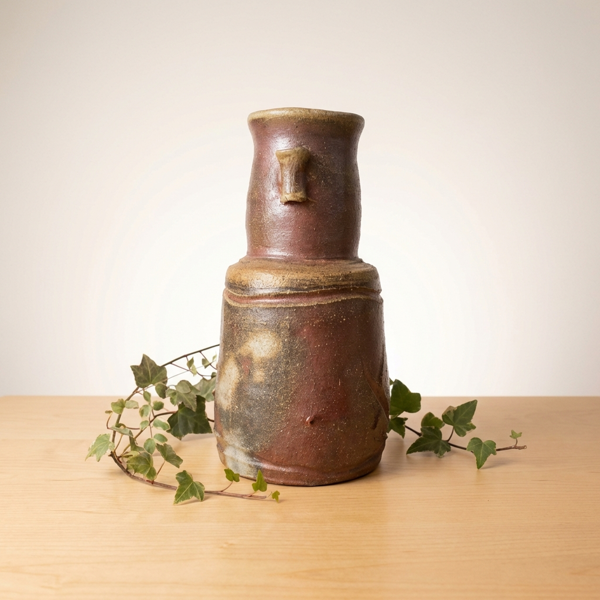 Isezaki Mitsuru Bizen Ware Eared Flower Vase, Decorative Japanese Stoneware Vessel