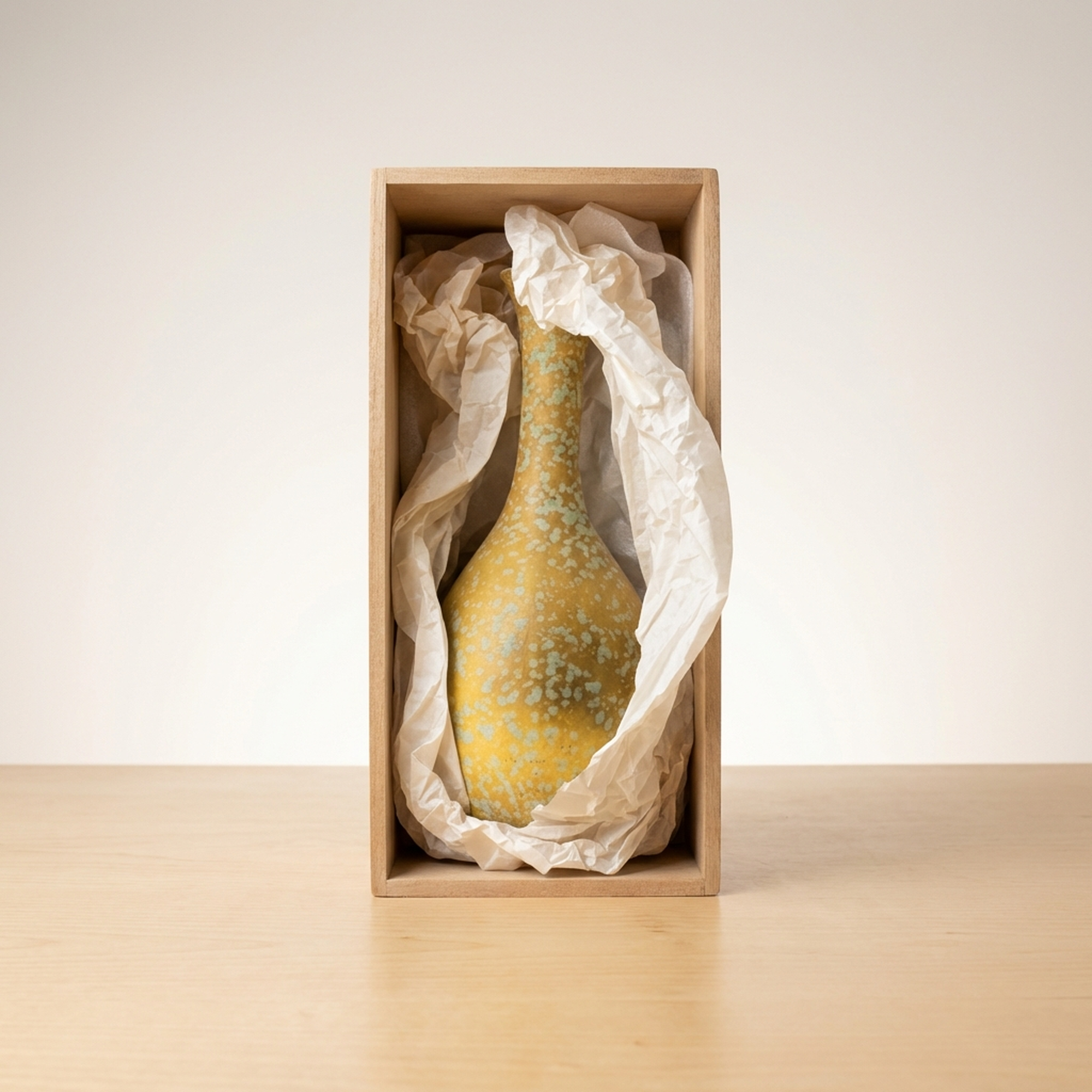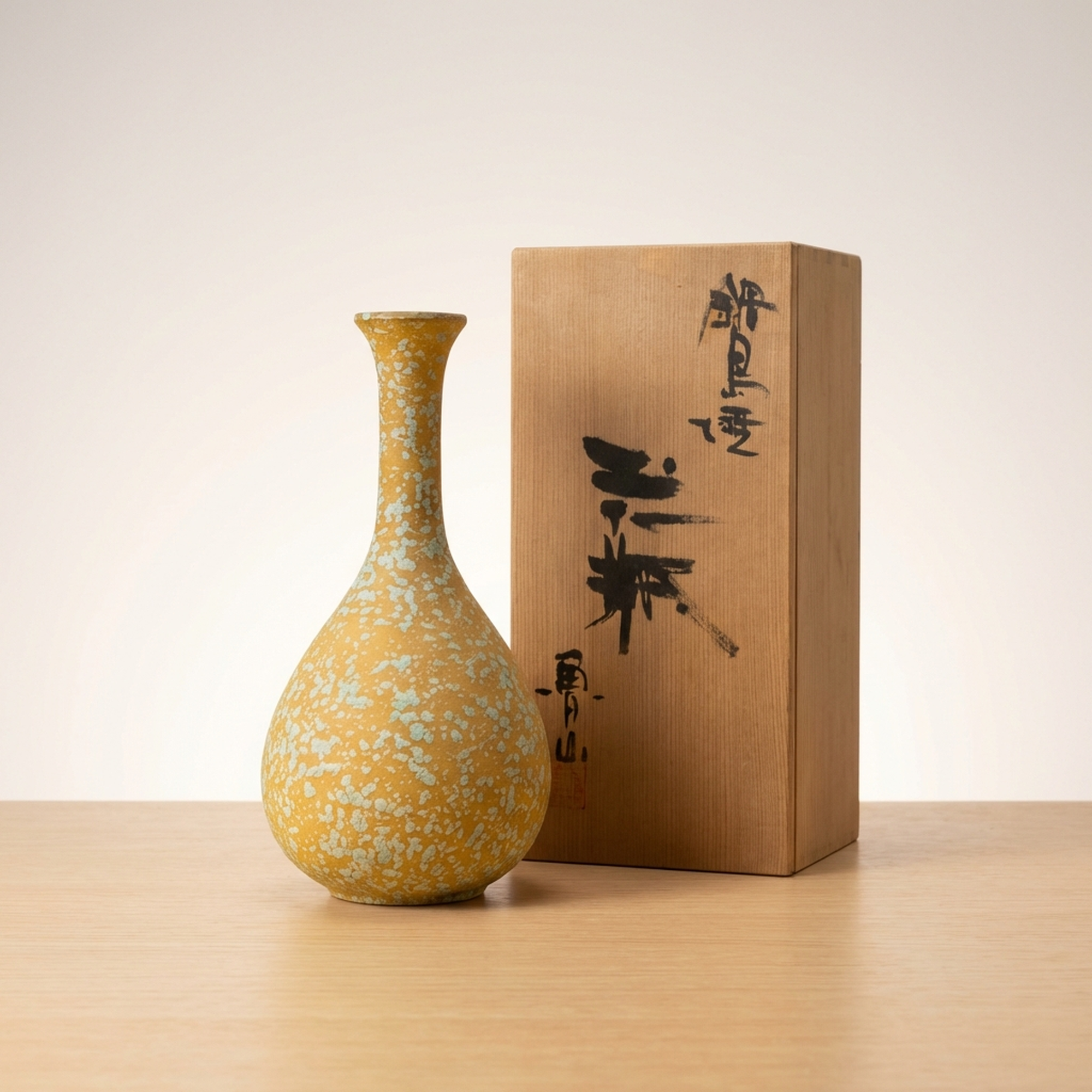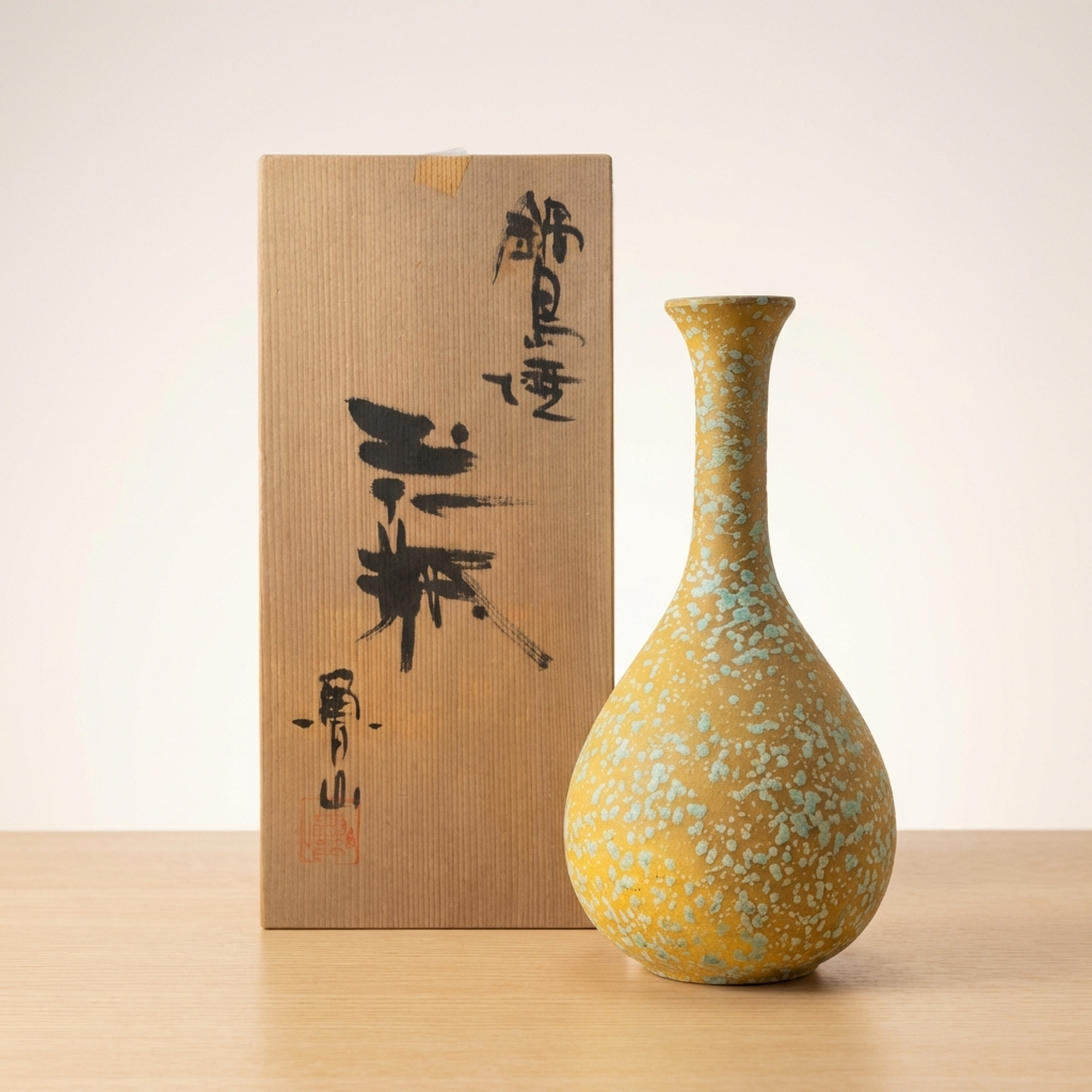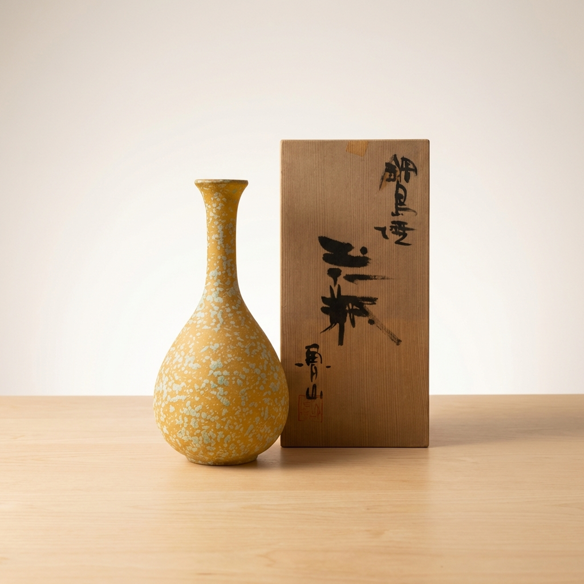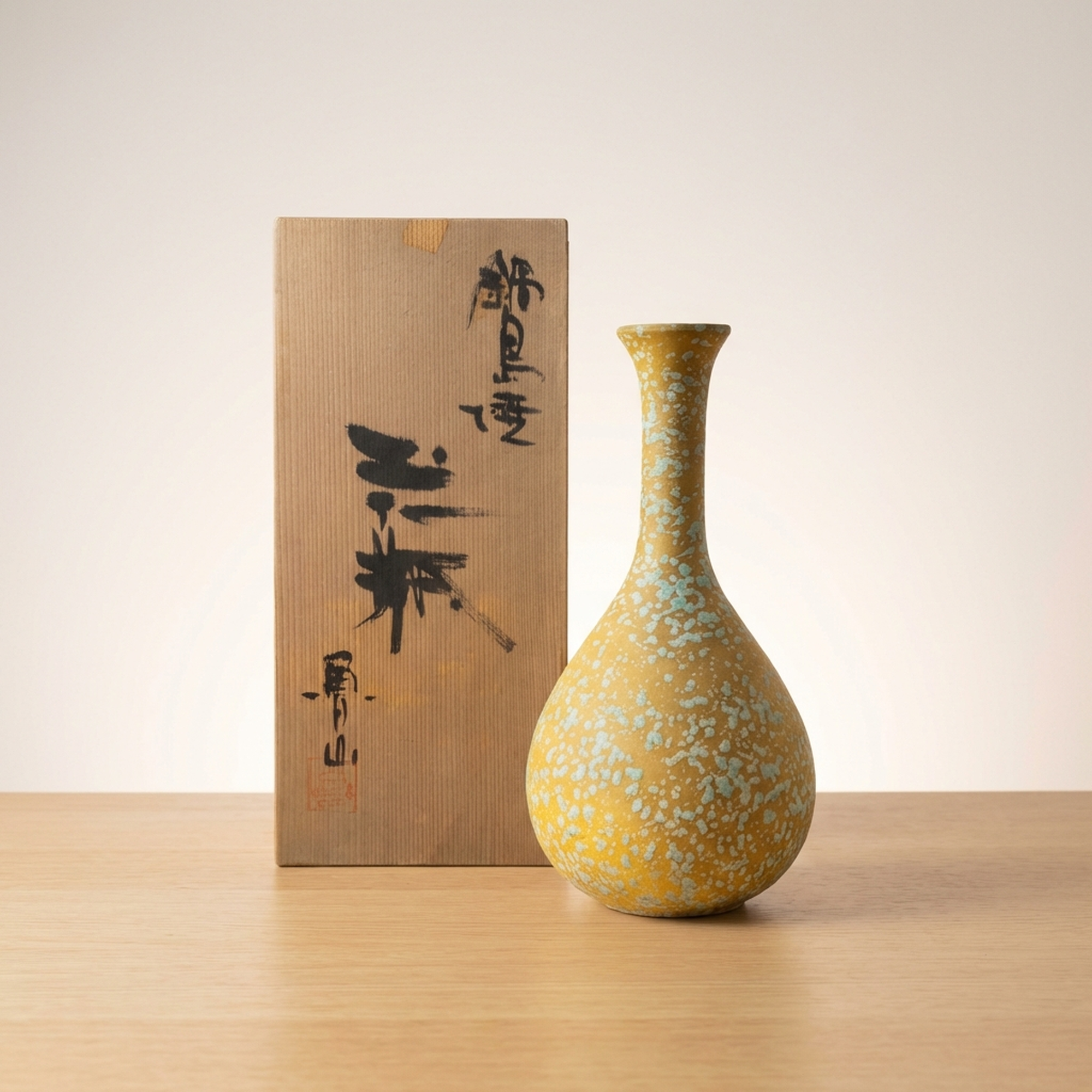 <p>Maker / Brand: Tozan Title of Work: Nabeshima-yaki Ceramic Vase with Yellow and Light Blue Speckled Pattern, with Dedicated Box, by Tozan, for Ikebana and more</p> <p>This exquisite Nabeshima-yaki ceramic vase, crafted by the artist Tozan, presents a striking blend of traditional Japanese artistry and vibrant design. Featuring a distinctive speckled pattern in warm yellow and refreshing light blue, its elegant form with a slender neck is perfectly suited for showcasing fresh flowers, especially in the art of ikebana. This piece comes complete with its dedicated storage box, affirming its authenticity and quality.</p> <p>Artistic & Cultural Background Nabeshima-yaki refers to the highly esteemed porcelain and ceramic ware produced in the Saga Prefecture, historically under the patronage of the Nabeshima clan during the Edo period. Originally created exclusively for the shogun, imperial court, and feudal lords, Nabeshima ware is renowned for its exceptional craftsmanship, refined aesthetics, and precise decorative techniques. While historically porcelain, the term is also used for high-quality ceramics from the region, embodying a legacy of careful artistry.</p> <p>Design & Technique The vase's surface is adorned with a charming speckled pattern, a dynamic interplay of sunny yellow and serene light blue hues. This "hanten moyou" (speckled pattern) technique creates a lively yet harmonious visual texture across the ceramic body. The colors are applied with a delicate touch, resulting in a unique, organic appearance that catches the eye without overwhelming the senses, celebrating the natural beauty of the ceramic material.</p> <p>Form & Aesthetic Qualities * <strong>Shape:</strong> An elegant silhouette featuring a gracefully elongated neck that tapers gently from a full, rounded body, providing a stable base and a refined opening for floral arrangements. * <strong>Texture:</strong> Crafted from fine ceramic, the vase offers a tactile experience that complements its visual appeal, inviting touch with its smooth yet subtly textured surface. * <strong>Visual Appeal:</strong> The vibrant yellow base punctuated by cool light blue speckles creates a striking contrast and a cheerful, inviting presence, evoking a sense of natural beauty and artistic spontaneity.</p> <p>Collector & Decorative Appeal * <strong>Authenticity & Provenance:</strong> A genuine Nabeshima-yaki piece by the artist Tozan, accompanied by its original dedicated box, ensures its authenticity and makes it a valuable addition to any collection. * <strong>Versatile Display:</strong> Ideal for traditional ikebana arrangements, its unique design also allows it to stand alone as a striking decorative object, enhancing any interior space with its artistic charm. * <strong>Artistic Statement:</strong> This vase serves as a beautiful representation of Japanese ceramic artistry, offering a touch of refined elegance and a splash of cheerful color to both contemporary and classic decor.</p> <p>This exquisite vase is a perfect acquisition for collectors and decorators who appreciate the subtle beauty and rich heritage of Japanese traditional crafts.</p> <h3>Details</h3> <table style="border-collapse:collapse;width:100%"><tr><td style="padding:4px 12px 4px 0;font-weight:bold;white-space:nowrap">Condition</td><td style="padding:4px 0">Excellent</td></tr><tr><td style="padding:4px 12px 4px 0;font-weight:bold;white-space:nowrap">Material</td><td style="padding:4px 0">Ceramic</td></tr><tr><td style="padding:4px 12px 4px 0;font-weight:bold;white-space:nowrap">Era</td><td style="padding:4px 0">Unknown</td></tr><tr><td style="padding:4px 12px 4px 0;font-weight:bold;white-space:nowrap">Dimensions</td><td style="padding:4px 0">高さ24cm / 横13cm / 大きさ 縦29.5cm</td></tr></table>