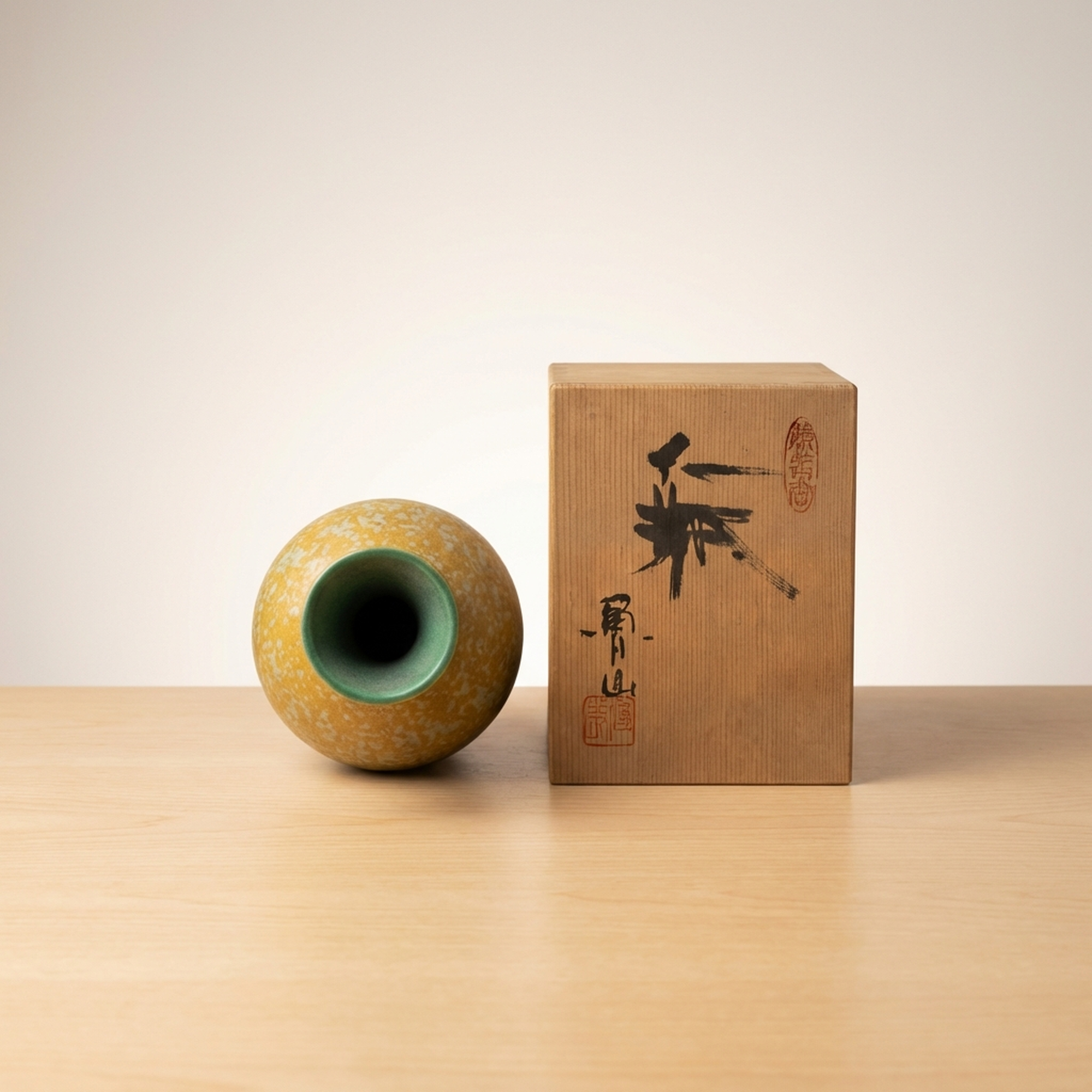 Nabeshima-yaki Ceramic Vase by Tozan, Yellow & Light Blue Spotted, Original Box