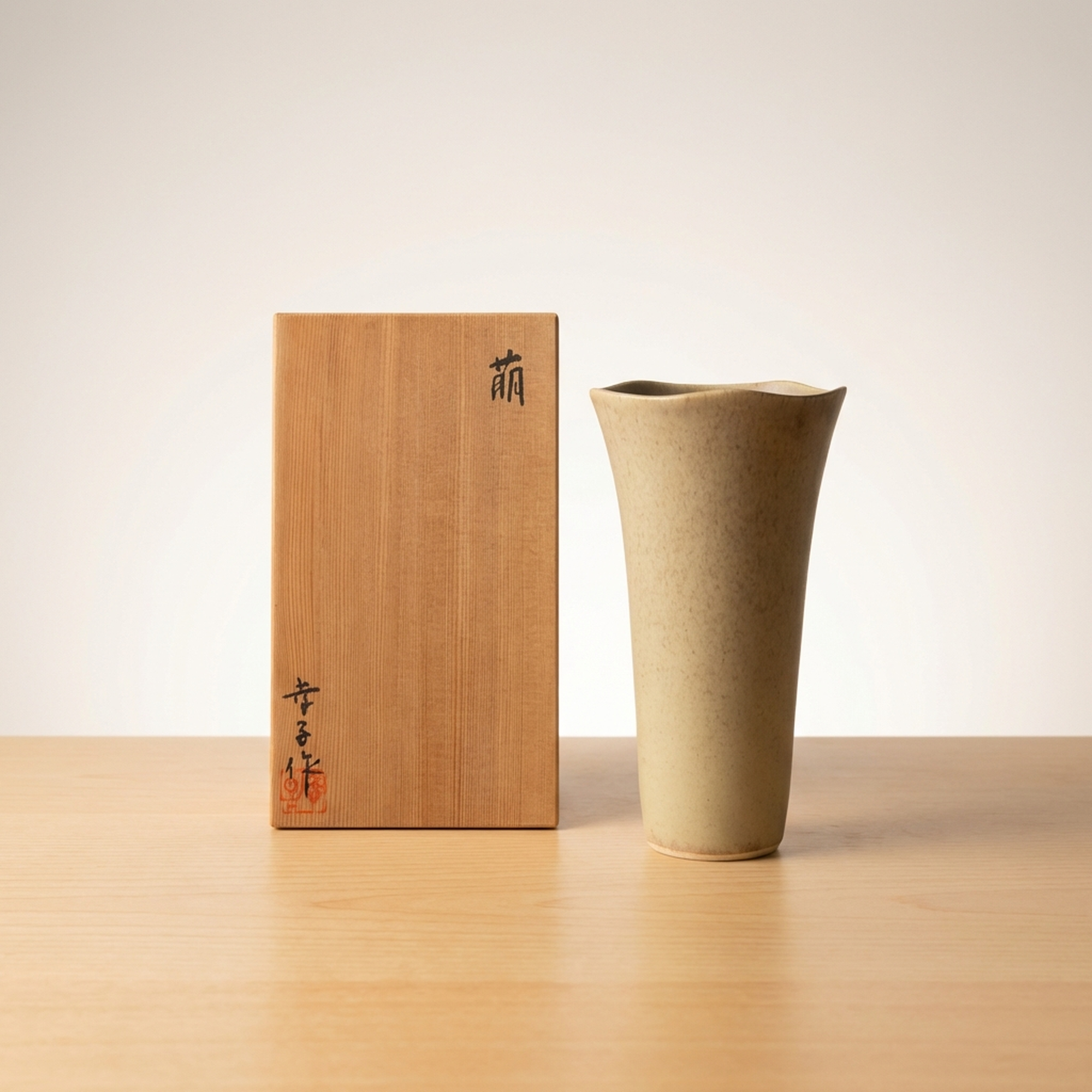 Sakagami Sachiko Handcrafted Moe Ceramic Flower Vase with Original Signed Wooden Box and Artist Bio