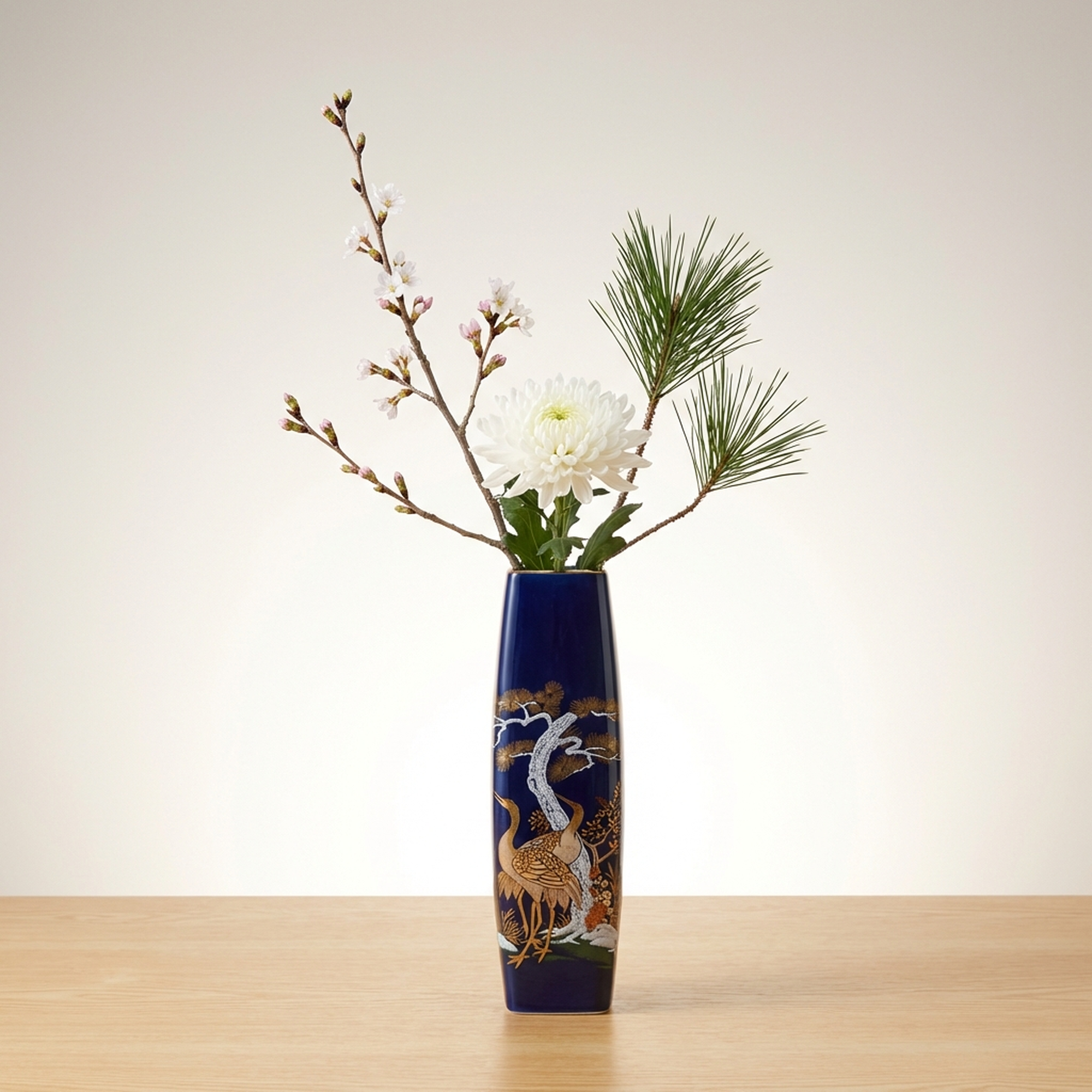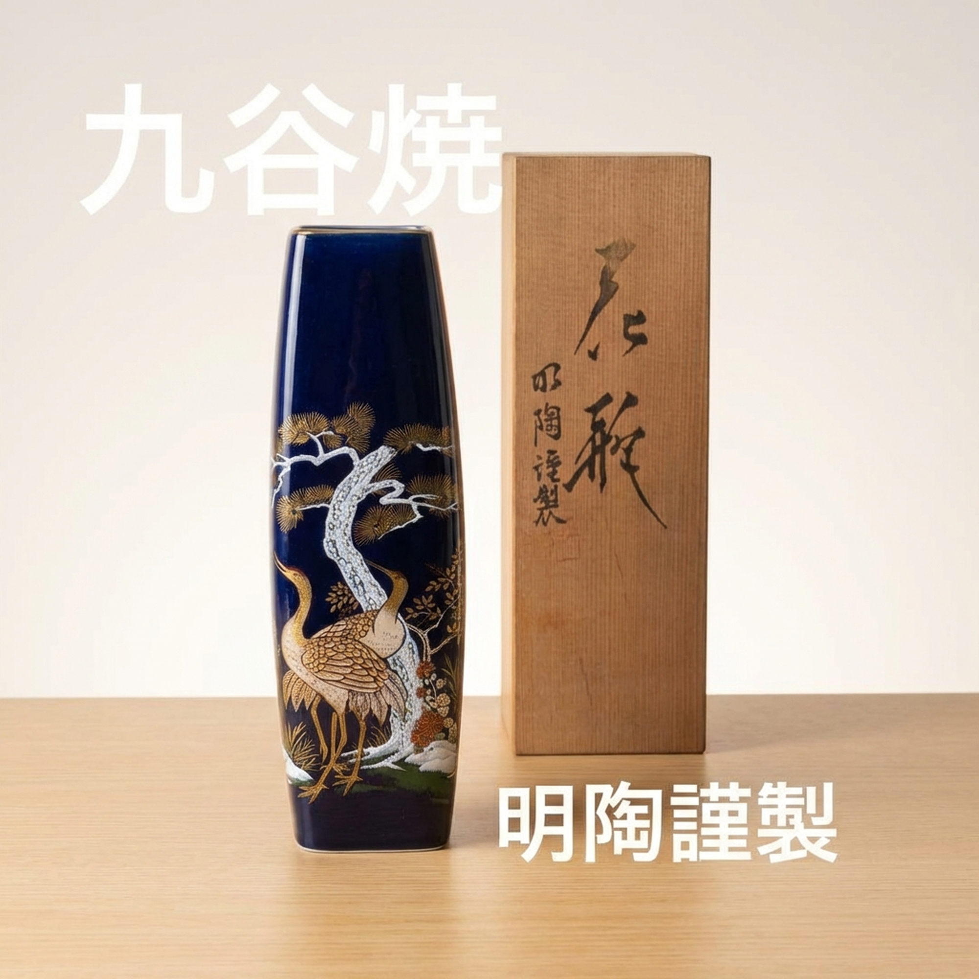 九谷焼 明陶謹製 青色の鶴と松の陶器花瓶 フラベース 一輪挿し 花器
