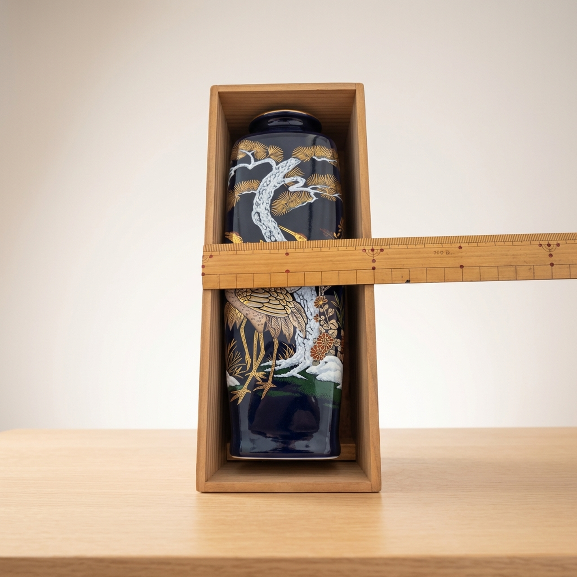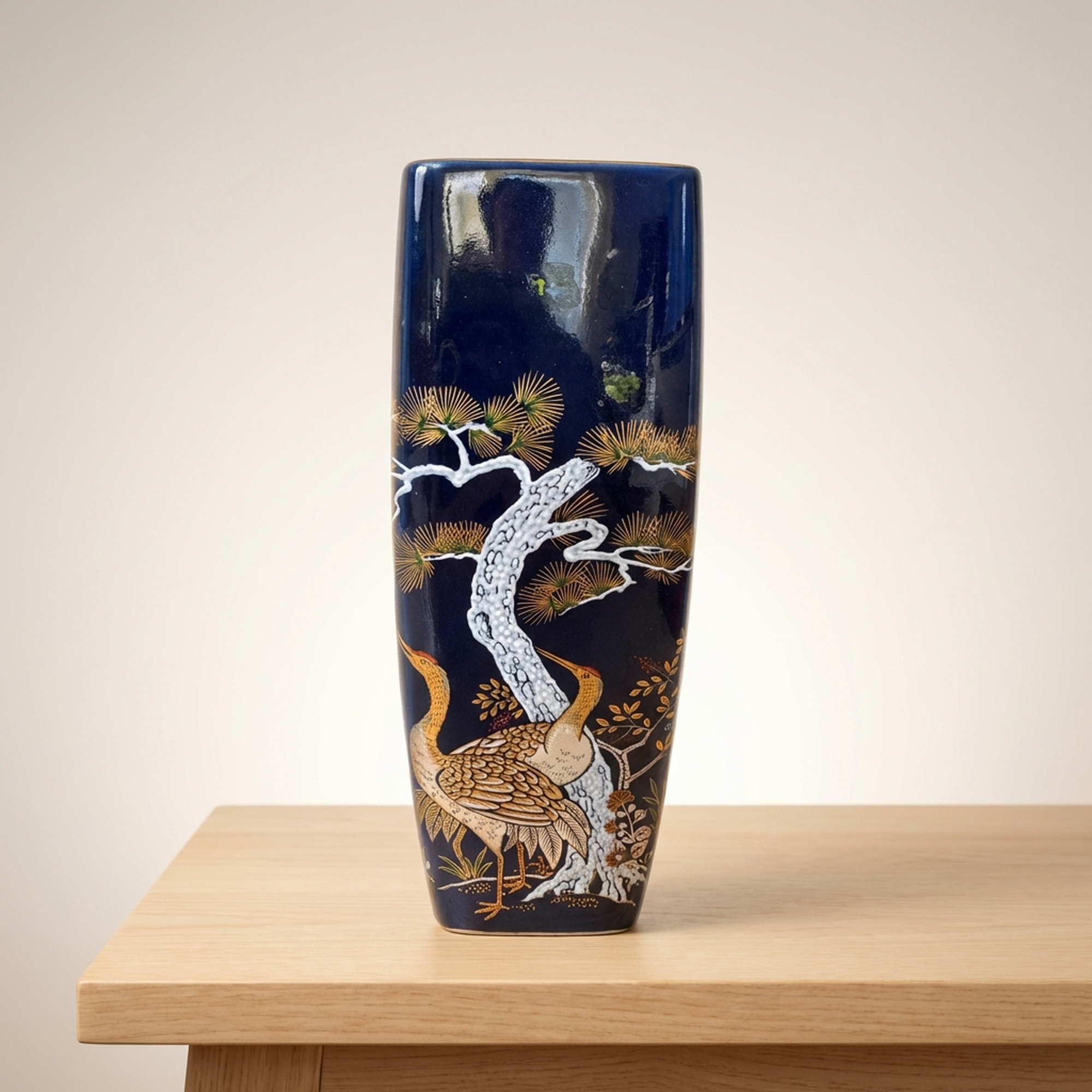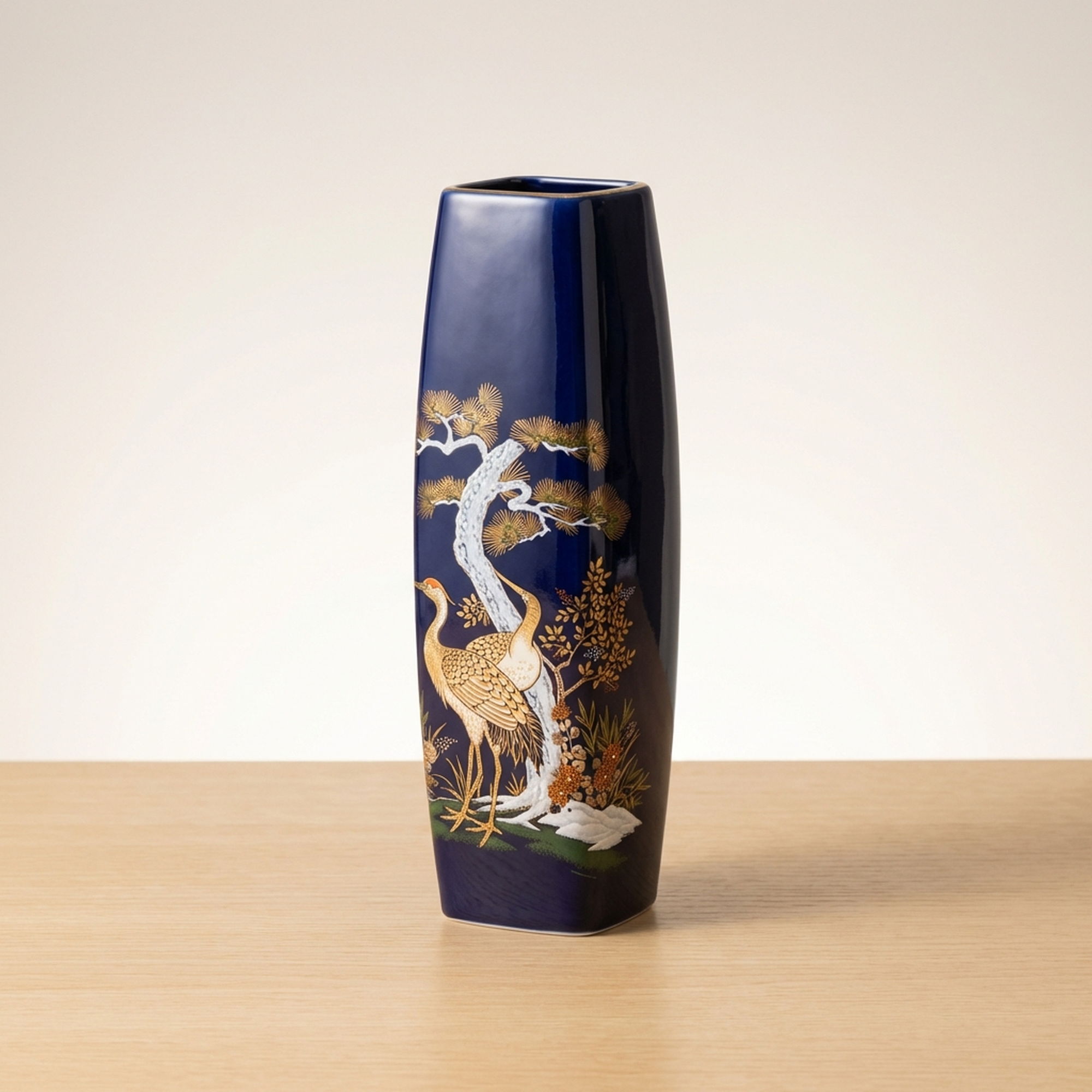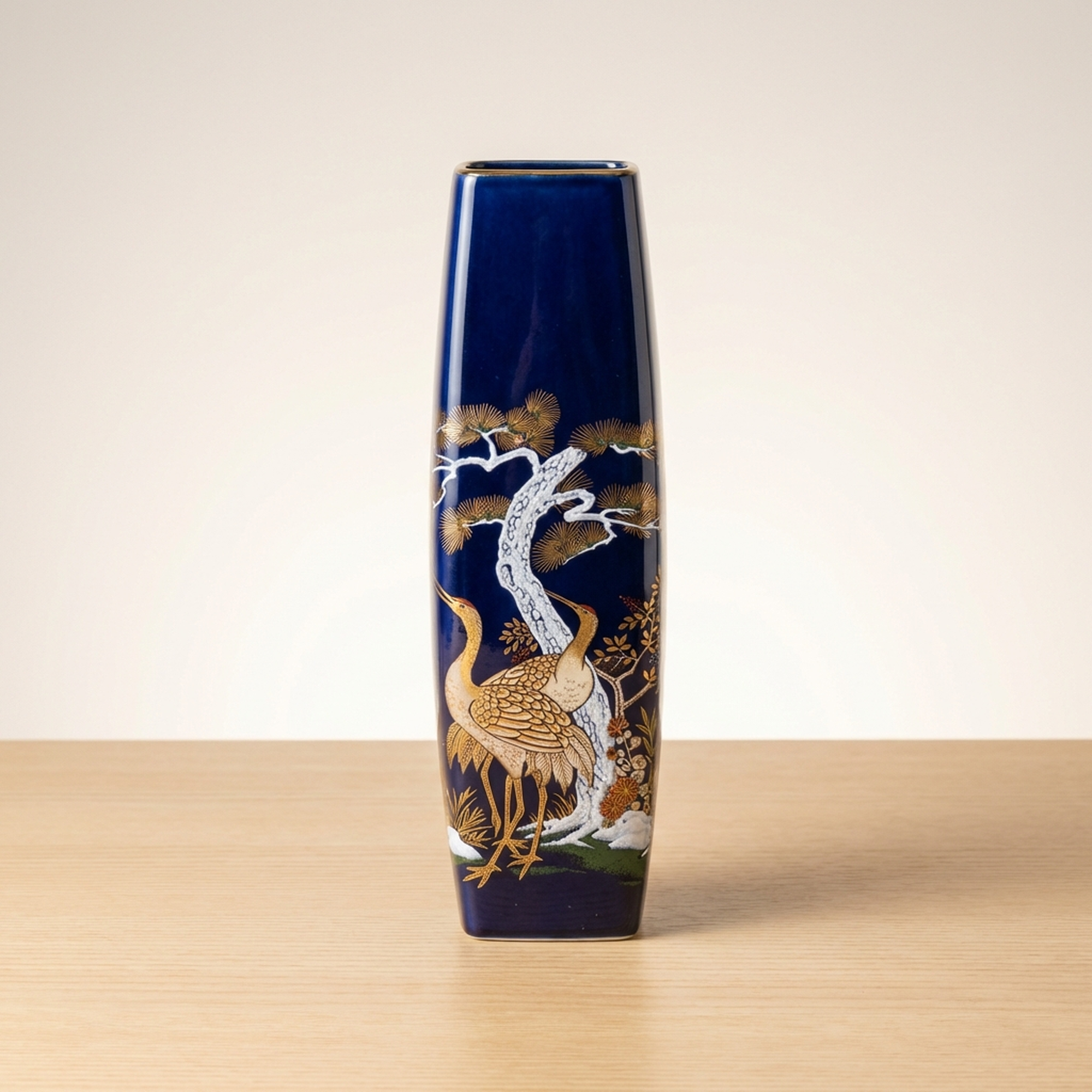 <p>Maker / Brand: Meito Title of Work: Kutani Ware Meito Kinsei Blue Crane and Pine Ceramic Vase</p> <p>Discover a striking piece of Japanese artistry with this exquisite Kutani ware ceramic vase, carefully crafted by Meito. Adorned with a striking motif of golden and white cranes amidst pine trees on a deep blue glaze, this unused vessel is a example to traditional Japanese aesthetics. While the vase itself is pristine, its original storage box shows some signs of wear from careful keeping.</p> <p>Artistic & Cultural Background Kutani ware, originating from Ishikawa Prefecture, is celebrated for its vibrant overglaze enamels and detailed designs. The crane (tsuru) and pine (matsu) are deeply auspicious symbols in Japanese culture, representing longevity, good fortune, and steadfastness, making this vase not just a decorative item but a bearer of positive symbolism.</p> <p>Design & Technique This vase features a rich, deep blue glaze that provides a dramatic backdrop for the hand-painted decoration. The design showcases elegant cranes rendered in shimmering gold and crisp white, gracefully positioned among detailed pine branches, also highlighted with golden accents. This detailed overglaze enamel work is characteristic of Kutani ware, demonstrating the artisan's skill in bringing these traditional motifs to life.</p> <p>Form & Aesthetic Qualities * <strong>Shape:</strong> A tall, slender square-form vase, designed to elegantly hold a single bloom or stand as a minimalist sculptural piece. * <strong>Texture:</strong> The smooth, glossy ceramic surface, achieved through expert glazing, invites a tactile appreciation of its refined finish. * <strong>Visual Appeal:</strong> The striking contrast between the deep blue ground and the lustrous gold and pure white motifs creates a visually arresting piece that exudes both tranquility and opulence.</p> <p>Collector & Decorative Appeal * <strong>Symbolic Beauty:</strong> Embodying wishes for longevity and good fortune, this vase makes a meaningful gift or a cherished personal acquisition. * <strong>Kutani Craftsmanship:</strong> A fine example of Meito's dedication to the renowned Kutani tradition, showcasing distinctive artistry and quality. * <strong>Versatile Display:</strong> Perfect for enhancing a minimalist interior with a single flower or as a standalone decorative object, adding a touch of timeless Japanese elegance to any space.</p> <p>This piece is an ideal acquisition for collectors of fine Japanese ceramics or those seeking a decorative item with profound cultural resonance.</p> <h3>Details</h3> <table style="border-collapse:collapse;width:100%"><tr><td style="padding:4px 12px 4px 0;font-weight:bold;white-space:nowrap">Condition</td><td style="padding:4px 0">Excellent</td></tr><tr><td style="padding:4px 12px 4px 0;font-weight:bold;white-space:nowrap">Origin</td><td style="padding:4px 0">Kutani, Ishikawa</td></tr><tr><td style="padding:4px 12px 4px 0;font-weight:bold;white-space:nowrap">Material</td><td style="padding:4px 0">Ceramic</td></tr><tr><td style="padding:4px 12px 4px 0;font-weight:bold;white-space:nowrap">Era</td><td style="padding:4px 0">Unknown</td></tr></table>
