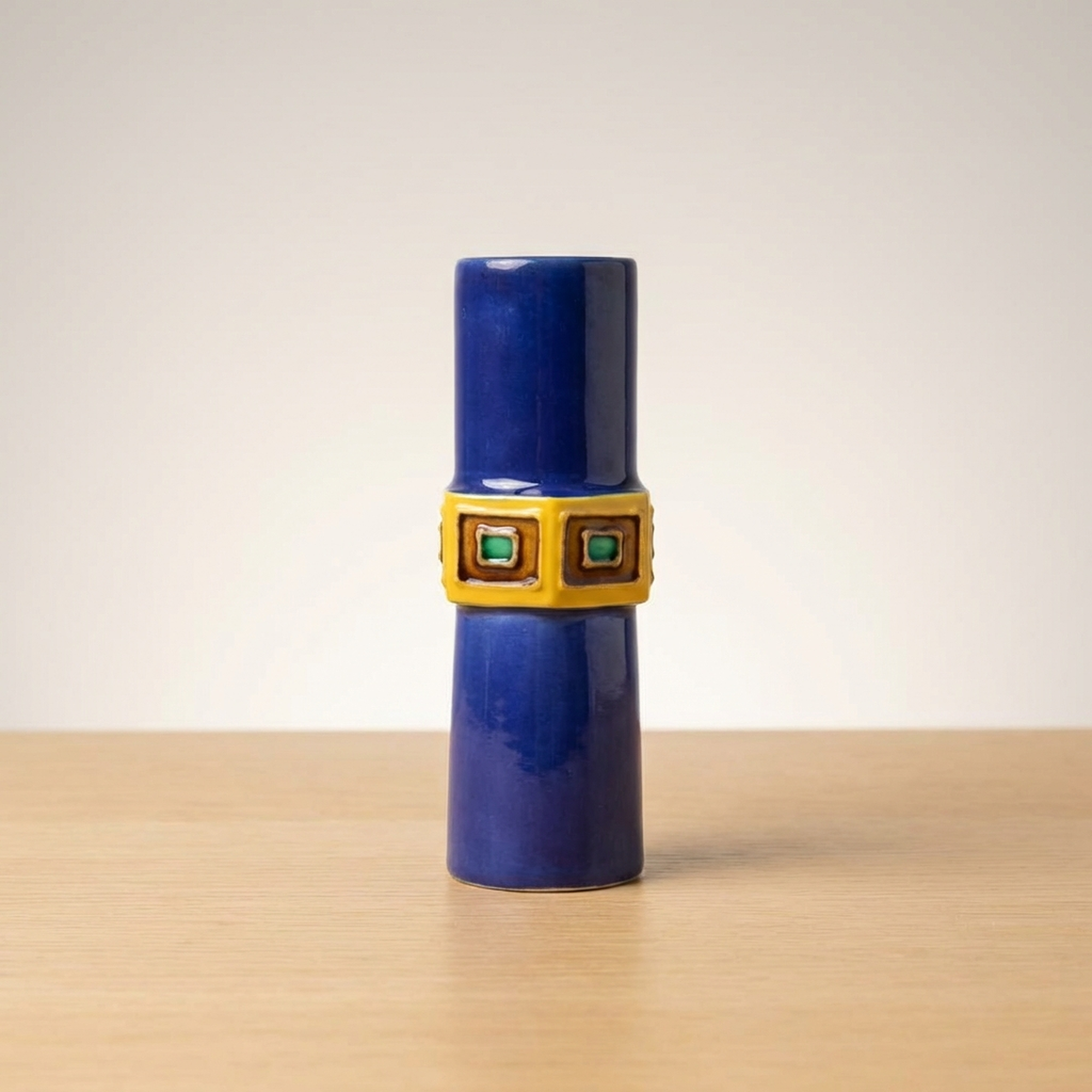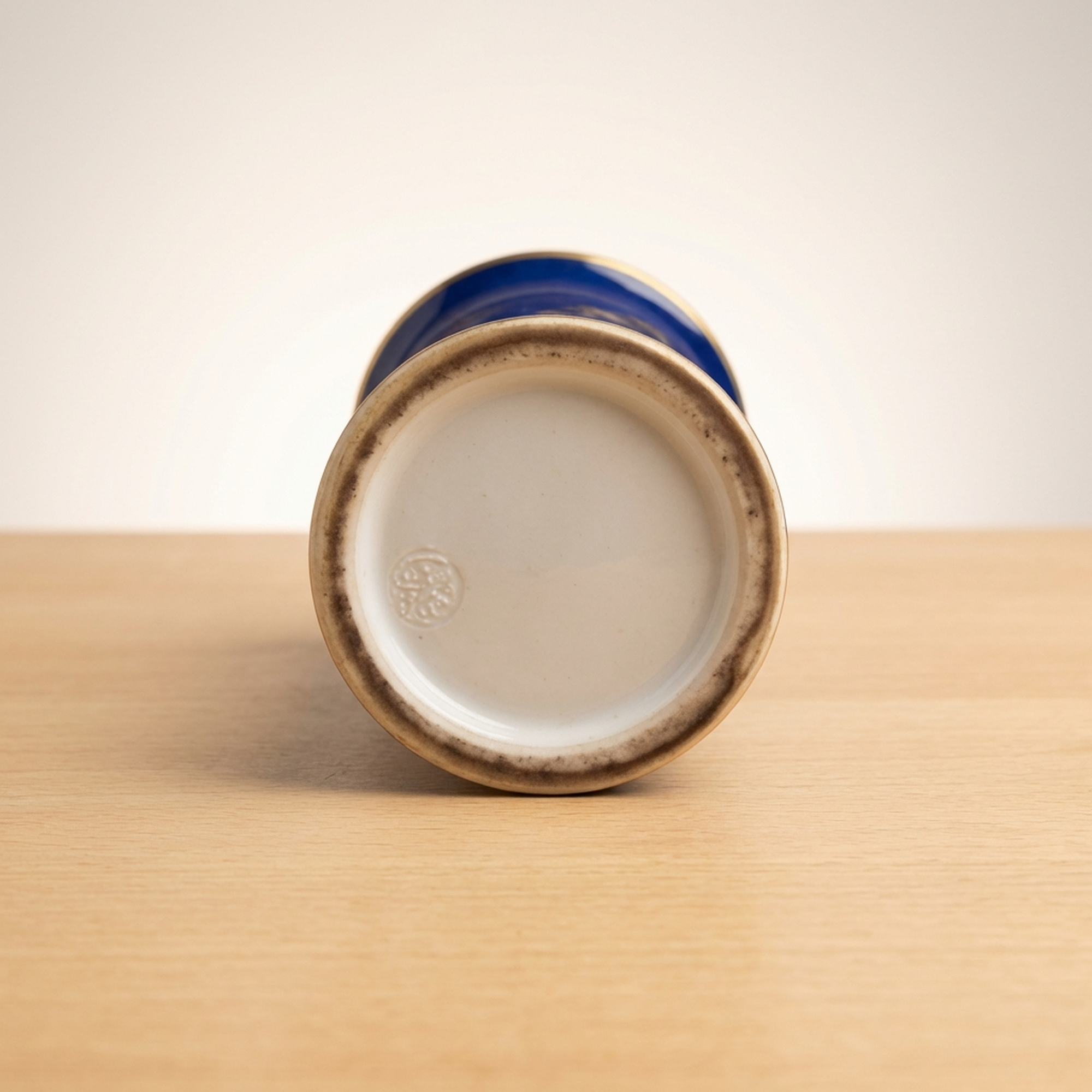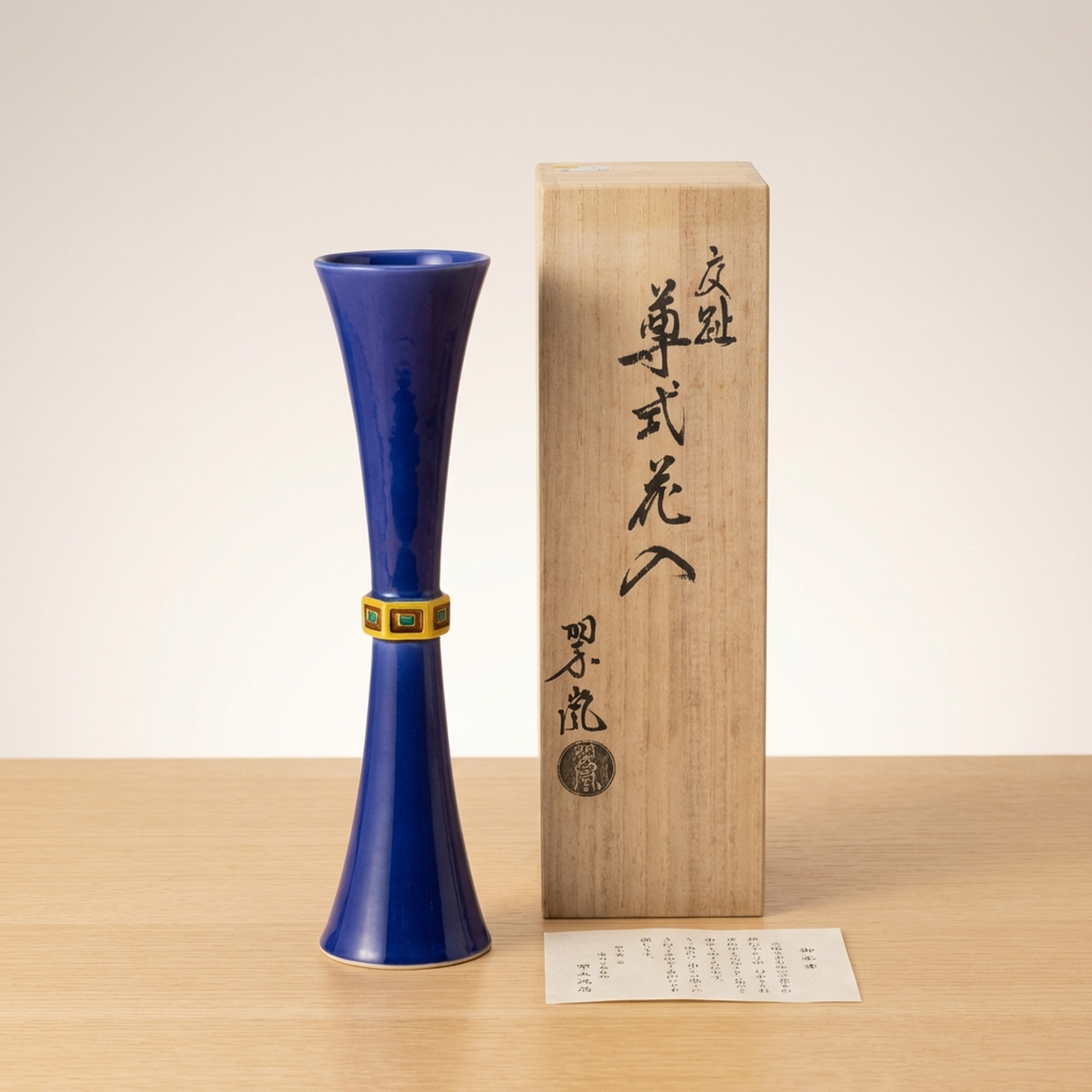 <p>Maker / Brand: Nakamura Suiran Title of Work: Kochi-yaki Sonshiki Hanaire Vase</p> <p>Crafted by the renowned artist Nakamura Suiran, this exquisite Kochi-yaki vase features a striking cobalt blue glaze. Its elegant Sonshiki form, a classic shape inspired by ancient ritual vessels, showcases refined artistry. The vase comes with its original wooden storage box (kyobako), though one slat of the box is missing.</p> <p>Artistic & Cultural Background Kochi-yaki, or Kouchi-yaki, is a distinctive style of Japanese ceramics known for its rich, often monochrome or multi-colored lead glazes. Originating from Chinese Jiaozhi ware, this technique was embraced and refined in Japan, particularly from the Edo period onwards, finding favor in tea ceremonies and as decorative art.</p> <p>Design & Technique The vase features a deep, brilliant blue glaze that envelops its entire surface, creating mesmerizing visual depth. This vibrant hue is characteristic of Kochi-yaki's lead-based glazes. A subtle yet impactful decorative band encircles the slender waist, adorned with small, contrasting geometric panels in shades of green and yellow, providing a delightful focal point and detailed detail.</p> <p>Form & Aesthetic Qualities * <strong>Elegant Sonshiki Form:</strong> A gracefully proportioned, hourglass-like silhouette, flaring gently at the mouth and base, evoking a sense of timeless dignity and balance. * <strong>Vibrant Cobalt Hue:</strong> The rich, saturated blue glaze offers a powerful visual statement, reflecting light with a striking sheen. * <strong>Subtle Geometric Accents:</strong> A contrasting central band with delicate, colorful square motifs adds an unexpected layer of detail and visual interest.</p> <p>Collector & Decorative Appeal * <strong>Master Craftsmanship:</strong> A piece by Nakamura Suiran, a respected name in Japanese ceramics, ensuring exceptional quality and artistic integrity. * <strong>Distinctive Kochi-yaki Aesthetic:</strong> An excellent example of this vibrant ceramic tradition, appealing to collectors seeking bold color and historical technique. * <strong>Versatile Display Piece:</strong> Perfect for showcasing a single flower arrangement or standing alone as a sculptural art object in both traditional and contemporary interiors.</p> <p>This Nakamura Suiran Kochi-yaki vase is an ideal acquisition for knowledgeable collectors who appreciate the fusion of traditional Japanese artistry with a vivid, expressive palette.</p> <h3>Details</h3> <table style="border-collapse:collapse;width:100%"><tr><td style="padding:4px 12px 4px 0;font-weight:bold;white-space:nowrap">Condition</td><td style="padding:4px 0">Good</td></tr><tr><td style="padding:4px 12px 4px 0;font-weight:bold;white-space:nowrap">Material</td><td style="padding:4px 0">Wood</td></tr><tr><td style="padding:4px 12px 4px 0;font-weight:bold;white-space:nowrap">Era</td><td style="padding:4px 0">Unknown</td></tr></table>