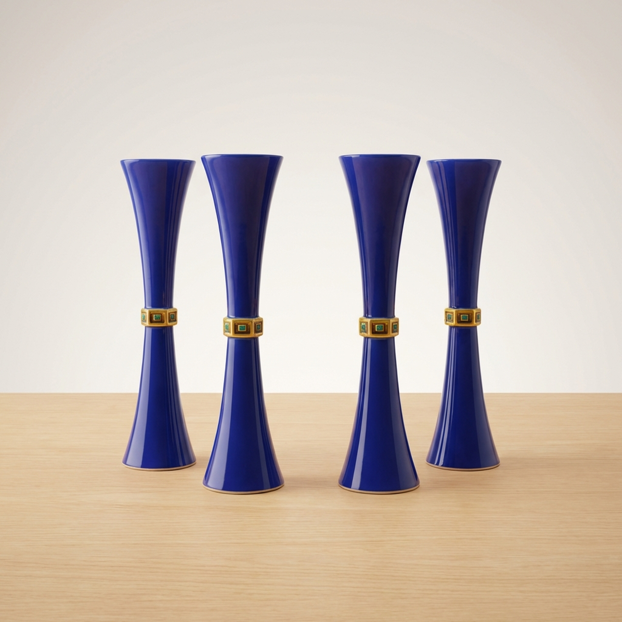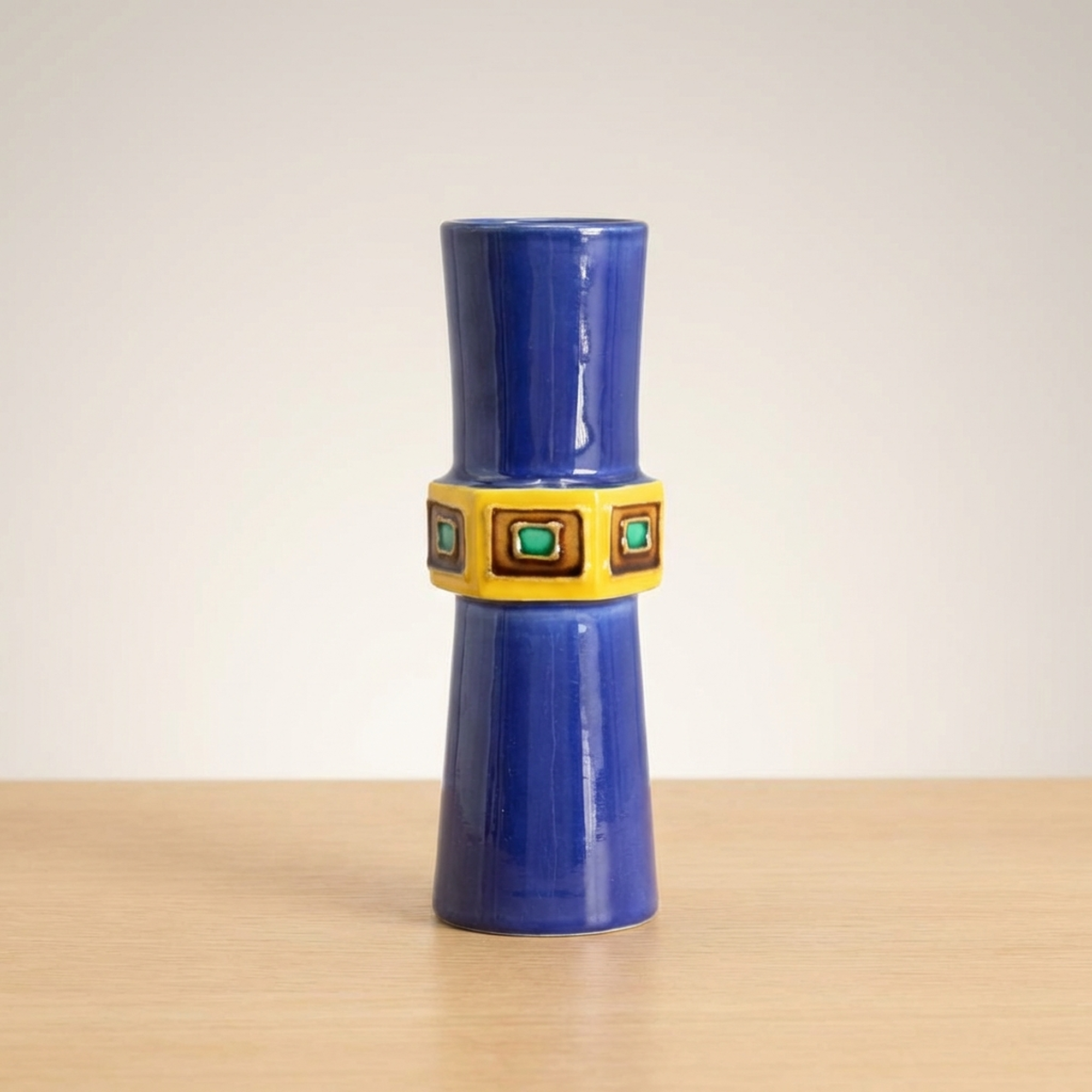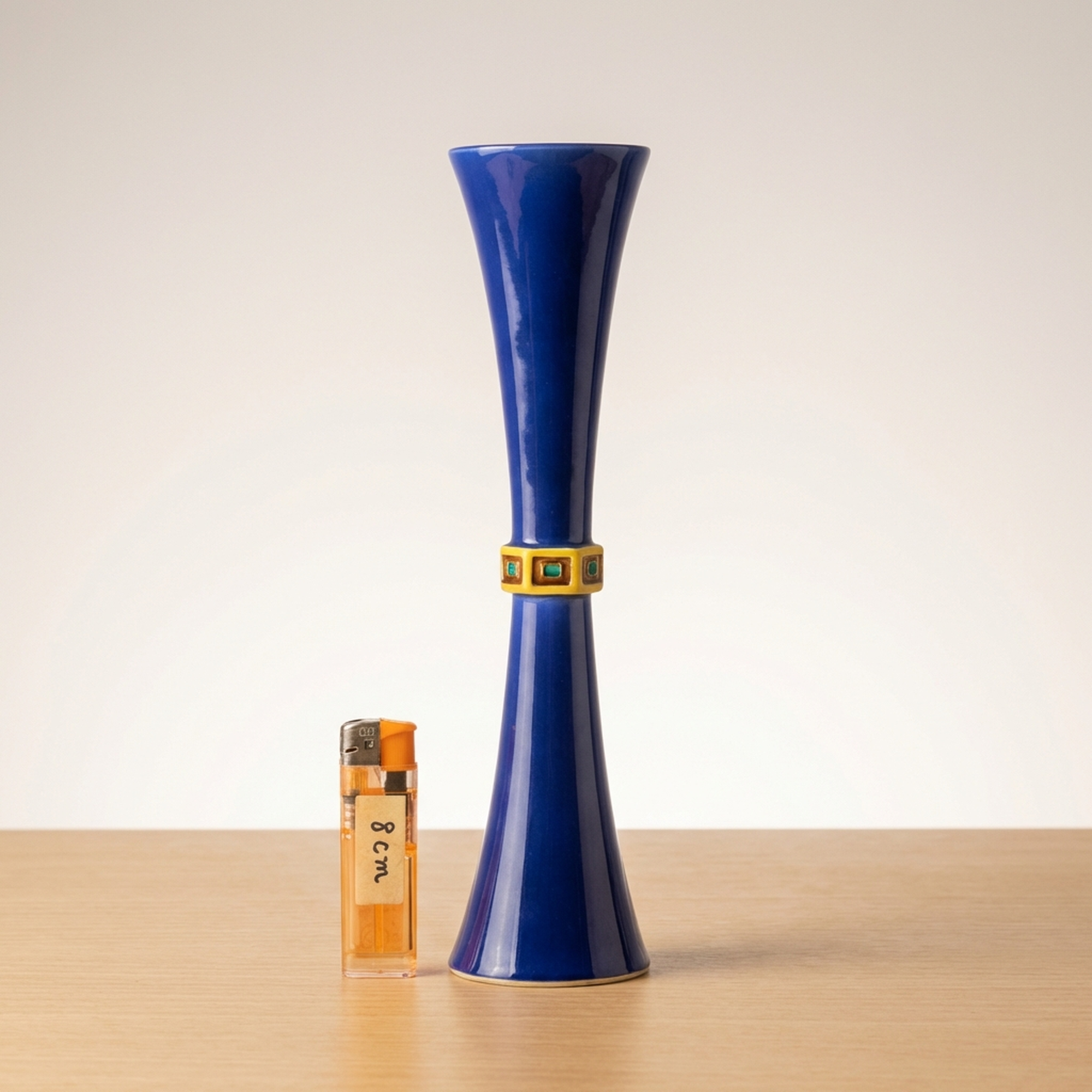 <p>Maker / Brand: Nakamura Suiran Title of Work: Kochi-yaki Sonshiki Hanaire Vase</p> <p>Crafted by the renowned artist Nakamura Suiran, this exquisite Kochi-yaki vase features a striking cobalt blue glaze. Its elegant Sonshiki form, a classic shape inspired by ancient ritual vessels, showcases refined artistry. The vase comes with its original wooden storage box (kyobako), though one slat of the box is missing.</p> <p>Artistic & Cultural Background Kochi-yaki, or Kouchi-yaki, is a distinctive style of Japanese ceramics known for its rich, often monochrome or multi-colored lead glazes. Originating from Chinese Jiaozhi ware, this technique was embraced and refined in Japan, particularly from the Edo period onwards, finding favor in tea ceremonies and as decorative art.</p> <p>Design & Technique The vase features a deep, brilliant blue glaze that envelops its entire surface, creating mesmerizing visual depth. This vibrant hue is characteristic of Kochi-yaki's lead-based glazes. A subtle yet impactful decorative band encircles the slender waist, adorned with small, contrasting geometric panels in shades of green and yellow, providing a delightful focal point and detailed detail.</p> <p>Form & Aesthetic Qualities * <strong>Elegant Sonshiki Form:</strong> A gracefully proportioned, hourglass-like silhouette, flaring gently at the mouth and base, evoking a sense of timeless dignity and balance. * <strong>Vibrant Cobalt Hue:</strong> The rich, saturated blue glaze offers a powerful visual statement, reflecting light with a striking sheen. * <strong>Subtle Geometric Accents:</strong> A contrasting central band with delicate, colorful square motifs adds an unexpected layer of detail and visual interest.</p> <p>Collector & Decorative Appeal * <strong>Master Craftsmanship:</strong> A piece by Nakamura Suiran, a respected name in Japanese ceramics, ensuring exceptional quality and artistic integrity. * <strong>Distinctive Kochi-yaki Aesthetic:</strong> An excellent example of this vibrant ceramic tradition, appealing to collectors seeking bold color and historical technique. * <strong>Versatile Display Piece:</strong> Perfect for showcasing a single flower arrangement or standing alone as a sculptural art object in both traditional and contemporary interiors.</p> <p>This Nakamura Suiran Kochi-yaki vase is an ideal acquisition for knowledgeable collectors who appreciate the fusion of traditional Japanese artistry with a vivid, expressive palette.</p> <h3>Details</h3> <table style="border-collapse:collapse;width:100%"><tr><td style="padding:4px 12px 4px 0;font-weight:bold;white-space:nowrap">Condition</td><td style="padding:4px 0">Good</td></tr><tr><td style="padding:4px 12px 4px 0;font-weight:bold;white-space:nowrap">Material</td><td style="padding:4px 0">Wood</td></tr><tr><td style="padding:4px 12px 4px 0;font-weight:bold;white-space:nowrap">Era</td><td style="padding:4px 0">Unknown</td></tr></table>