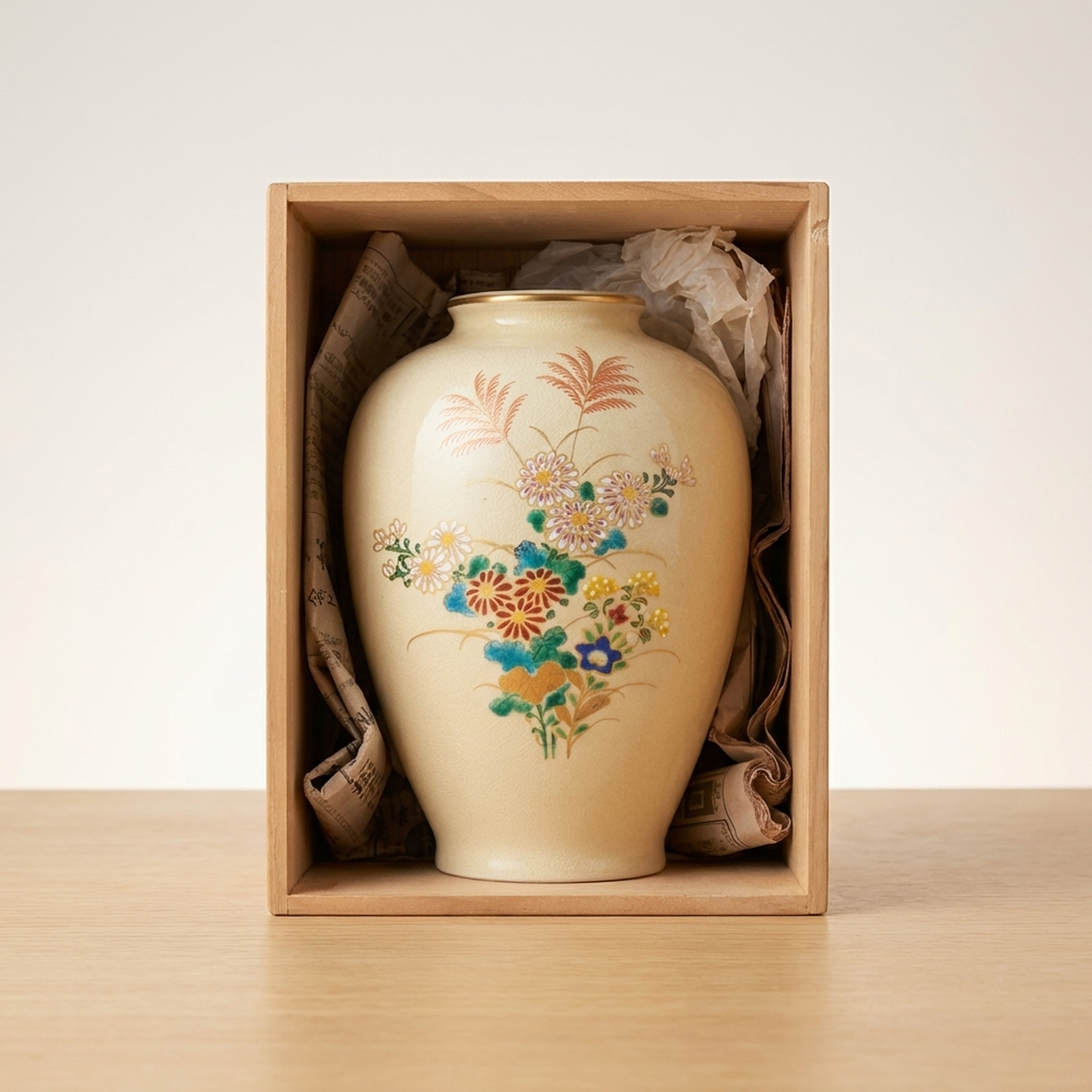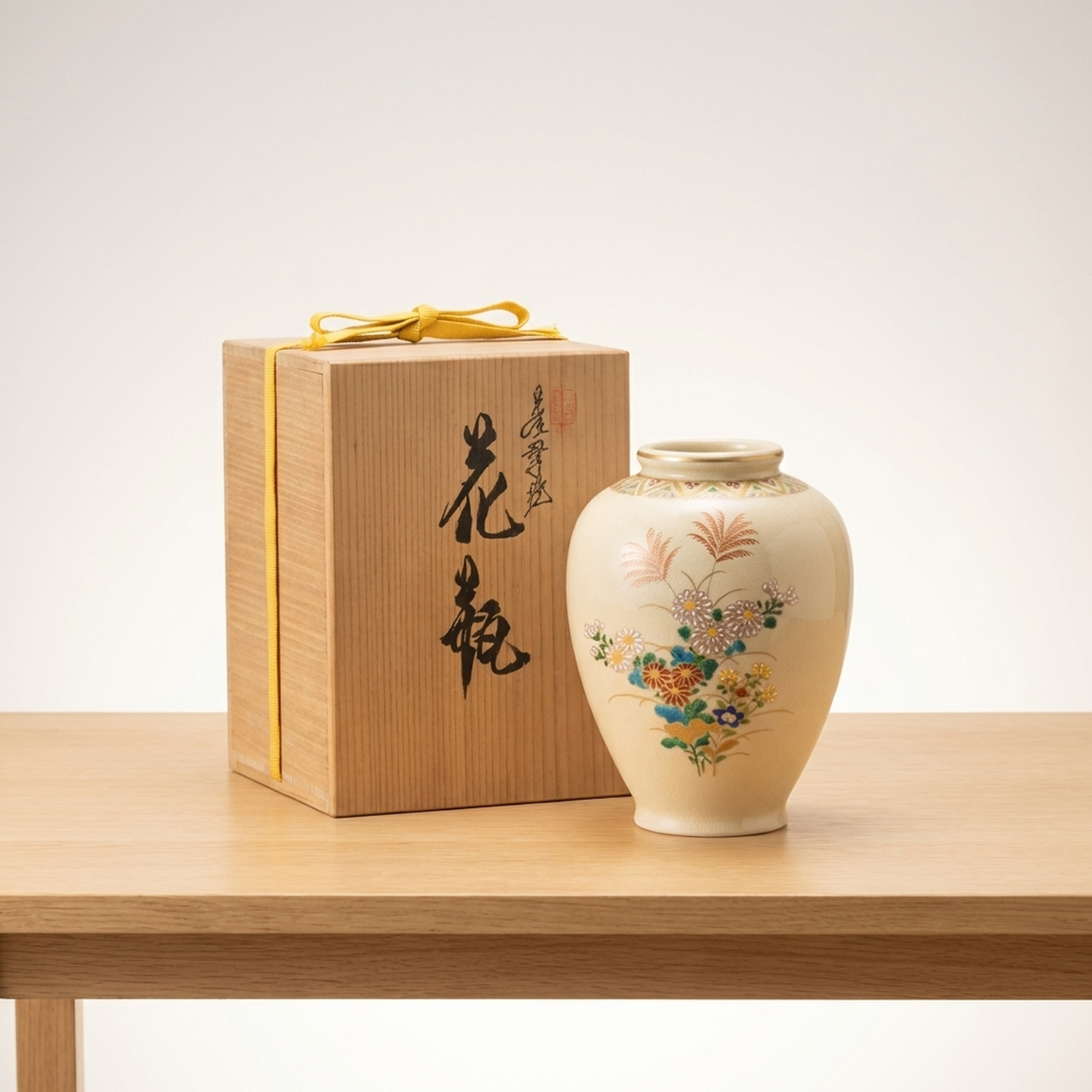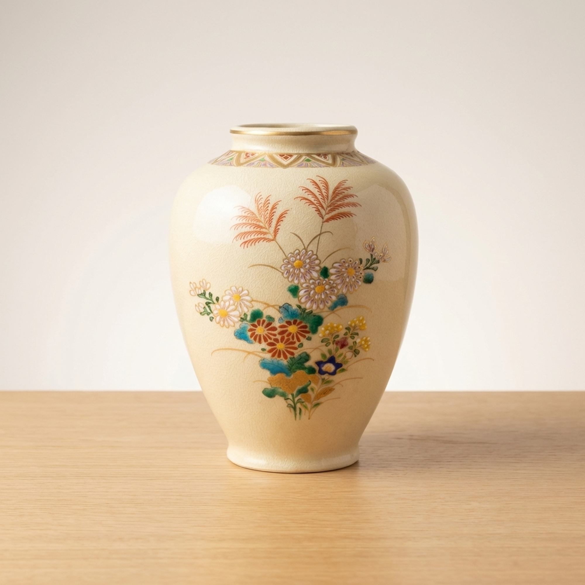 <p>Maker / Brand: Satsuma-yaki Keida-gama Title of Work: Satsuma Ware Keida Kiln Gold-Decorated Floral Design Vase, Flower Holder, Decorative Jar</p> <p>This exquisite Satsuma ware vase from the Keida Kiln showcases the timeless beauty of Japanese craftsmanship. Adorned with delicate gold accents and vibrant floral motifs, it embodies a rich artistic tradition. Perfect for displaying flowers or as a standalone decorative piece, this vase brings a touch of refined elegance to any setting.</p> <p>Artistic & Cultural Background Satsuma ware (Satsuma-yaki) is a type of Japanese earthenware originating from Satsuma Province (present-day Kagoshima Prefecture) in the late 16th century. Renowned for its finely crackled glaze and elaborate polychrome enamel decoration, often highlighted with gold, Satsuma ware gained immense popularity in the West during the Meiji period. It is celebrated for its detailed detail and luxurious aesthetic, often depicting scenes from nature, daily life, or mythological figures.</p> <p>Design & Technique This particular vase features a classic Kinsai (gold-decorated) technique, where lustrous gold enamel is carefully applied to outline and enhance the painted motifs. The design prominently showcases the "Aki no Nanakusa" (Seven Grasses of Autumn) alongside elegant chrysanthemum blossoms, rendered in a vibrant palette of polychrome enamels. These traditional autumnal flora are symbols of the changing seasons and natural beauty in Japanese culture, creating a harmonious and evocative display.</p> <p>Form & Aesthetic Qualities Graceful Silhouette: The vase boasts a classic, gently swelling form that tapers elegantly towards both the foot and the rim, creating a balanced and pleasing profile. Rich Surface Texture: The creamy, finely crackled glaze characteristic of Satsuma ware provides a subtle tactile and visual depth, enhancing the vibrant enamel and gold decorations. Harmonious Palette: The interplay of delicate gold accents with the rich, naturalistic colors of the autumn flowers creates a sophisticated and visually appealing aesthetic.</p> <p>Collector & Decorative Appeal Authentic Japanese Craftsmanship: A genuine piece of Satsuma ware from the esteemed Keida Kiln, representing a significant tradition in Japanese ceramics. Timeless Floral Artistry: The depiction of traditional autumn flowers and chrysanthemums offers a classic and enduring aesthetic that complements various interior styles. Versatile Elegance: Ideal for showcasing floral arrangements or as a standalone decorative accent, adding a touch of refined beauty to any room.</p> <p>This exquisite Satsuma ware vase is a perfect acquisition for collectors of fine Japanese ceramics and those seeking to infuse their spaces with traditional elegance.</p> <h3>Details</h3> <table style="border-collapse:collapse;width:100%"><tr><td style="padding:4px 12px 4px 0;font-weight:bold;white-space:nowrap">Condition</td><td style="padding:4px 0">Good</td></tr><tr><td style="padding:4px 12px 4px 0;font-weight:bold;white-space:nowrap">Origin</td><td style="padding:4px 0">Satsuma, Kagoshima</td></tr><tr><td style="padding:4px 12px 4px 0;font-weight:bold;white-space:nowrap">Material</td><td style="padding:4px 0">Ceramic</td></tr><tr><td style="padding:4px 12px 4px 0;font-weight:bold;white-space:nowrap">Era</td><td style="padding:4px 0">Meiji</td></tr><tr><td style="padding:4px 12px 4px 0;font-weight:bold;white-space:nowrap">Dimensions</td><td style="padding:4px 0">高さ18センチ / サイズ60</td></tr></table>
