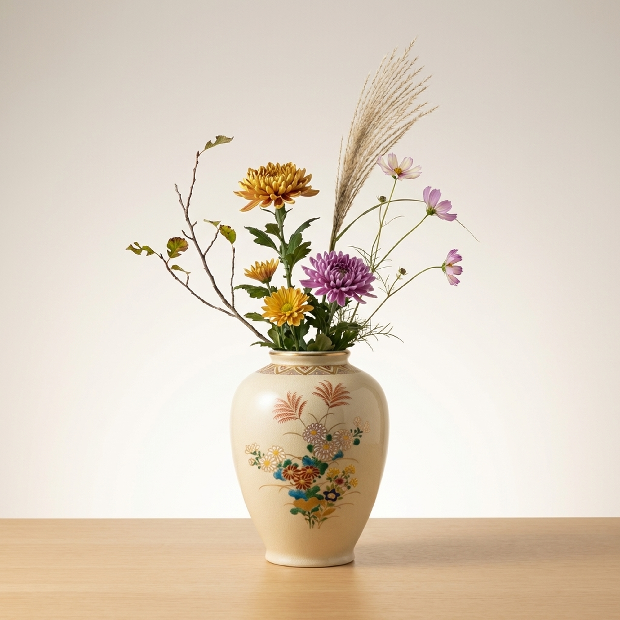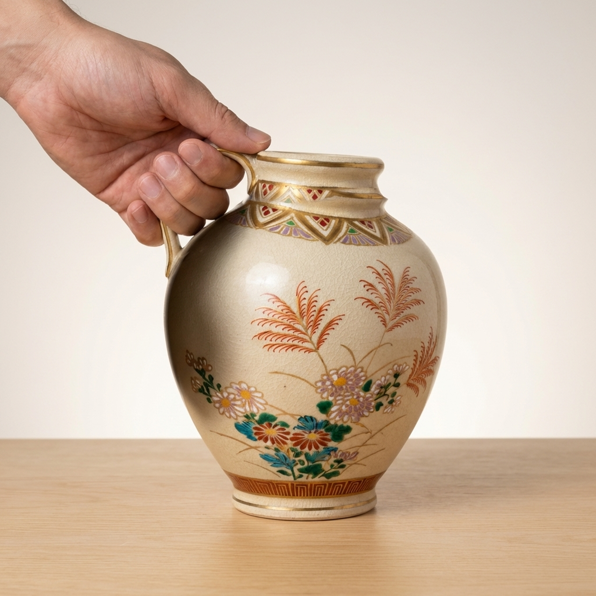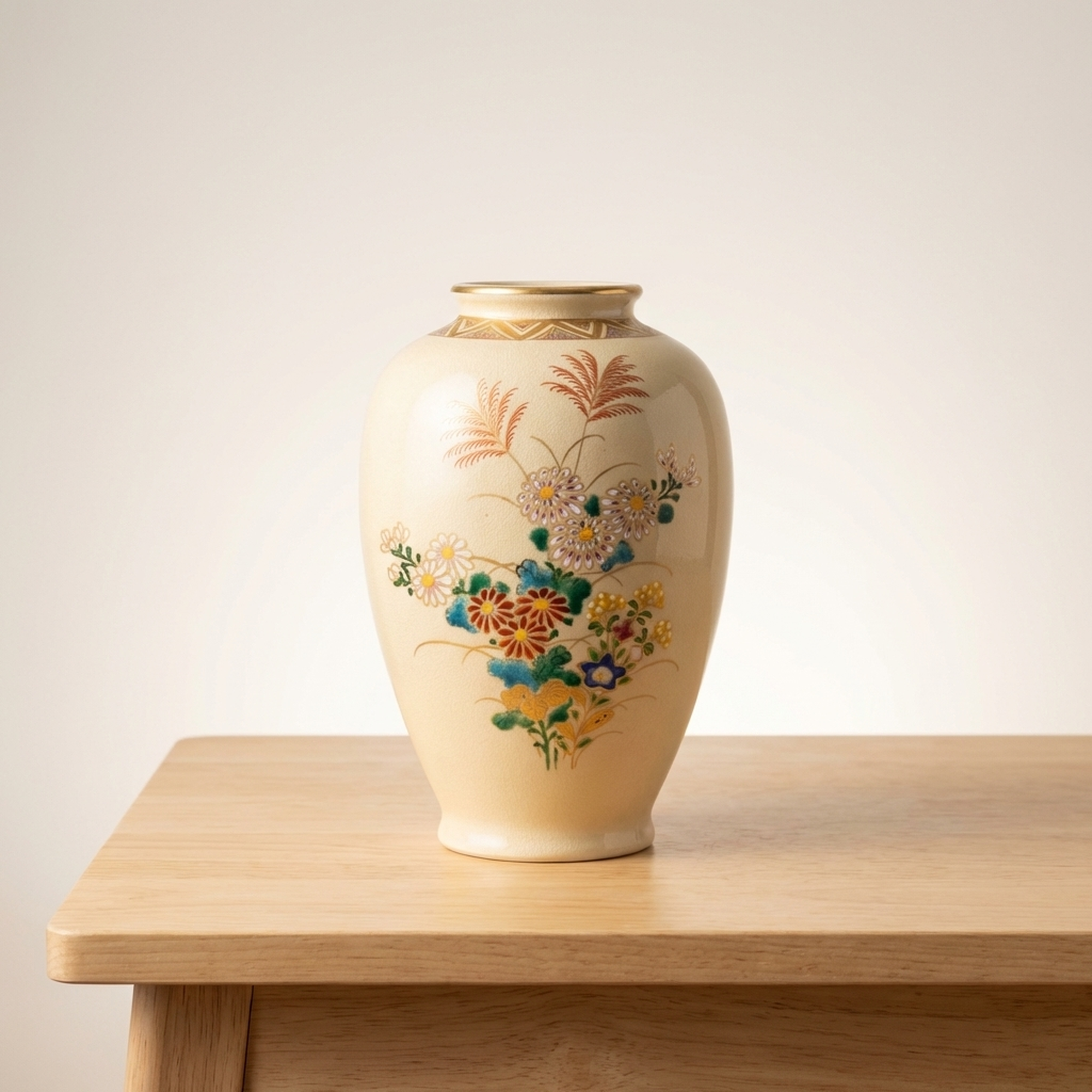 <p>Maker / Brand: Satsuma-yaki Keida-gama Title of Work: Satsuma Ware Keida Kiln Gold-Decorated Floral Design Vase, Flower Holder, Decorative Jar</p> <p>This exquisite Satsuma ware vase from the Keida Kiln showcases the timeless beauty of Japanese craftsmanship. Adorned with delicate gold accents and vibrant floral motifs, it embodies a rich artistic tradition. Perfect for displaying flowers or as a standalone decorative piece, this vase brings a touch of refined elegance to any setting.</p> <p>Artistic & Cultural Background Satsuma ware (Satsuma-yaki) is a type of Japanese earthenware originating from Satsuma Province (present-day Kagoshima Prefecture) in the late 16th century. Renowned for its finely crackled glaze and elaborate polychrome enamel decoration, often highlighted with gold, Satsuma ware gained immense popularity in the West during the Meiji period. It is celebrated for its detailed detail and luxurious aesthetic, often depicting scenes from nature, daily life, or mythological figures.</p> <p>Design & Technique This particular vase features a classic Kinsai (gold-decorated) technique, where lustrous gold enamel is carefully applied to outline and enhance the painted motifs. The design prominently showcases the "Aki no Nanakusa" (Seven Grasses of Autumn) alongside elegant chrysanthemum blossoms, rendered in a vibrant palette of polychrome enamels. These traditional autumnal flora are symbols of the changing seasons and natural beauty in Japanese culture, creating a harmonious and evocative display.</p> <p>Form & Aesthetic Qualities Graceful Silhouette: The vase boasts a classic, gently swelling form that tapers elegantly towards both the foot and the rim, creating a balanced and pleasing profile. Rich Surface Texture: The creamy, finely crackled glaze characteristic of Satsuma ware provides a subtle tactile and visual depth, enhancing the vibrant enamel and gold decorations. Harmonious Palette: The interplay of delicate gold accents with the rich, naturalistic colors of the autumn flowers creates a sophisticated and visually appealing aesthetic.</p> <p>Collector & Decorative Appeal Authentic Japanese Craftsmanship: A genuine piece of Satsuma ware from the esteemed Keida Kiln, representing a significant tradition in Japanese ceramics. Timeless Floral Artistry: The depiction of traditional autumn flowers and chrysanthemums offers a classic and enduring aesthetic that complements various interior styles. Versatile Elegance: Ideal for showcasing floral arrangements or as a standalone decorative accent, adding a touch of refined beauty to any room.</p> <p>This exquisite Satsuma ware vase is a perfect acquisition for collectors of fine Japanese ceramics and those seeking to infuse their spaces with traditional elegance.</p> <h3>Details</h3> <table style="border-collapse:collapse;width:100%"><tr><td style="padding:4px 12px 4px 0;font-weight:bold;white-space:nowrap">Condition</td><td style="padding:4px 0">Good</td></tr><tr><td style="padding:4px 12px 4px 0;font-weight:bold;white-space:nowrap">Origin</td><td style="padding:4px 0">Satsuma, Kagoshima</td></tr><tr><td style="padding:4px 12px 4px 0;font-weight:bold;white-space:nowrap">Material</td><td style="padding:4px 0">Ceramic</td></tr><tr><td style="padding:4px 12px 4px 0;font-weight:bold;white-space:nowrap">Era</td><td style="padding:4px 0">Meiji</td></tr><tr><td style="padding:4px 12px 4px 0;font-weight:bold;white-space:nowrap">Dimensions</td><td style="padding:4px 0">高さ18センチ / サイズ60</td></tr></table>