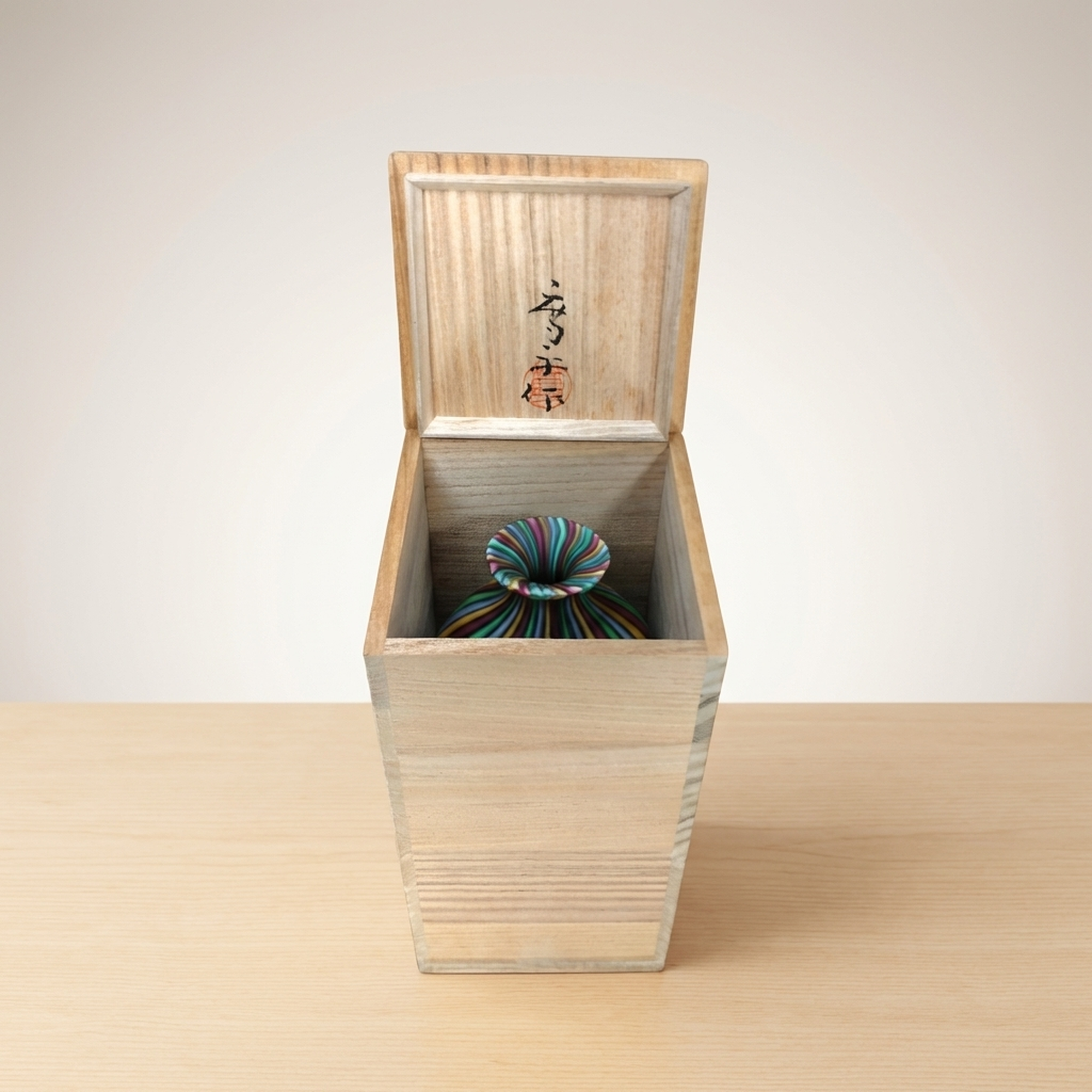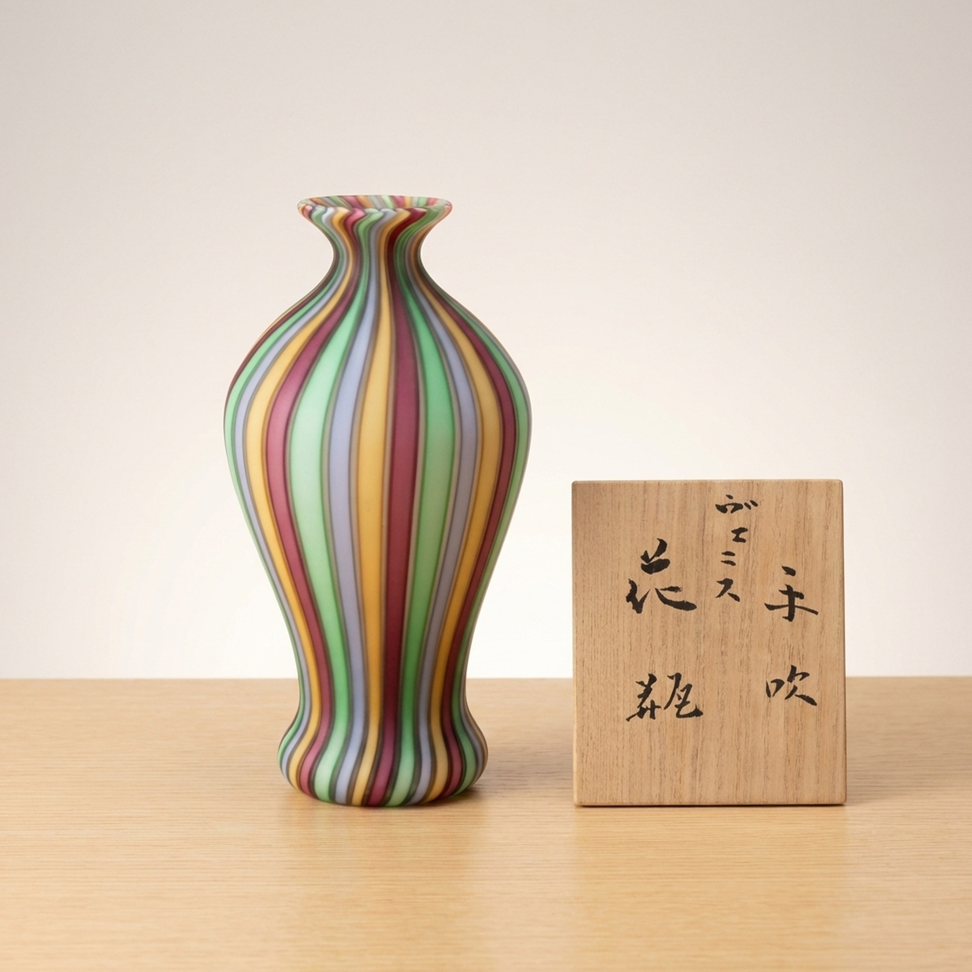 <p>STRUCTURE Maker / Brand: Fujita Kyohei Title of Work: Hand-blown Venice Vase with Tomobako (High-grade Kiri Box), Over 19cm Tall, Beautiful Condition</p> <p>This exquisite hand-blown glass vase by master artist Fujita Kyohei is a striking piece, showcasing his mastery of both traditional Japanese aesthetics and Venetian glassmaking techniques. Approximately 19.5 cm tall and 9.5 cm wide, its unique form and vibrant yet serene color palette make it a striking work of art. Presented in its original, high-grade kiri wood tomobako, this vase is in beautiful, flawless condition.</p> <p>Artistic & Cultural Background Fujita Kyohei (1921-2004) was a pivotal figure in the development of modern Japanese art glass. Though Japan is known for ceramics, Fujita revolutionized the perception and practice of glass art, elevating it to a fine art form. He is particularly renowned for his innovative integration of traditional Venetian glass techniques, such as filigrana and murrine, with a distinctly Japanese sensibility, creating works that are both globally inspired and deeply rooted in his heritage. His pieces are highly sought after by collectors worldwide.</p> <p>Design & Technique This vase exemplifies Fujita Kyohei's signature "Venice" style, achieved through careful hand-blowing. The detailed design features vertically arranged, colorful glass canes, a technique reminiscent of Venetian filigrana or zanfirico. The artist has skillfully blended vibrant hues into a harmonious and calming palette, creating a visual rhythm that draws the eye around the elegant form. The hand-blown nature ensures each piece possesses subtle variations, making it unique.</p> <p>Form & Aesthetic Qualities * <strong>Distinctive Silhouette:</strong> The vase boasts a graceful, undulating form that gently tapers from a flared rim to a stable base, a shape noted for its rarity. * <strong>Harmonious Coloration:</strong> A striking interplay of colorful stripes in a muted palette creates a sense of both vibrancy and tranquility, enhancing its decorative versatility. * <strong>Refined Craftsmanship:</strong> The smooth, polished surface of the hand-blown glass, combined with the precise execution of the striped pattern, speaks to the exceptional skill of Fujita Kyohei.</p> <p>Collector & Decorative Appeal * <strong>Master Artist's Work:</strong> An authentic piece by Fujita Kyohei, a celebrated master of Japanese art glass, a significant addition to any collection. * <strong>Exceptional Condition:</strong> Described as flawless and beautiful, this vase retains its original splendor and value. * <strong>Provenance & Presentation:</strong> Accompanied by its original, high-grade kiri wood tomobako, which serves as both a protective case and example to its authenticity.</p> <p>This exquisite vase is an ideal acquisition for knowledgeable collectors and decorators who appreciate the fusion of international techniques with Japanese artistic excellence.</p> <h3>Details</h3> <table style="border-collapse:collapse;width:100%"><tr><td style="padding:4px 12px 4px 0;font-weight:bold;white-space:nowrap">Condition</td><td style="padding:4px 0">Excellent</td></tr><tr><td style="padding:4px 12px 4px 0;font-weight:bold;white-space:nowrap">Material</td><td style="padding:4px 0">Ceramic</td></tr><tr><td style="padding:4px 12px 4px 0;font-weight:bold;white-space:nowrap">Era</td><td style="padding:4px 0">Unknown</td></tr></table>