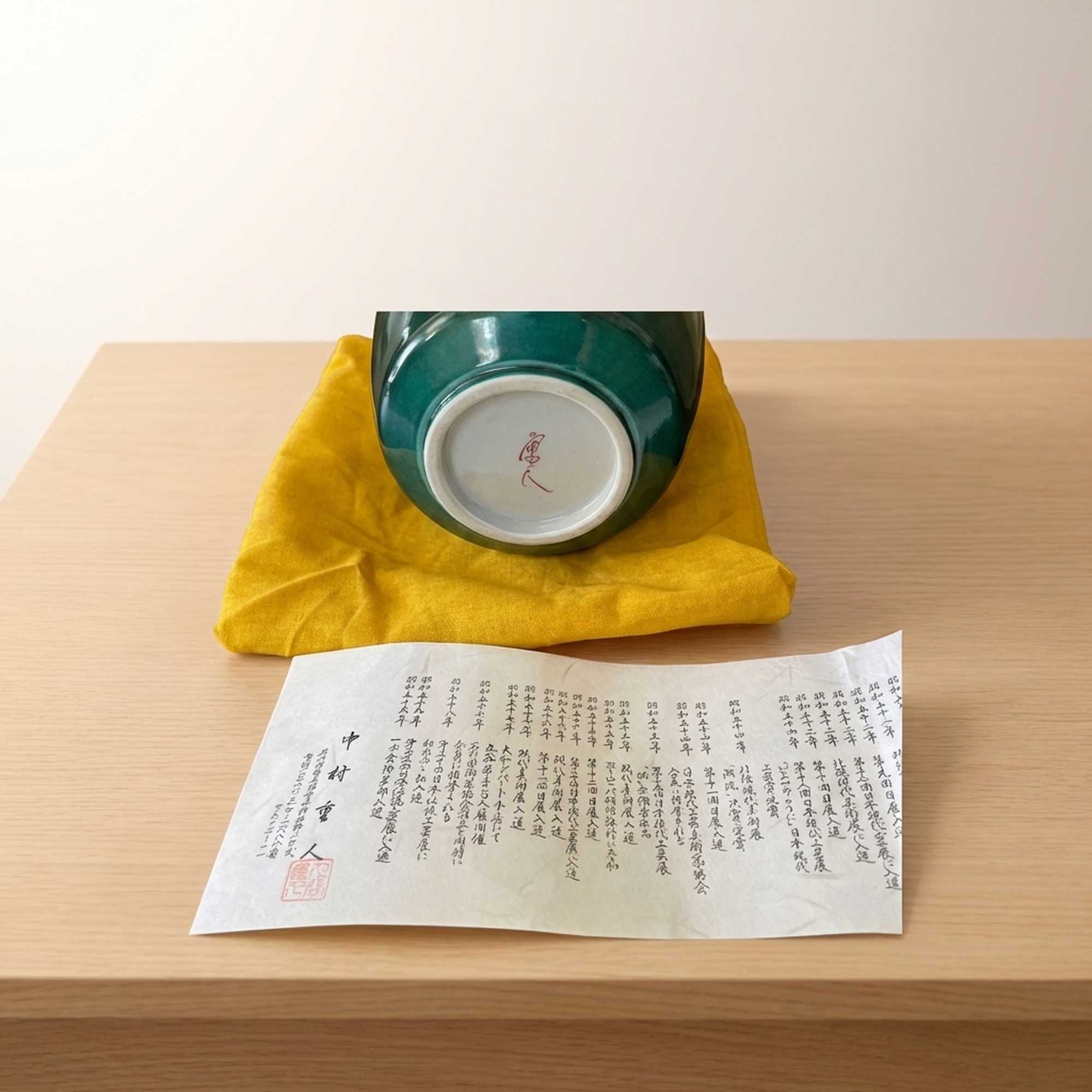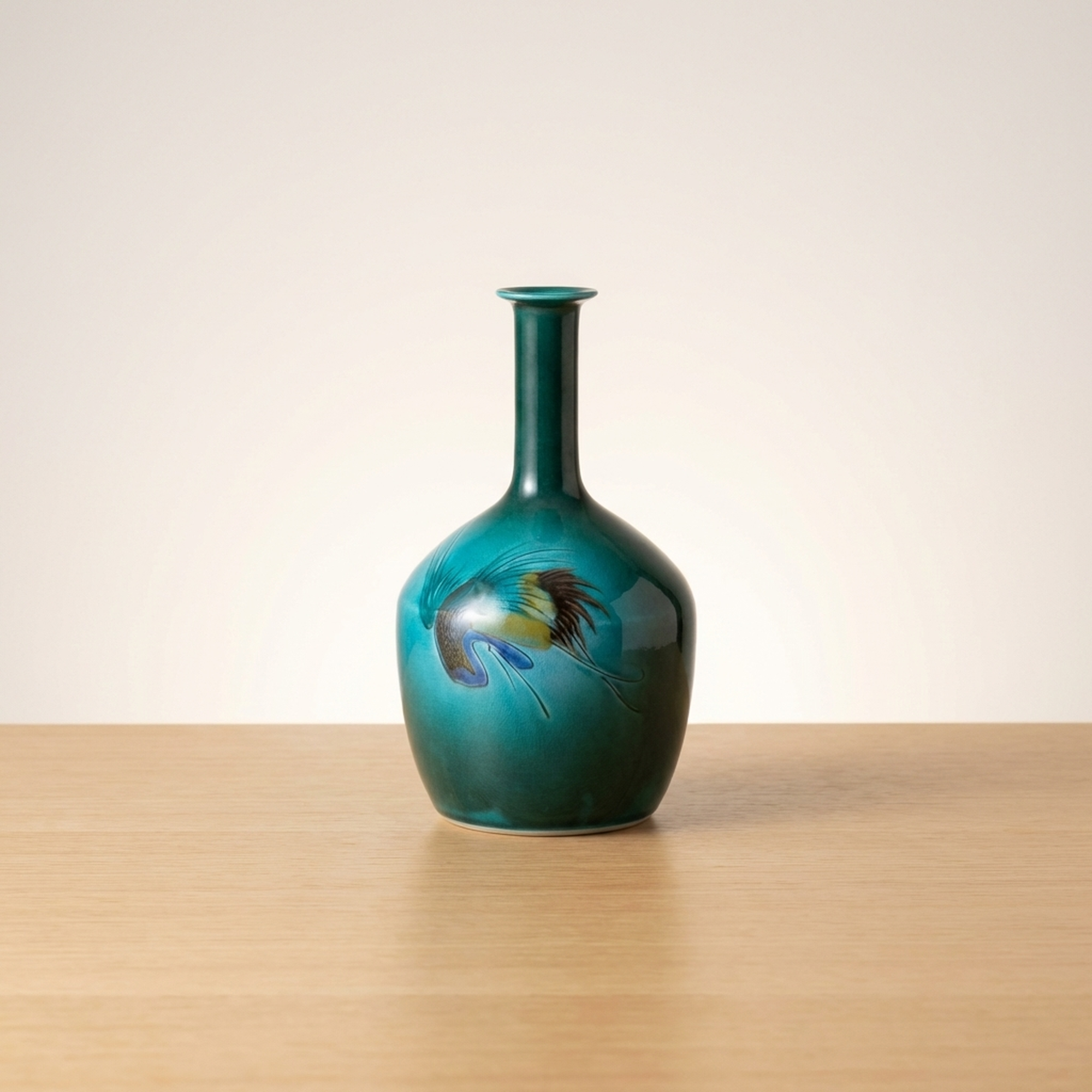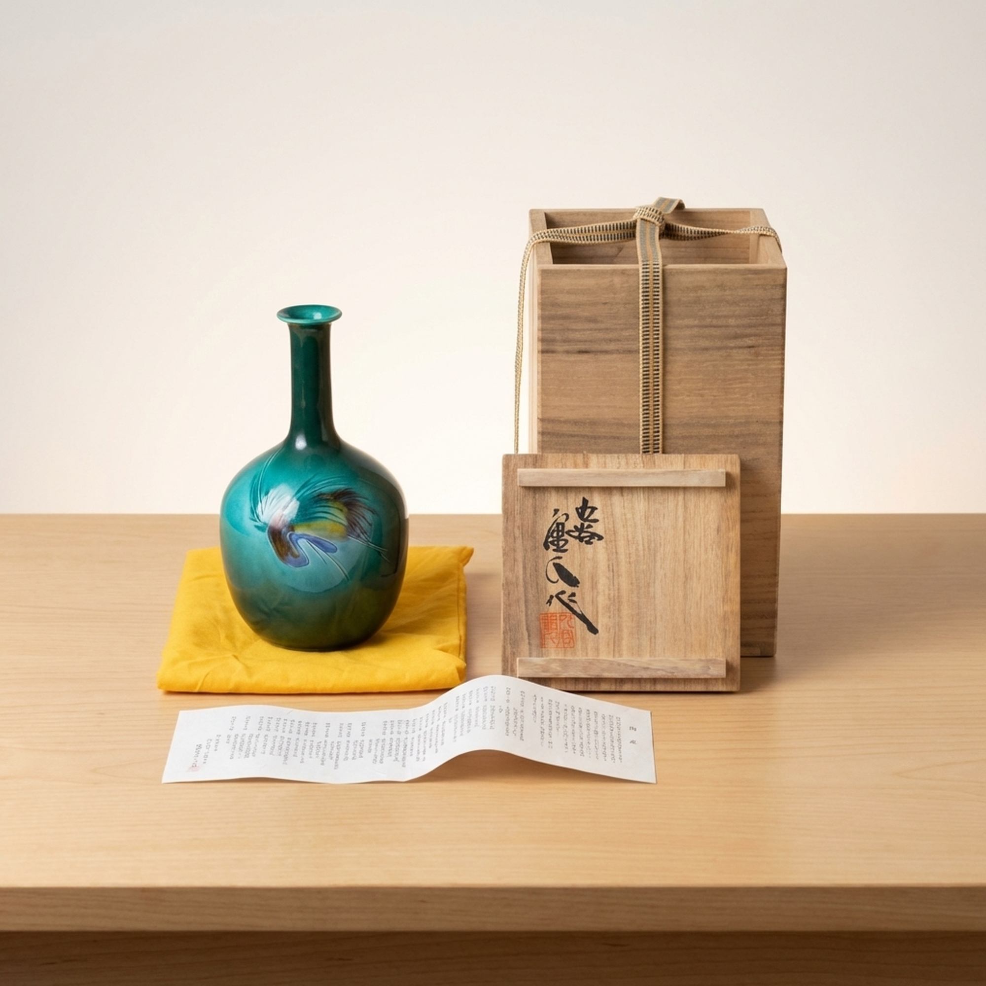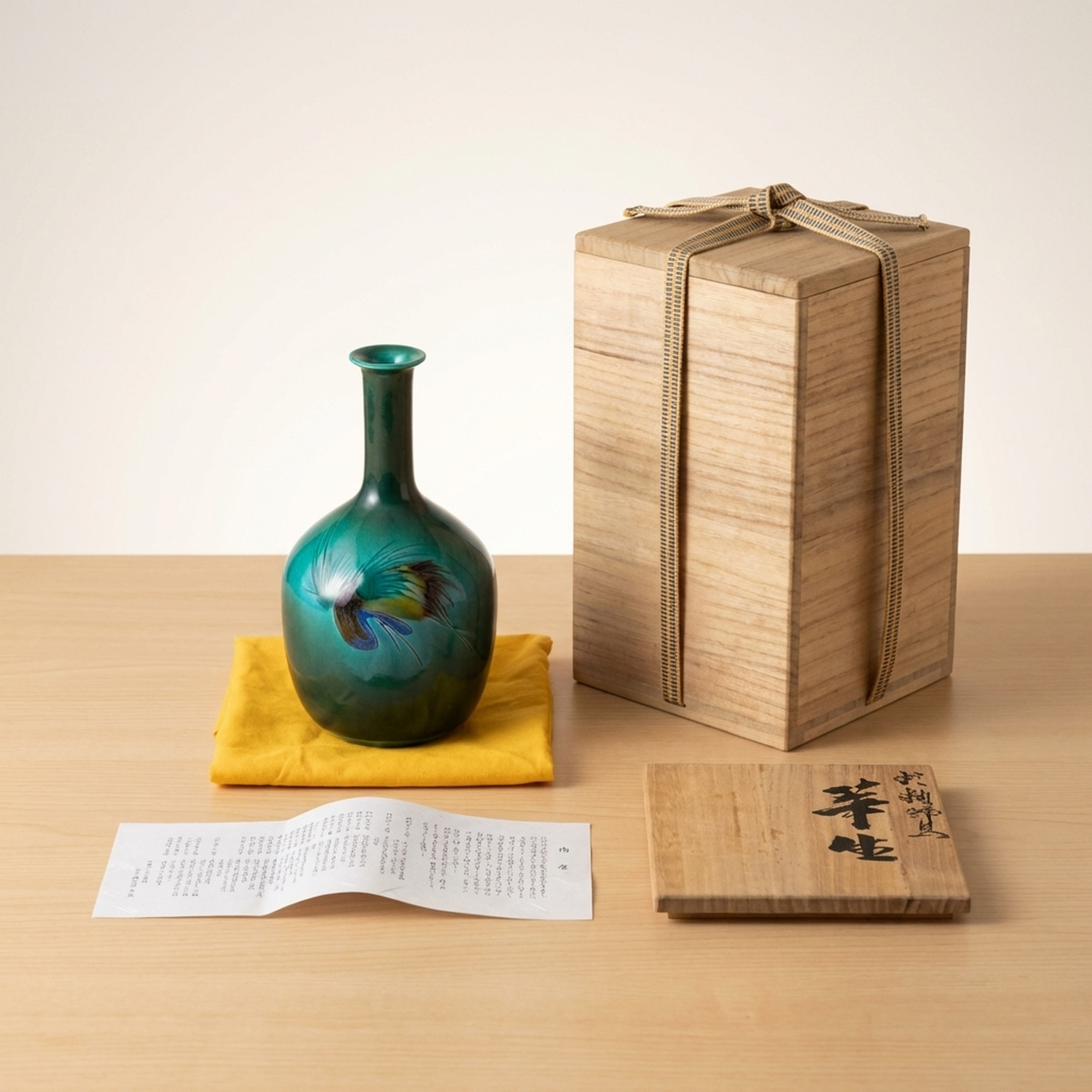 <p>Maker / Brand: Nakamura Shigeto / Kutani-yaki Title of Work: Nitten Artist Kutani-yaki Vase with Bird Design Masterpiece, with Kiri Box</p> <p>This exquisite Kutani-yaki vase, crafted by the esteemed Nitten artist Nakamura Shigeto, showcases a striking bird design against a stunning blue-green glaze. Acquired in 1988 and kept in remarkable condition, this ceramic masterpiece comes complete with its original kiri wood box and descriptive document, making it a truly special acquisition.</p> <p>Artistic & Cultural Background Kutani-yaki is a renowned style of Japanese porcelain originating from Ishikawa Prefecture, celebrated for its vibrant overglaze enamels and detailed designs. Nakamura Shigeto, a distinguished member of the prestigious Nitten (Japan Fine Arts Exhibition) and a certified Traditional Craftsman, honed his skills under the tutelage of the revered master Asakura Gojūkichi. This lineage speaks to the profound artistic heritage and technical excellence embodied in his work.</p> <p>Design & Technique The vase features a mesmerizing blue-green glaze that forms a rich, deep background for the dynamic bird motif. The bird is rendered with expressive brushwork and a subtle palette, creating a sense of movement and life. This piece exemplifies the refined ceramic artistry and decorative painting for which Kutani-yaki is celebrated, showcasing the artist's mastery of both form and surface decoration.</p> <p>Form & Aesthetic Qualities * <strong>Elegant Silhouette:</strong> The vase presents a graceful form with a slender neck gently flaring at the mouth, leading to a beautifully rounded, bulbous body. * <strong>Lustrous Glaze:</strong> The smooth, vibrant blue-green glaze offers a striking visual depth, inviting the eye to explore its subtle variations. * <strong>Dynamic Imagery:</strong> The bird design is artfully integrated into the vase's form, creating a harmonious balance between the vessel's shape and its decorative elements.</p> <p>Collector & Decorative Appeal * <strong>Distinguished Provenance:</strong> This piece was purchased in 1988 from a reputable department store in Kanazawa and has been carefully preserved, having been displayed only a few times. * <strong>Master Craftsmanship:</strong> Created by Nakamura Shigeto, a Nitten artist and Traditional Craftsman, this vase represents a high caliber of Japanese ceramic art, enhanced by his mentorship under Asakura Gojūkichi. * <strong>Timeless Elegance:</strong> Perfect for displaying a single bloom or as a standalone decorative object, it brings a touch of refined Japanese artistry to any setting, from a traditional tokonoma to a contemporary interior.</p> <p>This exceptional vase is an ideal acquisition for collectors of fine Japanese ceramics and those who appreciate the enduring beauty of traditional craftsmanship.</p> <h3>Details</h3> <table style="border-collapse:collapse;width:100%"><tr><td style="padding:4px 12px 4px 0;font-weight:bold;white-space:nowrap">Condition</td><td style="padding:4px 0">Good</td></tr><tr><td style="padding:4px 12px 4px 0;font-weight:bold;white-space:nowrap">Origin</td><td style="padding:4px 0">Kutani, Ishikawa</td></tr><tr><td style="padding:4px 12px 4px 0;font-weight:bold;white-space:nowrap">Material</td><td style="padding:4px 0">Ceramic</td></tr><tr><td style="padding:4px 12px 4px 0;font-weight:bold;white-space:nowrap">Era</td><td style="padding:4px 0">Unknown</td></tr><tr><td style="padding:4px 12px 4px 0;font-weight:bold;white-space:nowrap">Dimensions</td><td style="padding:4px 0">高さ21cm / 幅12cm / 口径3.7cm / サイズ 高さ21cm幅12cm口径3.7cm</td></tr></table>